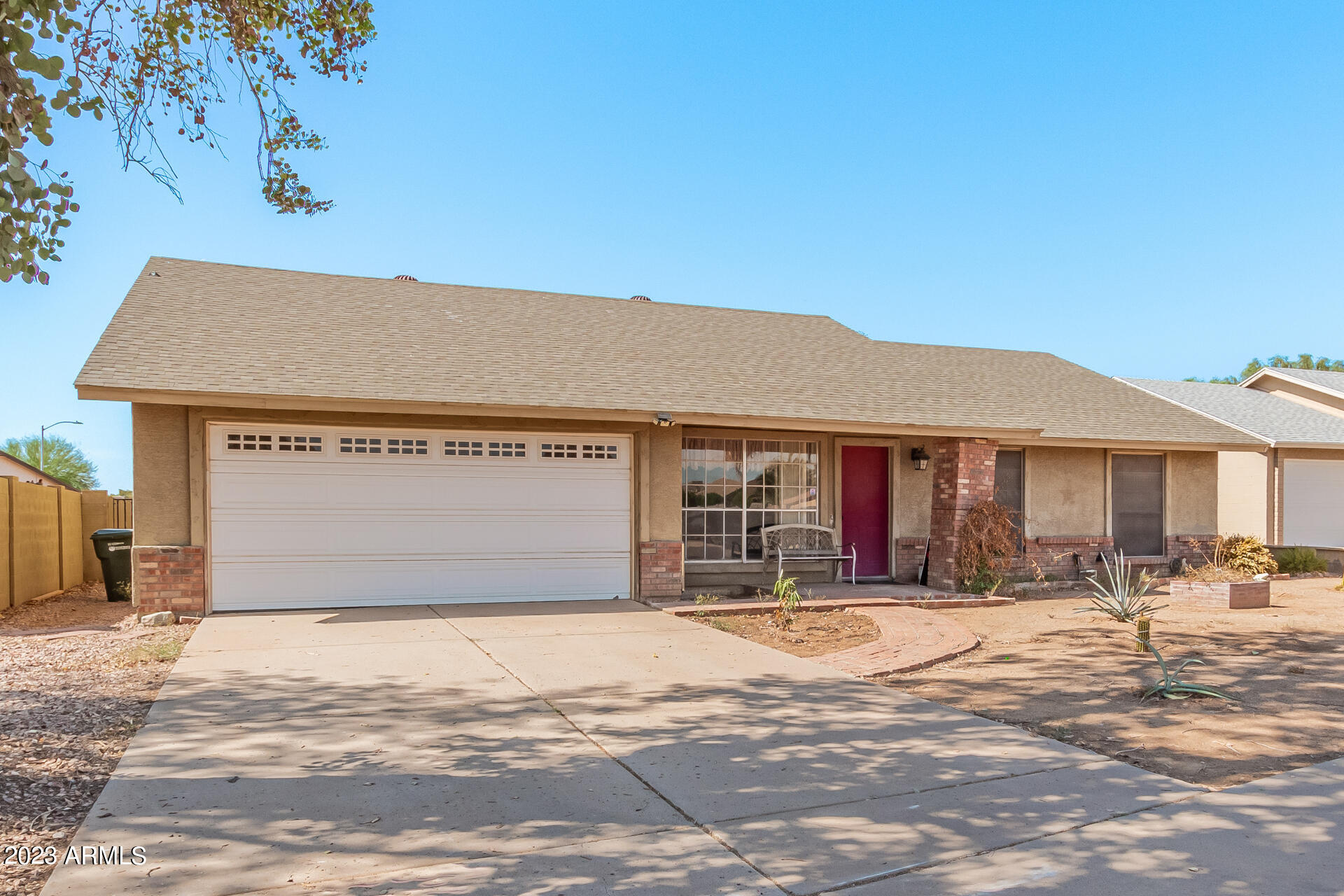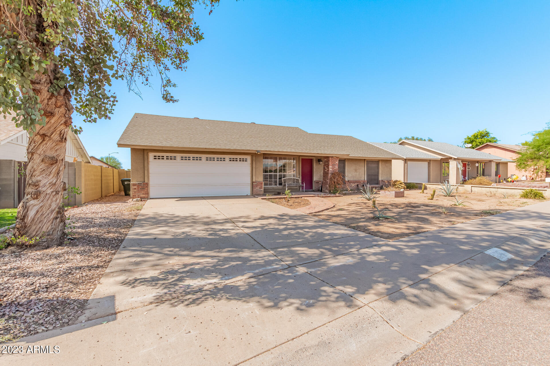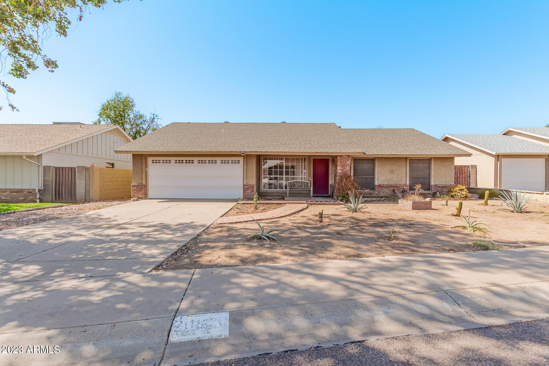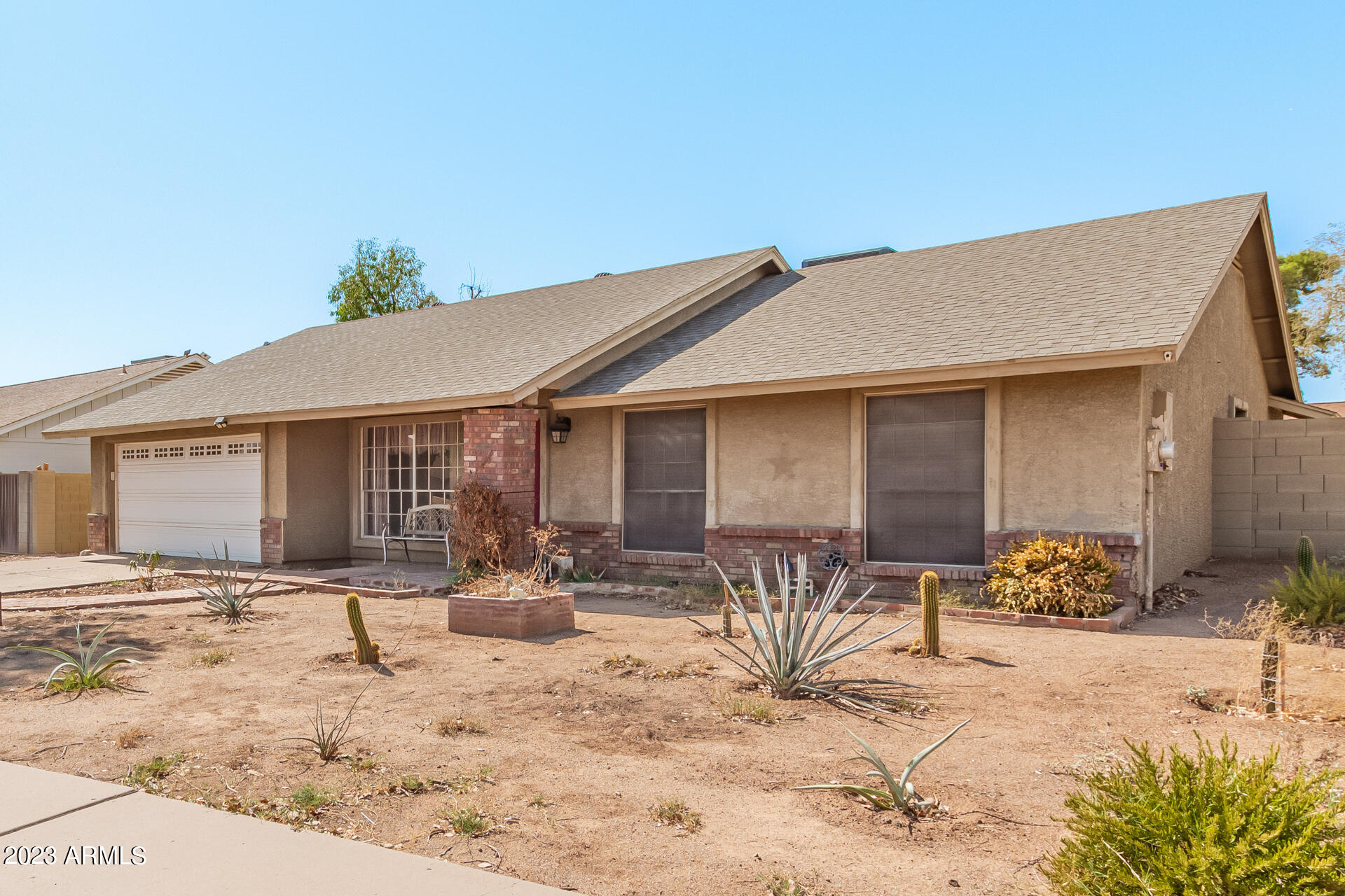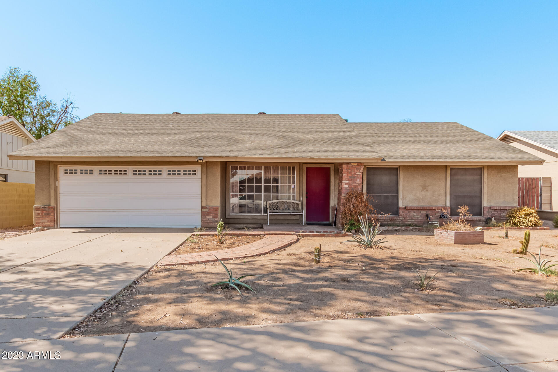 Delightful one-story home in Phoenix for sale! Light & bright interior features a mix of cozy carpet and sleek tile floors for added ease and convenience. The spacious living room flows seamlessly into the intimate family room, adorned with a calming color palette. Beautiful kitchen boasts oak cabinets, stainless steel appliances, glossy laminate counters, a convenient pantry, a breakfast bar peninsula, and a breakfast nook with a sunny bay window. Retreat to the main bedroom, highlighting double closets and an ensuite with dual sinks and grab bars. The generous backyard awaits, with a covered patio, private pool, and lovely desert plants. A move-in-ready gem not to be missed!