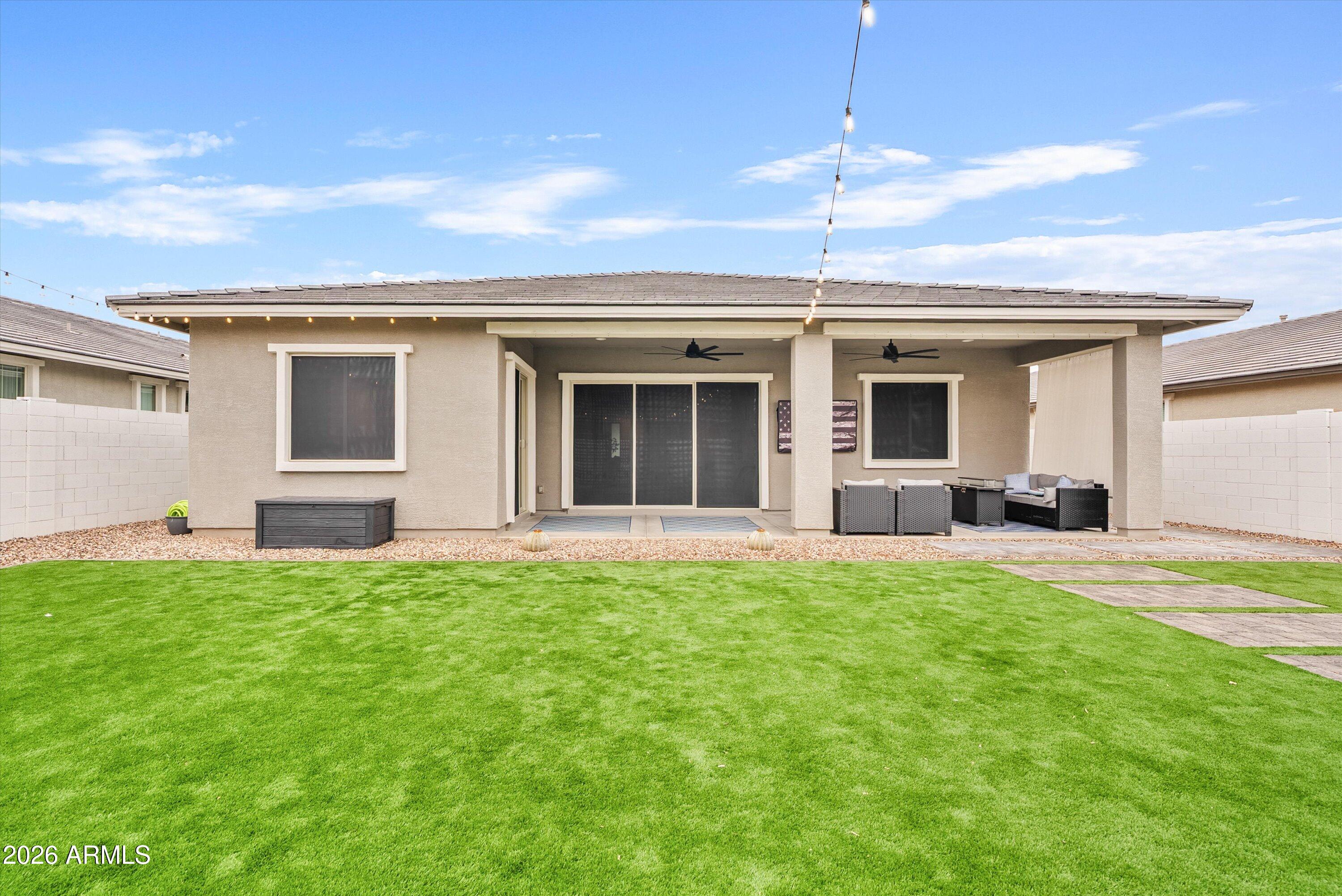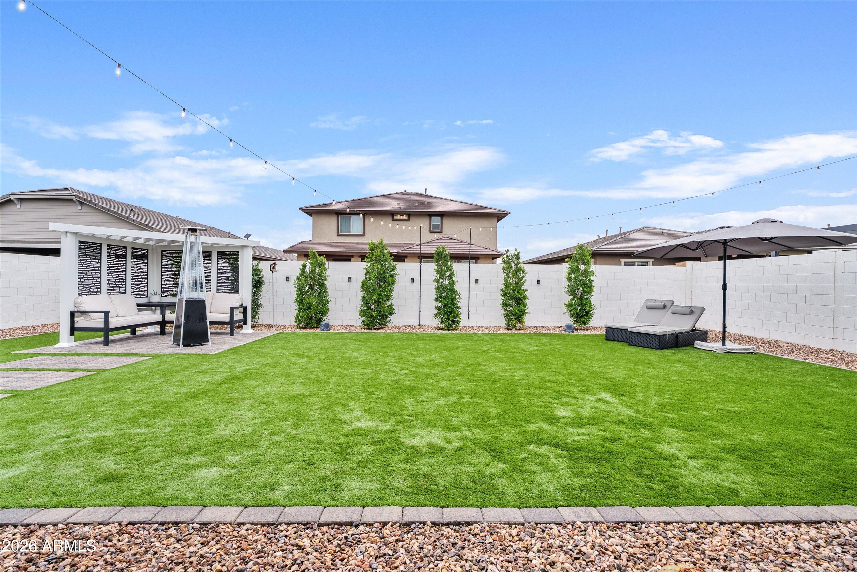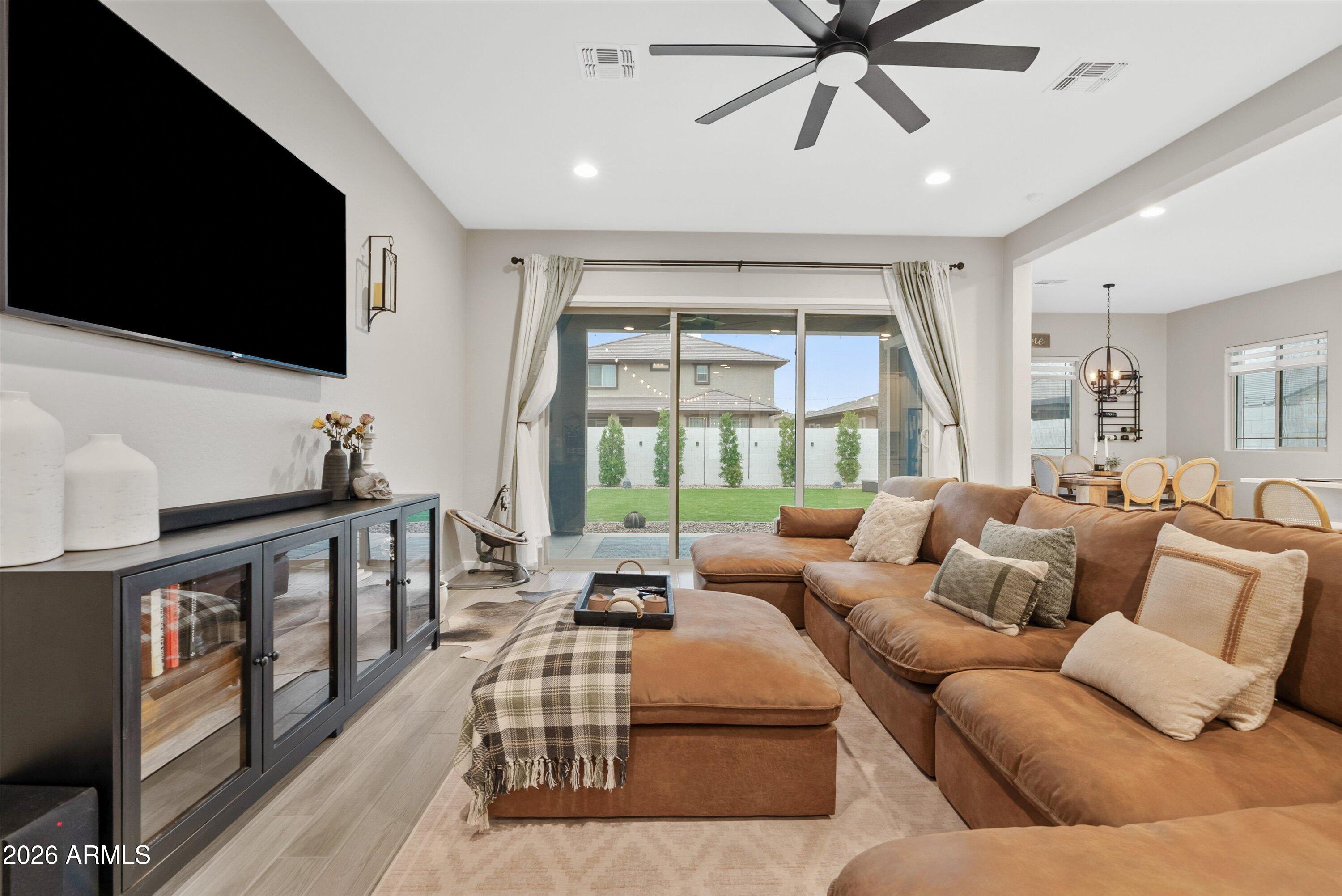 The backyard is beautifully landscaped with low-maintenance turf and a misting system, offering a comfortable outdoor space to enjoy year-round. This home combines modern comfort, smart design, and an exceptional Queen Creek location.