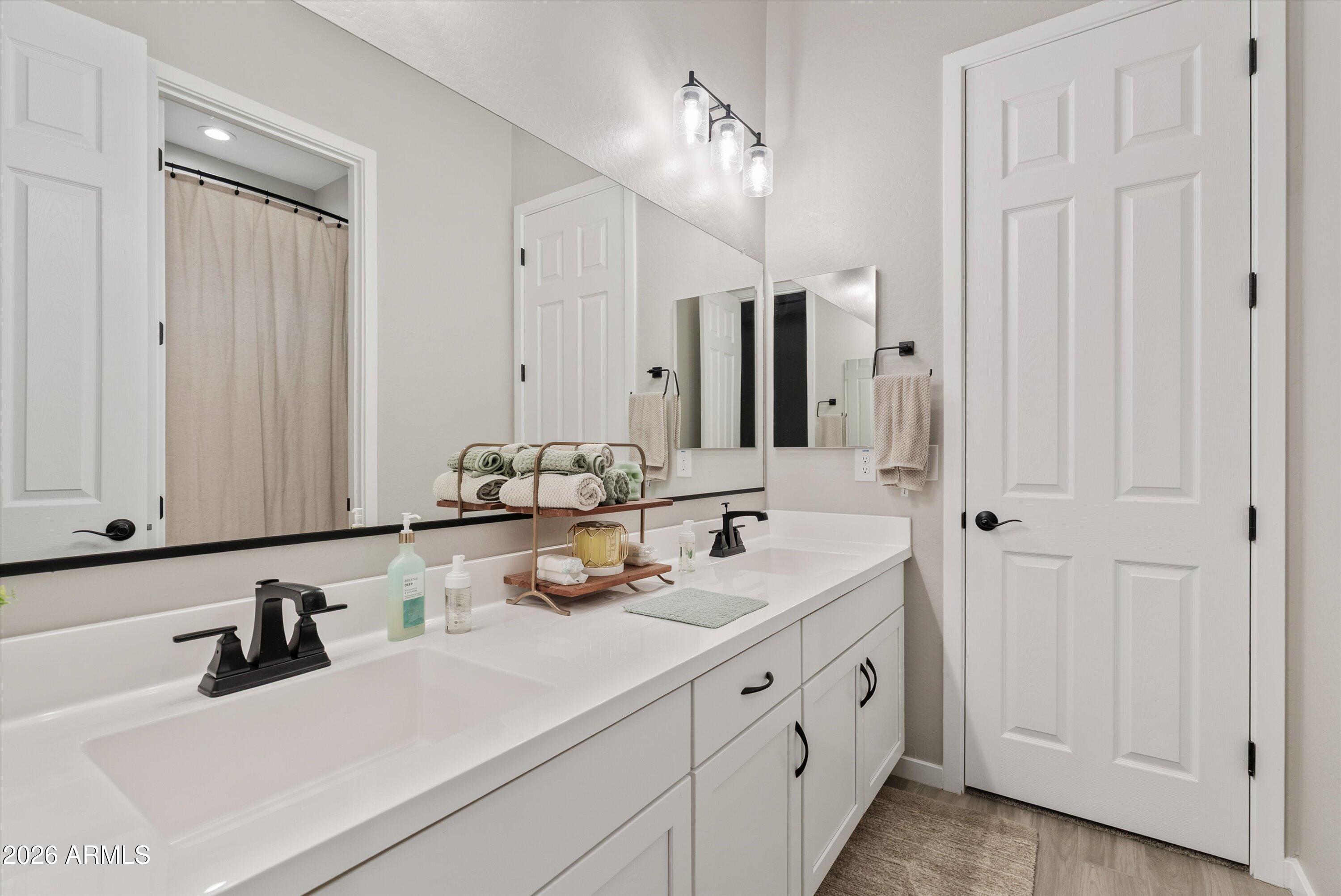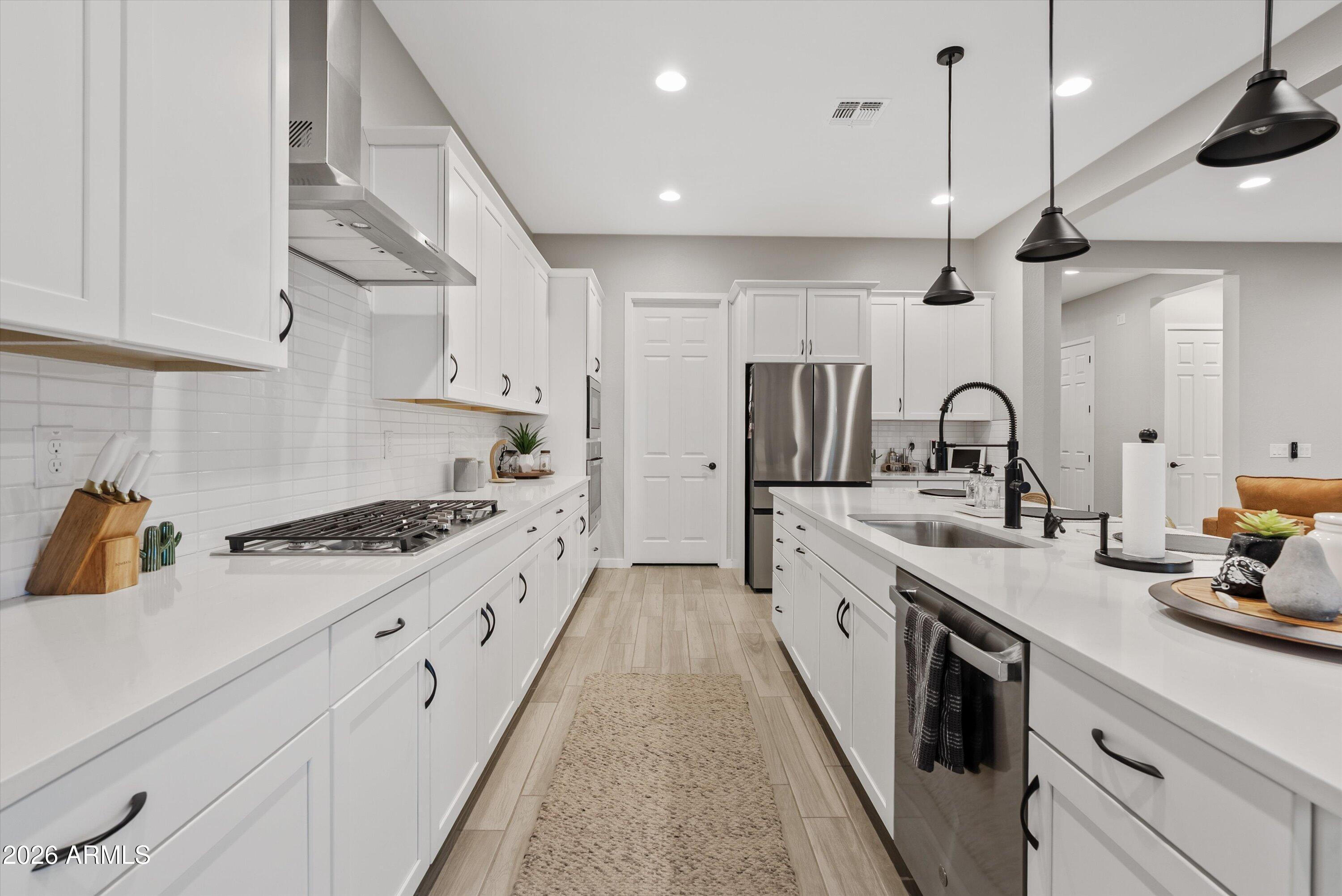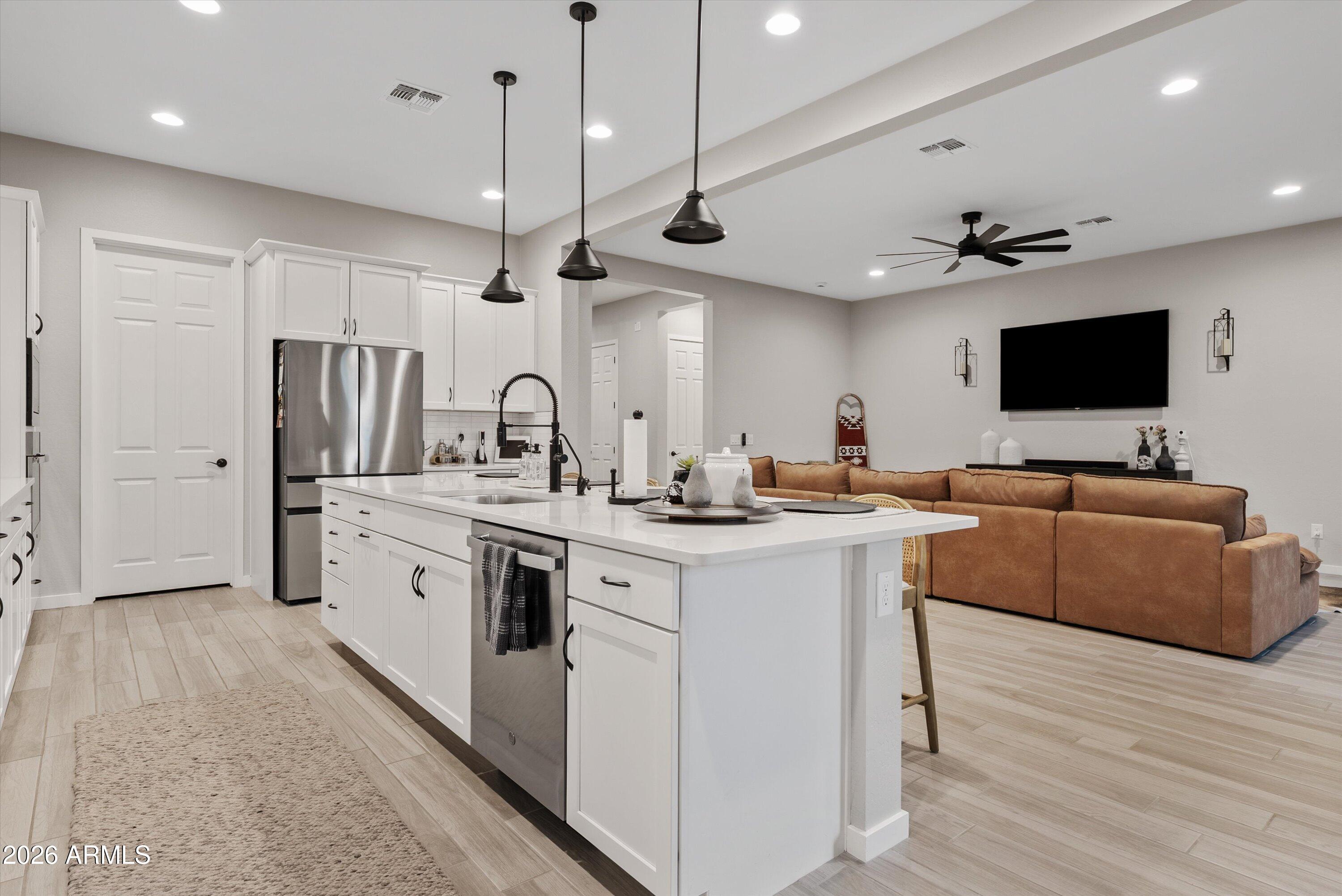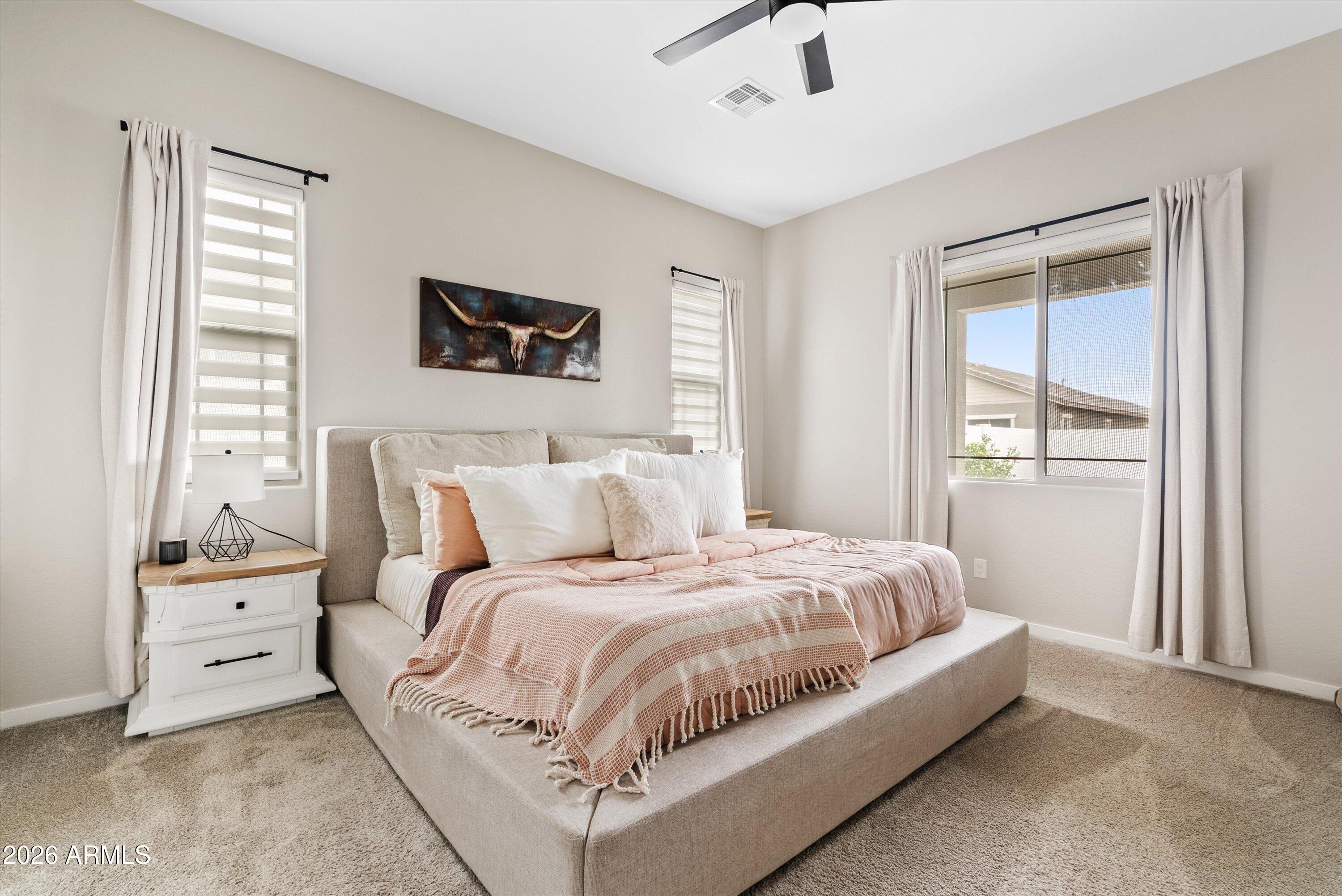 The backyard is beautifully landscaped with low-maintenance turf and a misting system, offering a comfortable outdoor space to enjoy year-round. This home combines modern comfort, smart design, and an exceptional Queen Creek location.