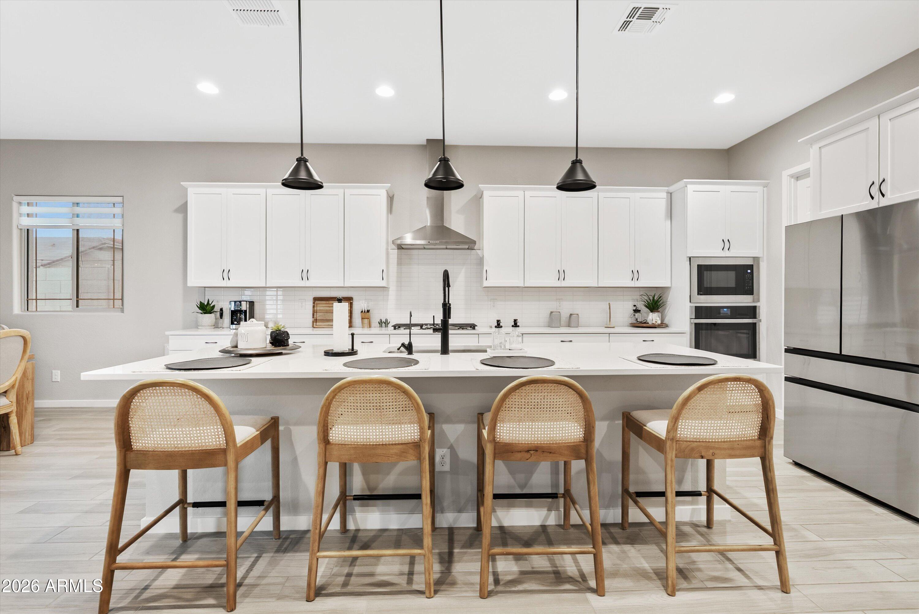 Soaring 10-foot ceilings highlight the open layout with a spacious great room, breakfast nook, and a gourmet kitchen complete with built-in appliances and an exceptionally large walk-in pantry. A multi-slide door seamlessly connects the interior living space to the extended covered patio, creating the perfect setting for indoor-outdoor living.
