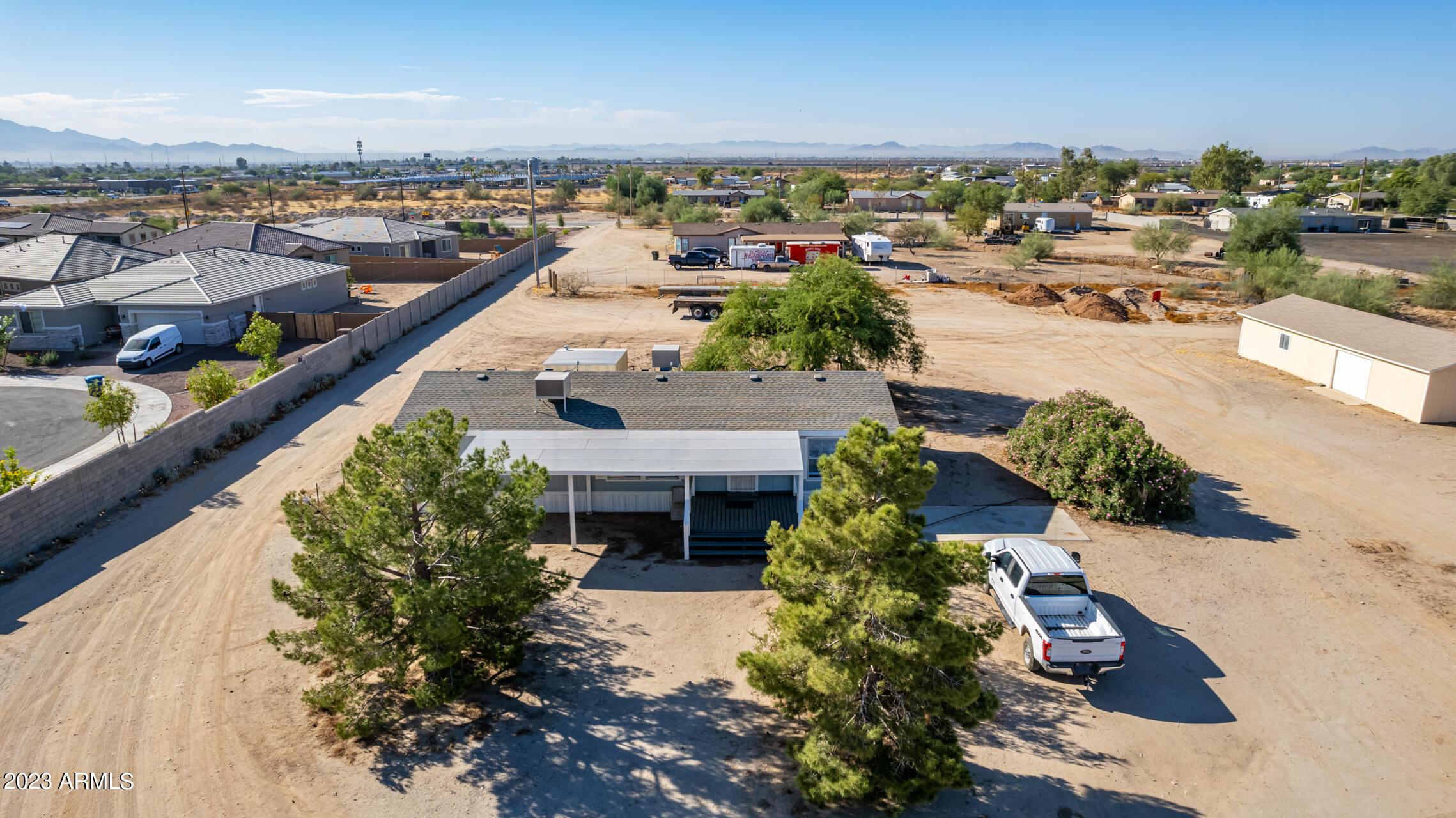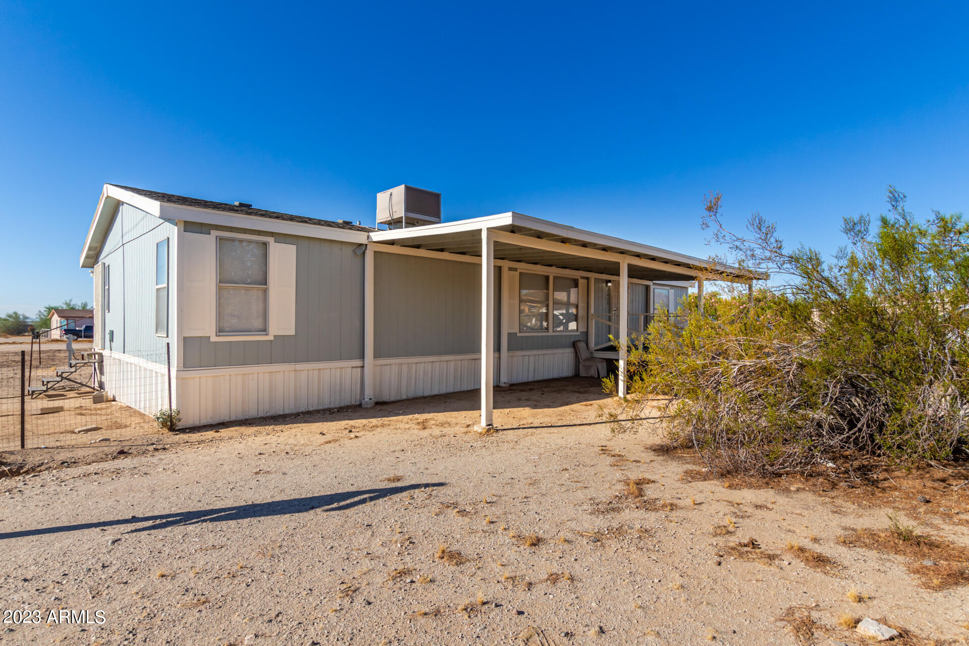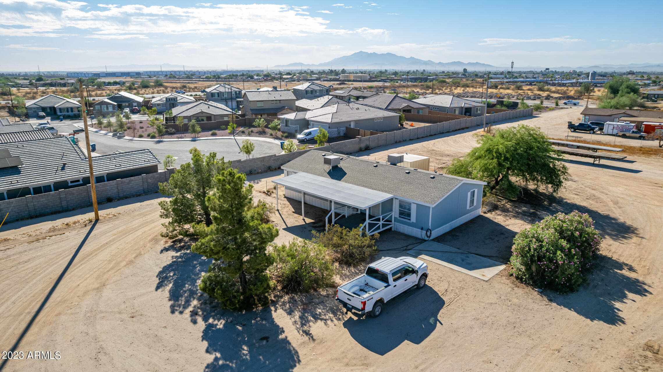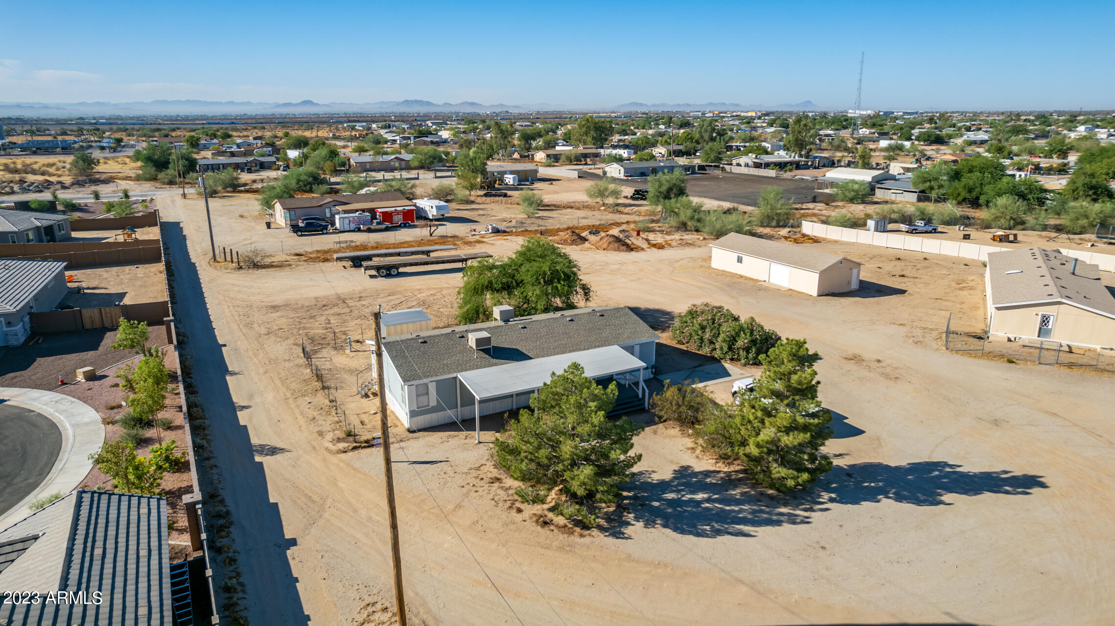 No HOA and over an acre of land for all your toys and tools. It's time to check out this charming 3-bed, 2-bath manufactured home in Buckeye! Enjoy the freedom of no HOA on this expansive acre plus lot, offering breathtaking mountain and desert views. The home boasts a light-filled and open floor plan with vaulted ceilings in the main living areas, providing a spacious and inviting atmosphere. Recent updates include new laminate flooring throughout this year and a new roof installed in 2022. The HVAC system was replaced in 2016 and new swamp cooler in 2022. Plenty of storage space and land for play and work. This property is conveniently located just minutes away from freeways, schools, parks, and all the Verrado amenities. Don't miss the opportunity to make this your new home!