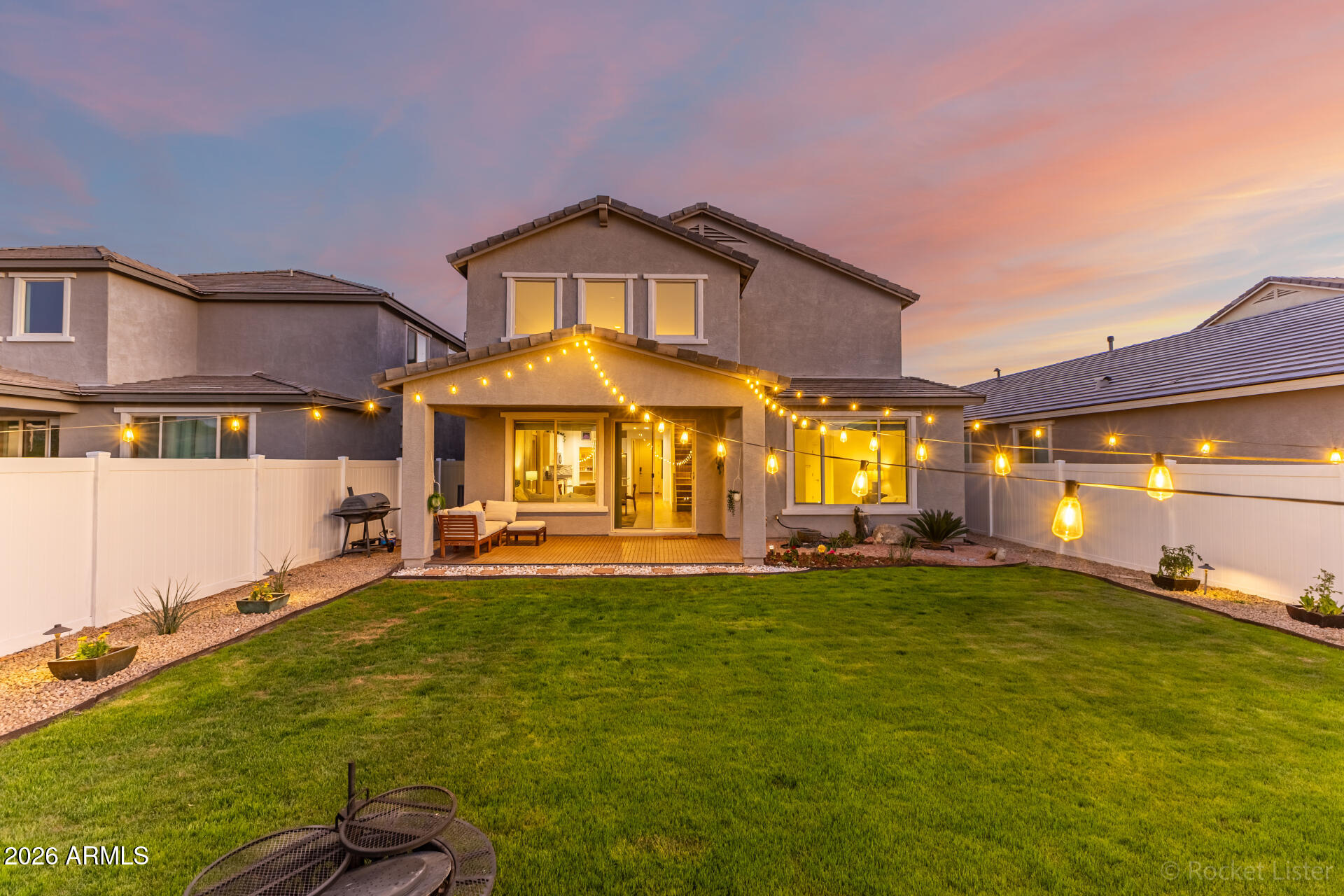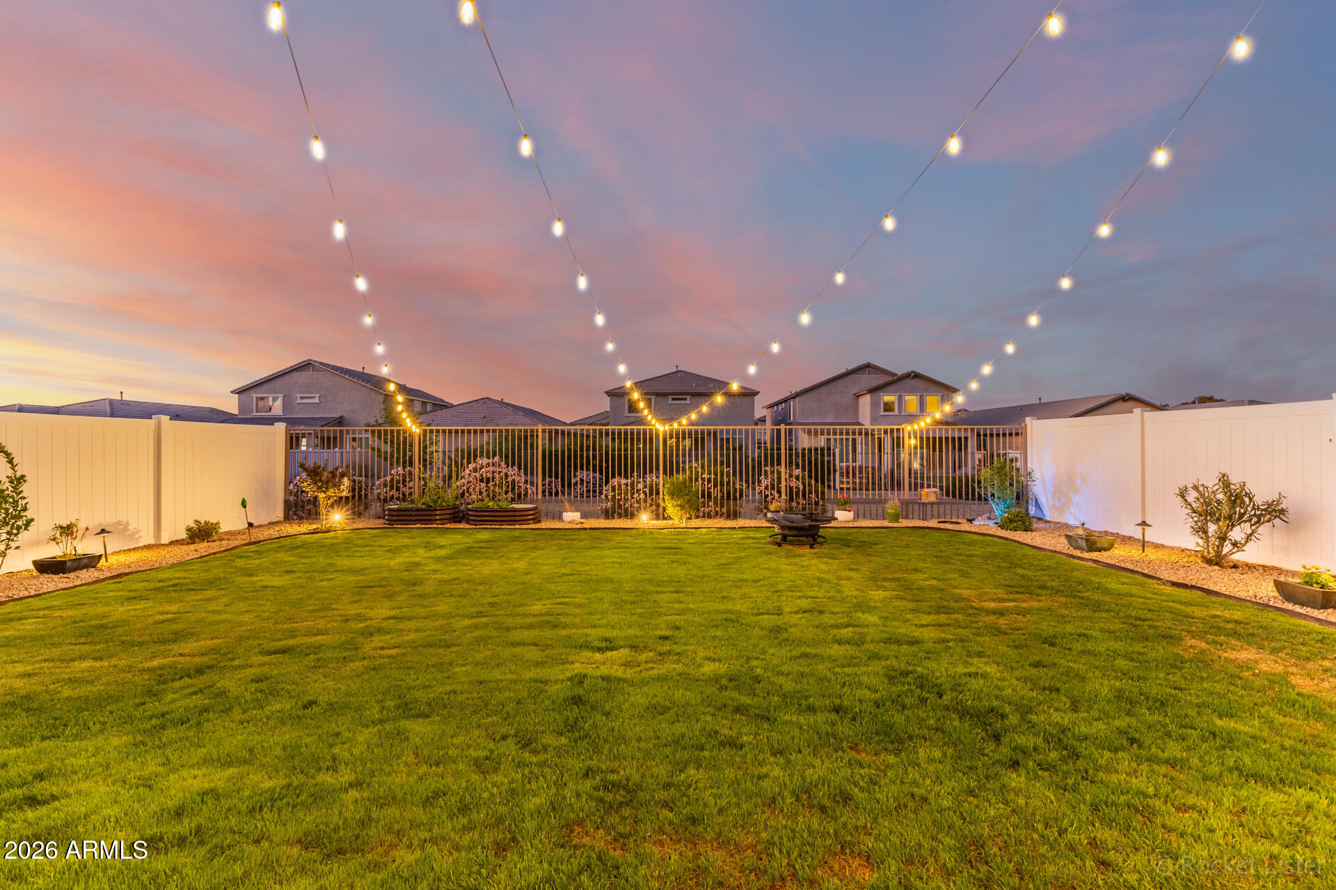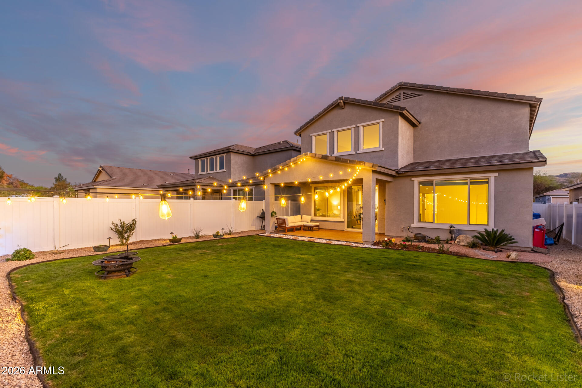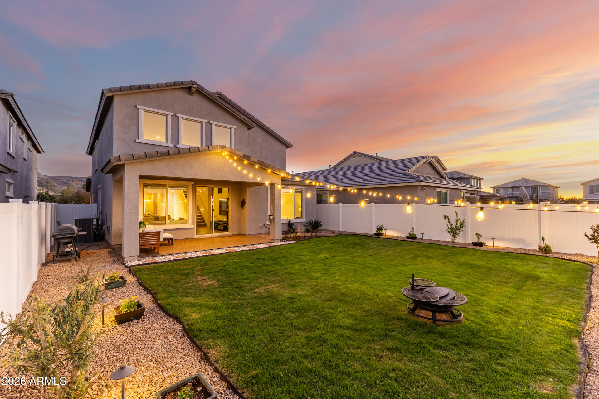 Step outside to a beautifully designed backyard featuring lush natural grass and charming bistro lighting that creates the perfect ambiance for relaxing evenings and unforgettable Arizona sunsets.