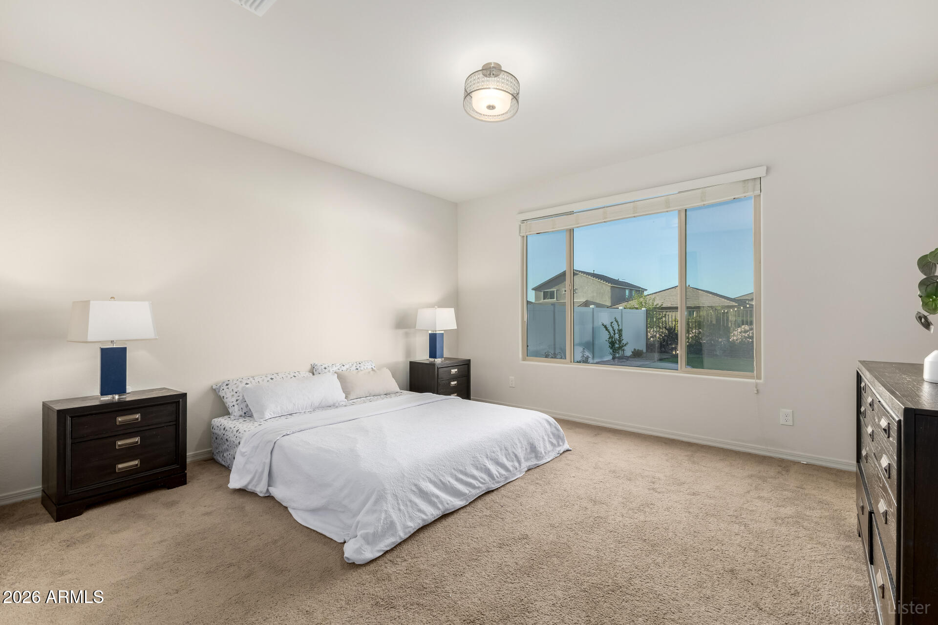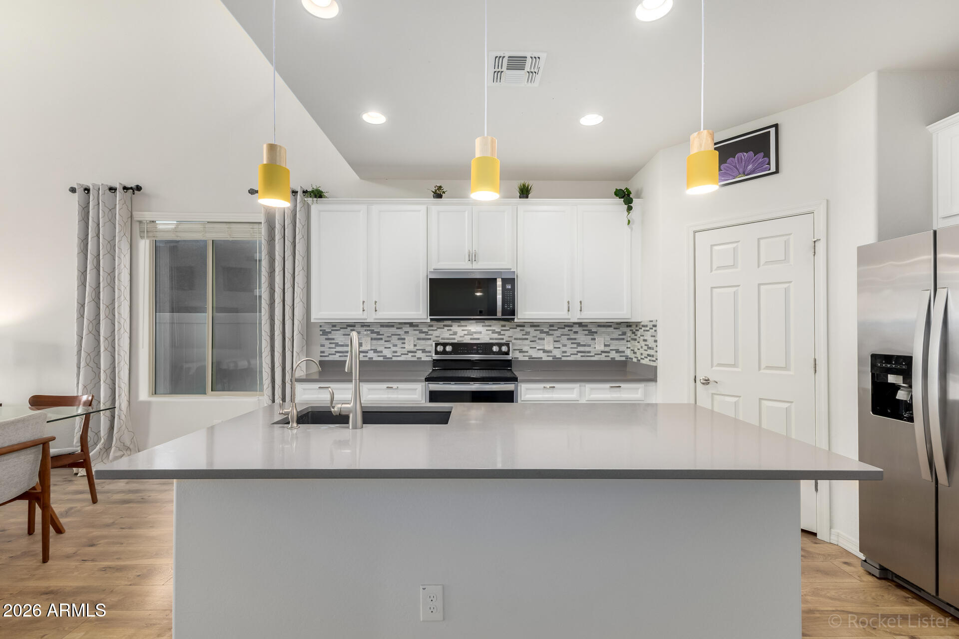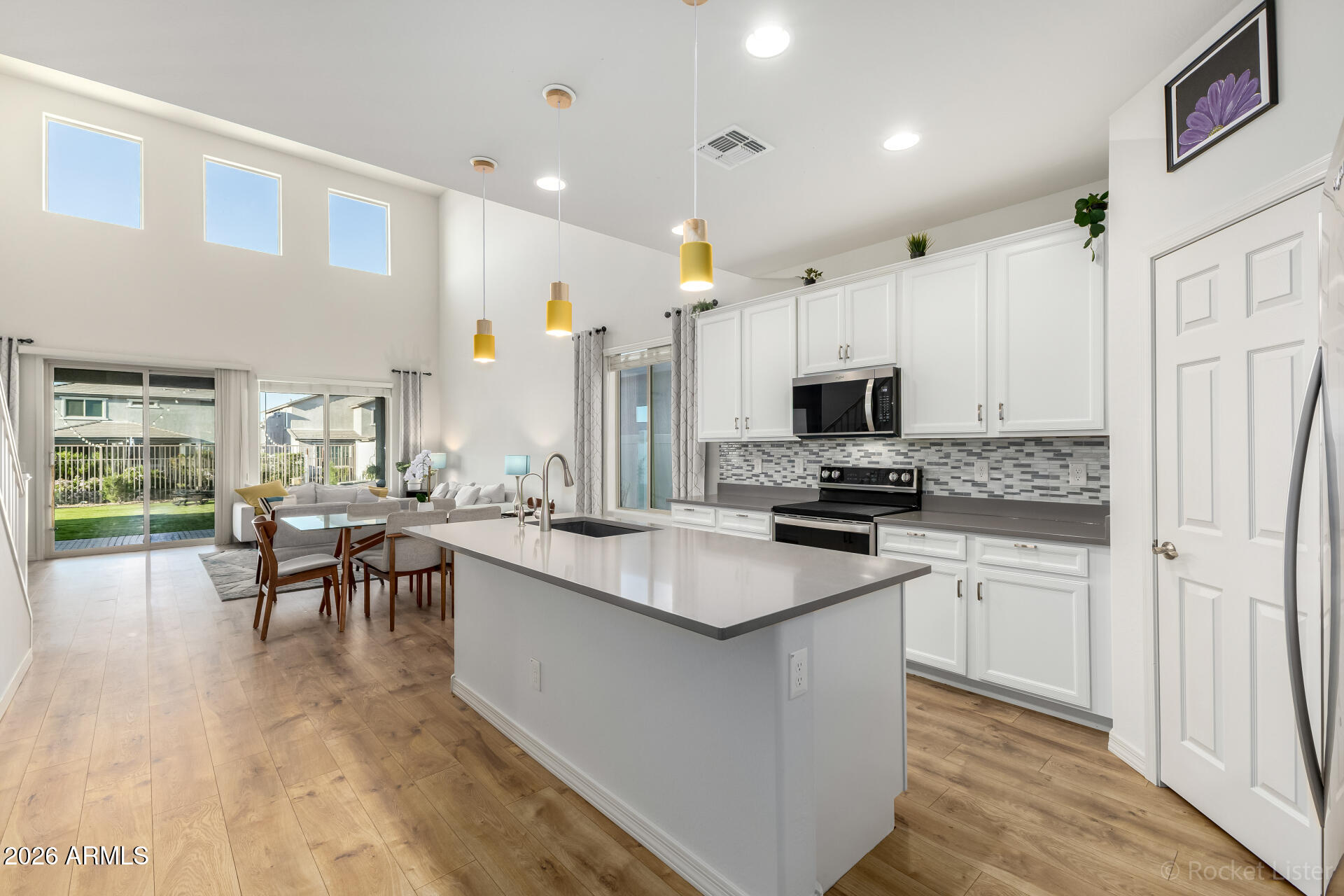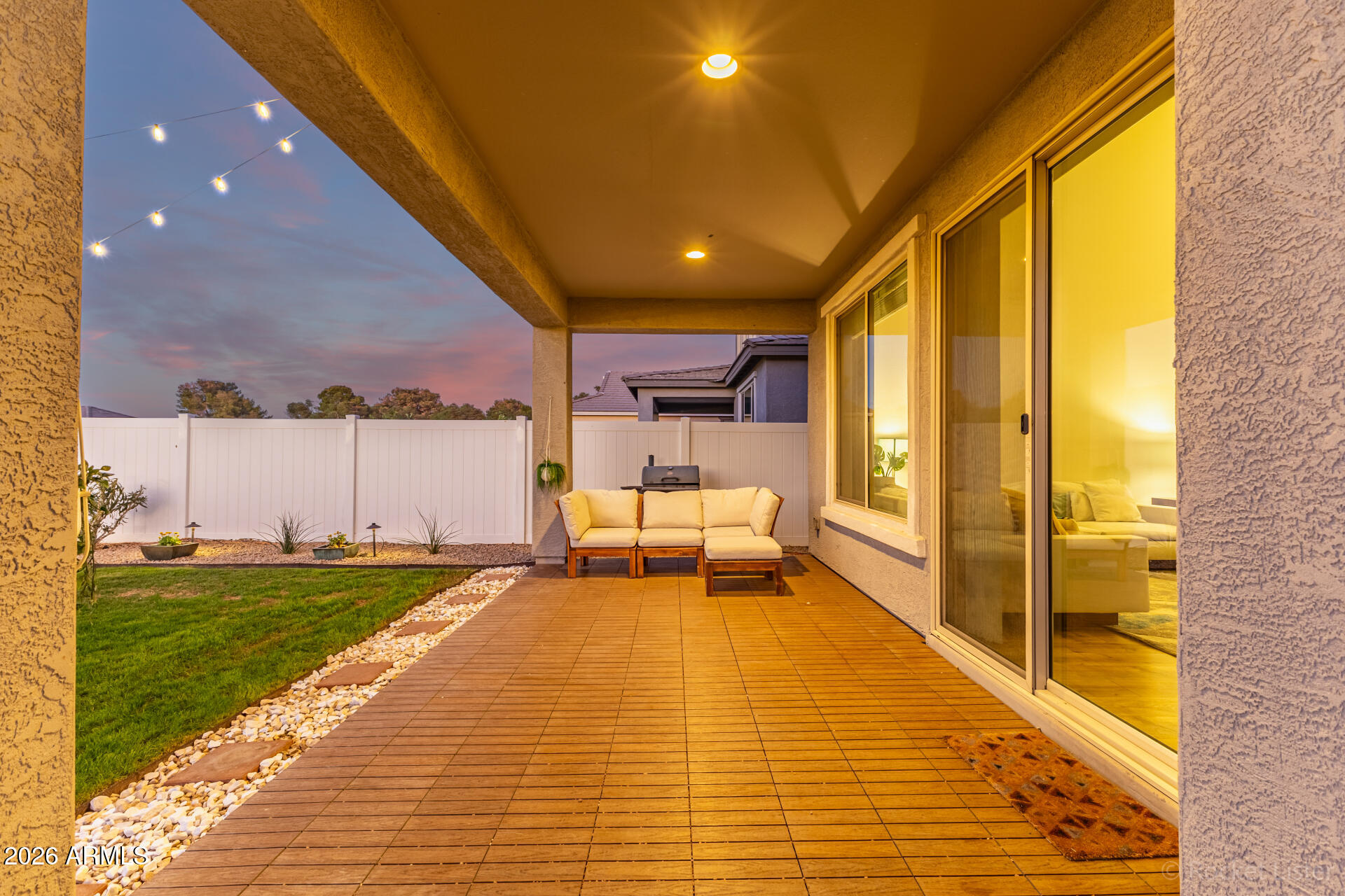 Step outside to a beautifully designed backyard featuring lush natural grass and charming bistro lighting that creates the perfect ambiance for relaxing evenings and unforgettable Arizona sunsets.