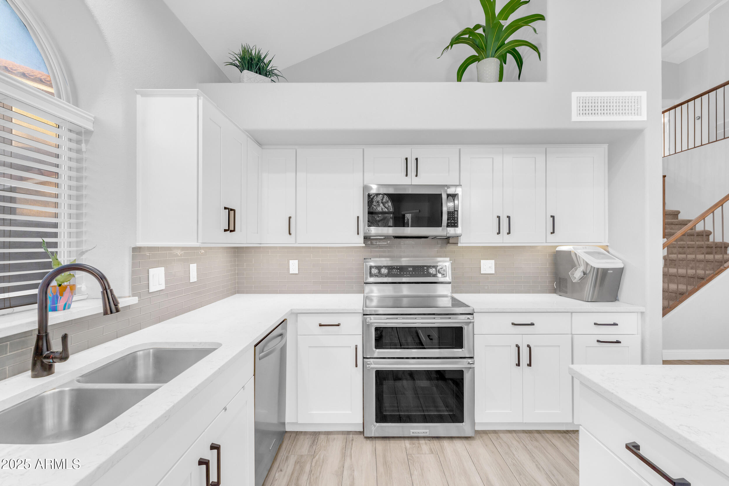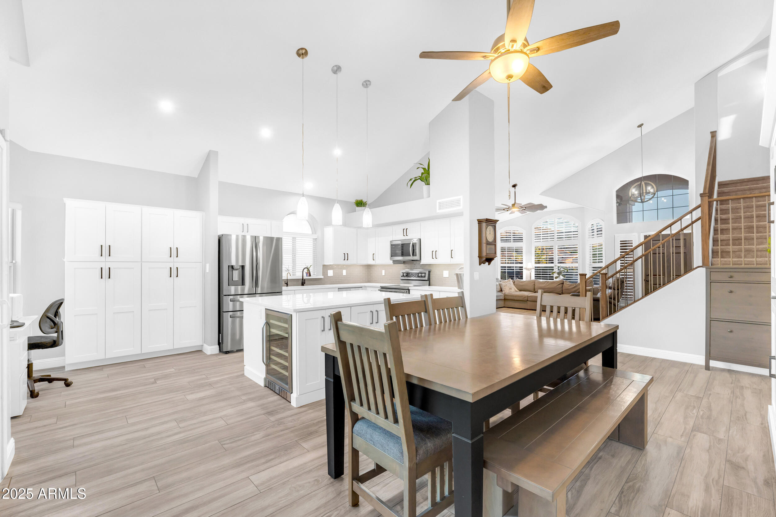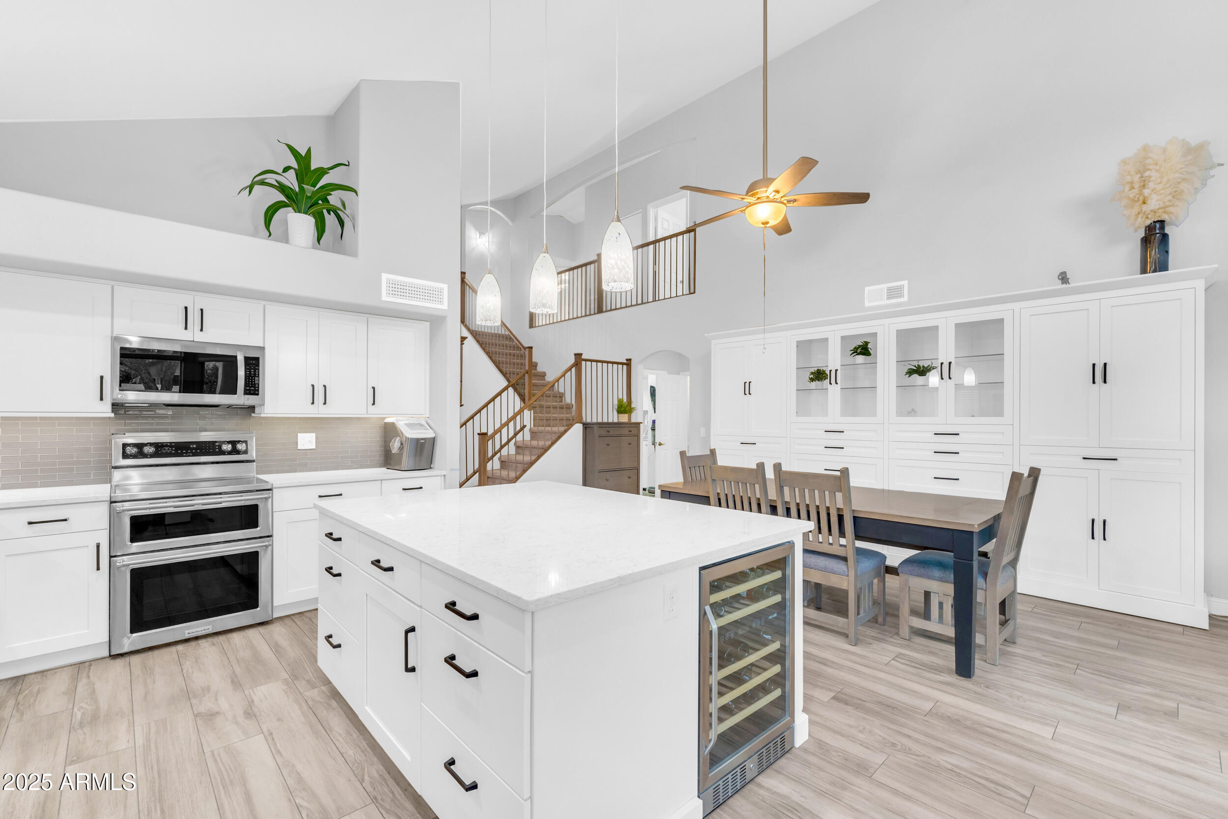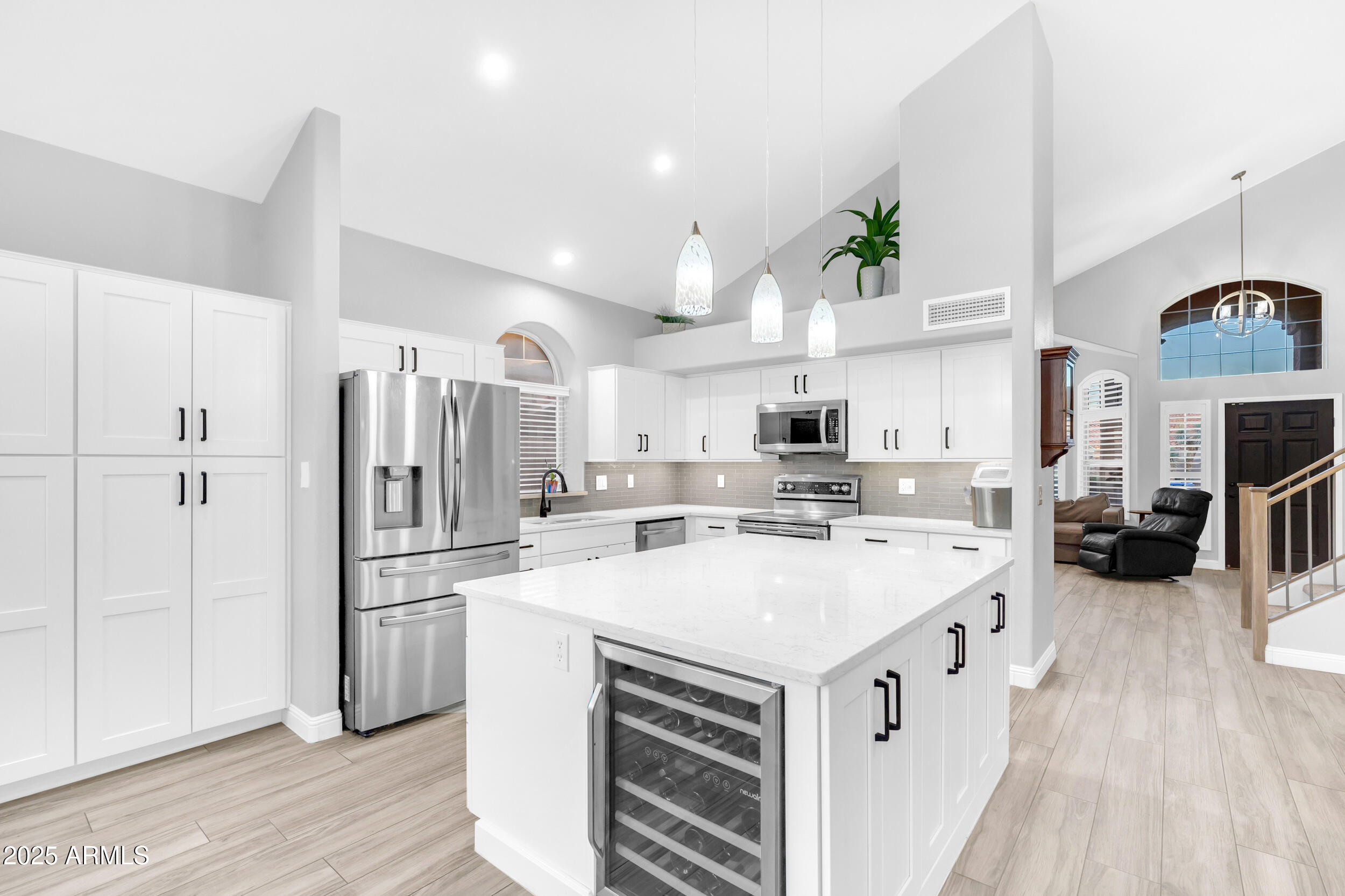The entire first level features new wood-look tile flooring and soaring vaulted ceilings, creating a bright, airy feel. Updated fixtures, stylish fans, and crisp white plantation shutters compliment the fresh custom paint, white baseboards and raised panel doors throughout. The updated banister and new carpet on the stairs and upper level add a clean and updated feel. The kitchen is a showstopper with an abundance of white shaker cabinets, sleek quartz countertops, stainless appliances, classic subway tile backsplash, and stylish pendants over a large island with storage and a wine fridge. Under-cabinet lighting and double ovens make this space both functional and beautiful. All exterior doors, including the front, have been replaced for peace of mind.