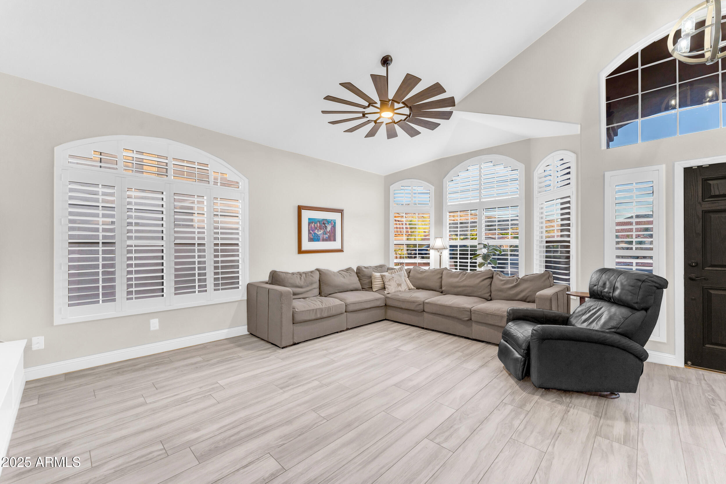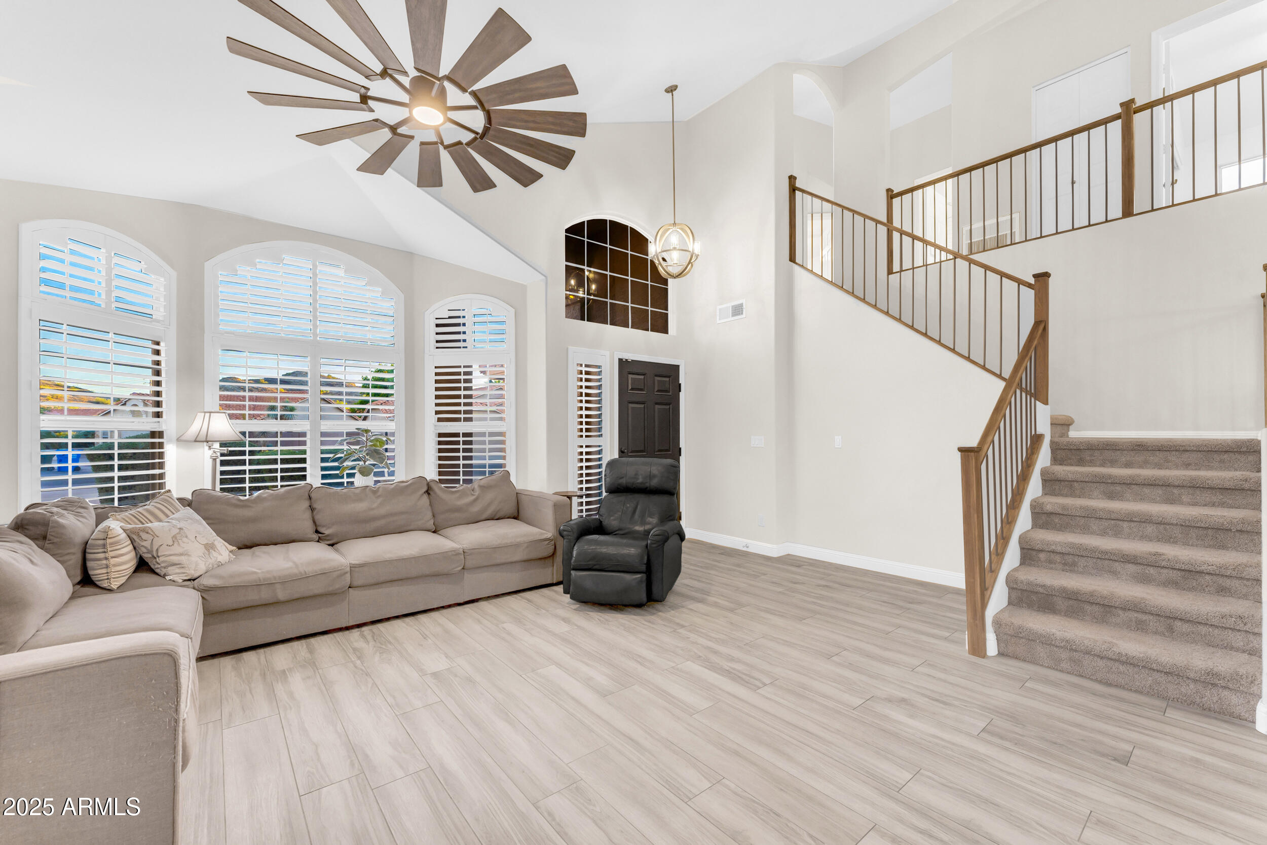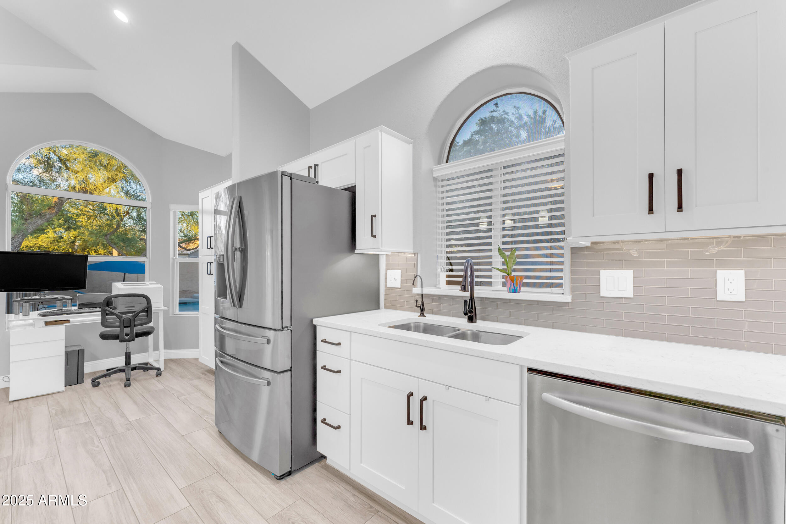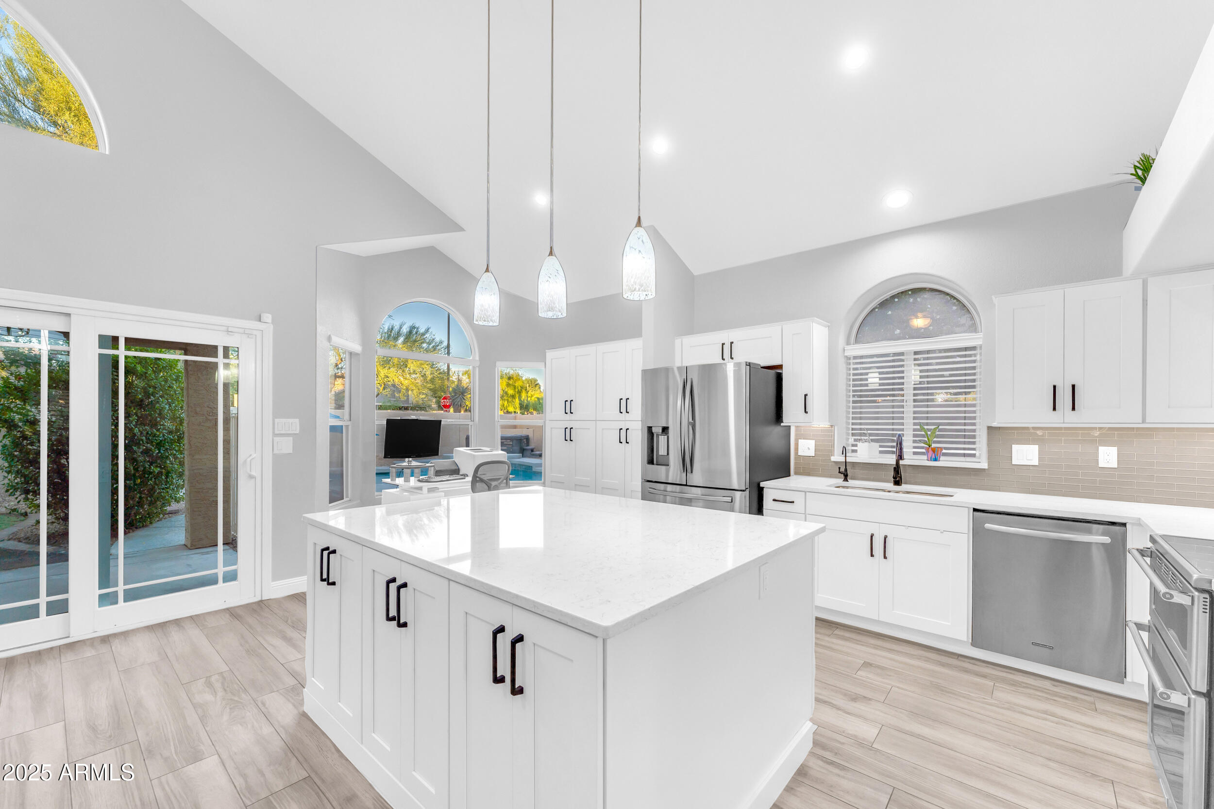 The entire first level features new wood-look tile flooring and soaring vaulted ceilings, creating a bright, airy feel. Updated fixtures, stylish fans, and crisp white plantation shutters compliment the fresh custom paint, white baseboards and raised panel doors throughout. The updated banister and new carpet on the stairs and upper level add a clean and updated feel. The kitchen is a showstopper with an abundance of white shaker cabinets, sleek quartz countertops, stainless appliances, classic subway tile backsplash, and stylish pendants over a large island with storage and a wine fridge. Under-cabinet lighting and double ovens make this space both functional and beautiful. All exterior doors, including the front, have been replaced for peace of mind.