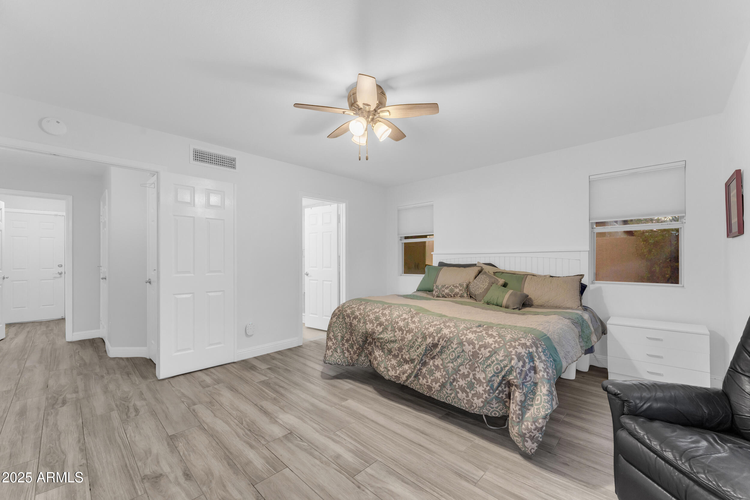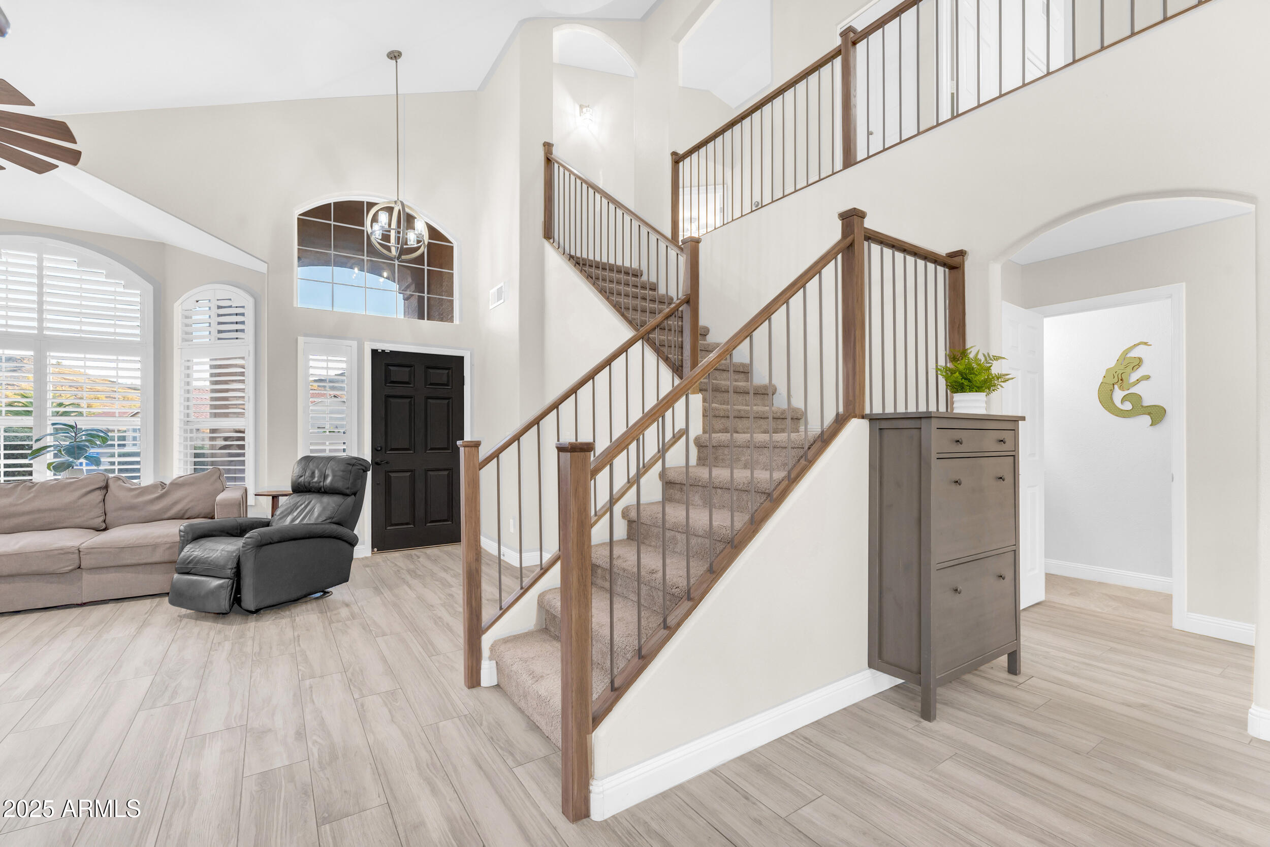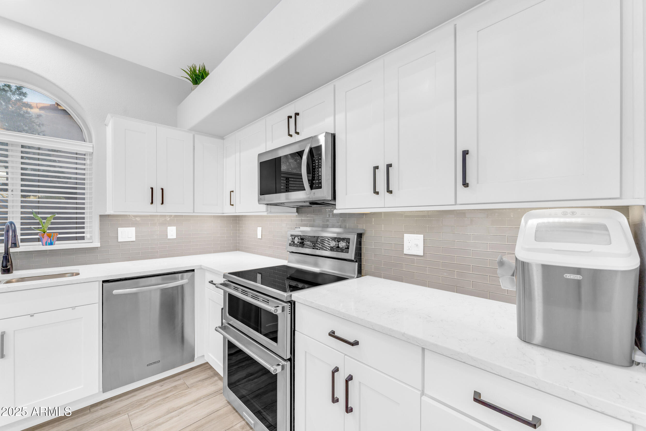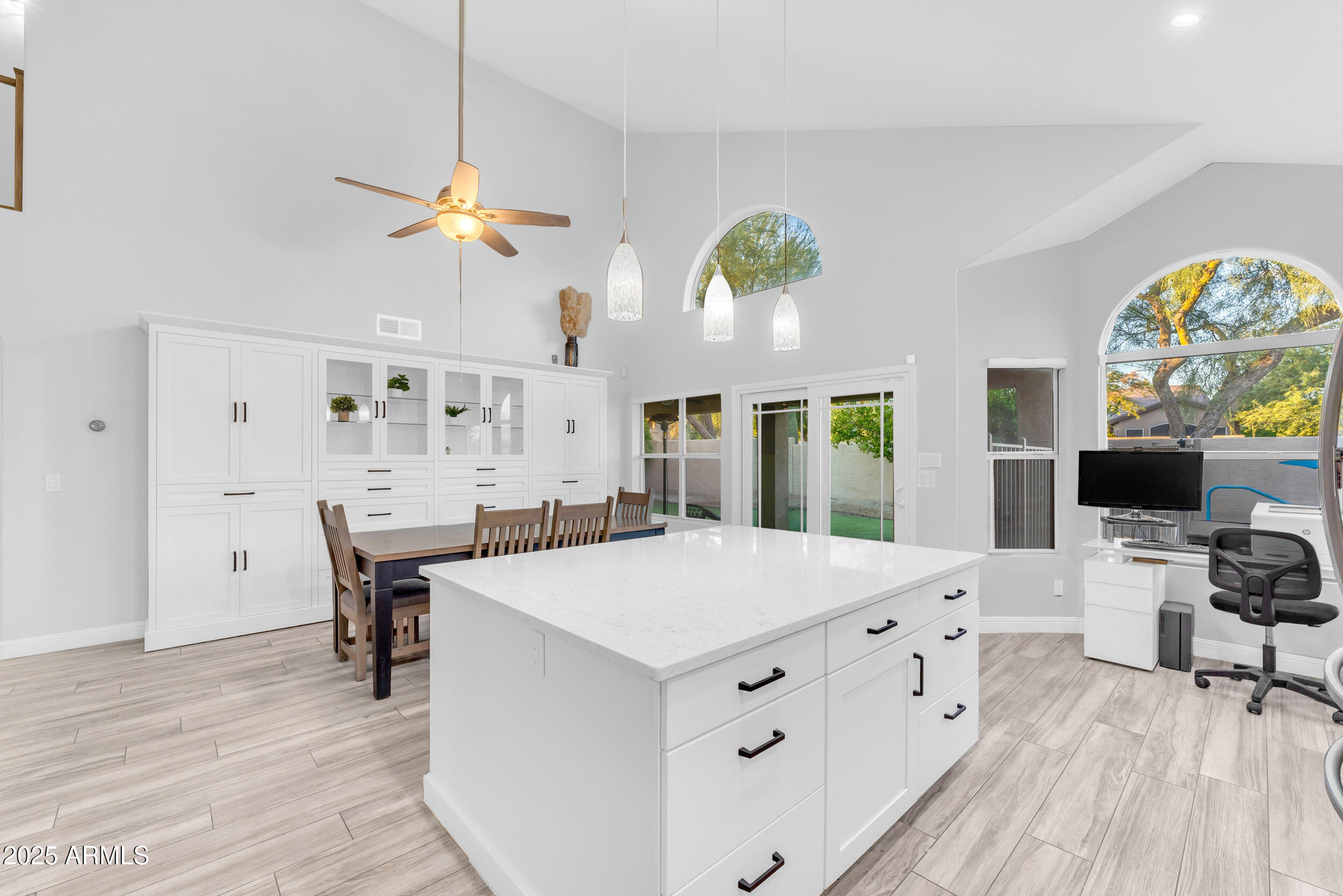 The entire first level features new wood-look tile flooring and soaring vaulted ceilings, creating a bright, airy feel. Updated fixtures, stylish fans, and crisp white plantation shutters compliment the fresh custom paint, white baseboards and raised panel doors throughout. The updated banister and new carpet on the stairs and upper level add a clean and updated feel. The kitchen is a showstopper with an abundance of white shaker cabinets, sleek quartz countertops, stainless appliances, classic subway tile backsplash, and stylish pendants over a large island with storage and a wine fridge. Under-cabinet lighting and double ovens make this space both functional and beautiful. All exterior doors, including the front, have been replaced for peace of mind.