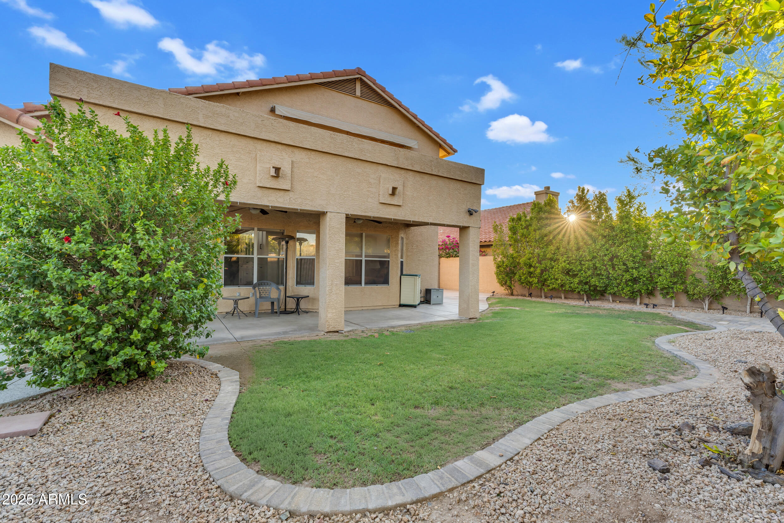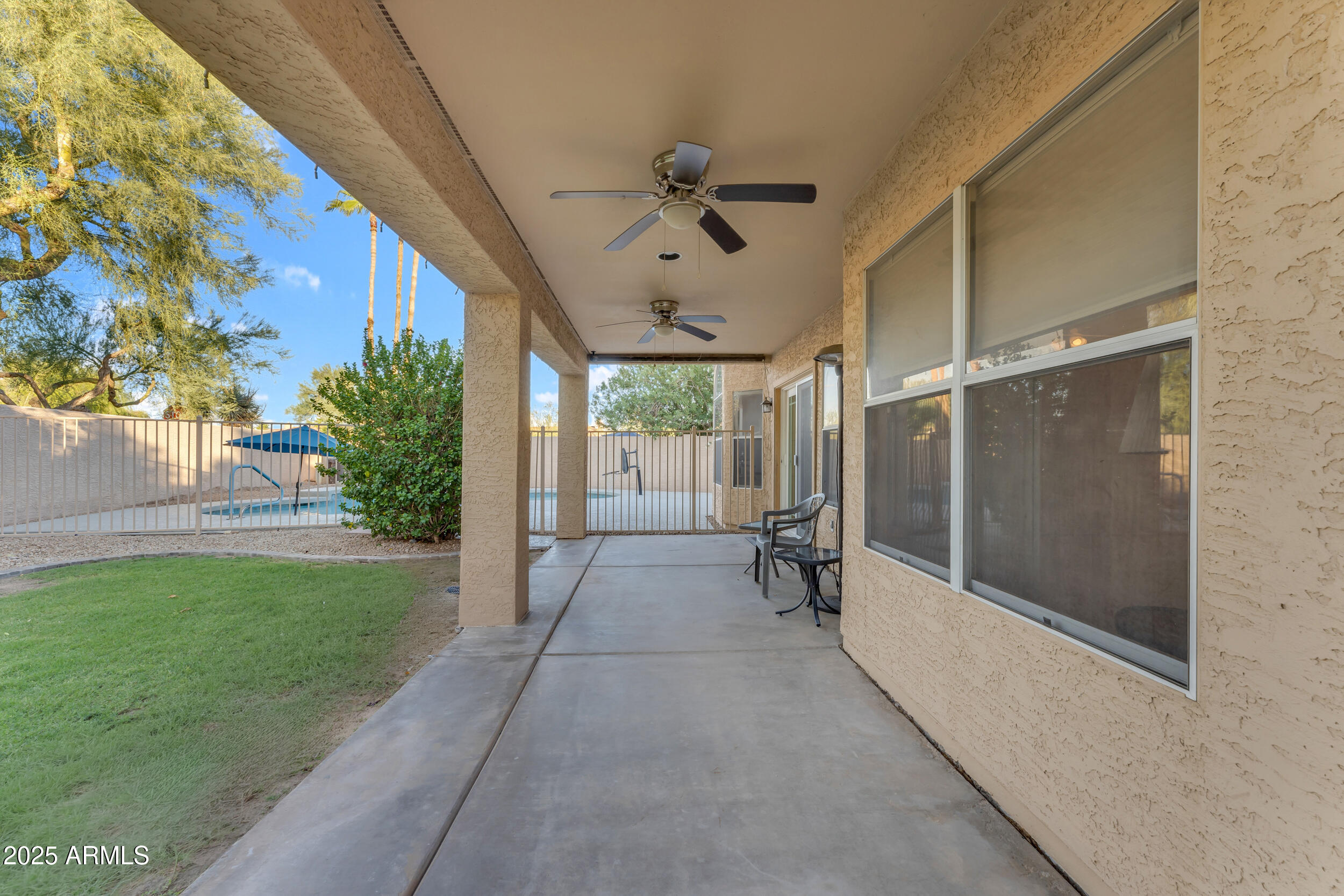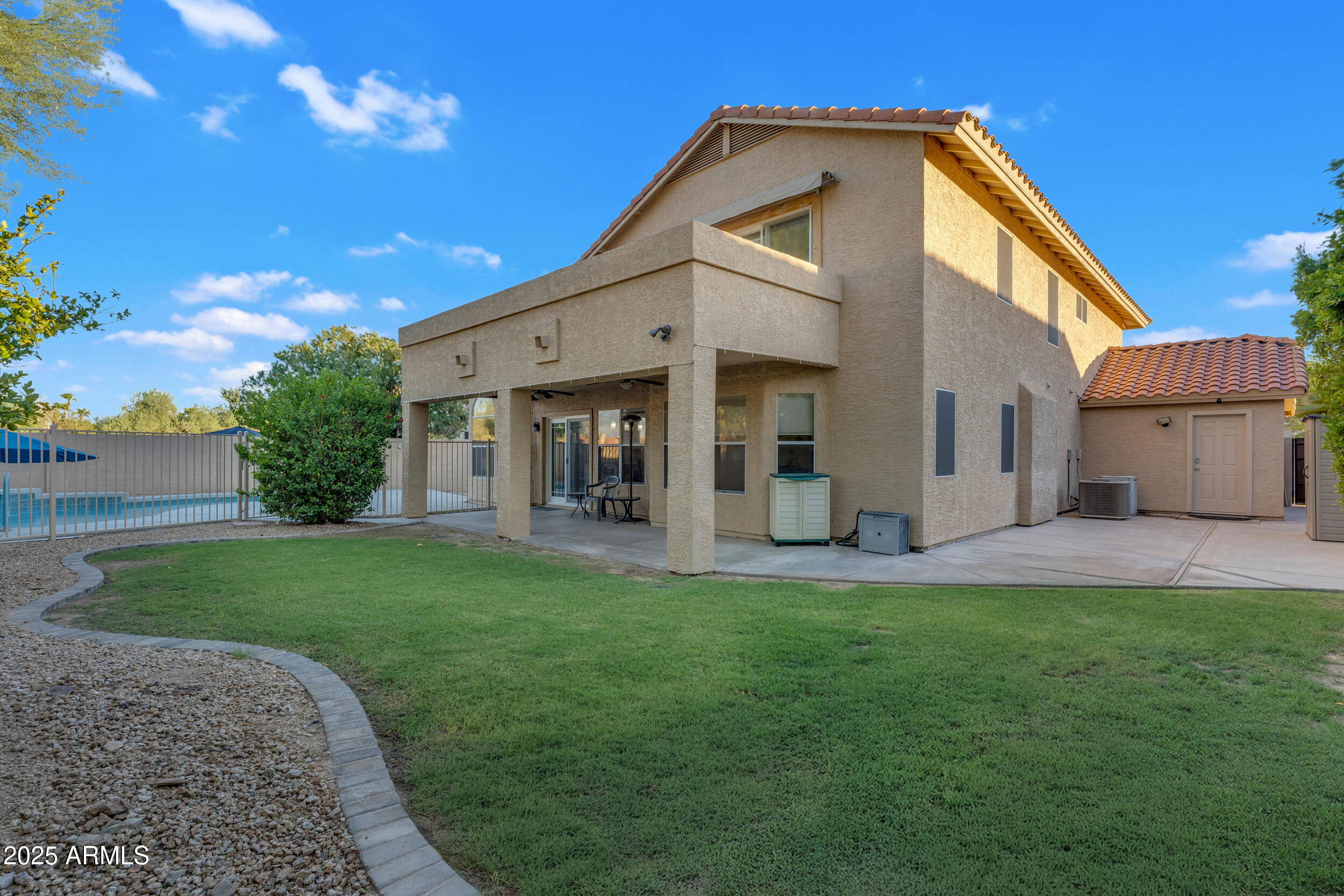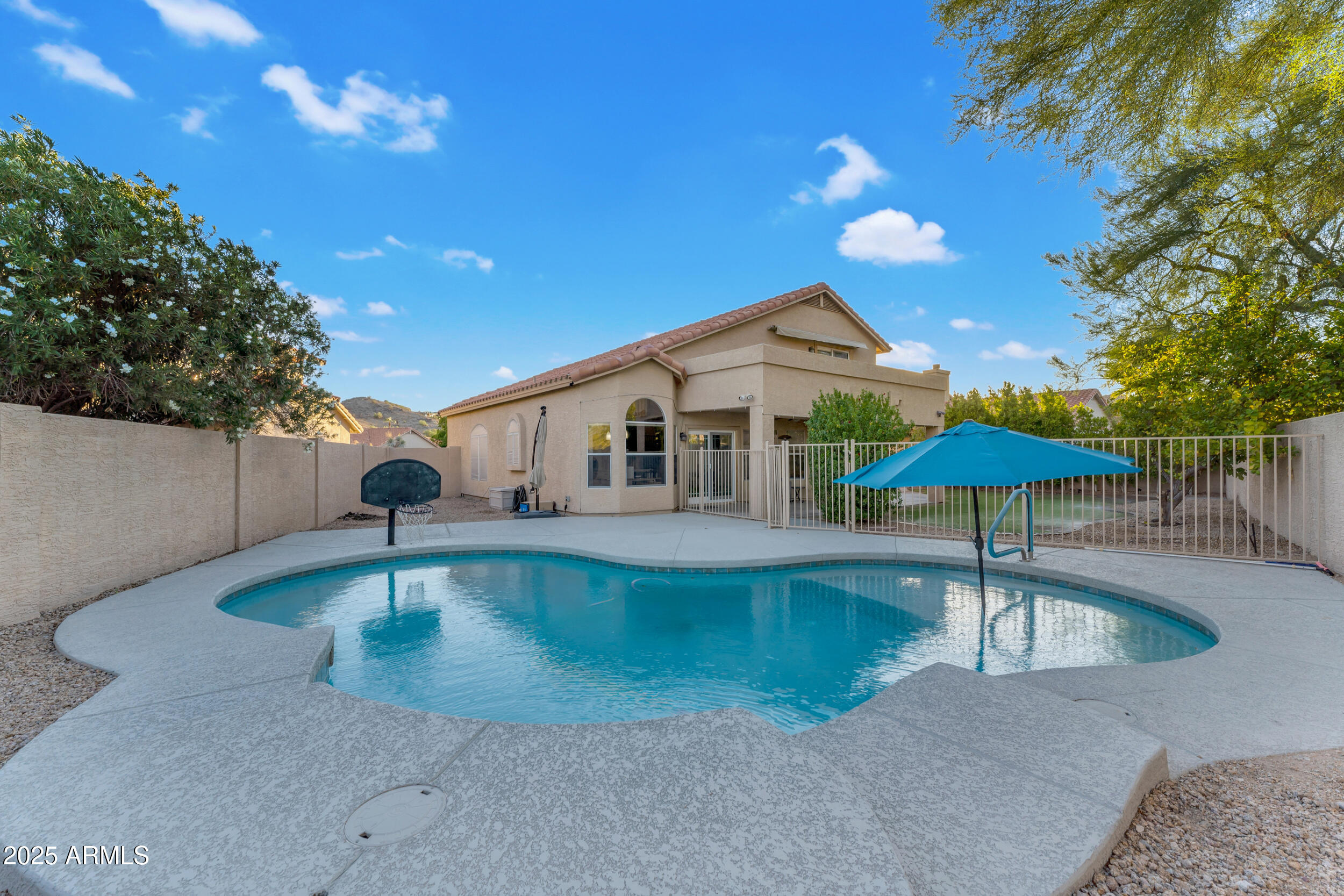 The backyard is an entertainer's dream with a gated play pool featuring a Baja step, grab bar, umbrella holder and basketball hoop. There's also a concrete play area, mister system to keep the patio cool, above-ground spa, mature landscaping and real grass. The extra-large covered patio is ideal for gatherings, and the garage includes a convenient service door that opens to the side yard.