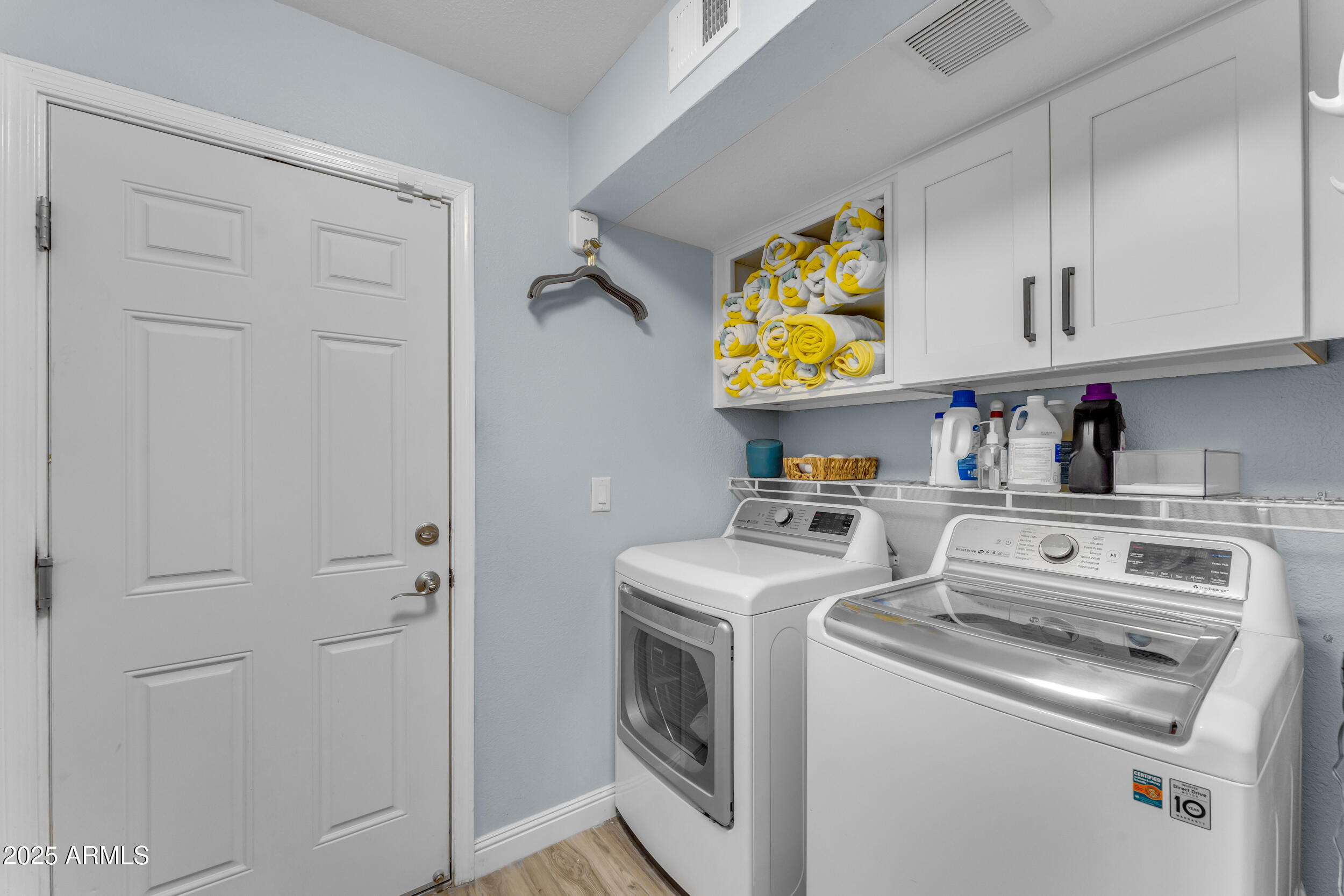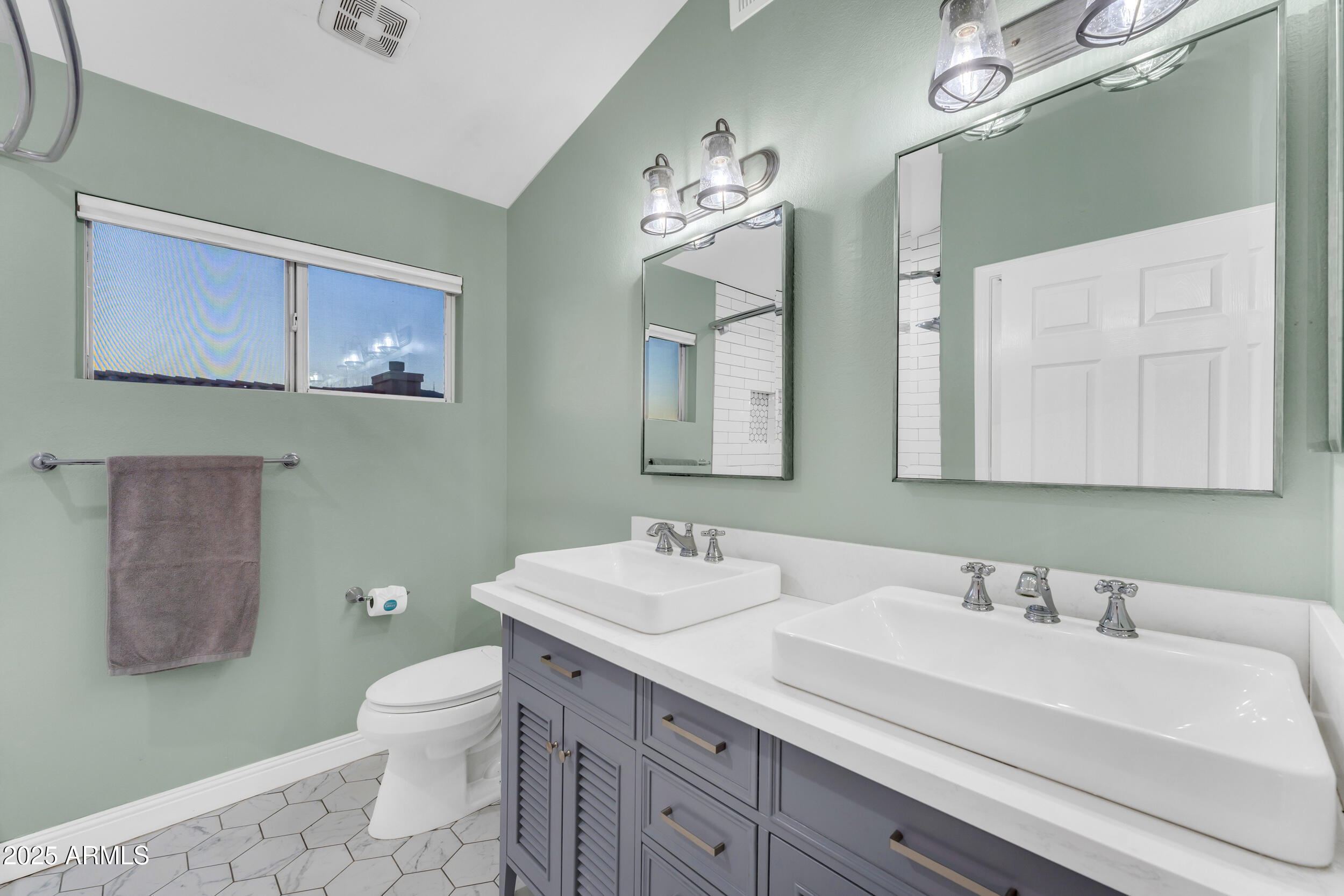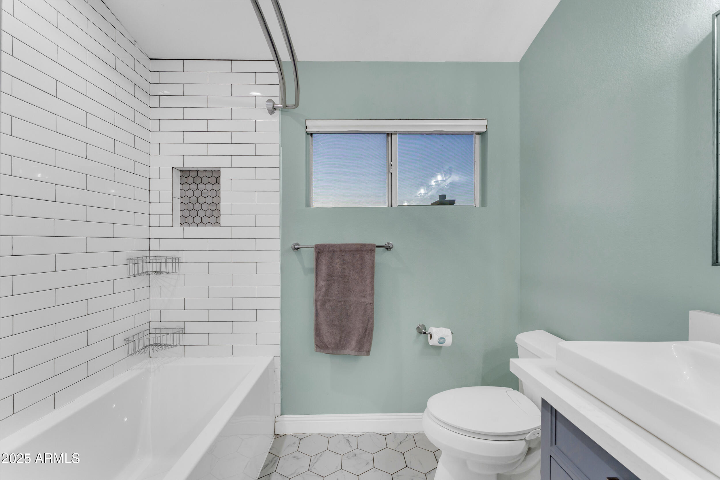 The fully remodeled guest bath offers updated lighting, new mirrors, a modern double vanity, and a shower/tub combo with classic subway tile. The laundry room is equipped with cabinets and shelves for storage.