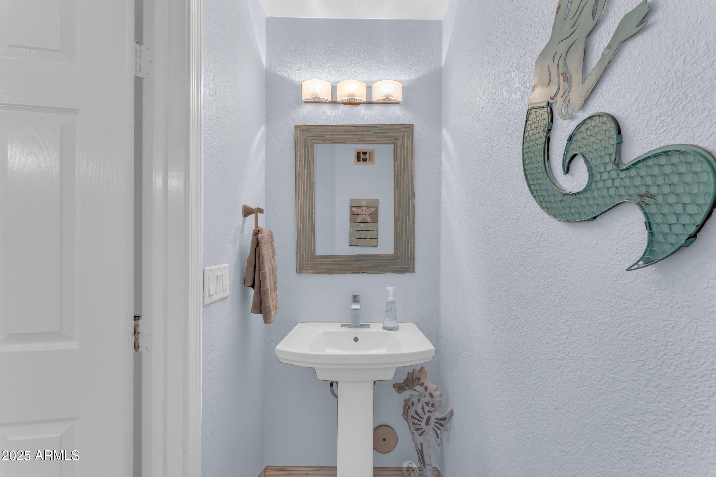 A convenient half bath with a pedestal sink is perfect for convenience and guests. The private master suite is on the main level and overlooks the extra-large backyard, pool, and covered patio. The suite features a double door entry, oversized walk-in shower with updated tile, double square sinks with framed mirrors and a large walk-in closet.