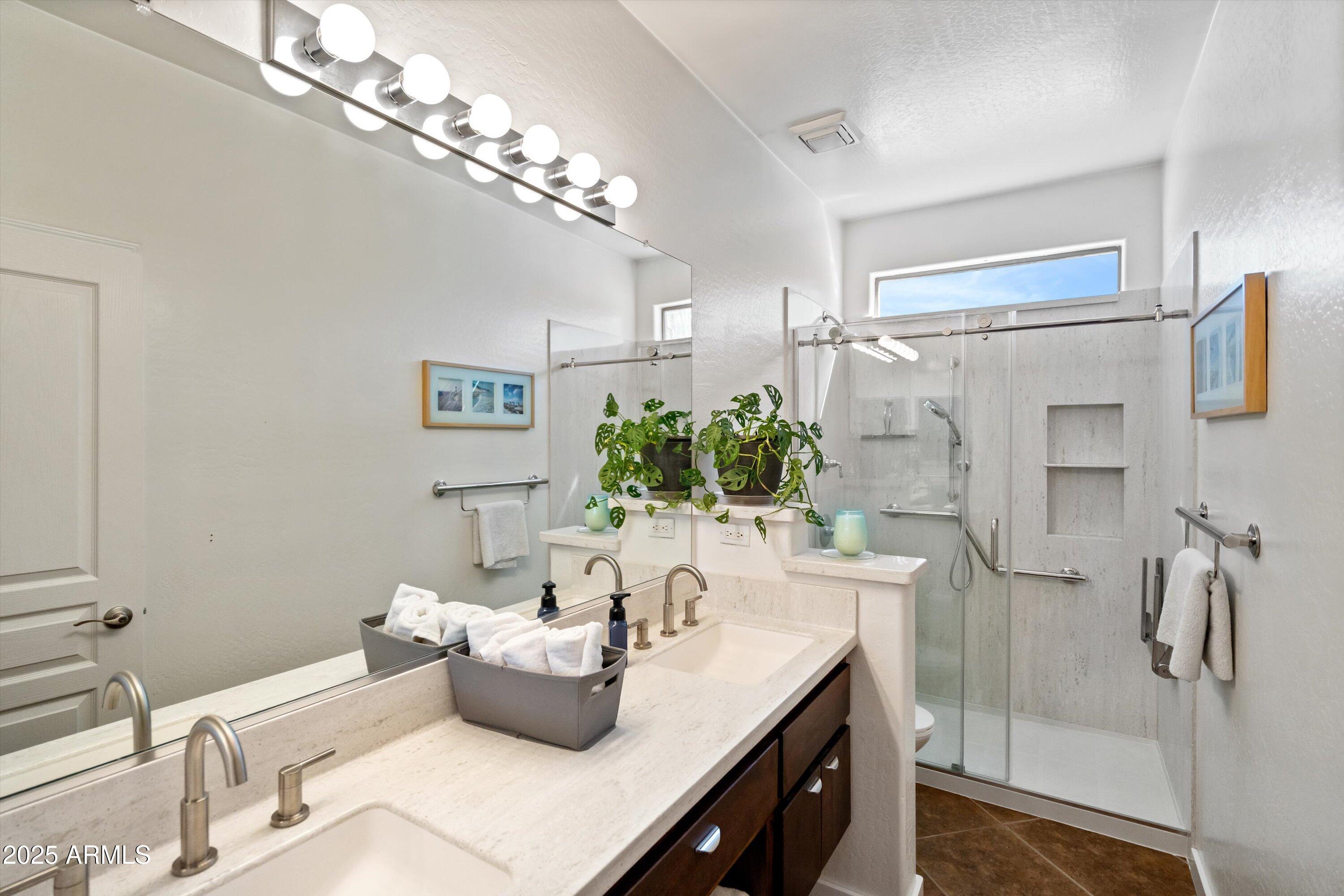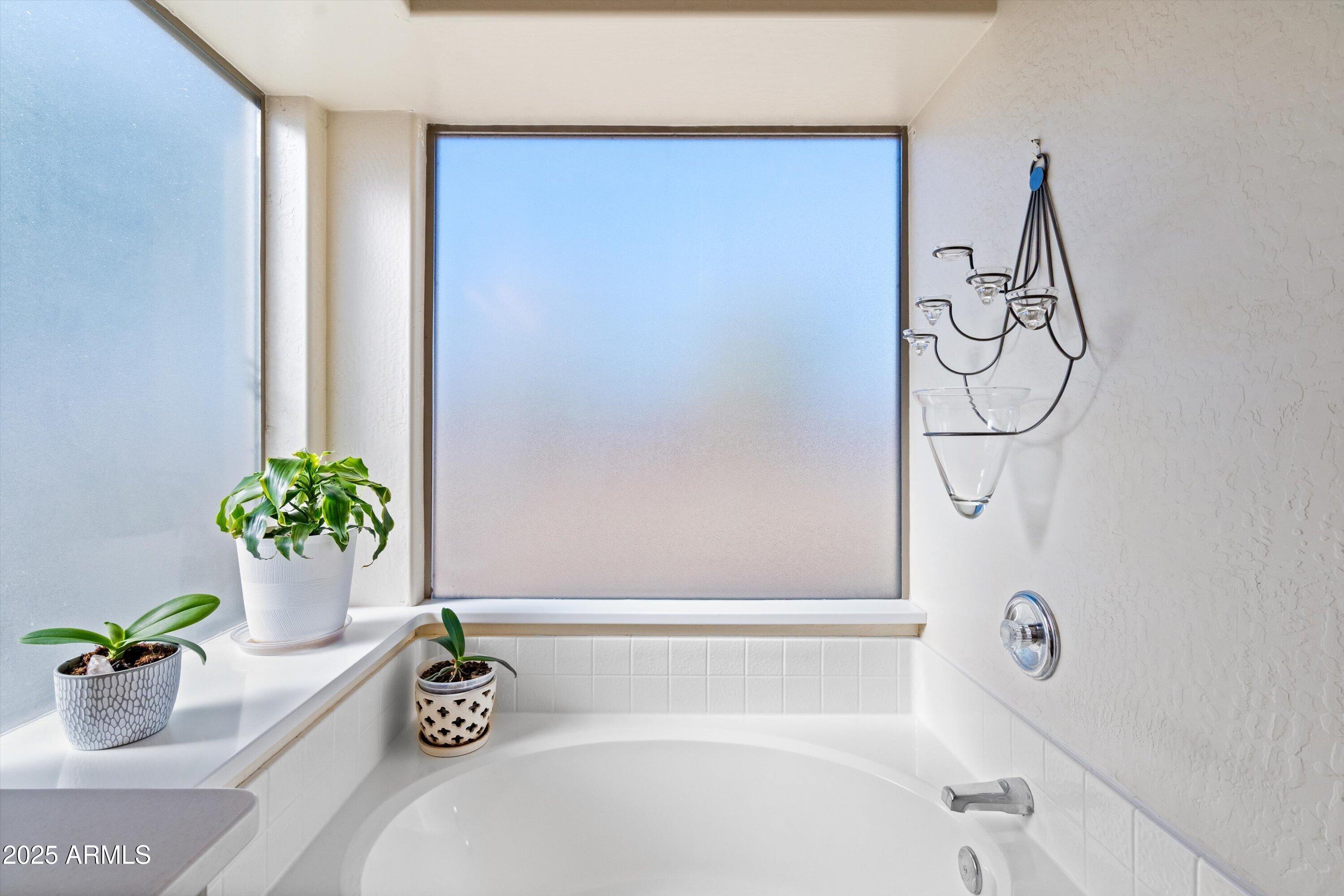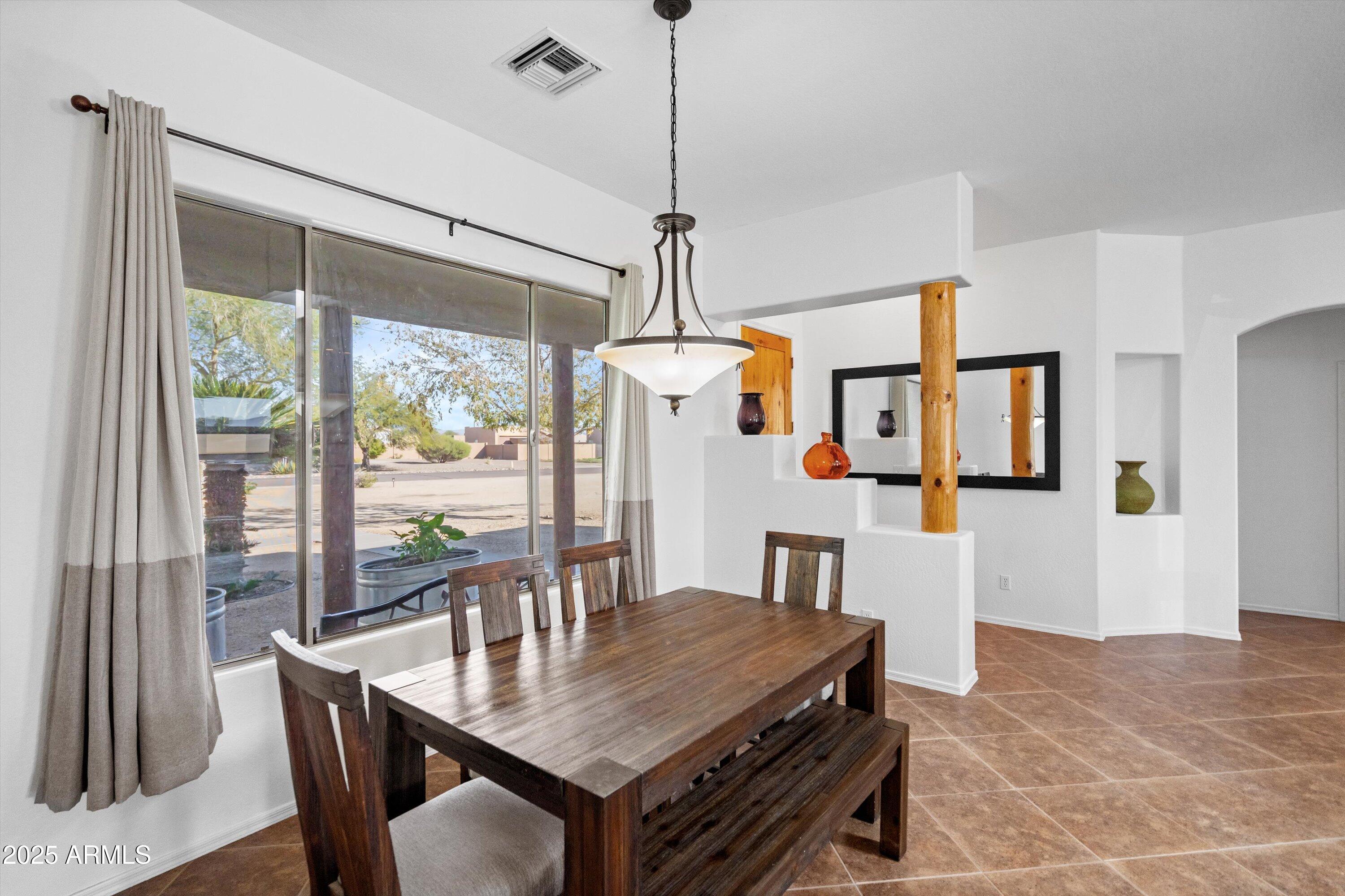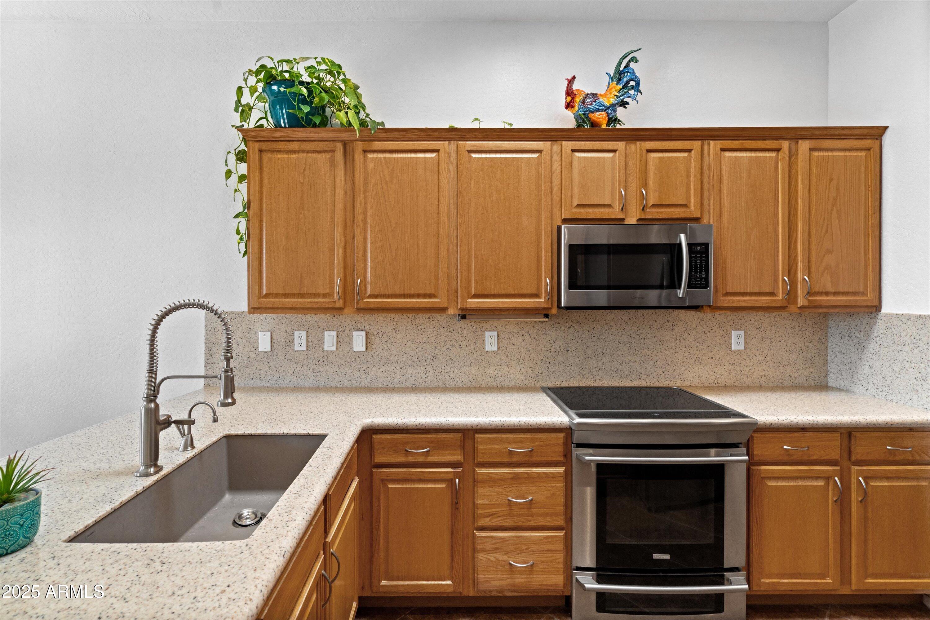 Perfect for move-up buyers looking for more space, flexibility, and lifestyle, this NO HOA 4-bedroom, 3-bath home offers an open, inviting layout with 10-ft ceilings, skylights, and mountain views. Inside, you'll find tile in all the right places, fresh new carpet in the bedrooms, and a split master bedroom floorplan for added privacy. The kitchen is designed for everyday living and entertaining with Corian counters, a modern backsplash, stainless steel appliances, a breakfast bar, instant hot water, and an RO system. An extended-length 6-car garage setup--including an RV garage and a detached 3-car garage with its own bathroom--provides incredible room for vehicles, toys, hobbies, or a workshop, all easily accessed by an electric gate leading to the backyard and RV area. The backyard feels like your own private retreat with a remodeled pool featuring a water feature and outdoor fireplace, a covered patio, shaded seating areas, and an outdoor kitchen with granite counters and built-in BBQ, ideal for enjoying Arizona evenings. With exterior paint completed in 2024 and thoughtful upgrades throughout, this property combines extra space, modern comfort, and resort-style outdoor living in a way that's hard to find, especially with the added freedom of no HOA.