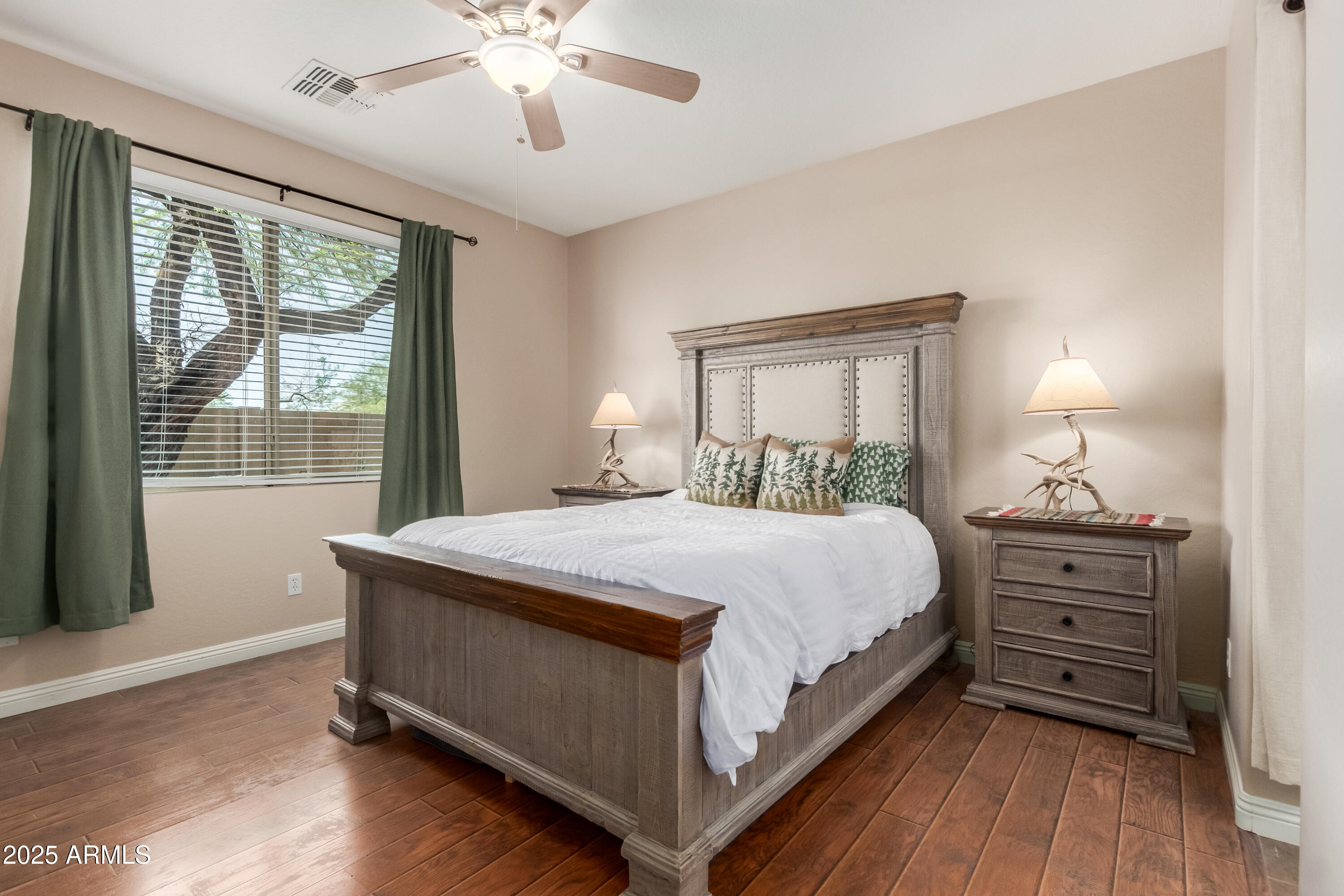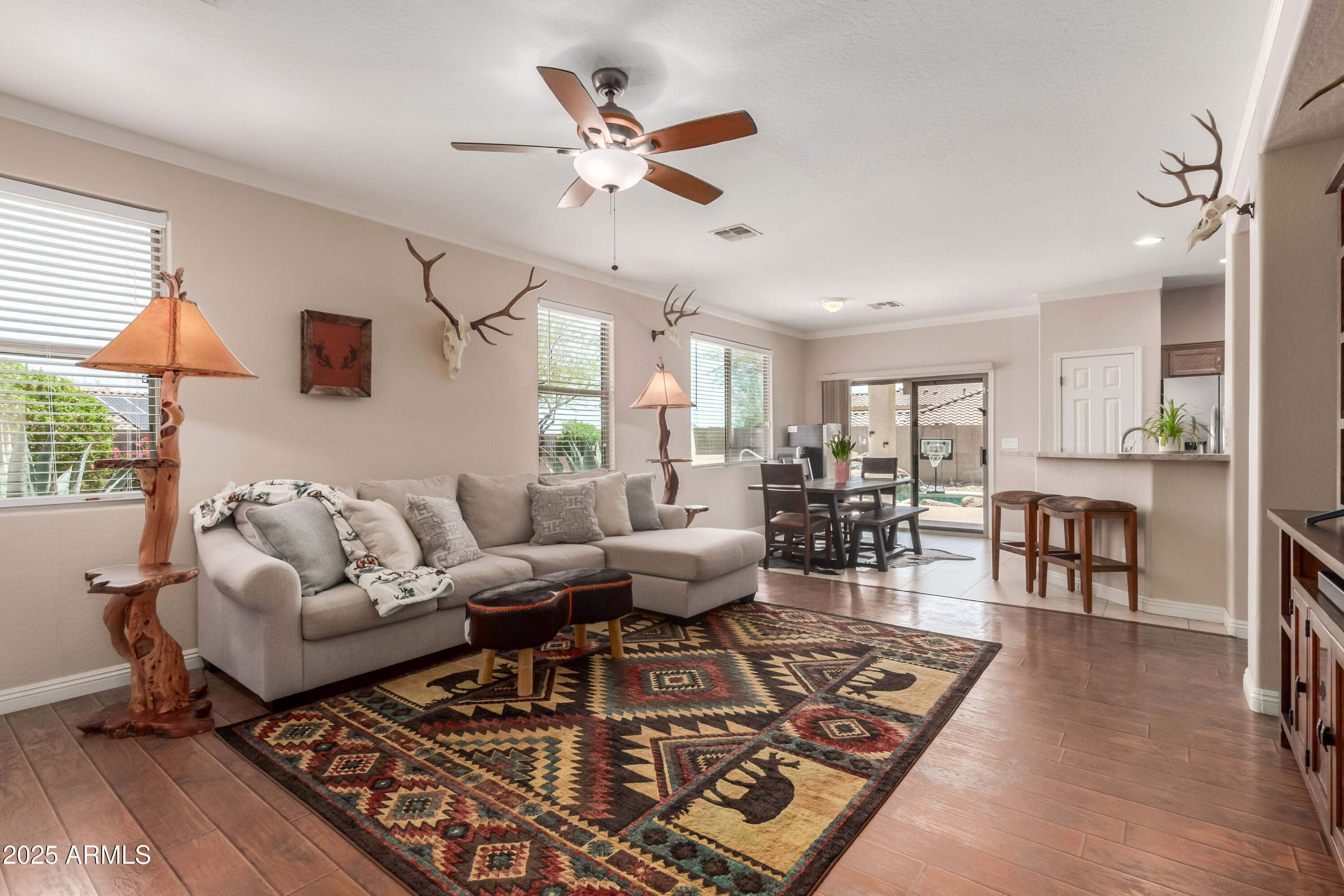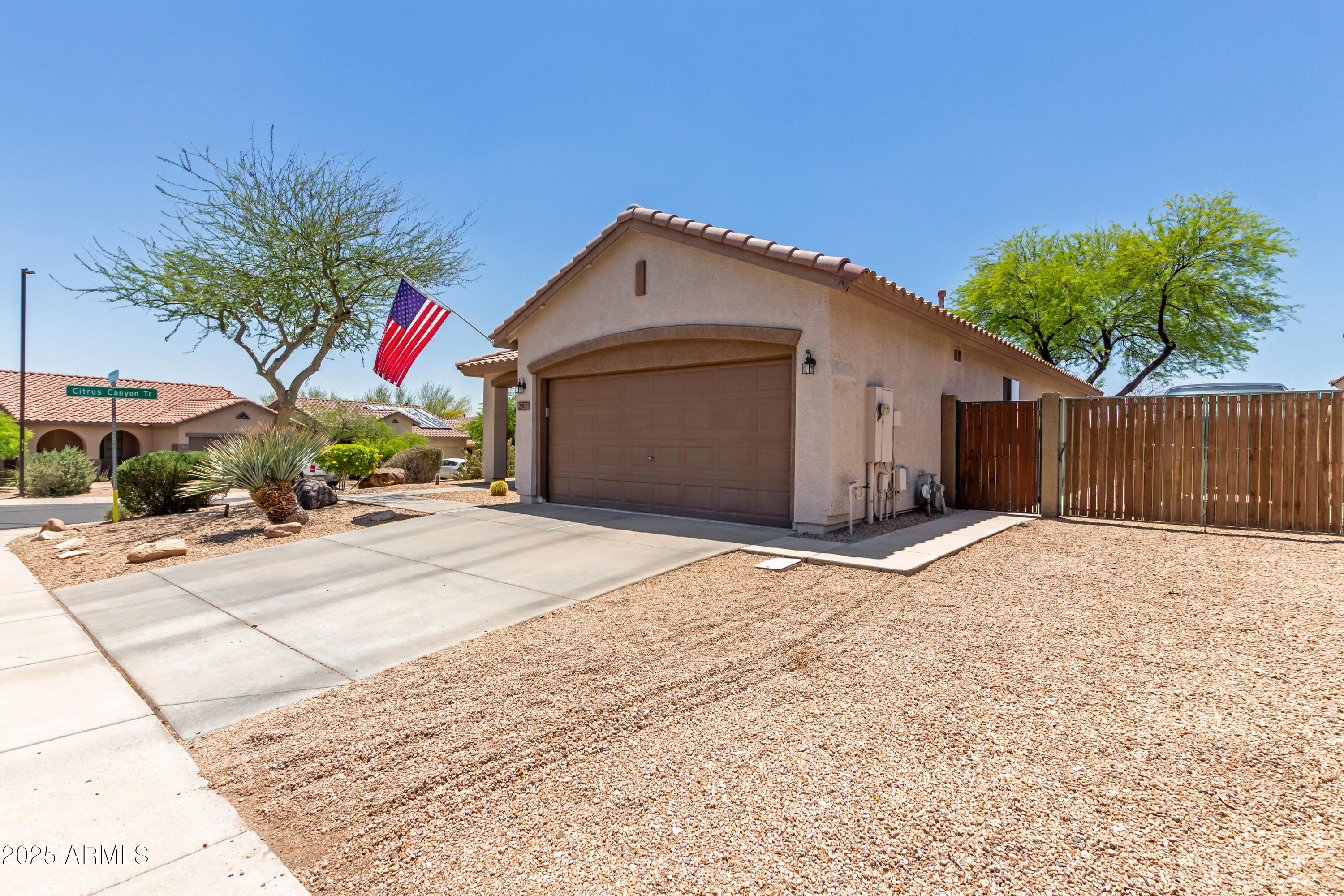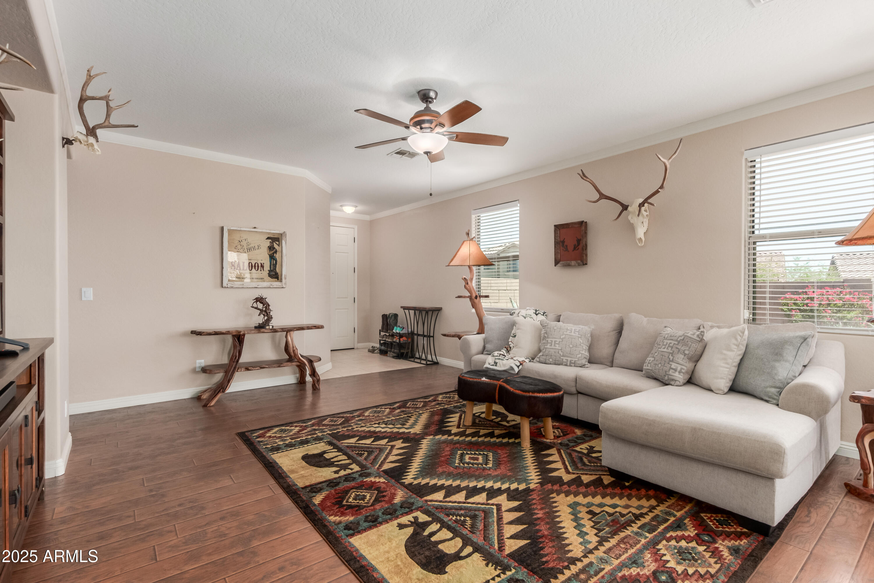 Priced to sell! This stunning 3-bed, 2-bath home in Anthem with 1,431 sq ft and a desirable split floor plan. Step inside to hardwood floors, elegant crown molding, and an updated kitchen with granite countertops, custom backsplash, and stainless-steel appliances. The spacious primary suite boasts dual sinks and a walk-in closet with built-ins. Enjoy a private RV side yard with gate, epoxy flooring garage, and a resort-style backyard with a covered patio, sparkling pool, and spa with waterfall features. New pool pump and automation system. Access to Anthem's top-tier amenities: heated pool, waterpark, fitness center, sports courts, parks, and more. A true must-see!