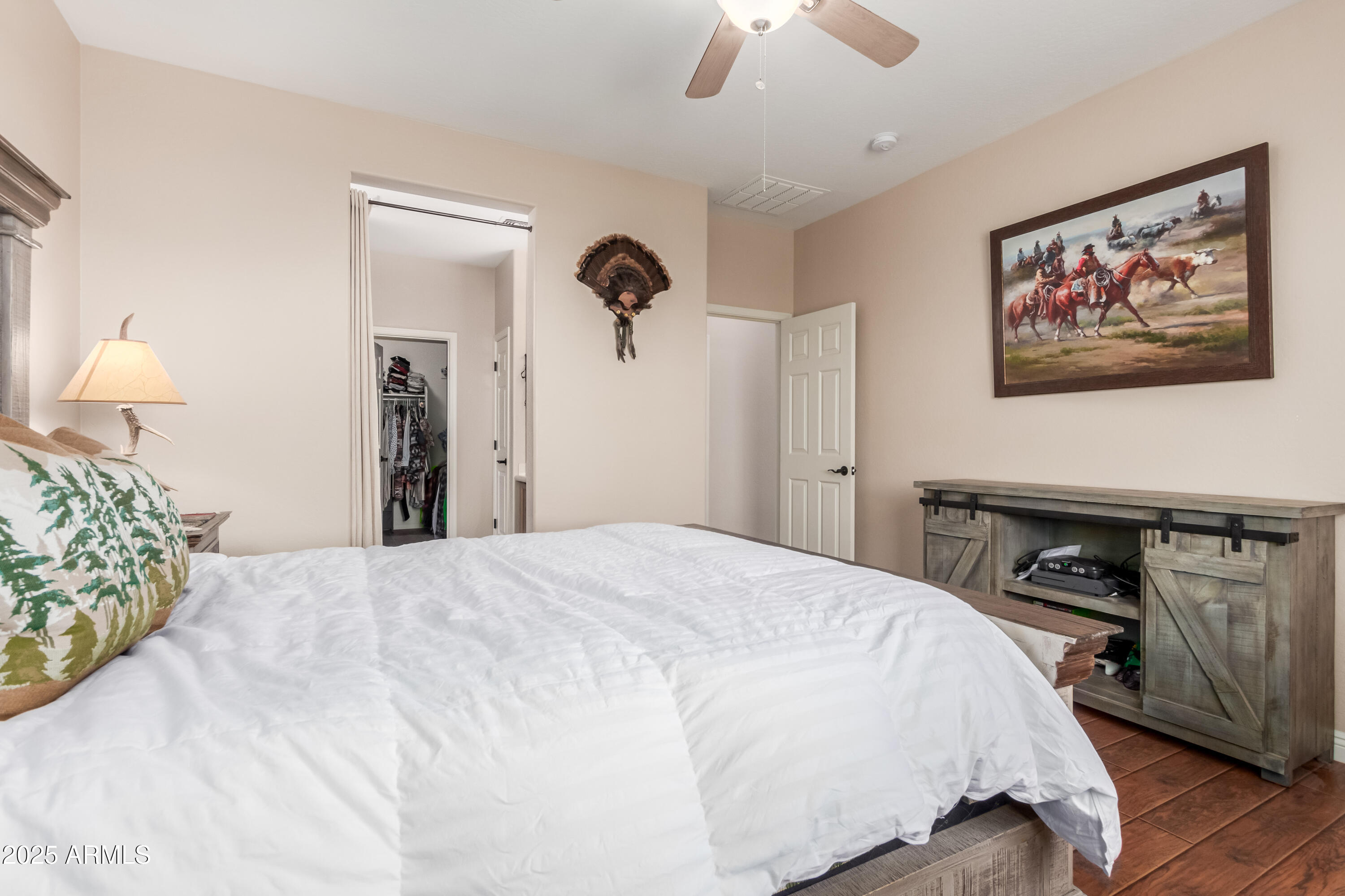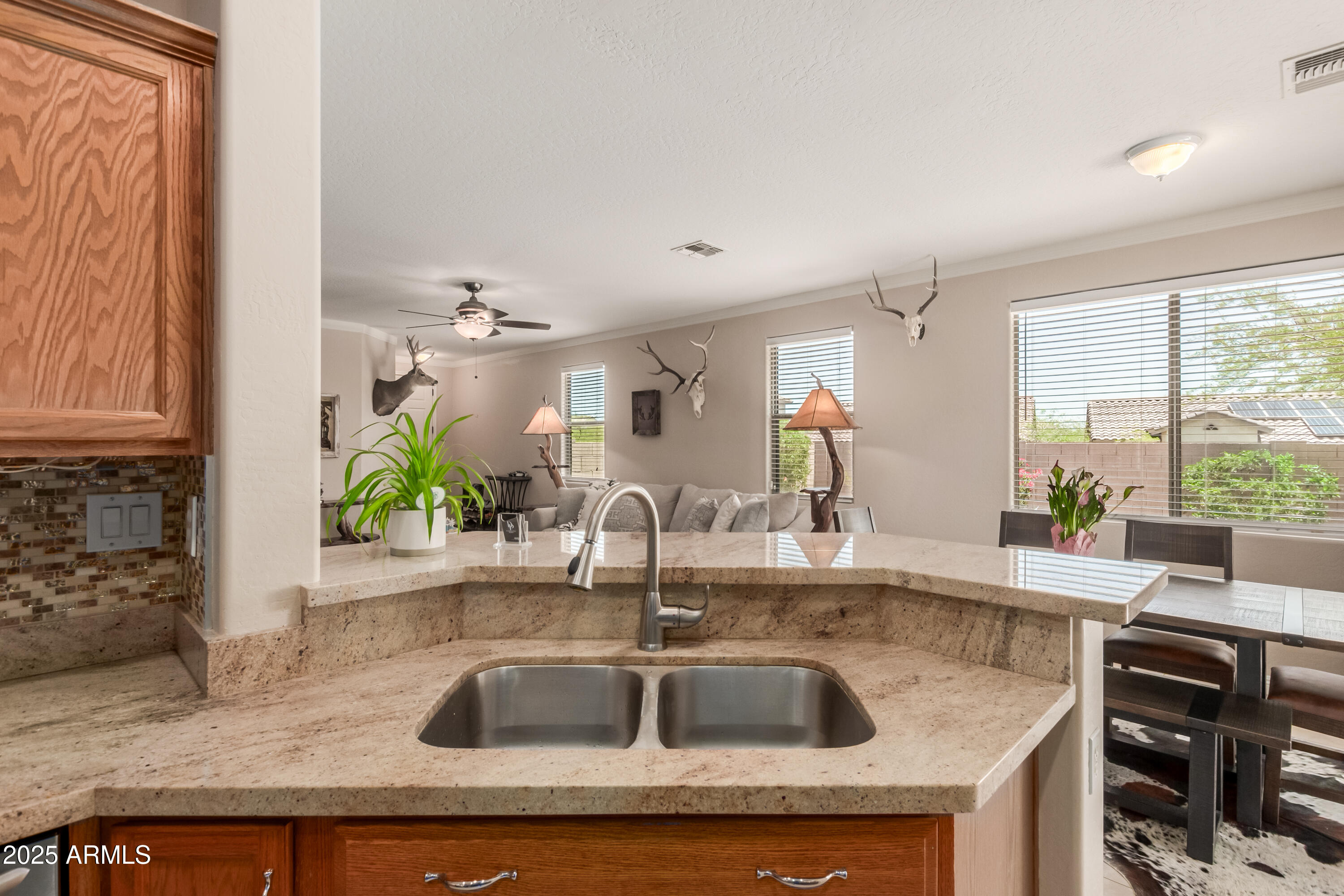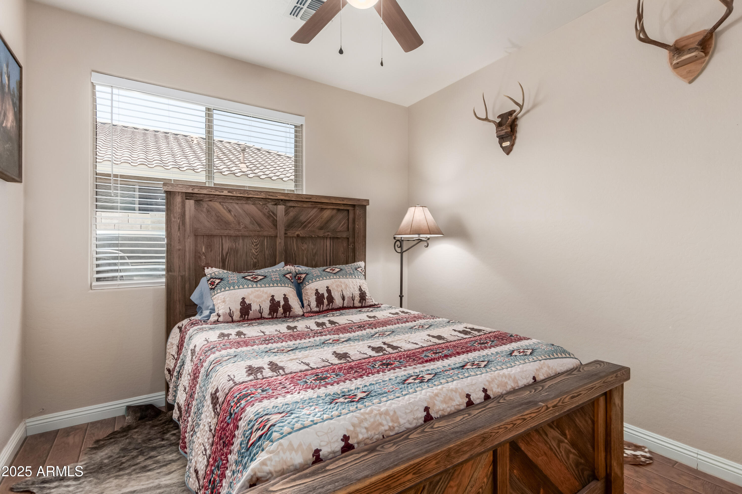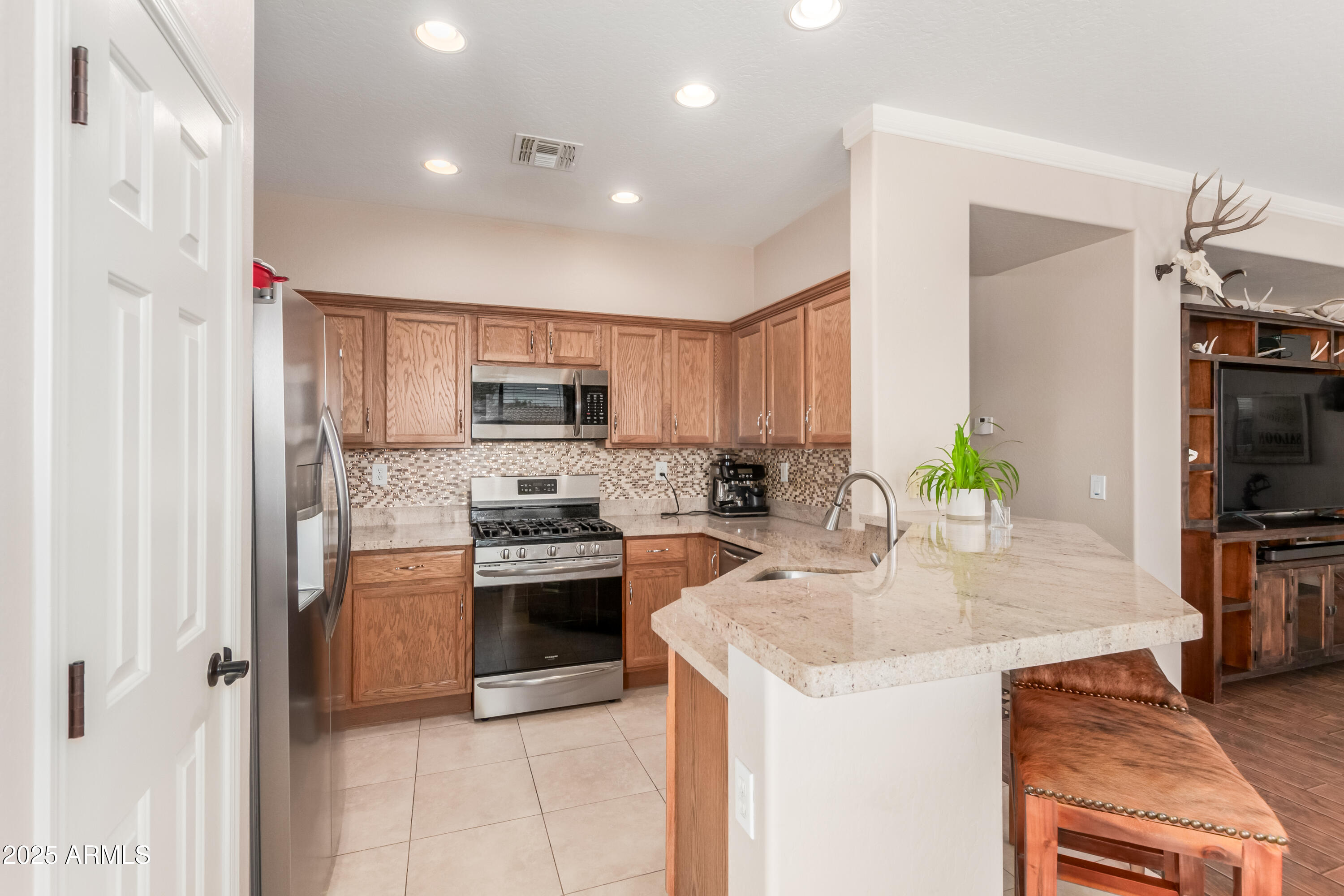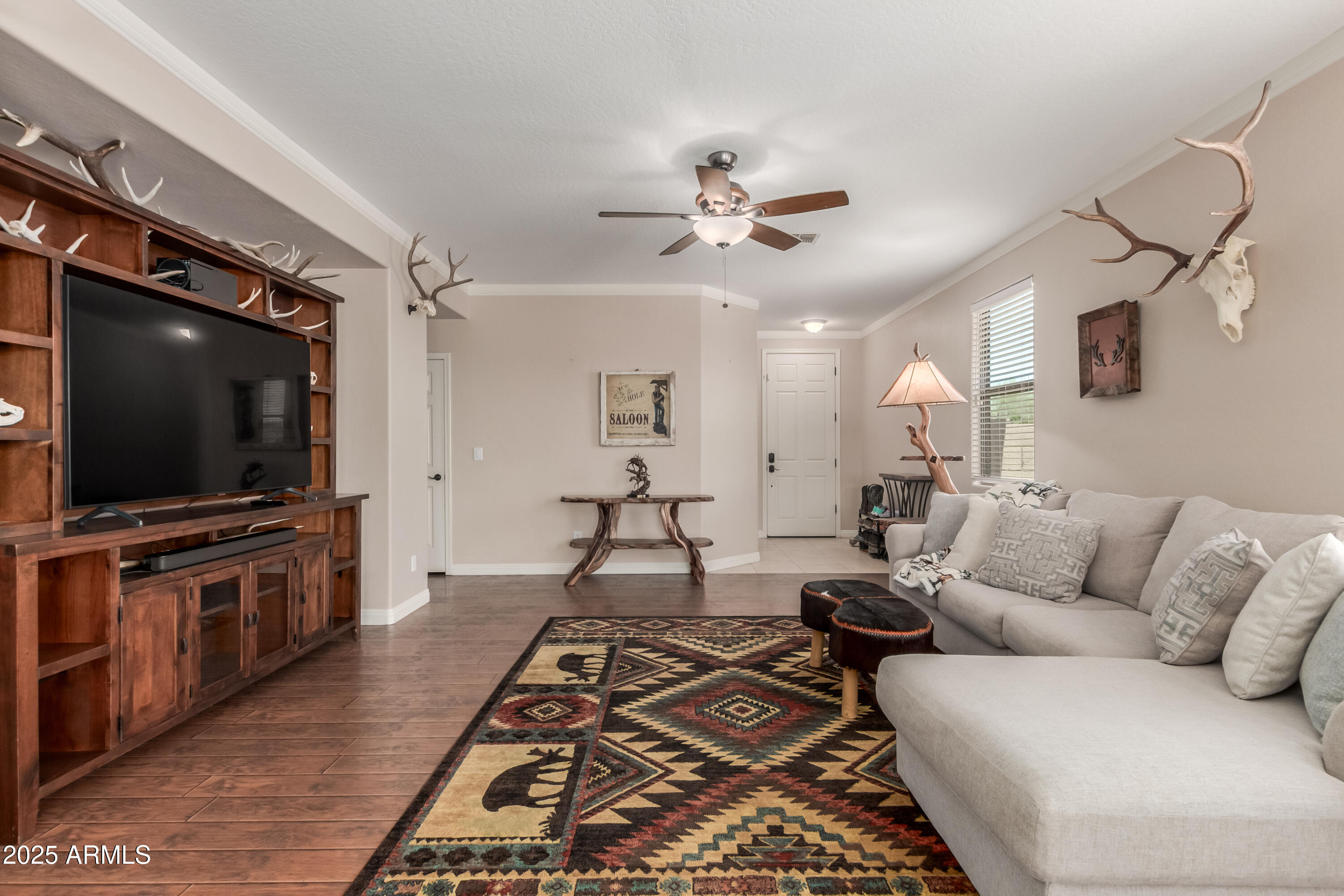 Priced to sell! This stunning 3-bed, 2-bath home in Anthem with 1,431 sq ft and a desirable split floor plan. Step inside to hardwood floors, elegant crown molding, and an updated kitchen with granite countertops, custom backsplash, and stainless-steel appliances. The spacious primary suite boasts dual sinks and a walk-in closet with built-ins. Enjoy a private RV side yard with gate, epoxy flooring garage, and a resort-style backyard with a covered patio, sparkling pool, and spa with waterfall features. New pool pump and automation system. Access to Anthem's top-tier amenities: heated pool, waterpark, fitness center, sports courts, parks, and more. A true must-see!