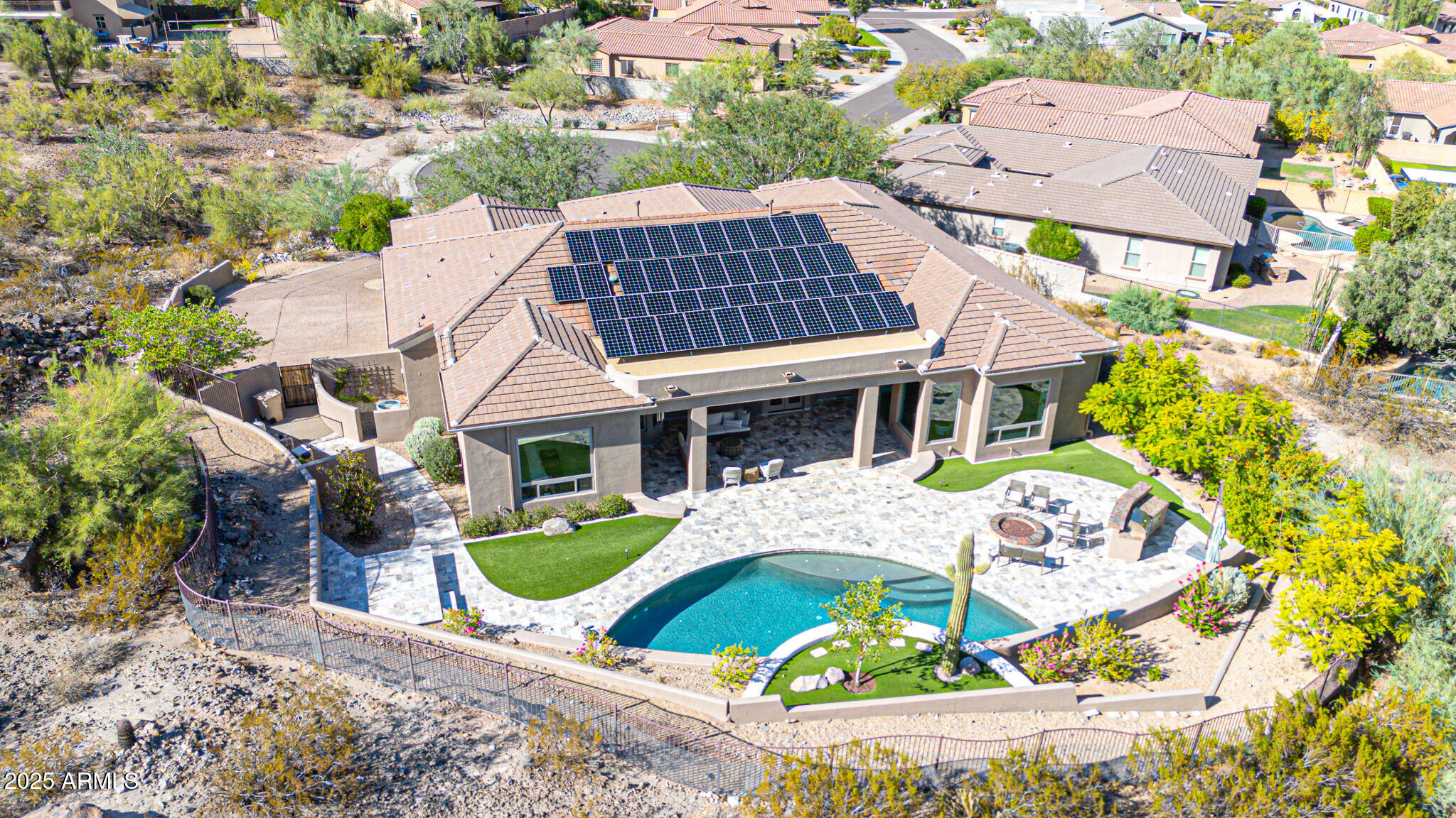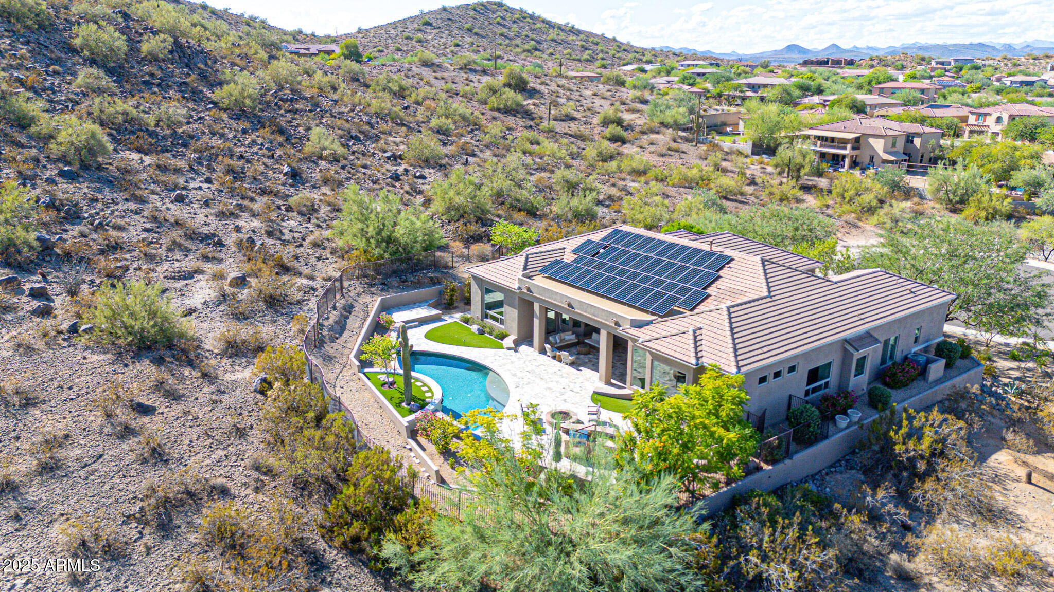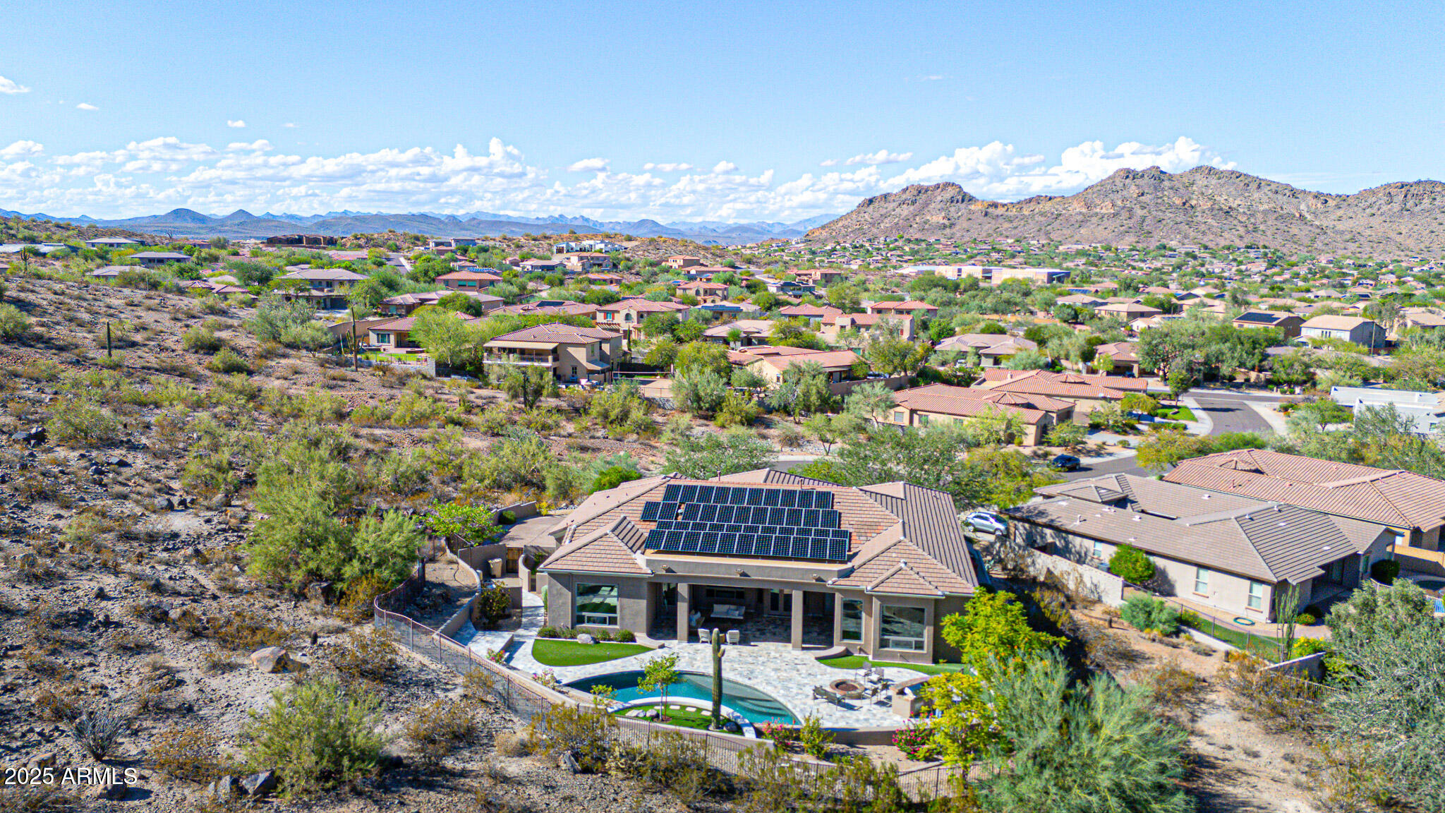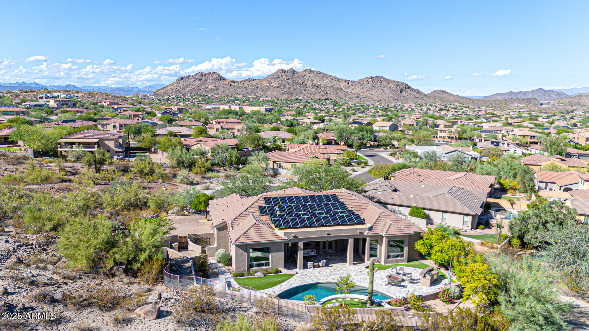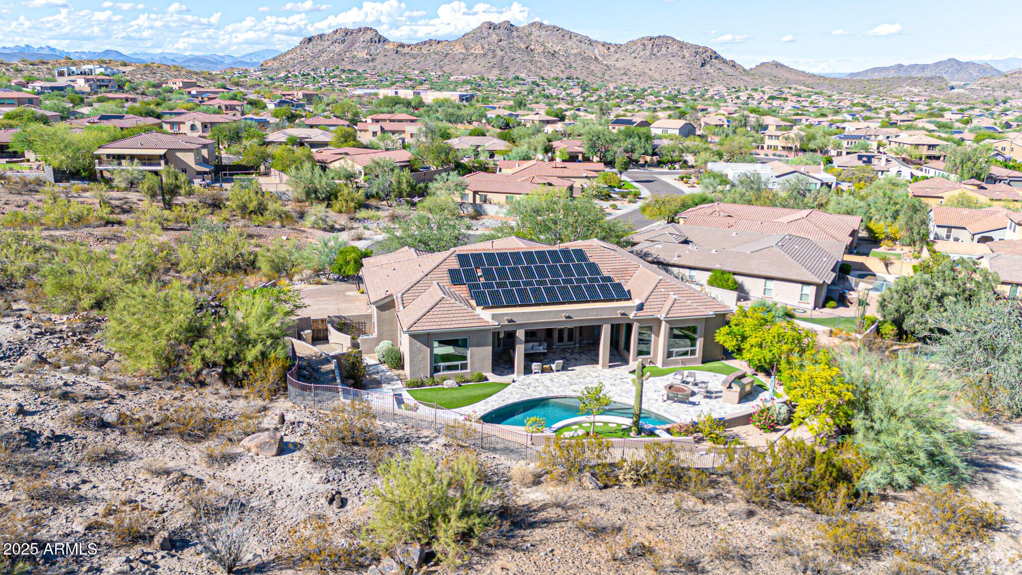 No detail was overlooked in this full-scale remodel. The kitchen has been entirely reimagined with all-new custom cabinetry--crisp white cabinets paired with striking black accent cabinetry for a modern, designer look. Quartz countertops, a marble backsplash, all-new stainless steel appliances, upgraded fixtures, and statement lighting create a true chef's kitchen that seamlessly blends function and style. An oversized island provides the perfect gathering space for family and guests alike. Both bathrooms have undergone a total transformation, featuring brand-new vanities with quartz counters, modern sinks, stylish mirrors, custom lighting, new cabinetry, and stunning marble and tile walk-in showers. Every finish was thoughtfully chosen to reflect a cohesive and luxurious aesthetic. The home also features new flooring throughout, updated lighting in every room, brand-new dual-pane windows, and fresh interior and exterior paint, giving the entire home a bright, clean, and modern feel. Custom remote-controlled shades have been installed throughout the home, allowing for effortless light control and privacy with the touch of a button. The owned solar system keeps energy costs remarkably low, with average utility bills around just $150 per year. The backyard is the true crown jewel of this home, backing directly to the mountain with no neighbors on either sideoffering exceptional privacy and unobstructed desert views. Designed for both relaxation and entertaining, the space includes an architecturally designed pool, expansive travertine paver patio, synthetic grass, built-in BBQ, and custom desert landscaping that blends seamlessly with the natural surroundings. Whether hosting a gathering or enjoying a quiet evening under the stars, this outdoor oasis delivers unmatched ambiance and serenity. This fully modernized home combines thoughtful upgrades, refined finishes, and a premier lot in one of the Valley's most desirable communities. Homes like this are raredon't miss your opportunity to own a truly one-of-a-kind property in Westwing Mountain.