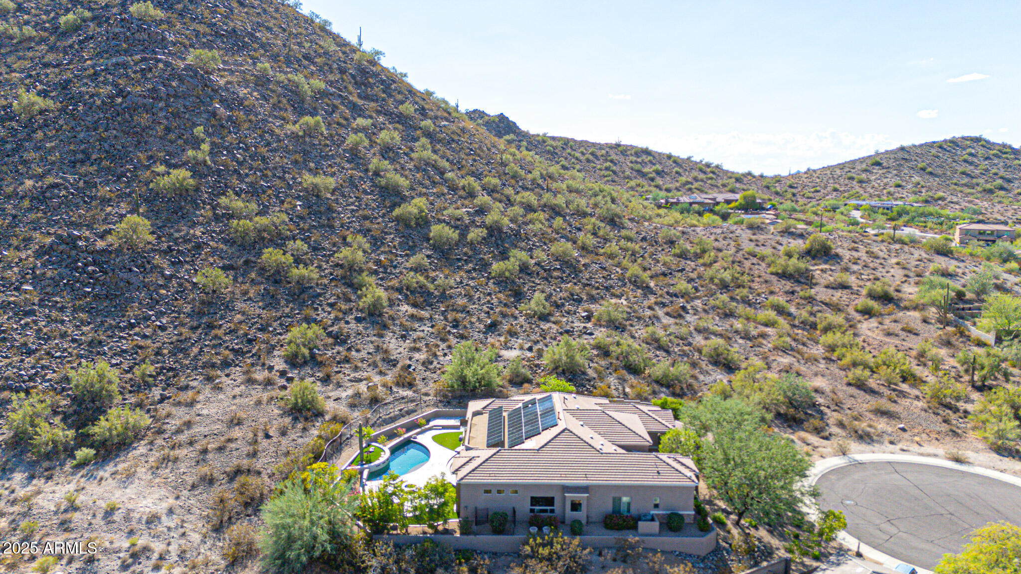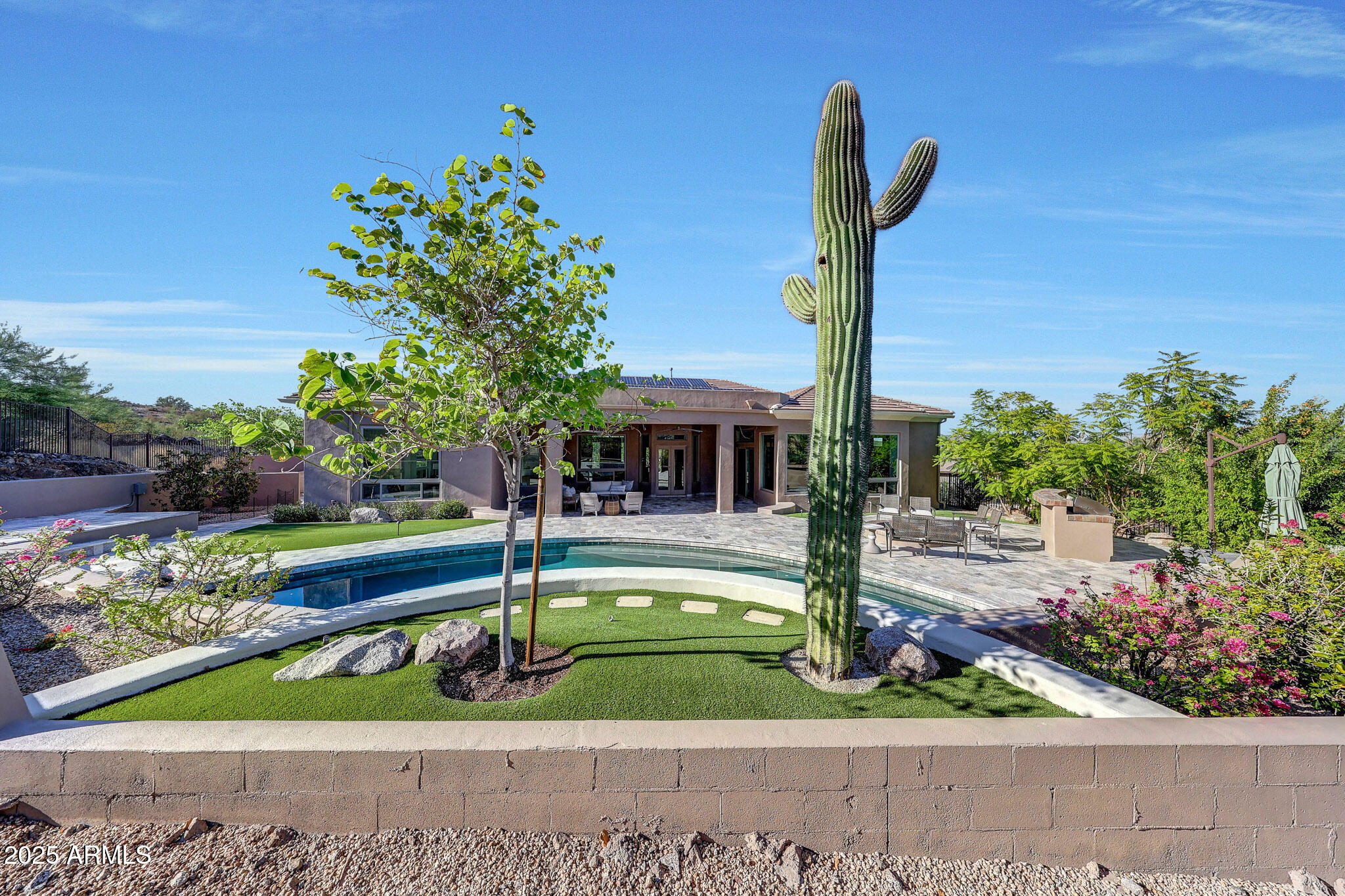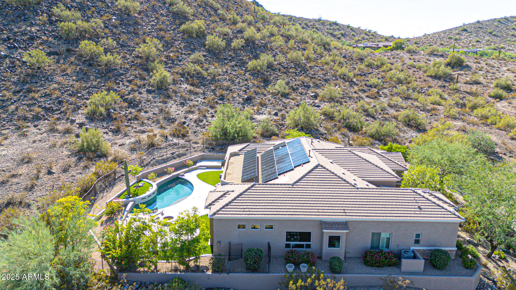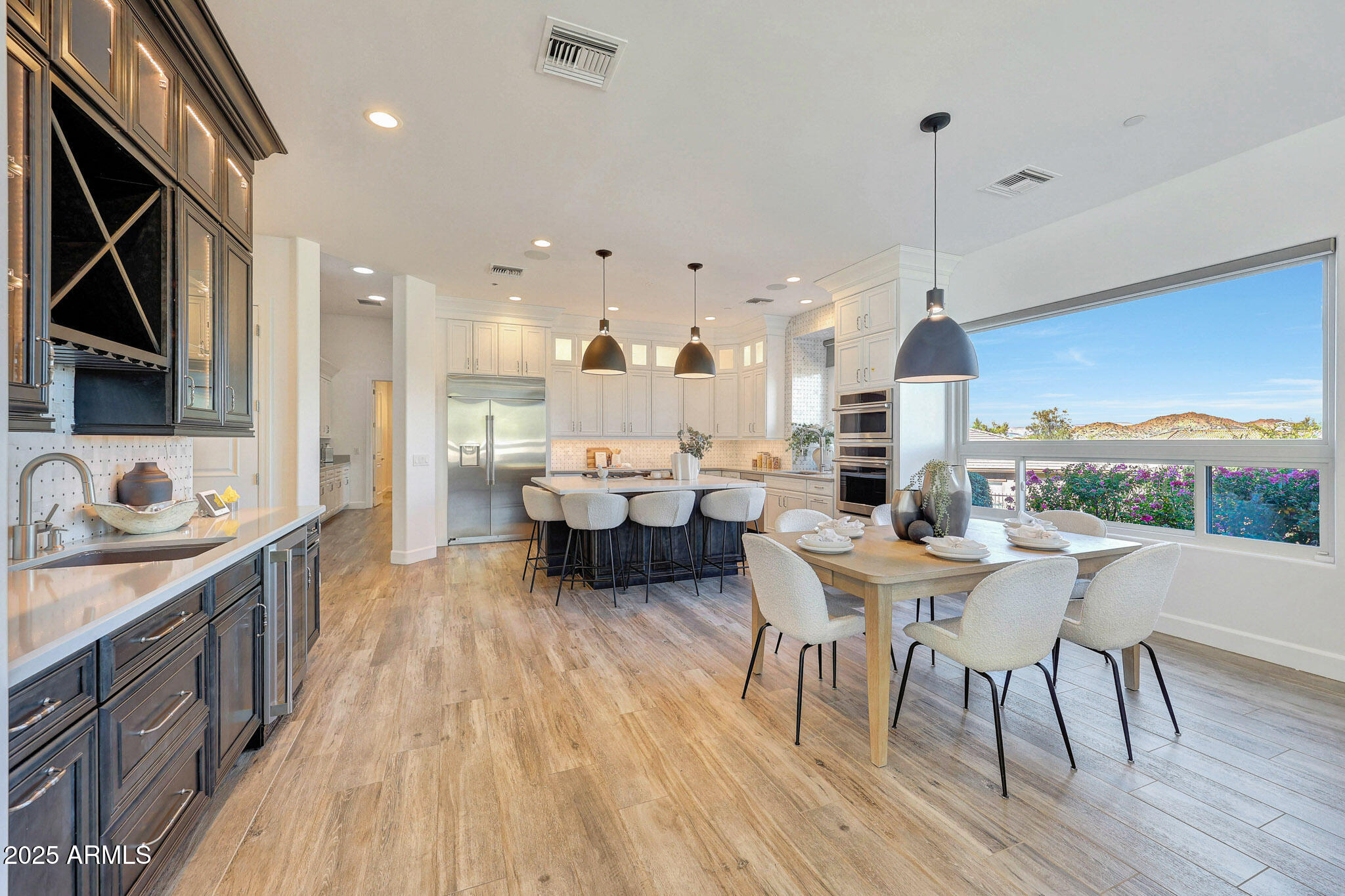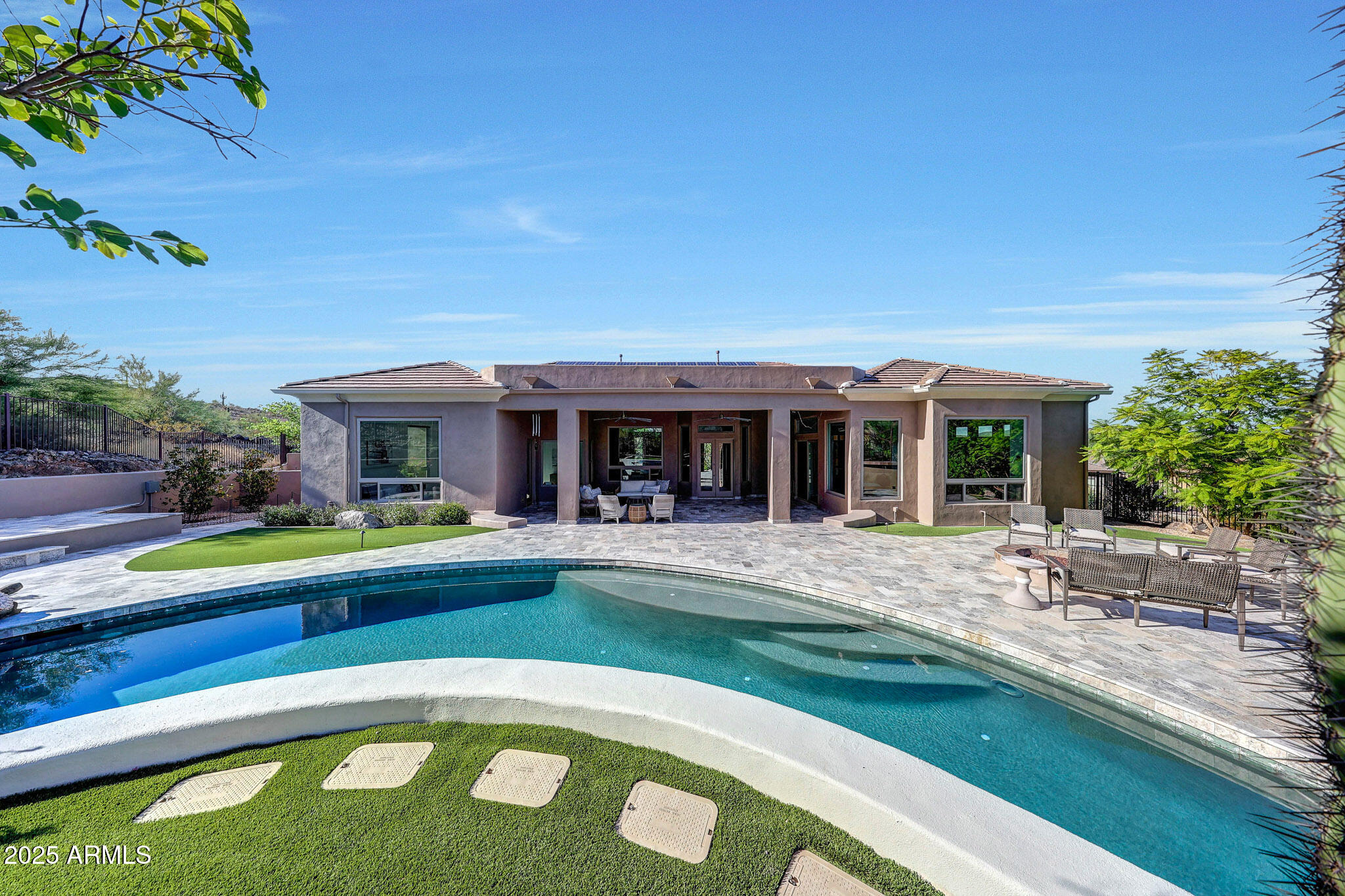 No detail was overlooked in this full-scale remodel. The kitchen has been entirely reimagined with all-new custom cabinetry--crisp white cabinets paired with striking black accent cabinetry for a modern, designer look. Quartz countertops, a marble backsplash, all-new stainless steel appliances, upgraded fixtures, and statement lighting create a true chef's kitchen that seamlessly blends function and style. An oversized island provides the perfect gathering space for family and guests alike. Both bathrooms have undergone a total transformation, featuring brand-new vanities with quartz counters, modern sinks, stylish mirrors, custom lighting, new cabinetry, and stunning marble and tile walk-in showers. Every finish was thoughtfully chosen to reflect a cohesive and luxurious aesthetic. The home also features new flooring throughout, updated lighting in every room, brand-new dual-pane windows, and fresh interior and exterior paint, giving the entire home a bright, clean, and modern feel. Custom remote-controlled shades have been installed throughout the home, allowing for effortless light control and privacy with the touch of a button. The owned solar system keeps energy costs remarkably low, with average utility bills around just $150 per year. The backyard is the true crown jewel of this home, backing directly to the mountain with no neighbors on either sideoffering exceptional privacy and unobstructed desert views. Designed for both relaxation and entertaining, the space includes an architecturally designed pool, expansive travertine paver patio, synthetic grass, built-in BBQ, and custom desert landscaping that blends seamlessly with the natural surroundings. Whether hosting a gathering or enjoying a quiet evening under the stars, this outdoor oasis delivers unmatched ambiance and serenity. This fully modernized home combines thoughtful upgrades, refined finishes, and a premier lot in one of the Valley's most desirable communities. Homes like this are raredon't miss your opportunity to own a truly one-of-a-kind property in Westwing Mountain.