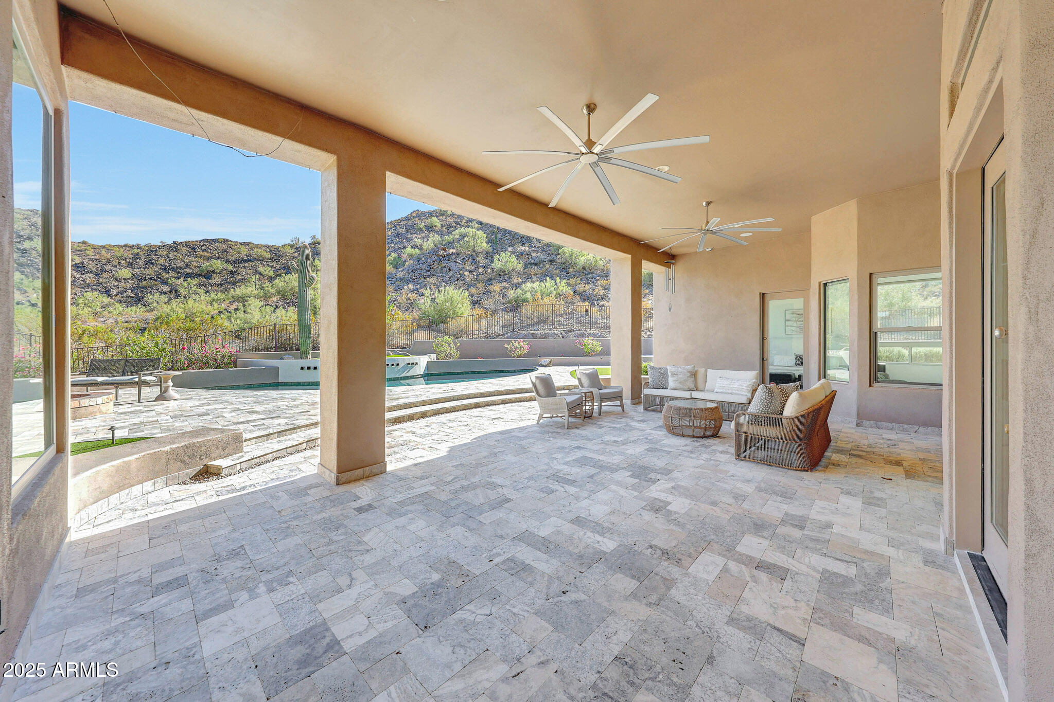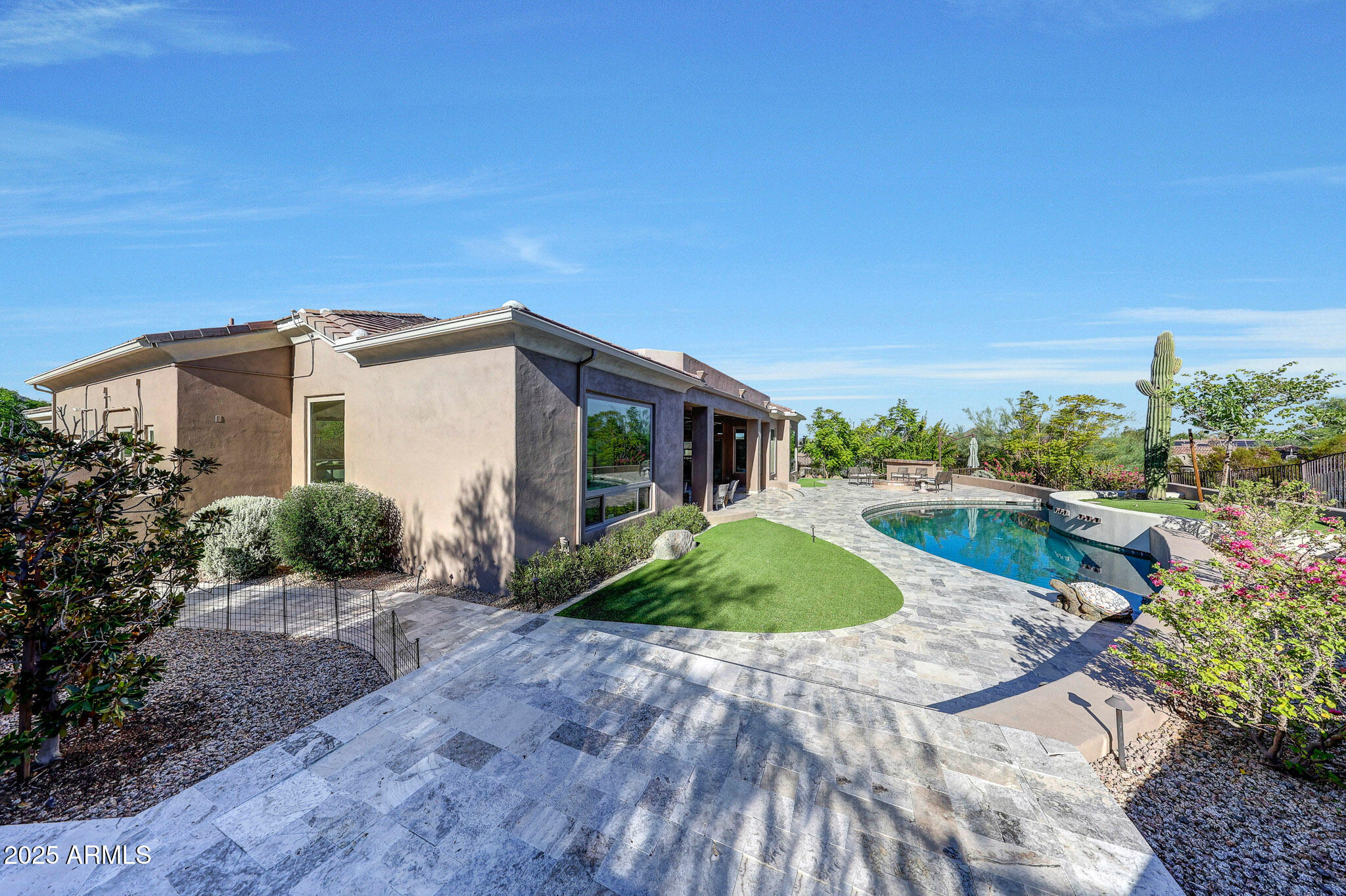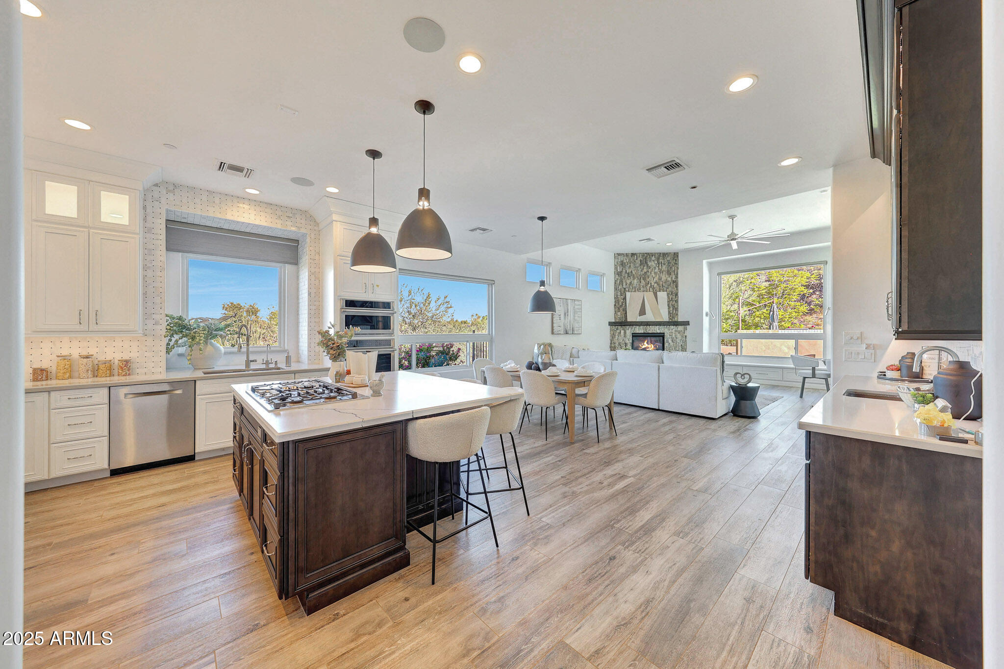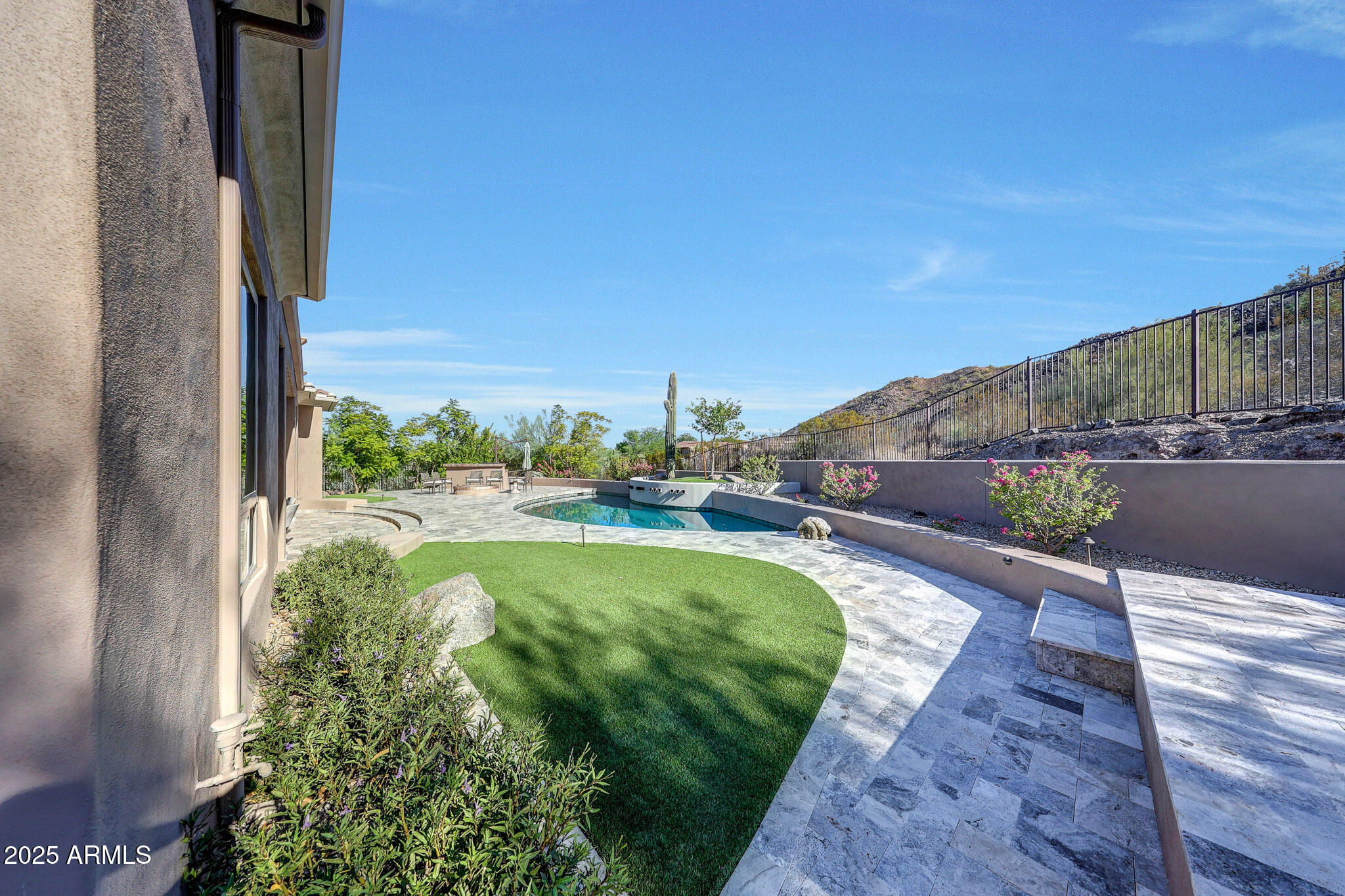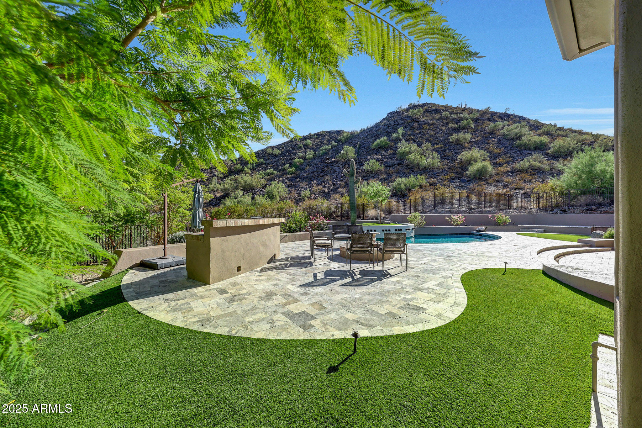 No detail was overlooked in this full-scale remodel. The kitchen has been entirely reimagined with all-new custom cabinetry--crisp white cabinets paired with striking black accent cabinetry for a modern, designer look. Quartz countertops, a marble backsplash, all-new stainless steel appliances, upgraded fixtures, and statement lighting create a true chef's kitchen that seamlessly blends function and style. An oversized island provides the perfect gathering space for family and guests alike. Both bathrooms have undergone a total transformation, featuring brand-new vanities with quartz counters, modern sinks, stylish mirrors, custom lighting, new cabinetry, and stunning marble and tile walk-in showers. Every finish was thoughtfully chosen to reflect a cohesive and luxurious aesthetic. The home also features new flooring throughout, updated lighting in every room, brand-new dual-pane windows, and fresh interior and exterior paint, giving the entire home a bright, clean, and modern feel. Custom remote-controlled shades have been installed throughout the home, allowing for effortless light control and privacy with the touch of a button. The owned solar system keeps energy costs remarkably low, with average utility bills around just $150 per year. The backyard is the true crown jewel of this home, backing directly to the mountain with no neighbors on either sideoffering exceptional privacy and unobstructed desert views. Designed for both relaxation and entertaining, the space includes an architecturally designed pool, expansive travertine paver patio, synthetic grass, built-in BBQ, and custom desert landscaping that blends seamlessly with the natural surroundings. Whether hosting a gathering or enjoying a quiet evening under the stars, this outdoor oasis delivers unmatched ambiance and serenity. This fully modernized home combines thoughtful upgrades, refined finishes, and a premier lot in one of the Valley's most desirable communities. Homes like this are raredon't miss your opportunity to own a truly one-of-a-kind property in Westwing Mountain.