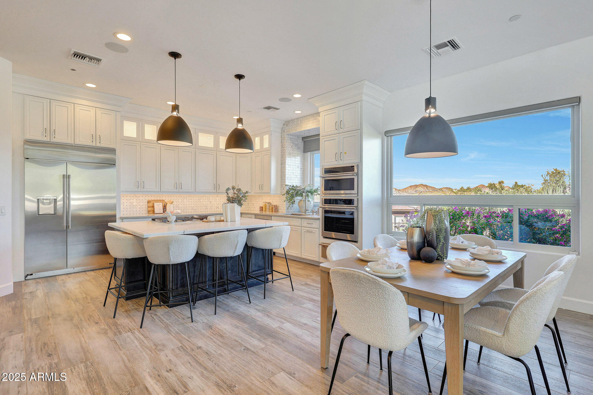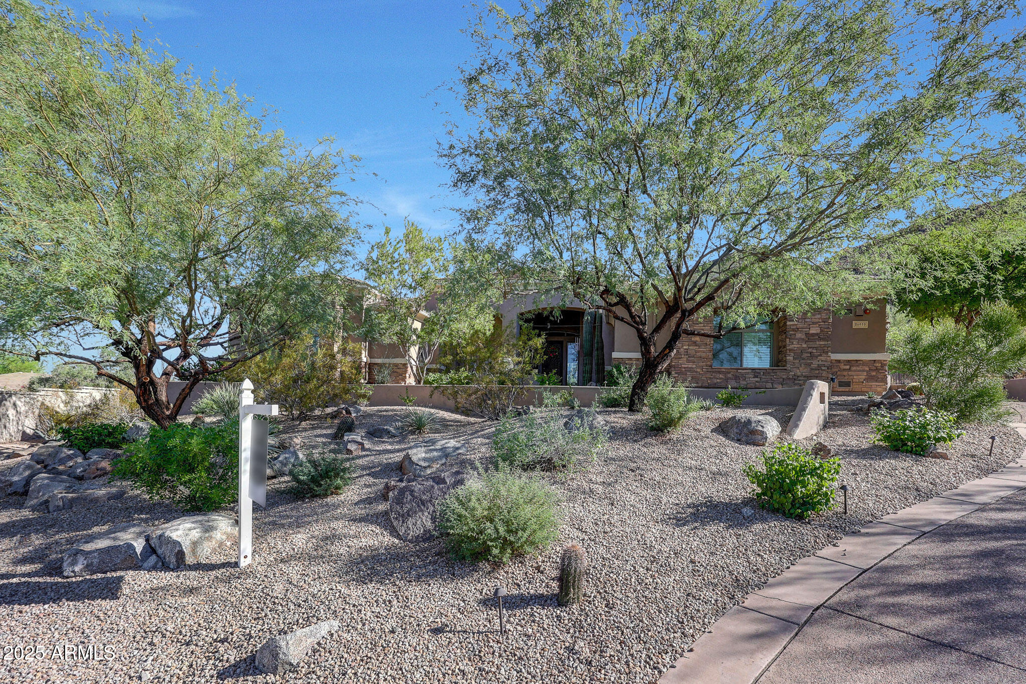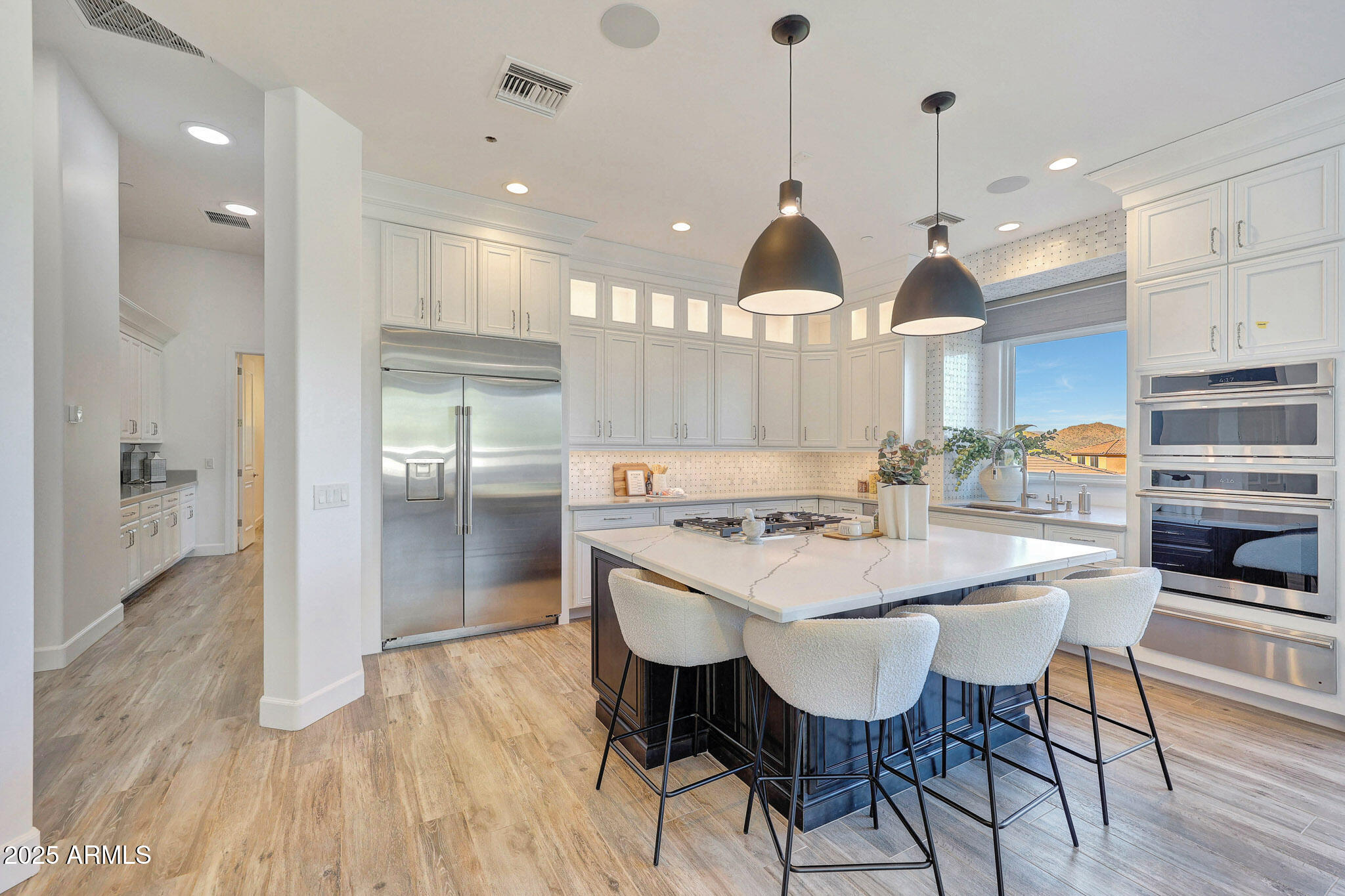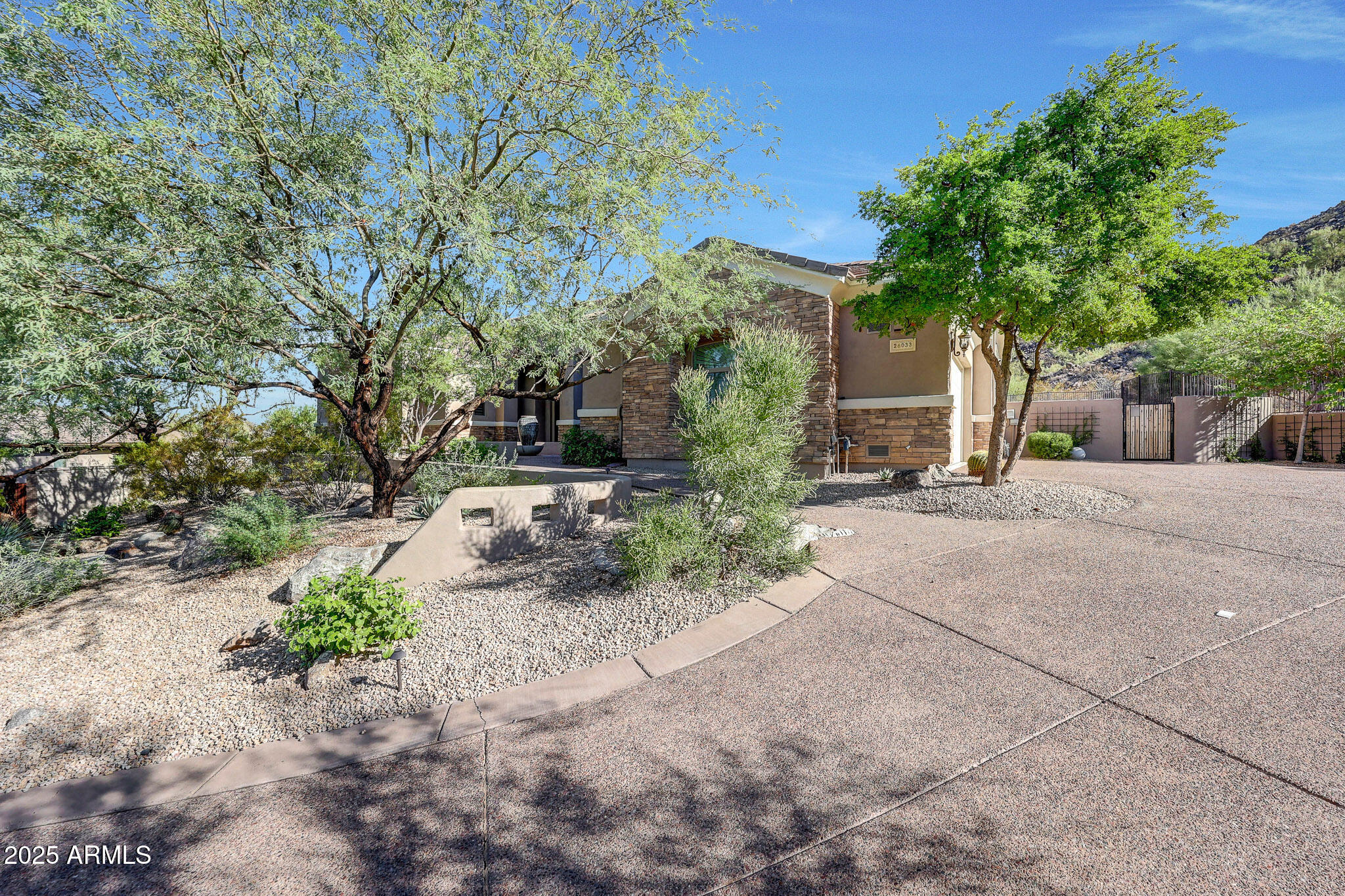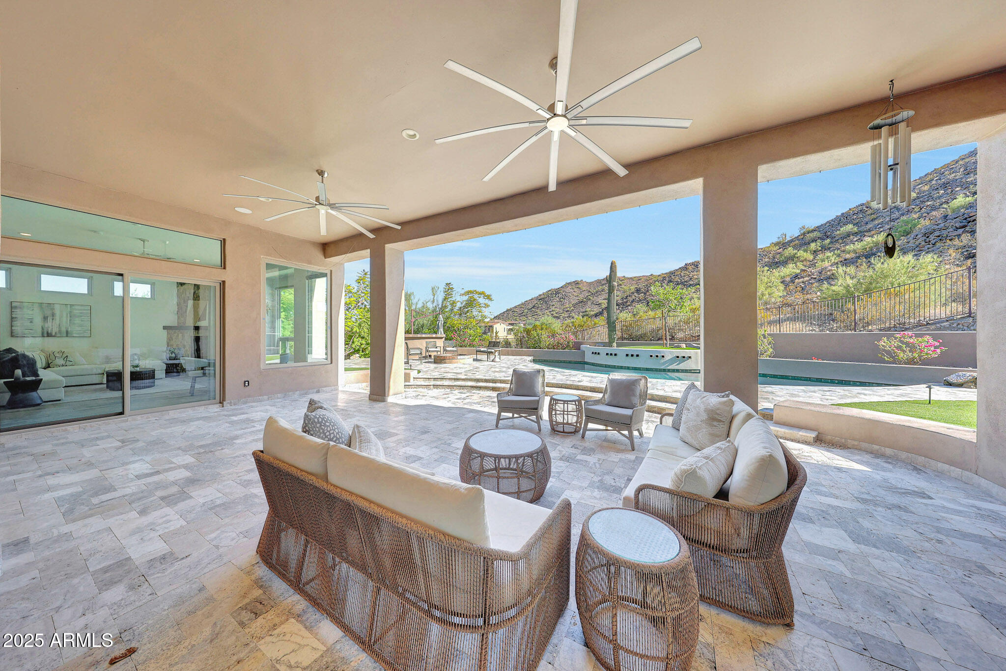 No detail was overlooked in this full-scale remodel. The kitchen has been entirely reimagined with all-new custom cabinetry--crisp white cabinets paired with striking black accent cabinetry for a modern, designer look. Quartz countertops, a marble backsplash, all-new stainless steel appliances, upgraded fixtures, and statement lighting create a true chef's kitchen that seamlessly blends function and style. An oversized island provides the perfect gathering space for family and guests alike. Both bathrooms have undergone a total transformation, featuring brand-new vanities with quartz counters, modern sinks, stylish mirrors, custom lighting, new cabinetry, and stunning marble and tile walk-in showers. Every finish was thoughtfully chosen to reflect a cohesive and luxurious aesthetic. The home also features new flooring throughout, updated lighting in every room, brand-new dual-pane windows, and fresh interior and exterior paint, giving the entire home a bright, clean, and modern feel. Custom remote-controlled shades have been installed throughout the home, allowing for effortless light control and privacy with the touch of a button. The owned solar system keeps energy costs remarkably low, with average utility bills around just $150 per year. The backyard is the true crown jewel of this home, backing directly to the mountain with no neighbors on either sideoffering exceptional privacy and unobstructed desert views. Designed for both relaxation and entertaining, the space includes an architecturally designed pool, expansive travertine paver patio, synthetic grass, built-in BBQ, and custom desert landscaping that blends seamlessly with the natural surroundings. Whether hosting a gathering or enjoying a quiet evening under the stars, this outdoor oasis delivers unmatched ambiance and serenity. This fully modernized home combines thoughtful upgrades, refined finishes, and a premier lot in one of the Valley's most desirable communities. Homes like this are raredon't miss your opportunity to own a truly one-of-a-kind property in Westwing Mountain.