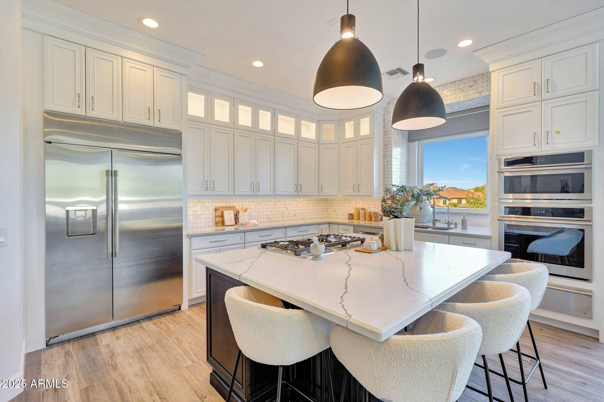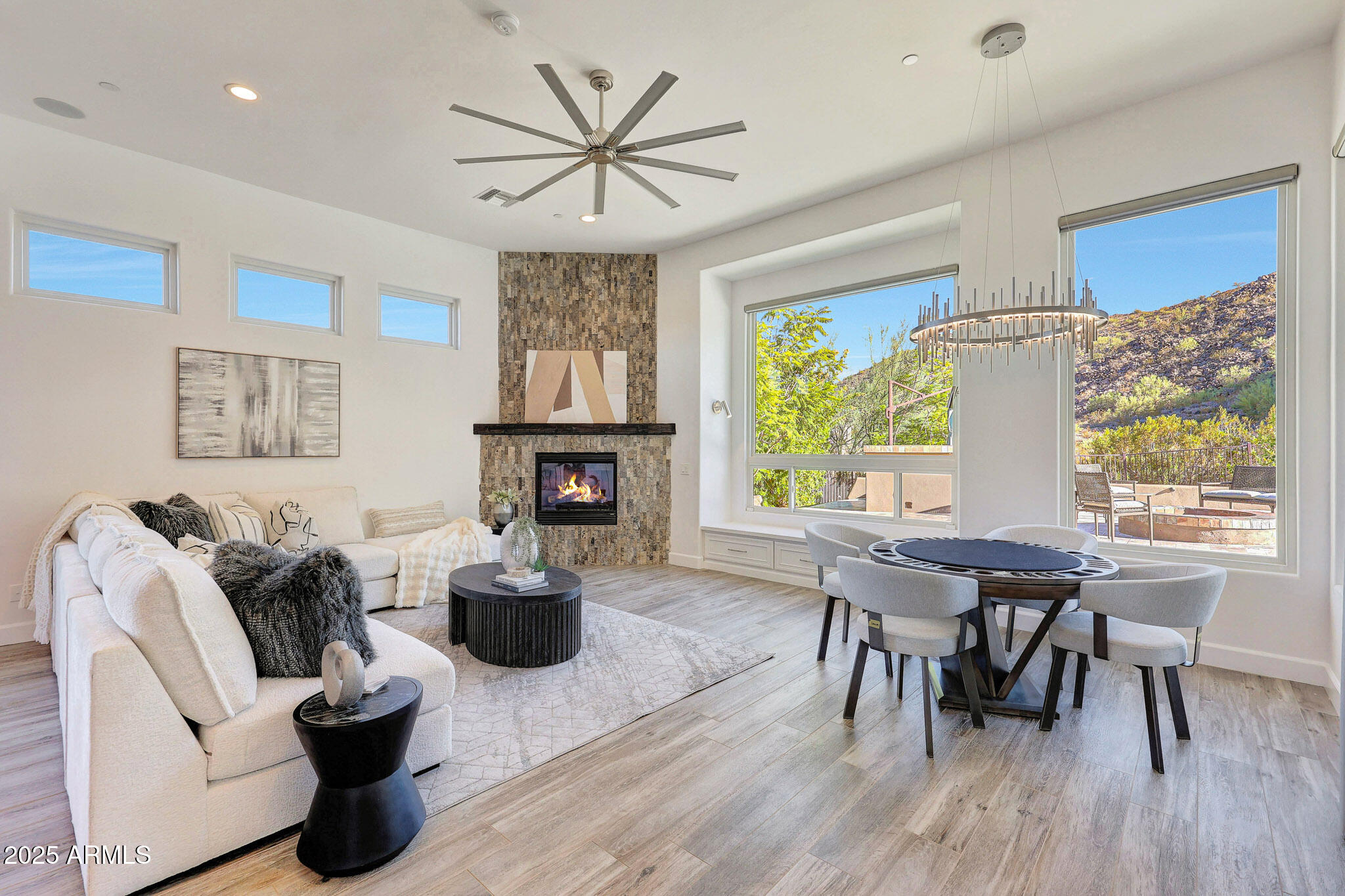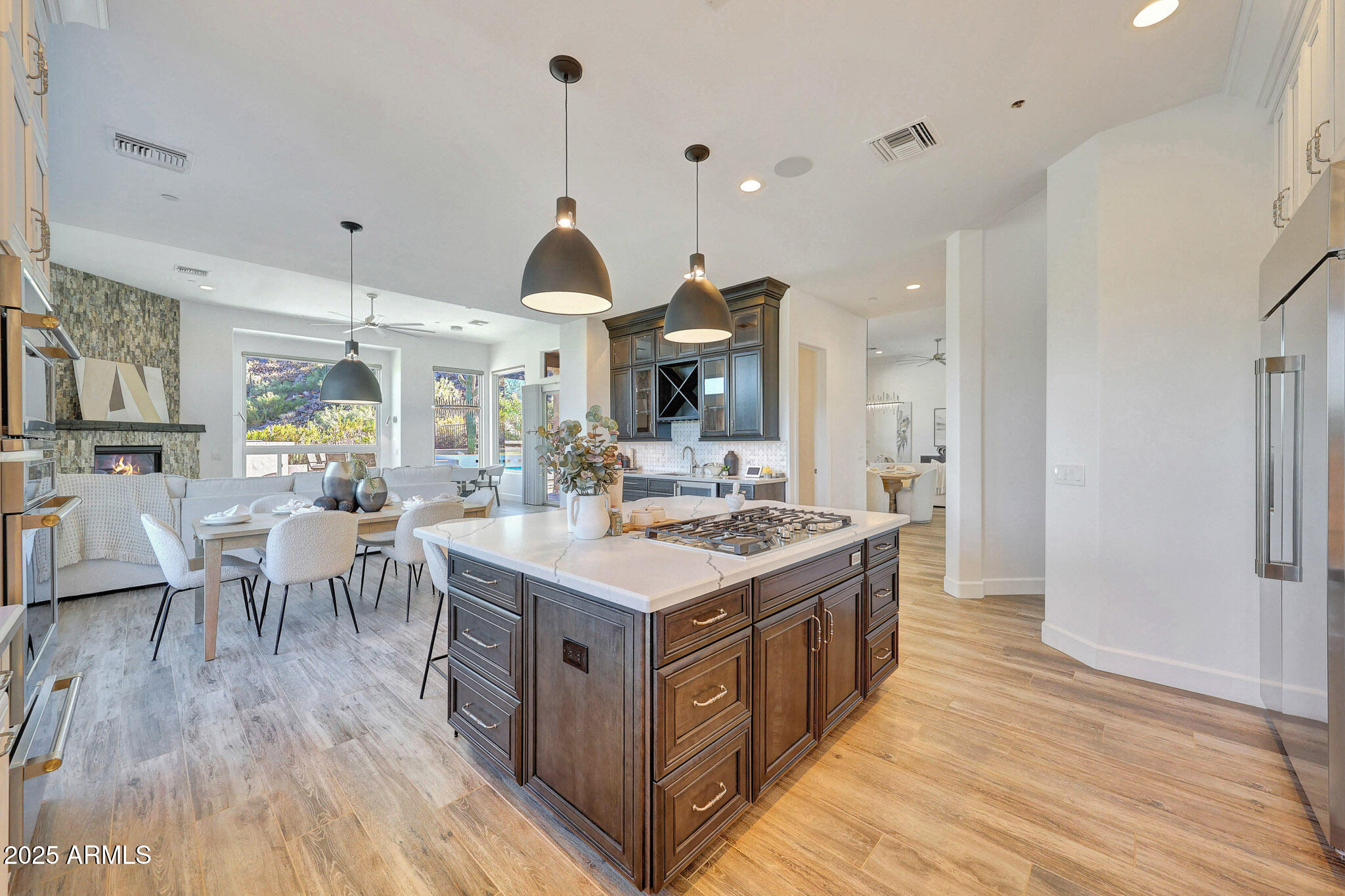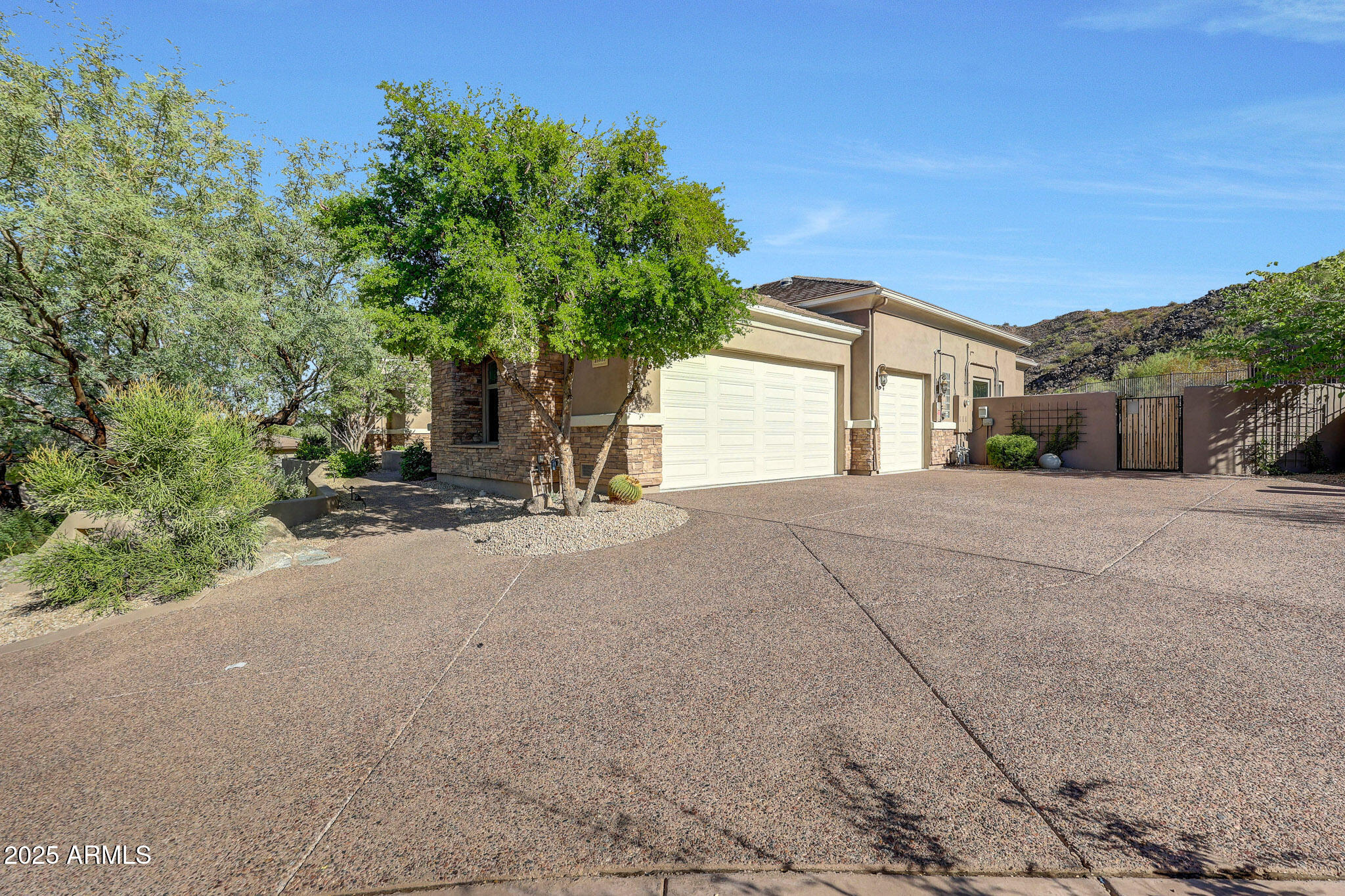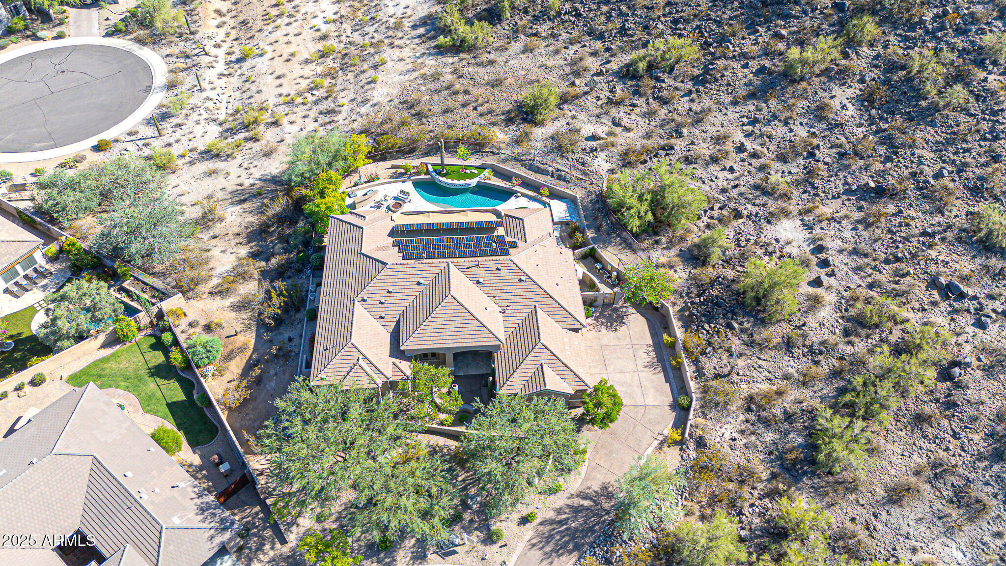 No detail was overlooked in this full-scale remodel. The kitchen has been entirely reimagined with all-new custom cabinetry--crisp white cabinets paired with striking black accent cabinetry for a modern, designer look. Quartz countertops, a marble backsplash, all-new stainless steel appliances, upgraded fixtures, and statement lighting create a true chef's kitchen that seamlessly blends function and style. An oversized island provides the perfect gathering space for family and guests alike. Both bathrooms have undergone a total transformation, featuring brand-new vanities with quartz counters, modern sinks, stylish mirrors, custom lighting, new cabinetry, and stunning marble and tile walk-in showers. Every finish was thoughtfully chosen to reflect a cohesive and luxurious aesthetic. The home also features new flooring throughout, updated lighting in every room, brand-new dual-pane windows, and fresh interior and exterior paint, giving the entire home a bright, clean, and modern feel. Custom remote-controlled shades have been installed throughout the home, allowing for effortless light control and privacy with the touch of a button. The owned solar system keeps energy costs remarkably low, with average utility bills around just $150 per year. The backyard is the true crown jewel of this home, backing directly to the mountain with no neighbors on either sideoffering exceptional privacy and unobstructed desert views. Designed for both relaxation and entertaining, the space includes an architecturally designed pool, expansive travertine paver patio, synthetic grass, built-in BBQ, and custom desert landscaping that blends seamlessly with the natural surroundings. Whether hosting a gathering or enjoying a quiet evening under the stars, this outdoor oasis delivers unmatched ambiance and serenity. This fully modernized home combines thoughtful upgrades, refined finishes, and a premier lot in one of the Valley's most desirable communities. Homes like this are raredon't miss your opportunity to own a truly one-of-a-kind property in Westwing Mountain.