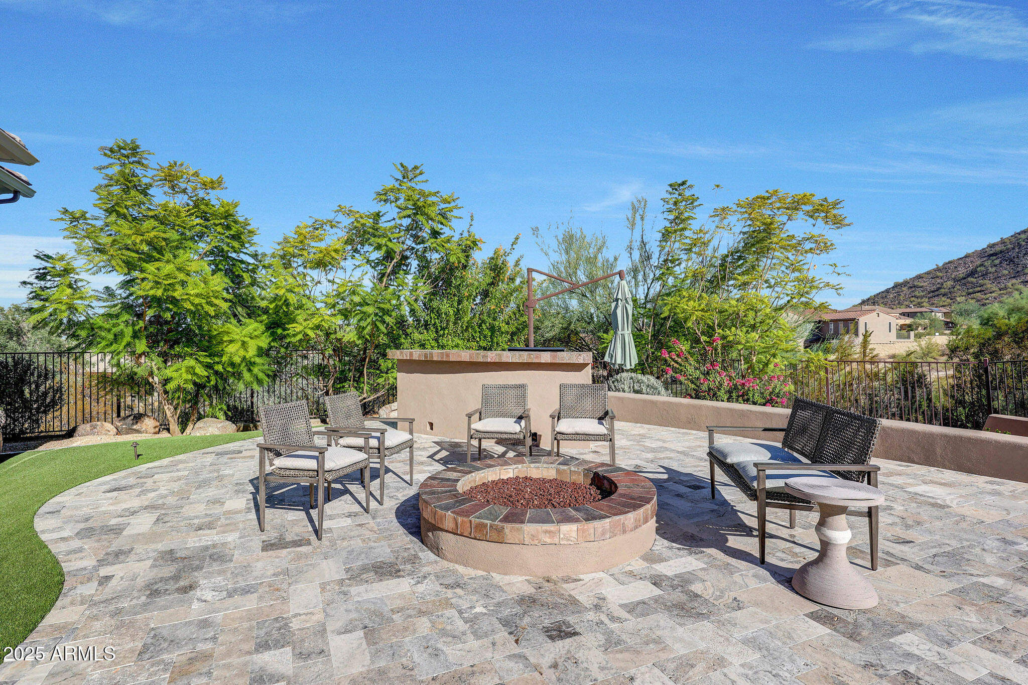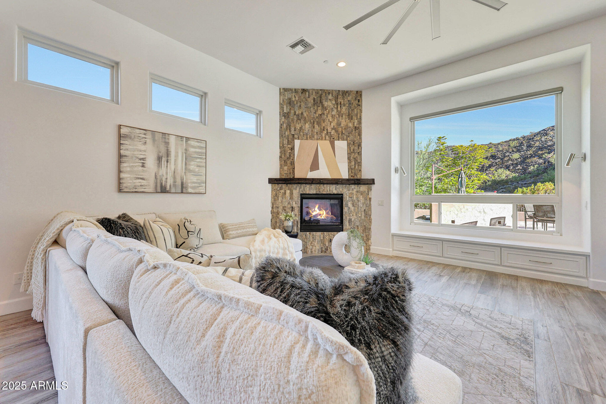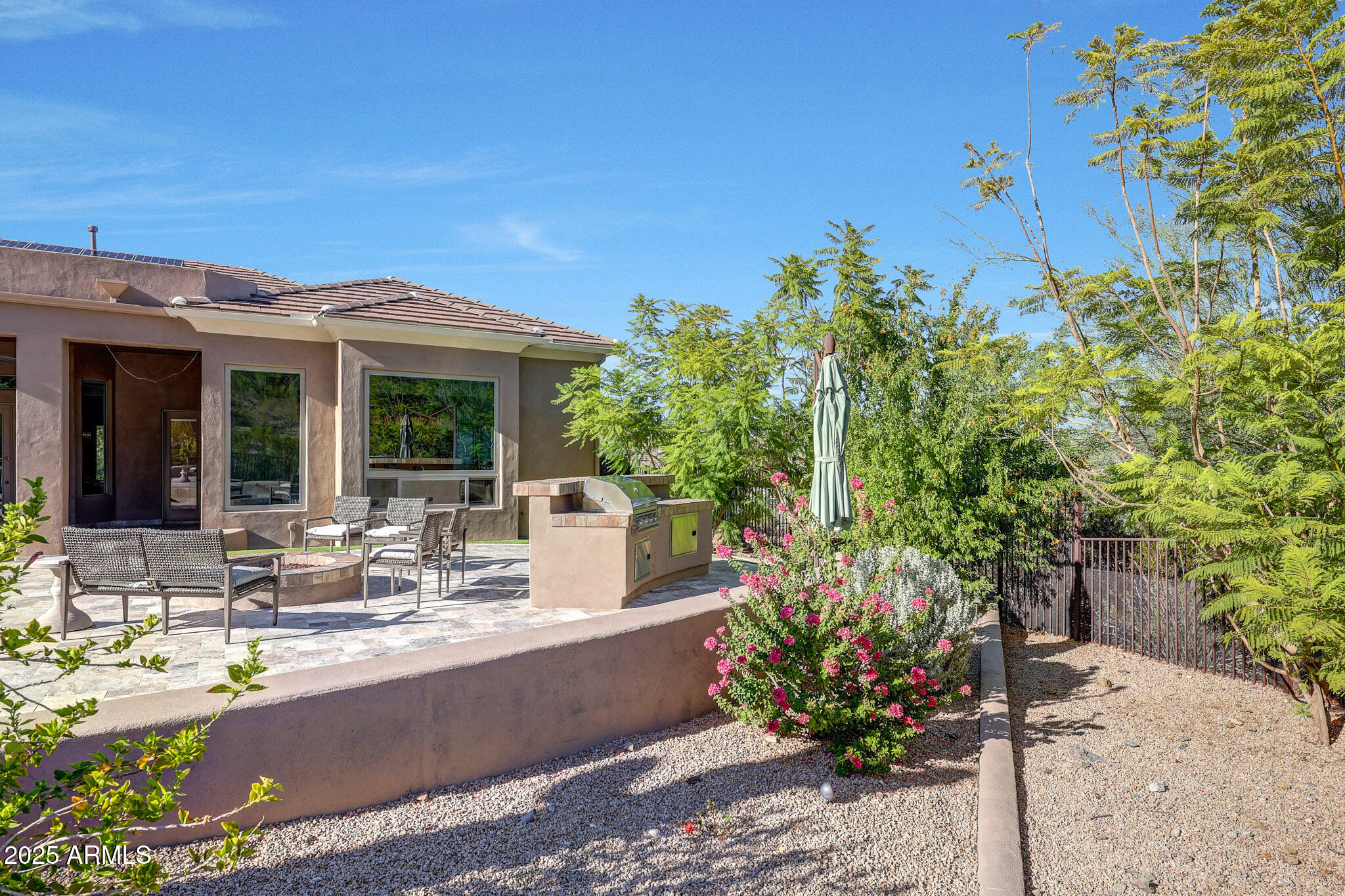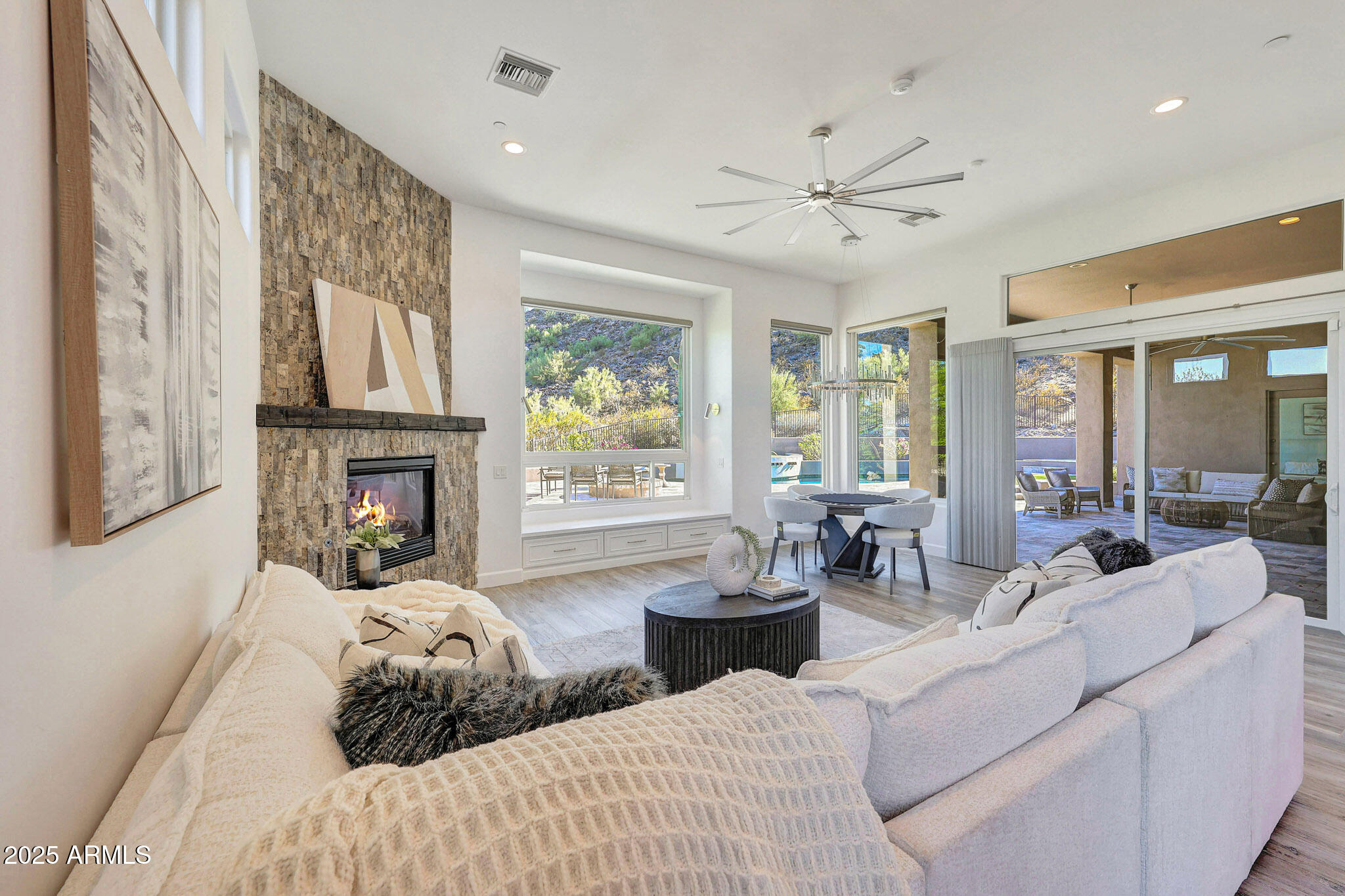 No detail was overlooked in this full-scale remodel. The kitchen has been entirely reimagined with all-new custom cabinetry--crisp white cabinets paired with striking black accent cabinetry for a modern, designer look. Quartz countertops, a marble backsplash, all-new stainless steel appliances, upgraded fixtures, and statement lighting create a true chef's kitchen that seamlessly blends function and style. An oversized island provides the perfect gathering space for family and guests alike. Both bathrooms have undergone a total transformation, featuring brand-new vanities with quartz counters, modern sinks, stylish mirrors, custom lighting, new cabinetry, and stunning marble and tile walk-in showers. Every finish was thoughtfully chosen to reflect a cohesive and luxurious aesthetic. The home also features new flooring throughout, updated lighting in every room, brand-new dual-pane windows, and fresh interior and exterior paint, giving the entire home a bright, clean, and modern feel. Custom remote-controlled shades have been installed throughout the home, allowing for effortless light control and privacy with the touch of a button. The owned solar system keeps energy costs remarkably low, with average utility bills around just $150 per year. The backyard is the true crown jewel of this home, backing directly to the mountain with no neighbors on either sideoffering exceptional privacy and unobstructed desert views. Designed for both relaxation and entertaining, the space includes an architecturally designed pool, expansive travertine paver patio, synthetic grass, built-in BBQ, and custom desert landscaping that blends seamlessly with the natural surroundings. Whether hosting a gathering or enjoying a quiet evening under the stars, this outdoor oasis delivers unmatched ambiance and serenity. This fully modernized home combines thoughtful upgrades, refined finishes, and a premier lot in one of the Valley's most desirable communities. Homes like this are raredon't miss your opportunity to own a truly one-of-a-kind property in Westwing Mountain.