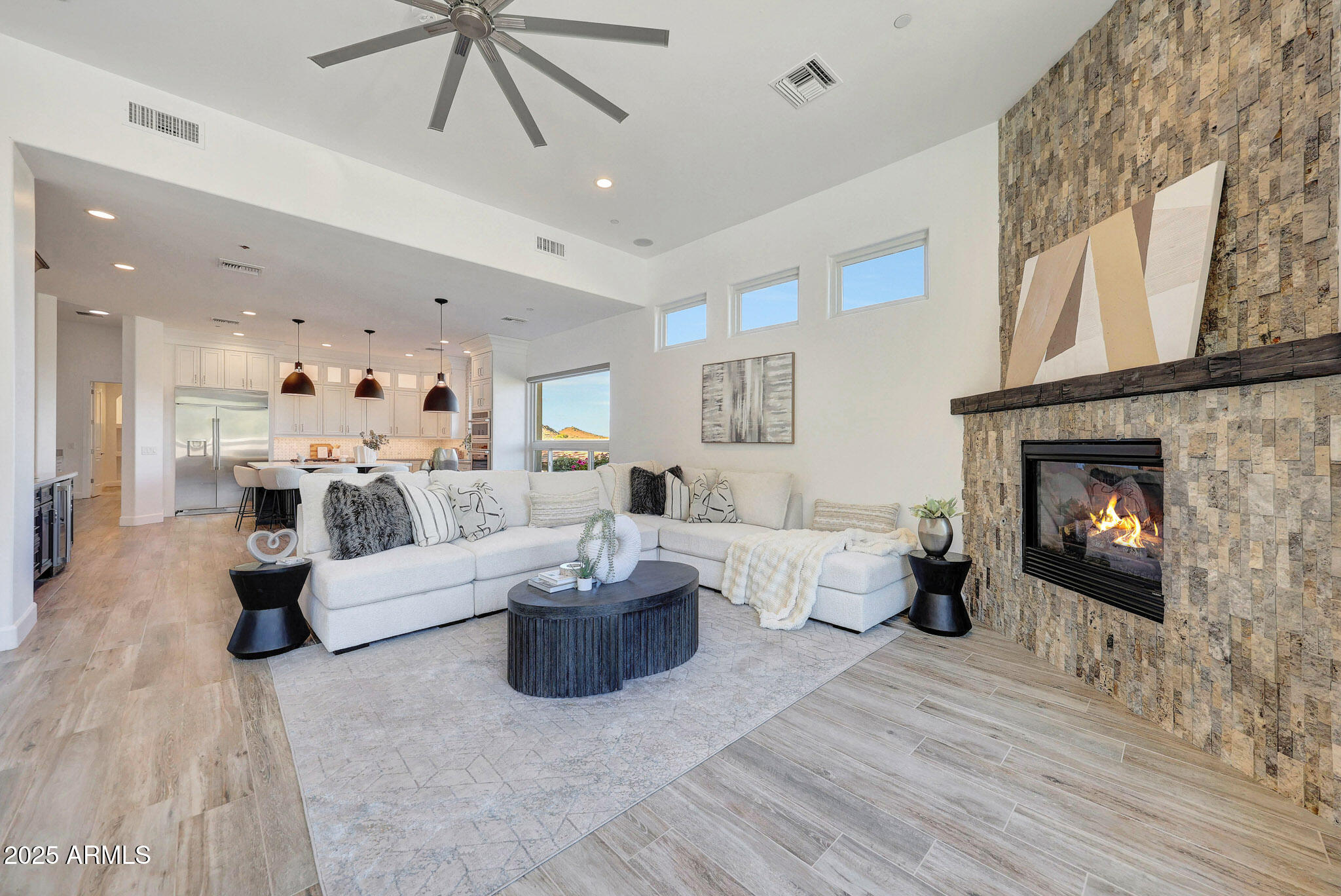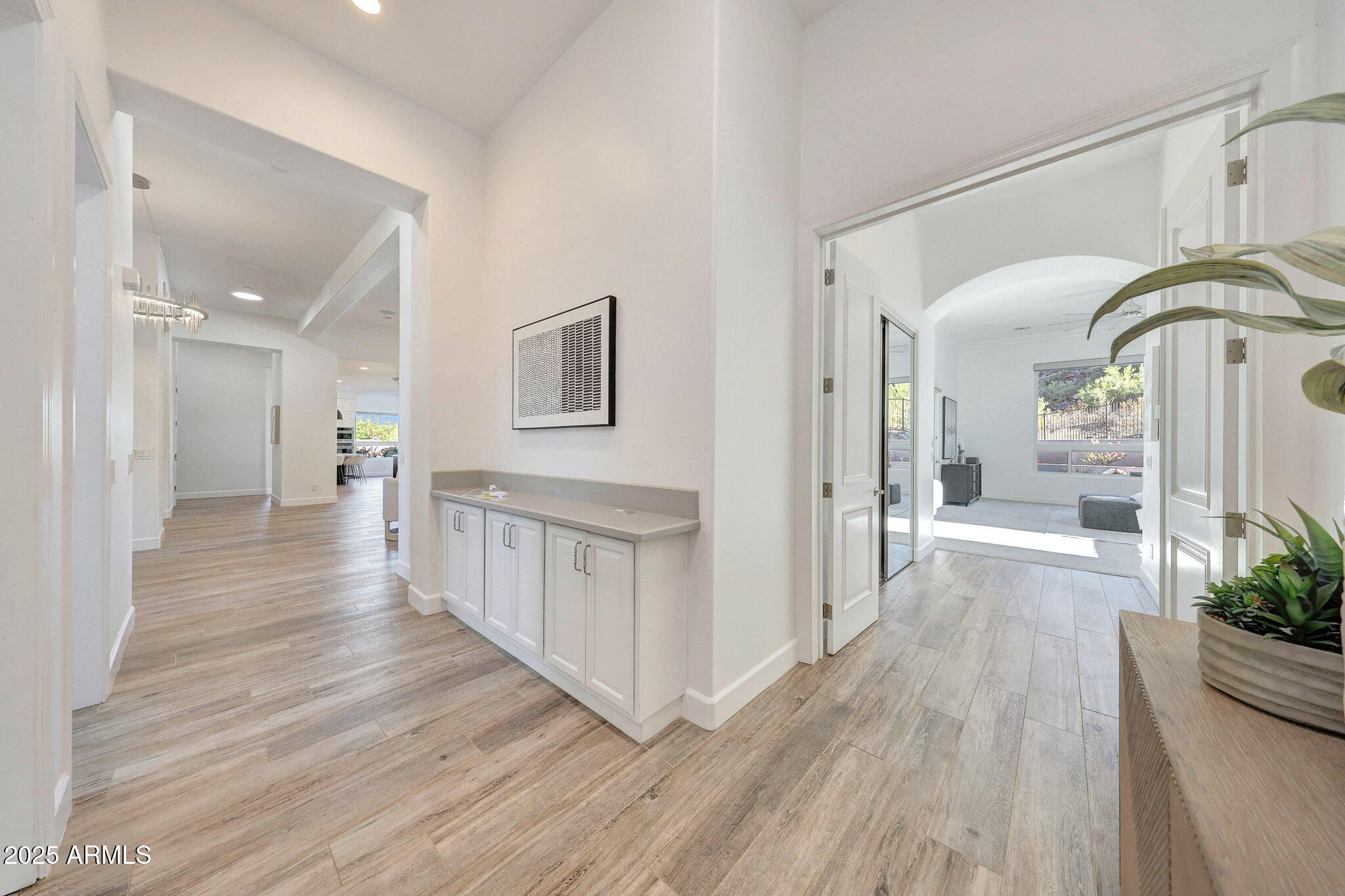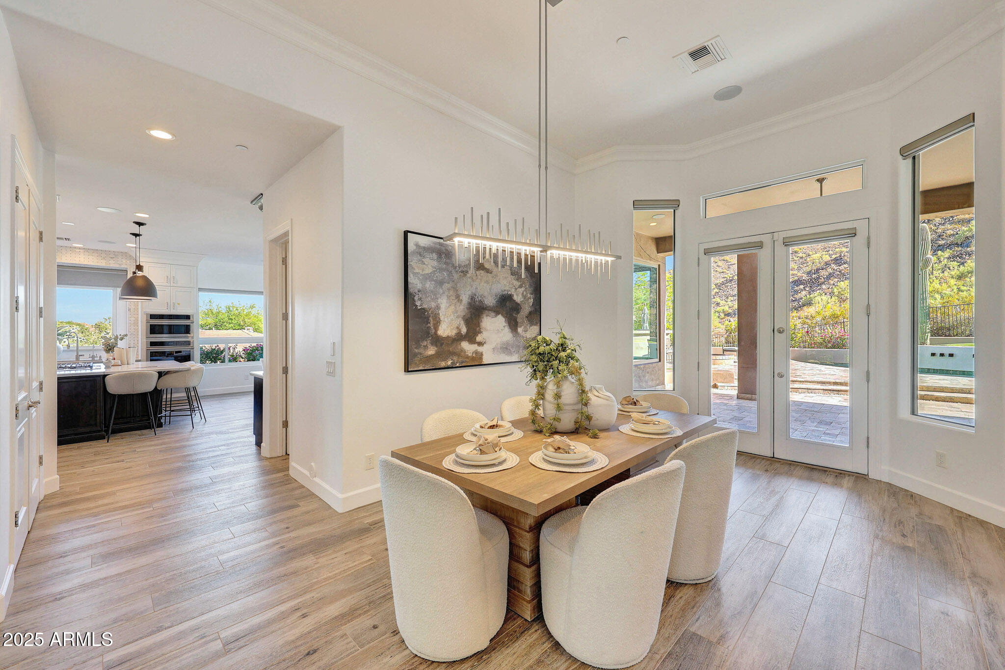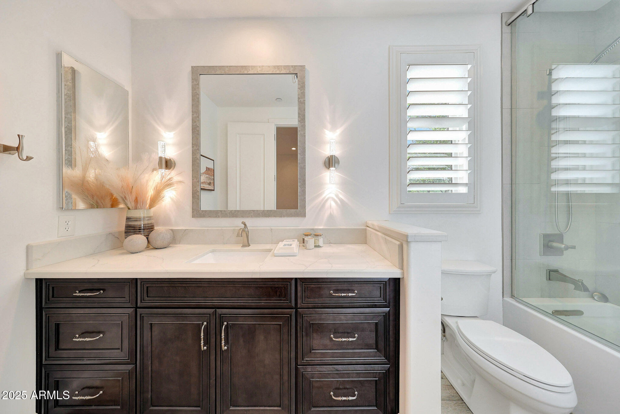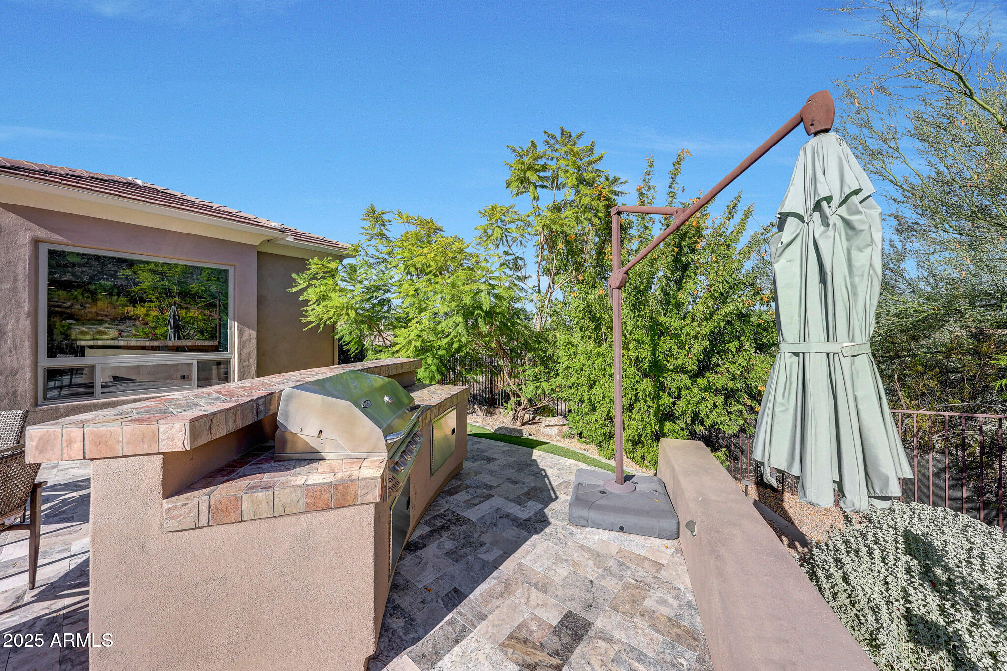 No detail was overlooked in this full-scale remodel. The kitchen has been entirely reimagined with all-new custom cabinetry--crisp white cabinets paired with striking black accent cabinetry for a modern, designer look. Quartz countertops, a marble backsplash, all-new stainless steel appliances, upgraded fixtures, and statement lighting create a true chef's kitchen that seamlessly blends function and style. An oversized island provides the perfect gathering space for family and guests alike. Both bathrooms have undergone a total transformation, featuring brand-new vanities with quartz counters, modern sinks, stylish mirrors, custom lighting, new cabinetry, and stunning marble and tile walk-in showers. Every finish was thoughtfully chosen to reflect a cohesive and luxurious aesthetic. The home also features new flooring throughout, updated lighting in every room, brand-new dual-pane windows, and fresh interior and exterior paint, giving the entire home a bright, clean, and modern feel. Custom remote-controlled shades have been installed throughout the home, allowing for effortless light control and privacy with the touch of a button. The owned solar system keeps energy costs remarkably low, with average utility bills around just $150 per year. The backyard is the true crown jewel of this home, backing directly to the mountain with no neighbors on either sideoffering exceptional privacy and unobstructed desert views. Designed for both relaxation and entertaining, the space includes an architecturally designed pool, expansive travertine paver patio, synthetic grass, built-in BBQ, and custom desert landscaping that blends seamlessly with the natural surroundings. Whether hosting a gathering or enjoying a quiet evening under the stars, this outdoor oasis delivers unmatched ambiance and serenity. This fully modernized home combines thoughtful upgrades, refined finishes, and a premier lot in one of the Valley's most desirable communities. Homes like this are raredon't miss your opportunity to own a truly one-of-a-kind property in Westwing Mountain.