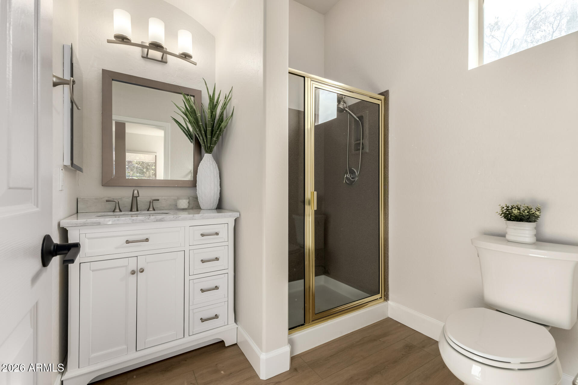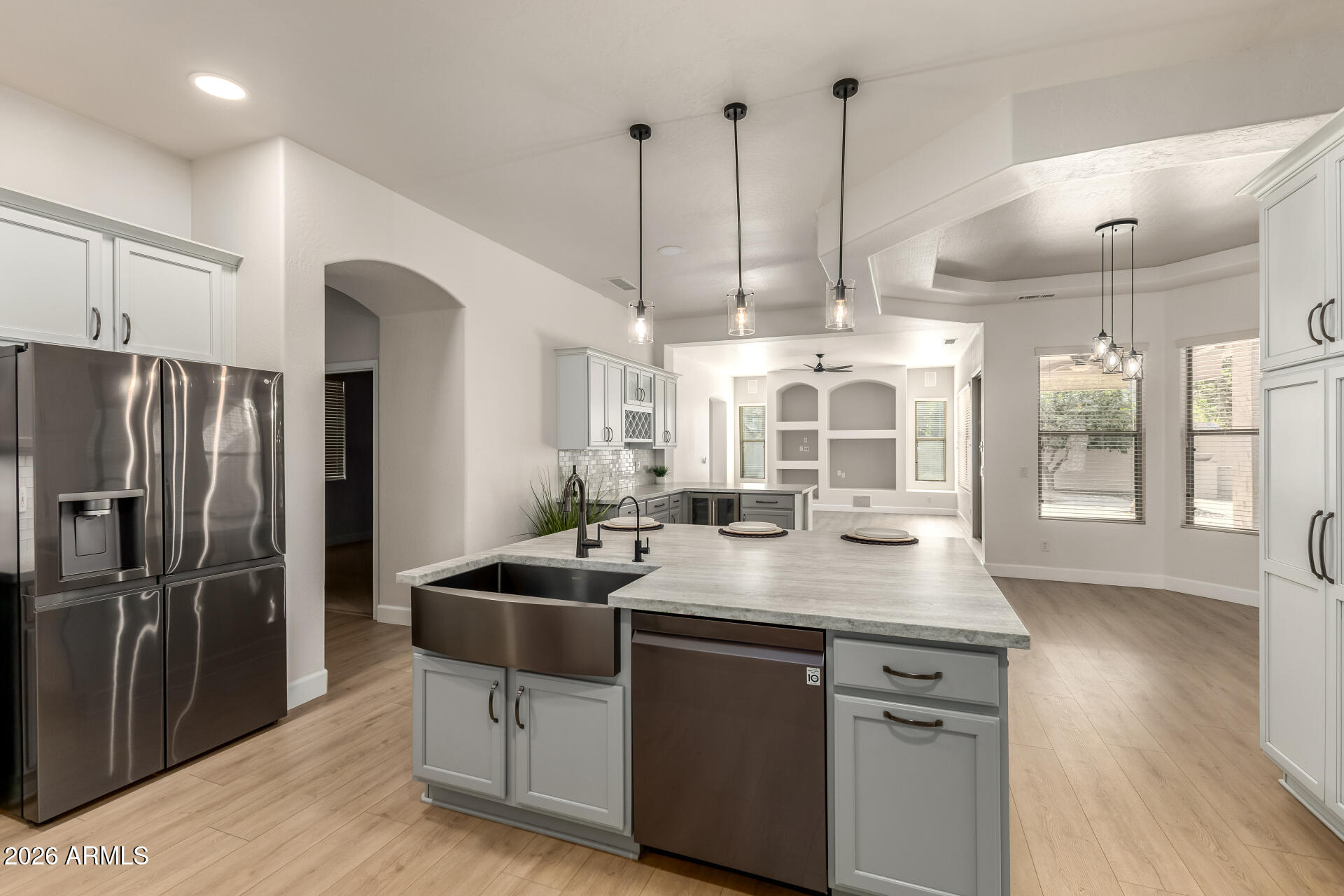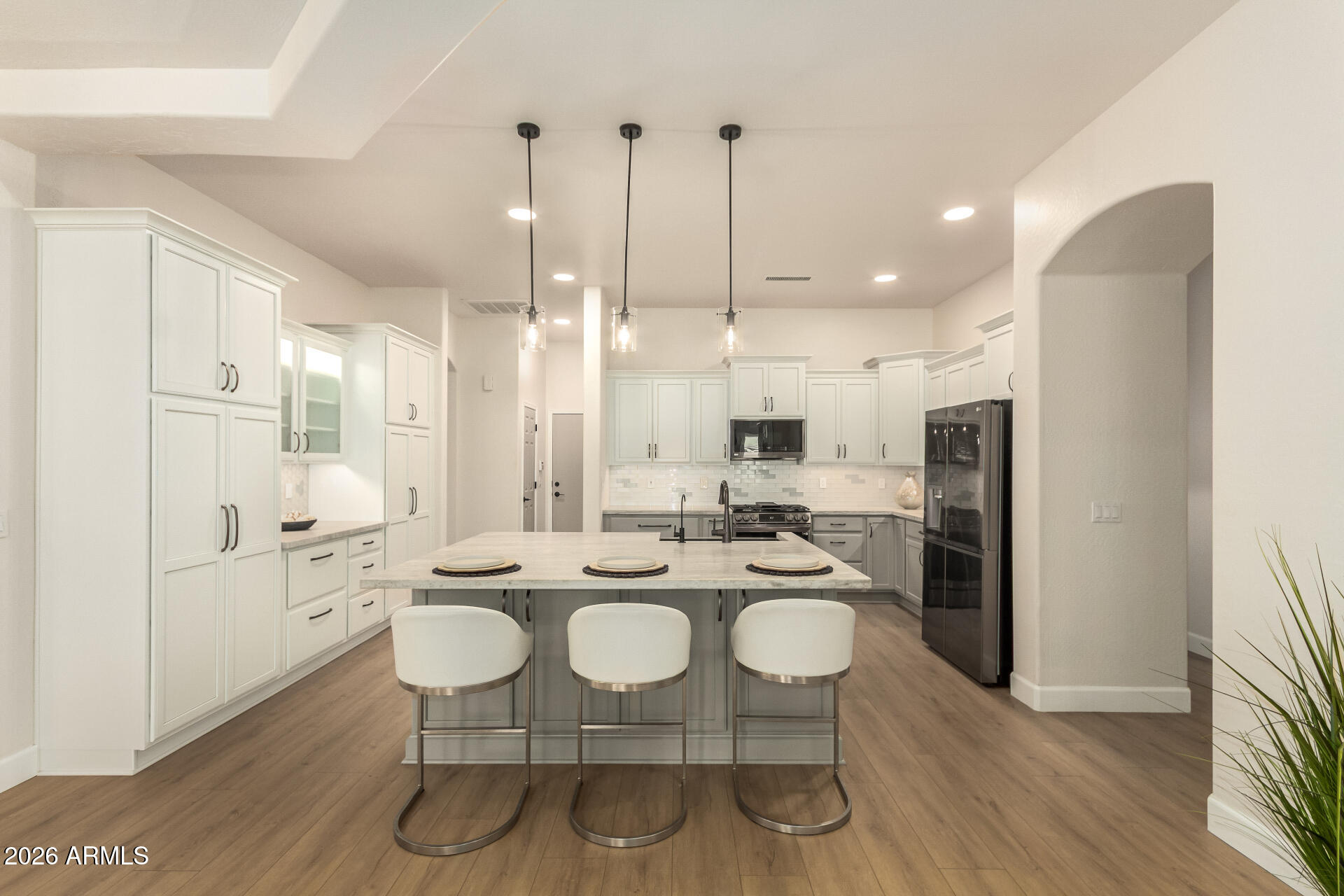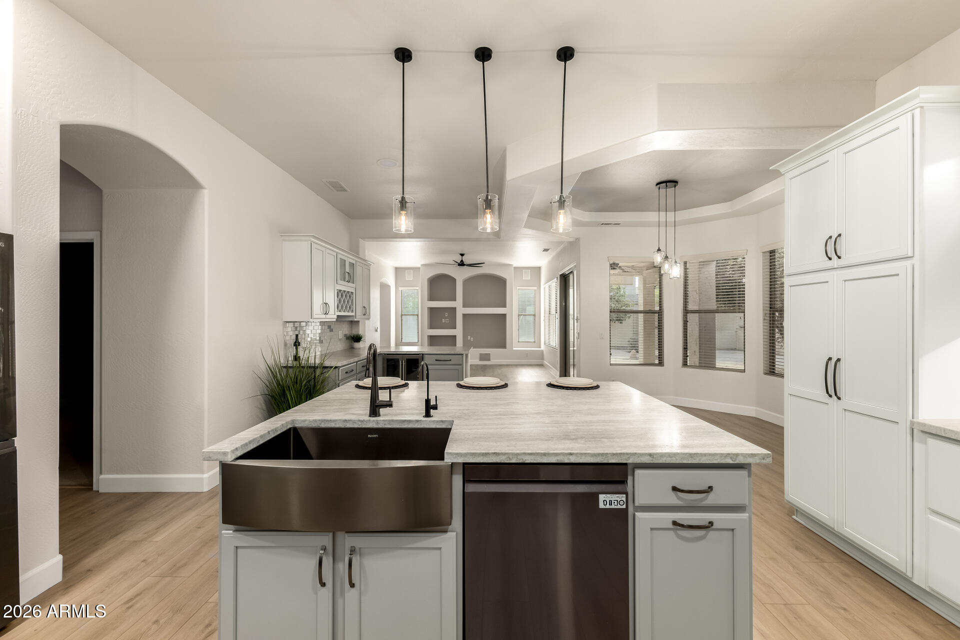 Located in the highly sought-after gated community of Arden Park, this beautifully updated 4-bedroom home showcases a brand-new kitchen with marble countertops, updated bathrooms, a 3-car garage, and a private pool. Enjoy luxury living from the moment you arrive with a scenic lake at the community entrance. Inside, beautiful luxury vinyl flooring and a formal dining area set the tone for elegant gatherings. The sleek kitchen shines with stainless steel appliances, a designer tile backsplash, abundant cabinetry, and a generous center island with breakfast bar. Step outside to your private oasis featuring a covered patio, extended patio space, and a sparkling diving pool perfect for entertaining or relaxing in style. Additional highlights include a private den ideal for an office or flex space, an inviting living room, and a family room designed for entertaining with pre-wired surround sound. The main bedroom offers direct backyard access and a spa-inspired bathroom with dual sinks, a glass-enclosed shower, and his & her walk-in closets. The garage is enhanced with attached cabinets for added organization and convenience. Enjoy the charm of a gated community, the serene lake entry, and a thoughtfully updated home designed for comfort, style, and entertaining. Welcome home!