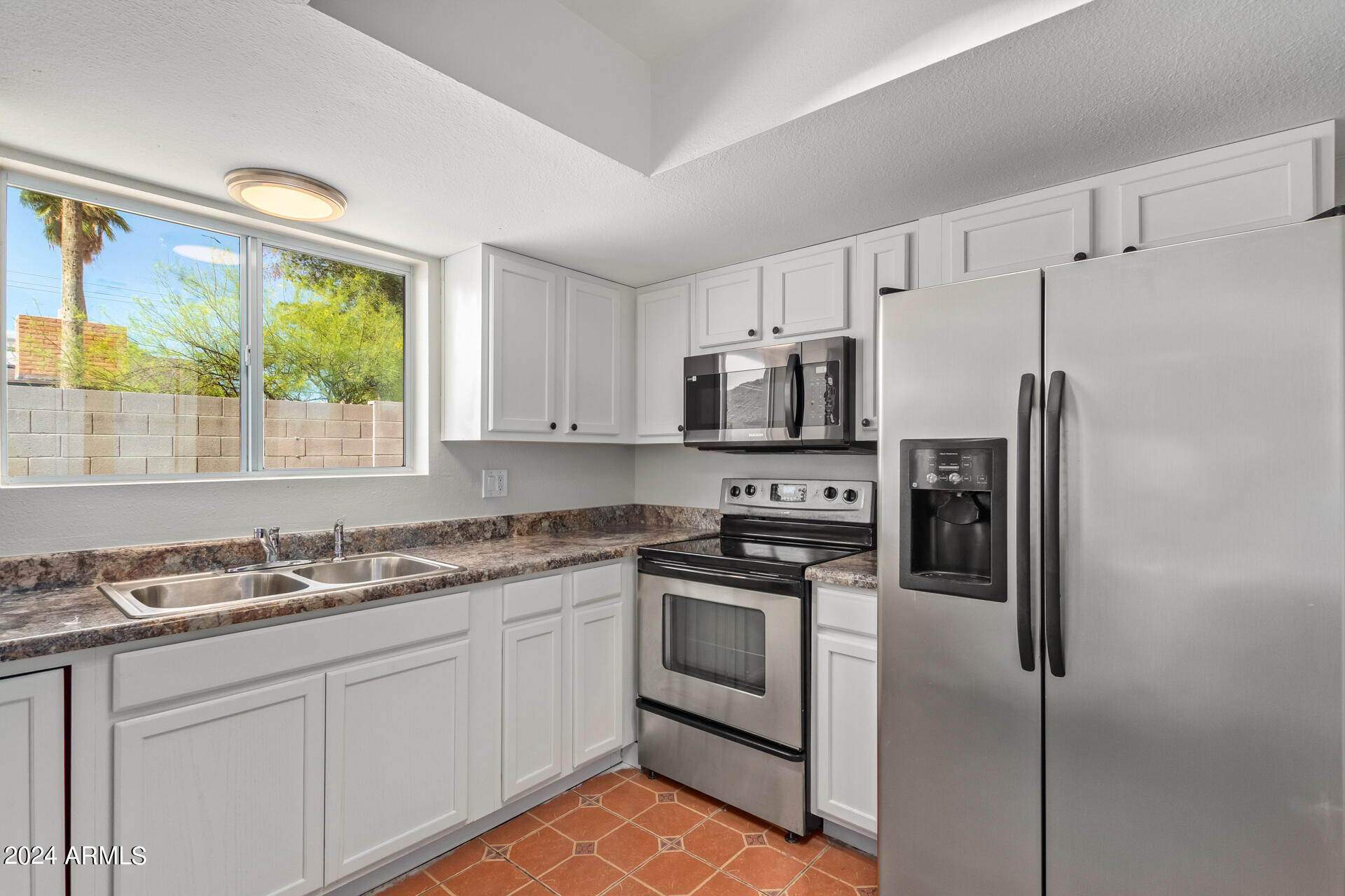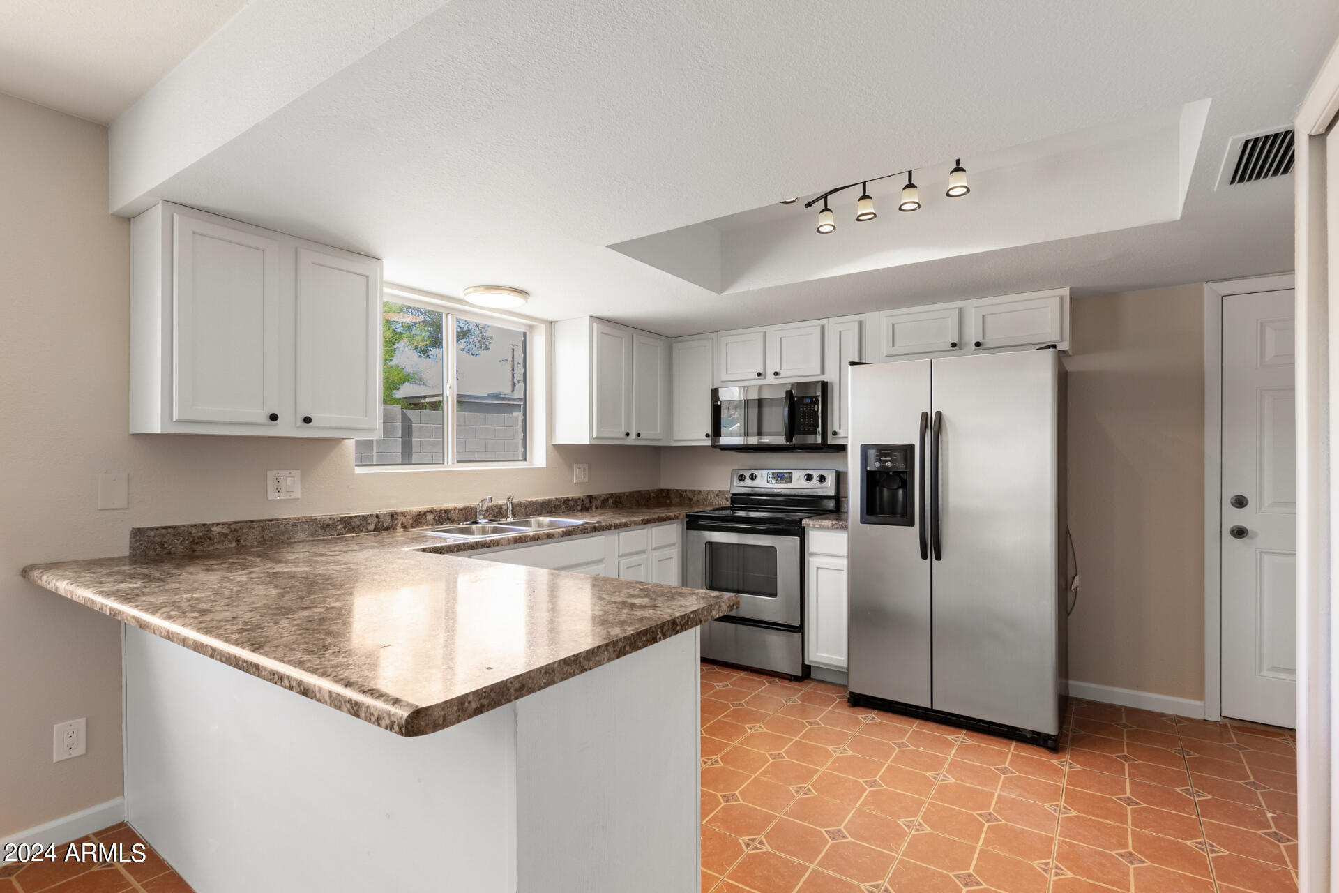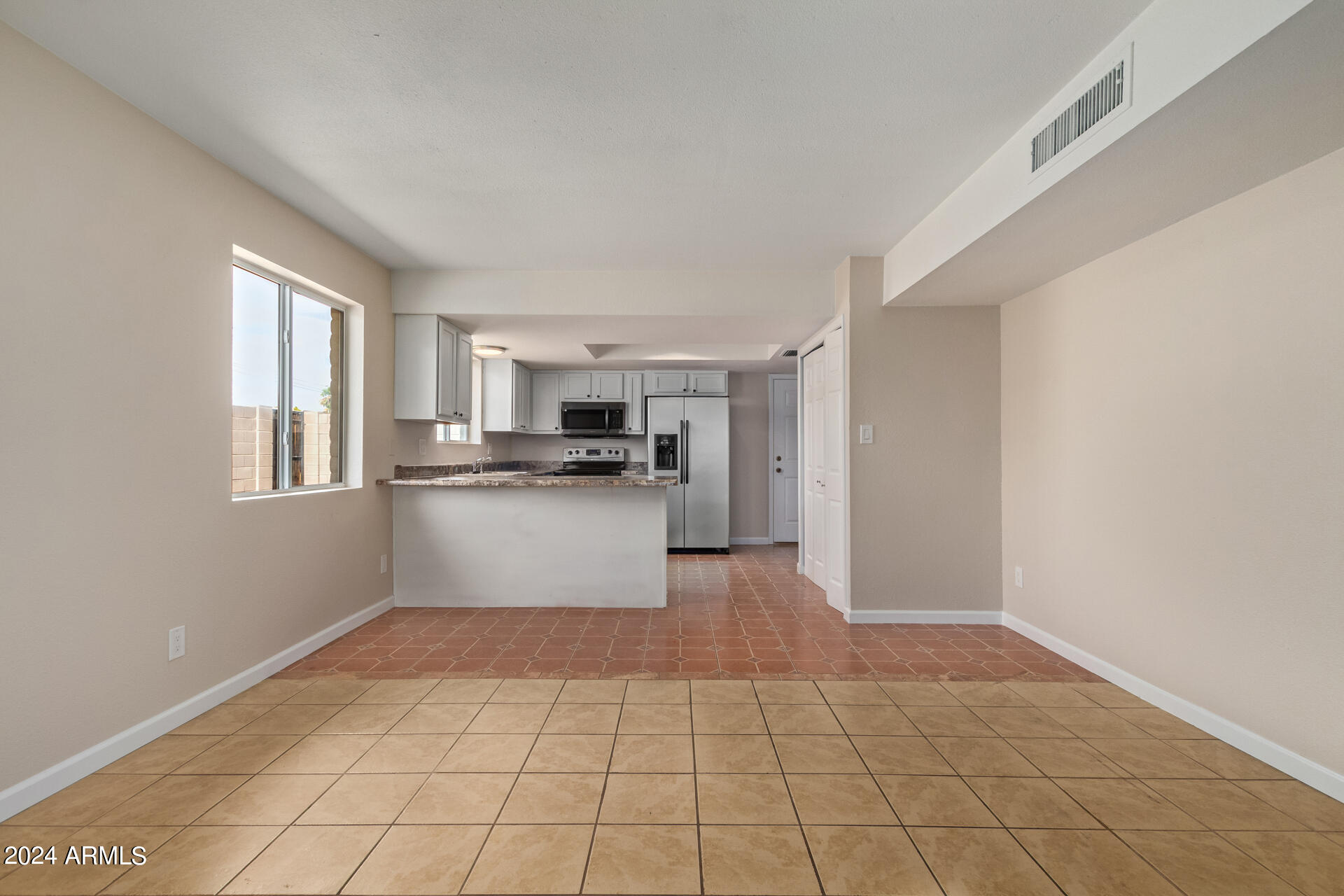 The kitchen is a chef's delight, boasting stainless stee appliances, plenty of cabinet space, and sleek countertops, making meal preparation a breeze.