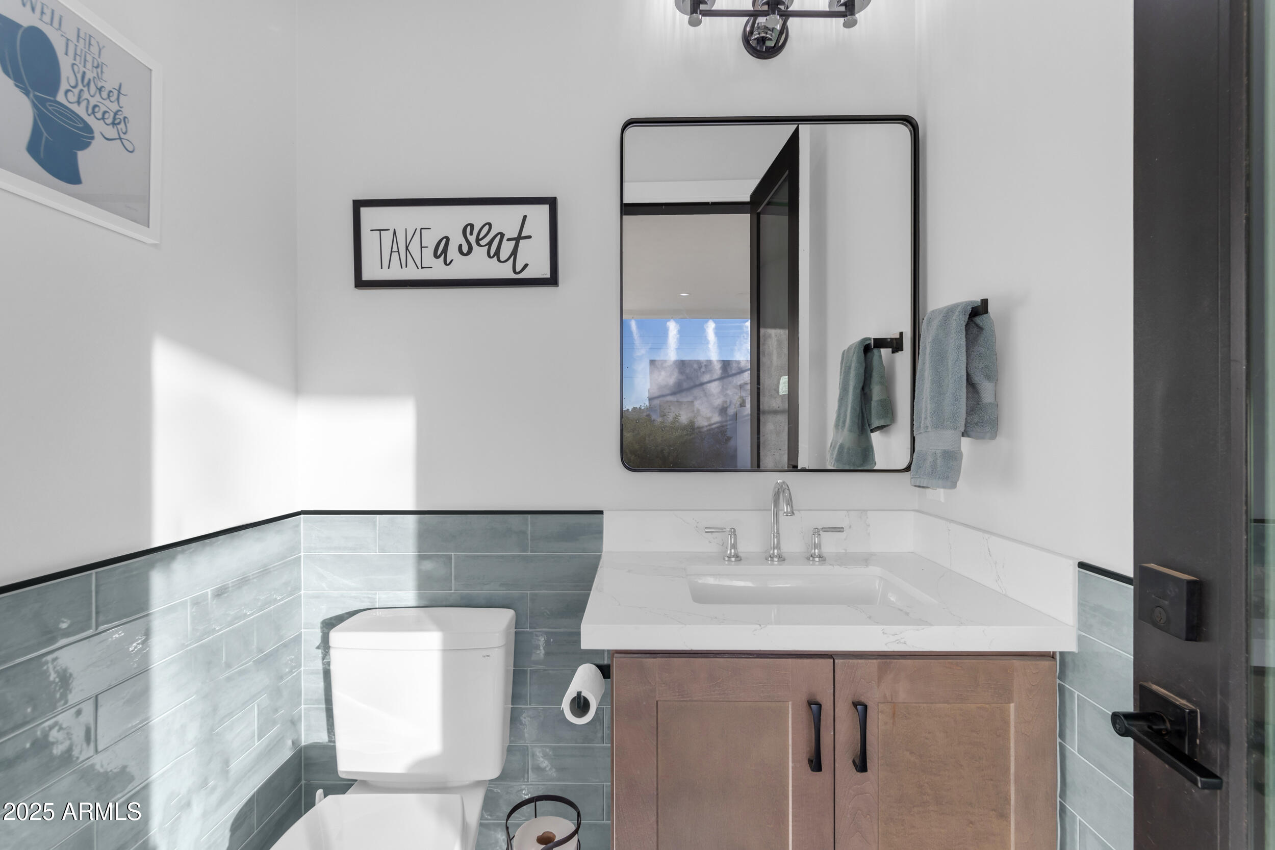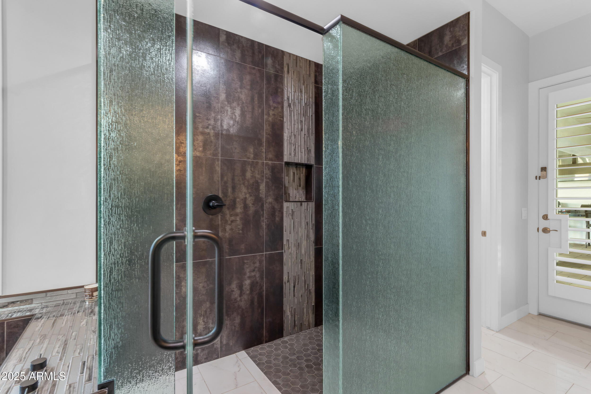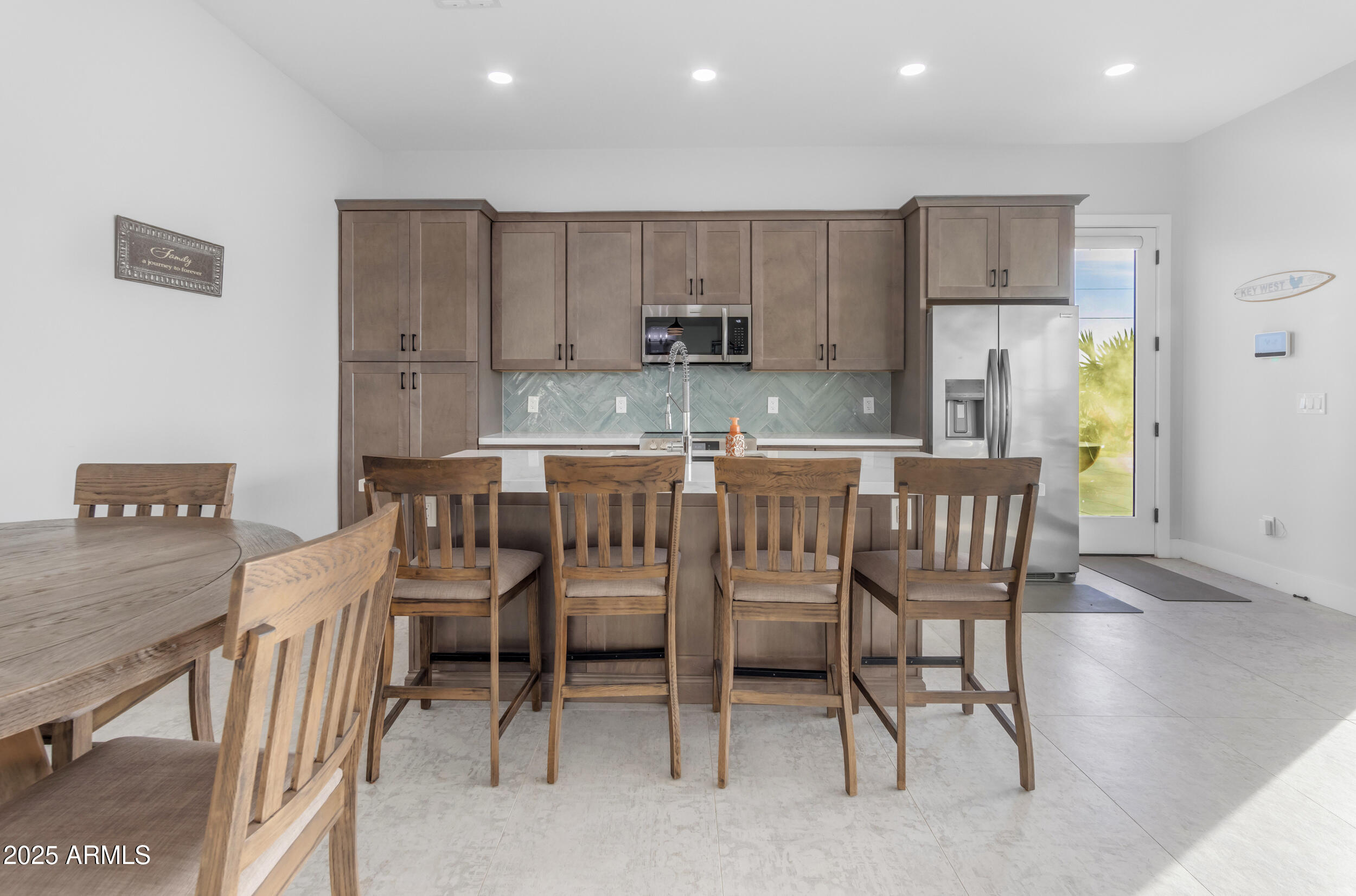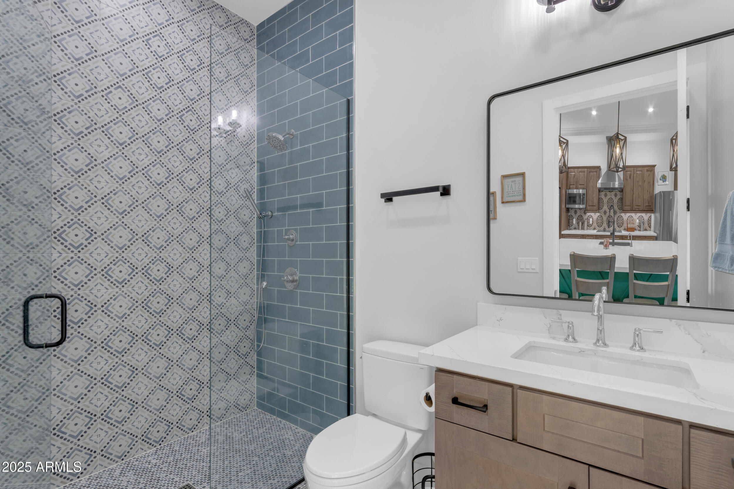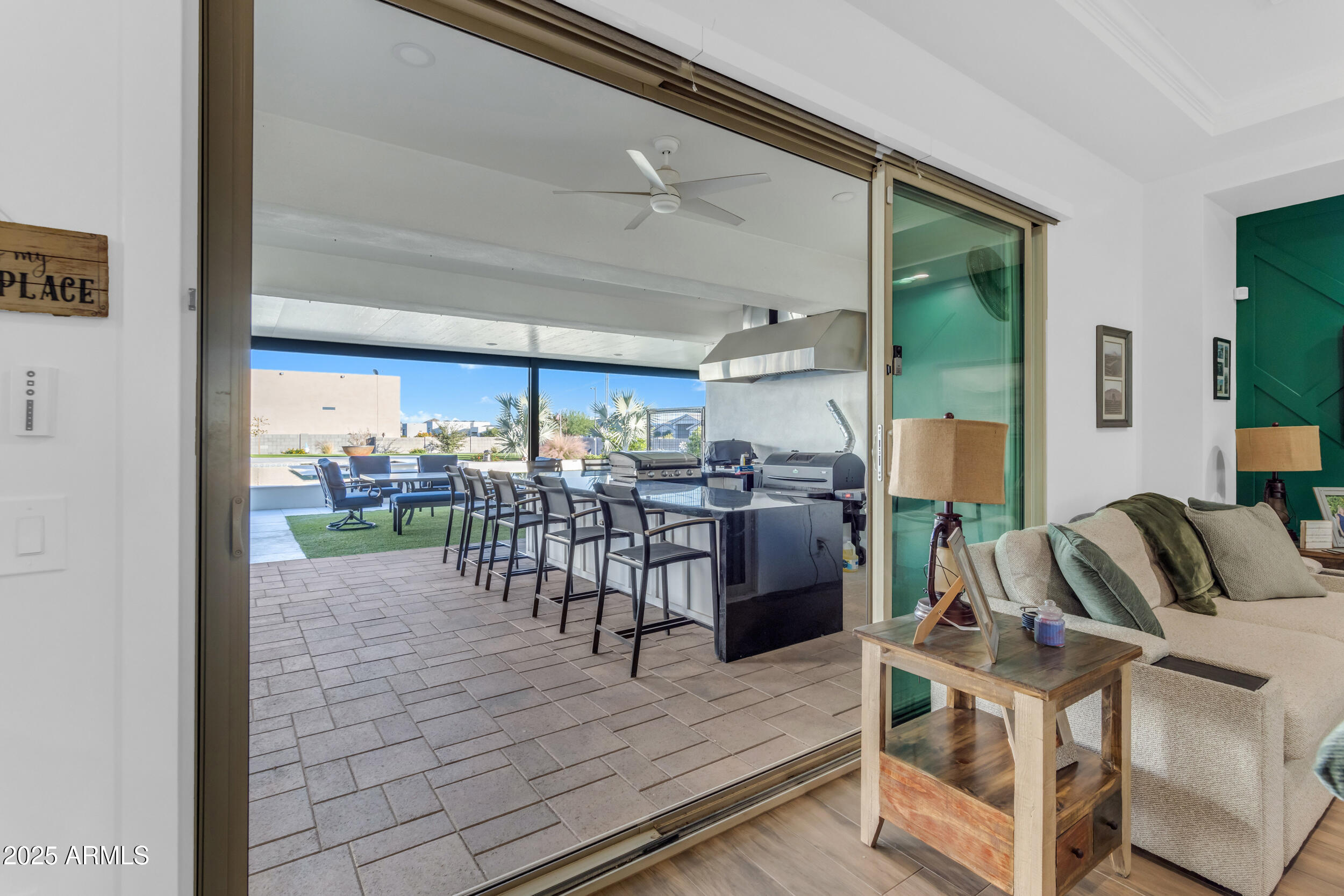 The casita is a flexible bonus space with two entrances, including a full wall of glass that opens up completely for seamless entertaining and another off the kitchen for daily use. Inside, you'll find a full kitchen with island, herringbone backsplash, quartz counters, stainless appliances, and space for stools. The casita also features a half pool bath outside under the patio, an interior bathroom with a walk-in shower and attractive tile, exterior surround sound, and a studio layout perfect for a game room, entertainment space, or guest quarters when you add a Murphy bed.