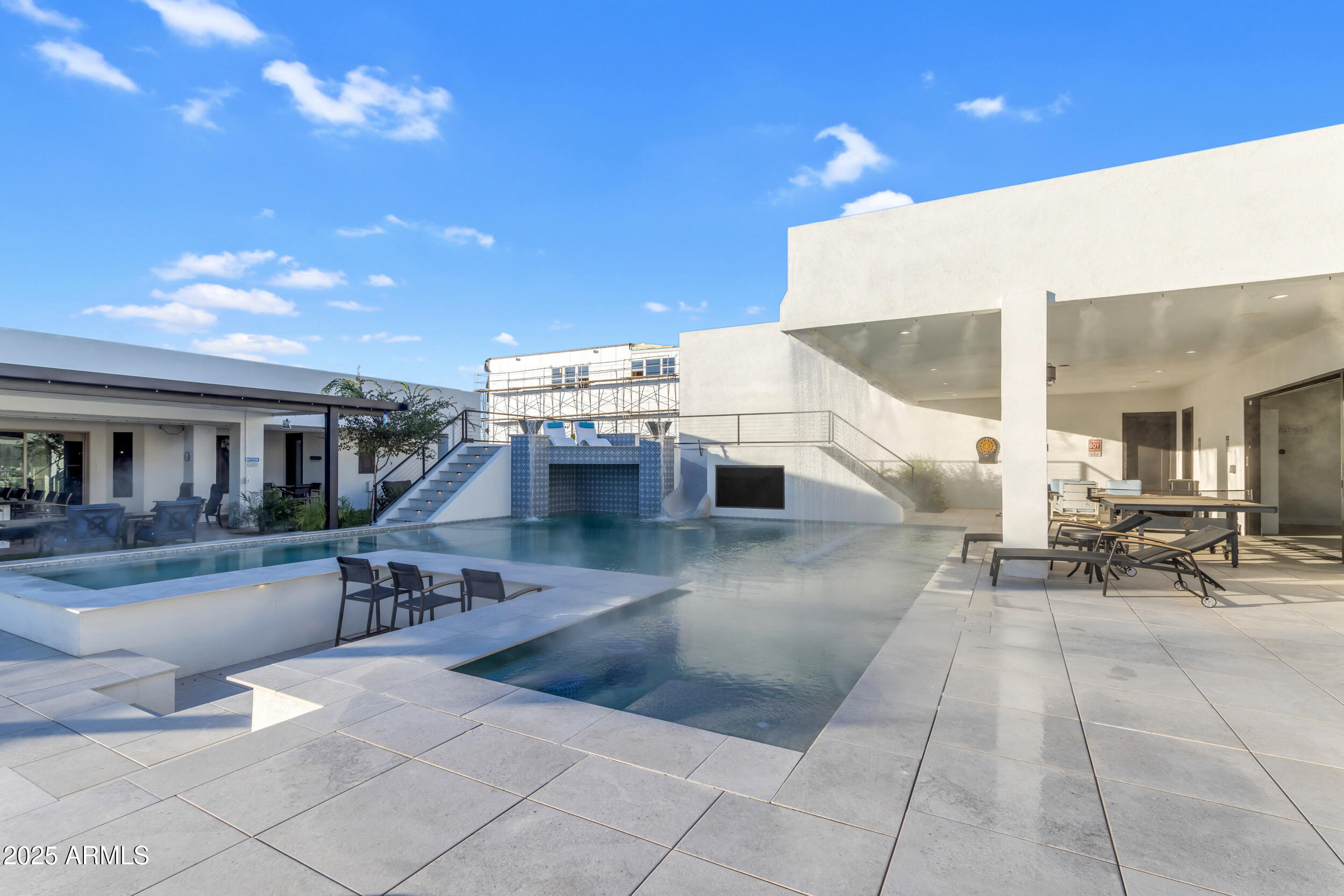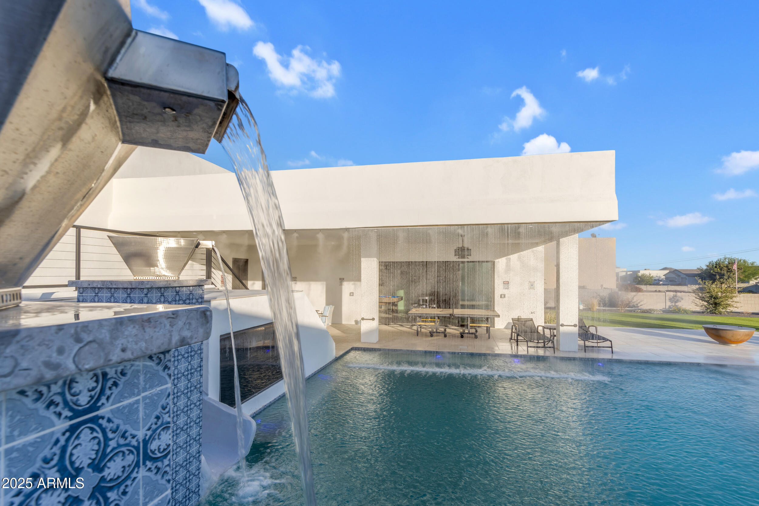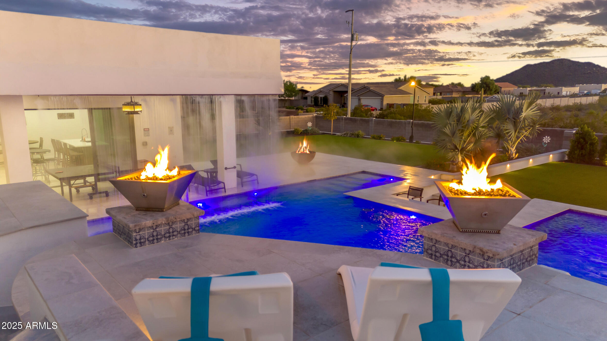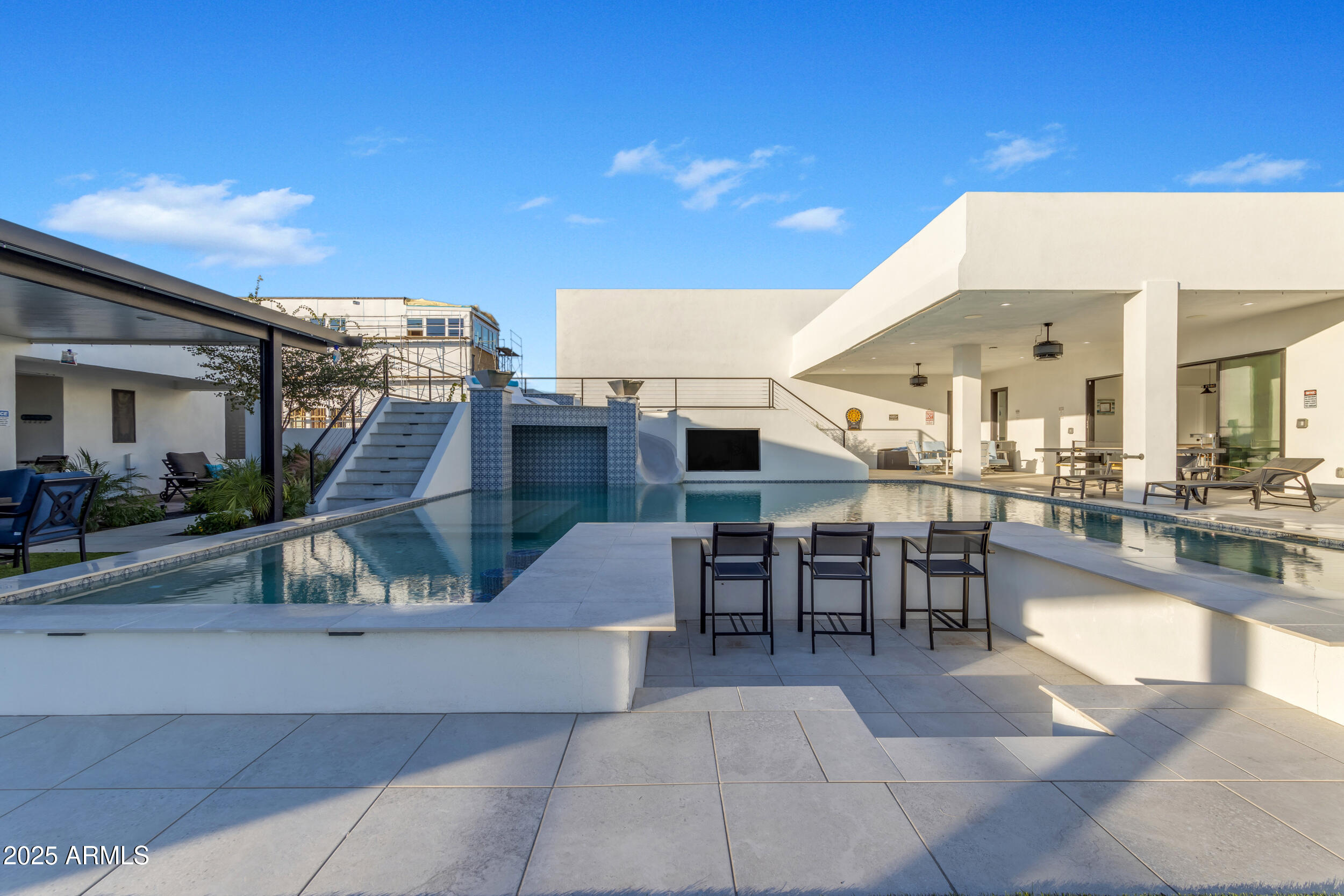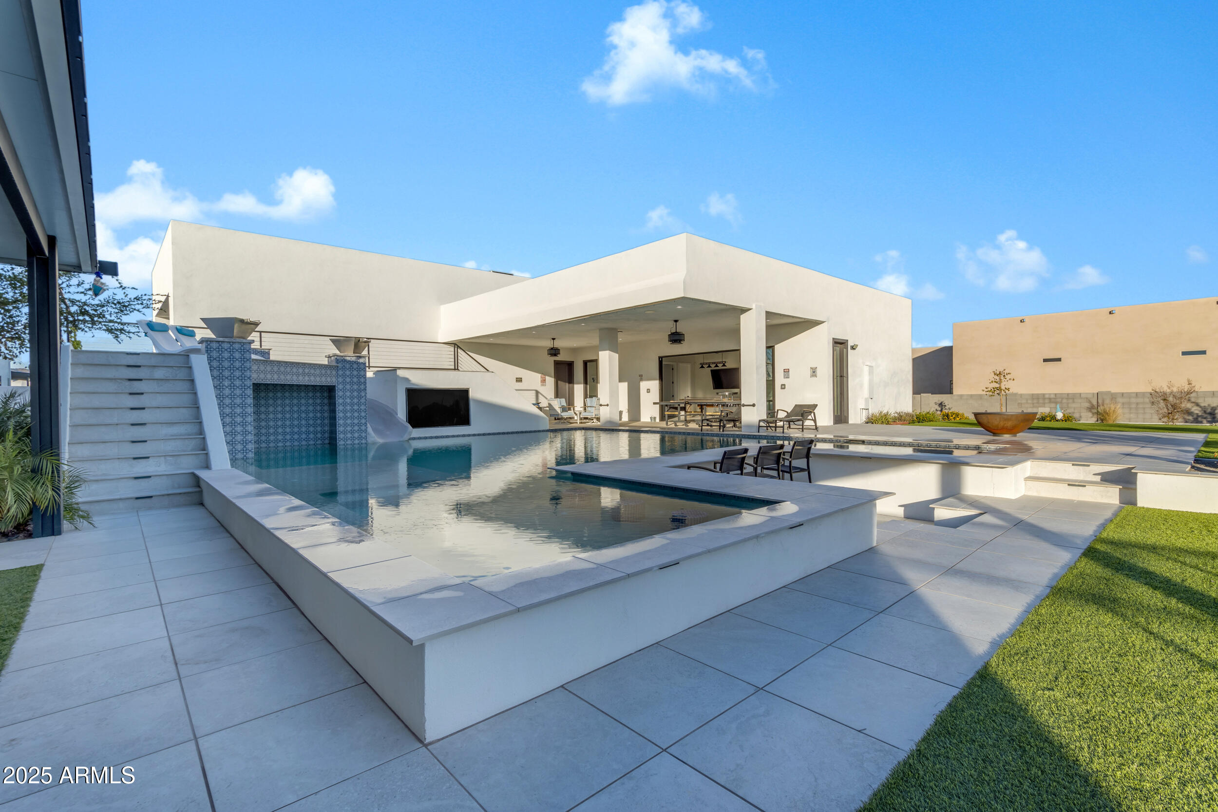 Step outside to your private resort. The expansive covered patio leads to an entertainer's dream backyard. The extra large pool features a sunken swim-up bar with jets, in-pool benches and stools, a slide, a built-in big screen TV, a grotto with jump-off area, waterfalls, and gorgeous tile. Forty pool solar panels help with heating. There is a misting system with mist fans that create a cool oasis under the patio and even at the pool tile line. Lounge in the sun or relax under one of the two extended patios, both offering plenty of shade. For a comprehensive list of backyard and pool upgrades, please refer to the documents section.