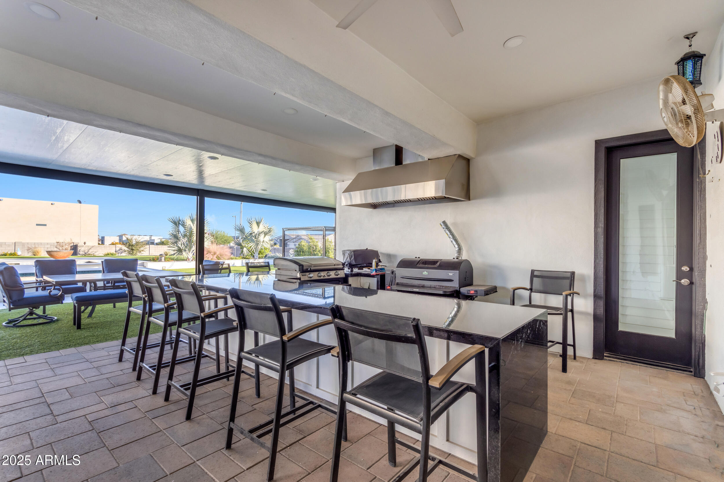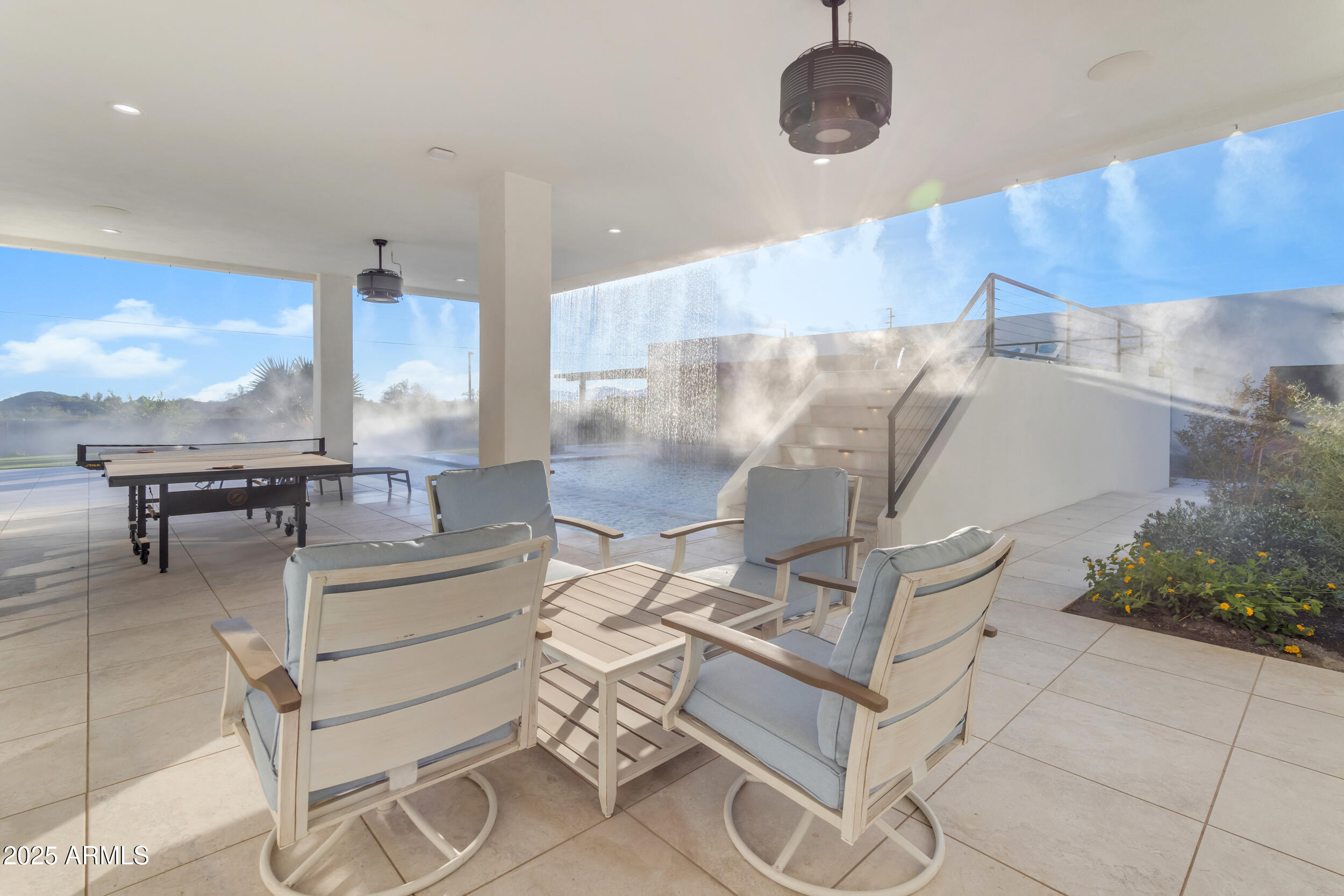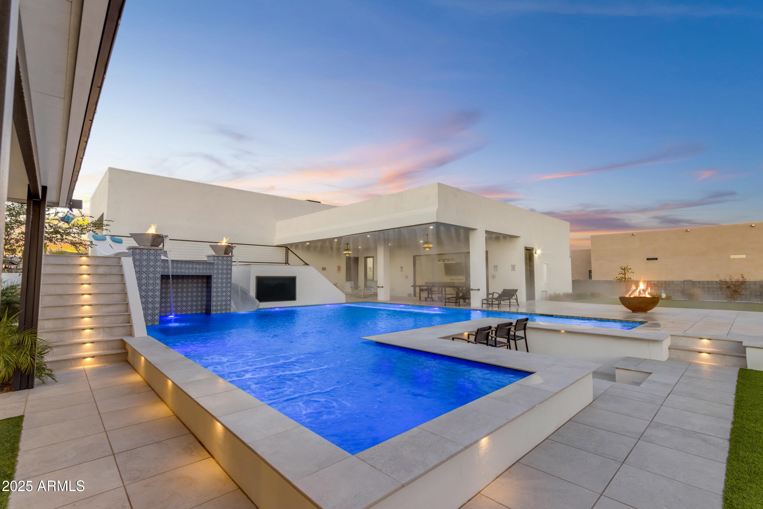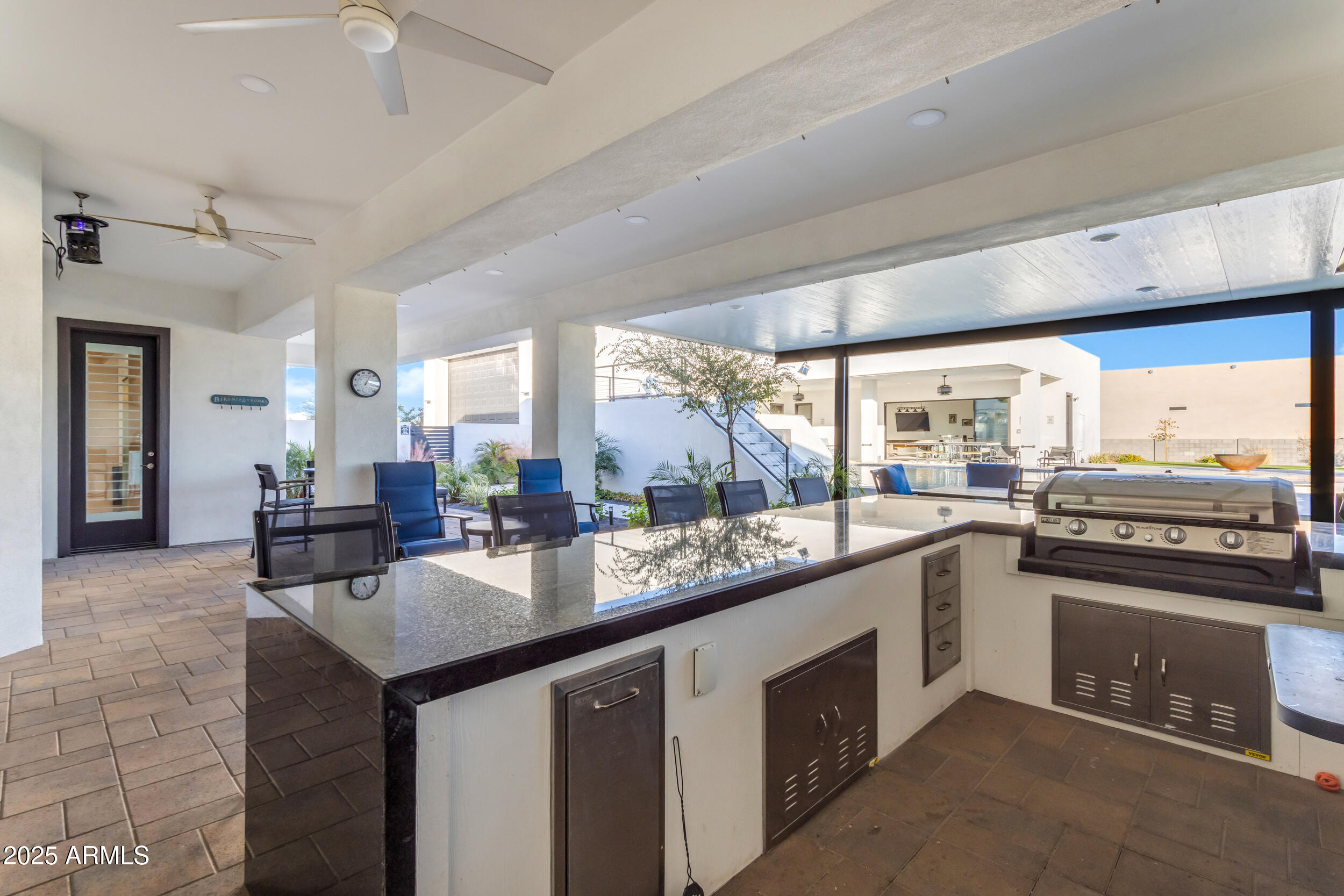Step outside to your private resort. The expansive covered patio leads to an entertainer's dream backyard. The extra large pool features a sunken swim-up bar with jets, in-pool benches and stools, a slide, a built-in big screen TV, a grotto with jump-off area, waterfalls, and gorgeous tile. Forty pool solar panels help with heating. There is a misting system with mist fans that create a cool oasis under the patio and even at the pool tile line. Lounge in the sun or relax under one of the two extended patios, both offering plenty of shade. For a comprehensive list of backyard and pool upgrades, please refer to the documents section.