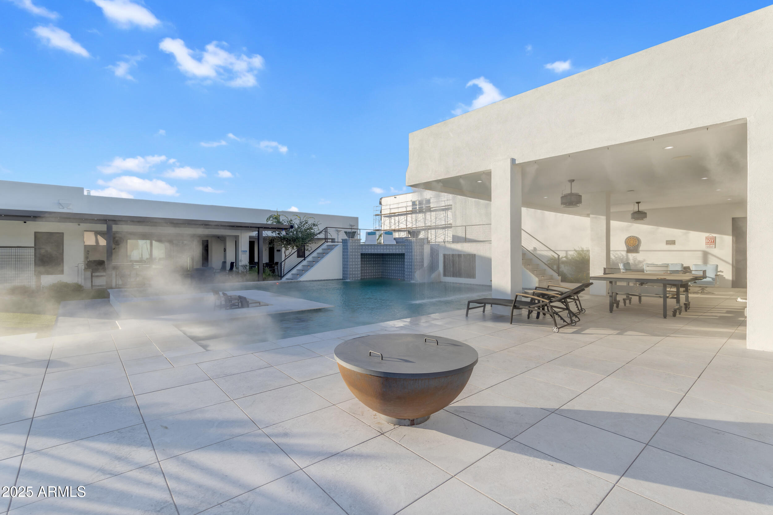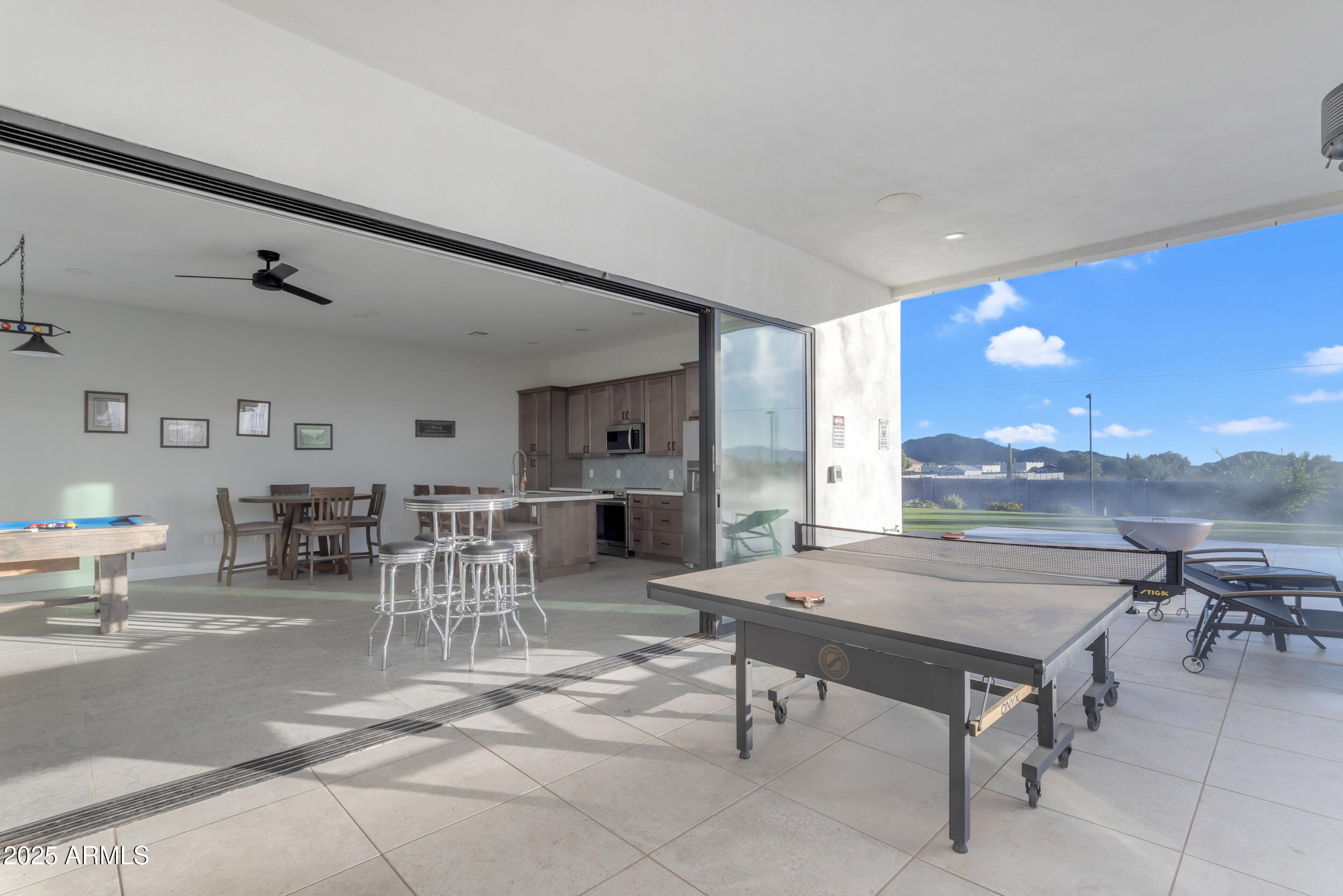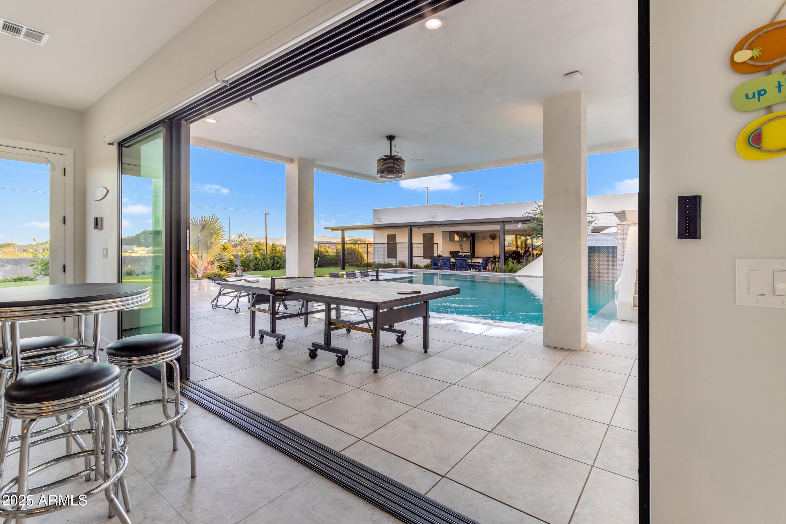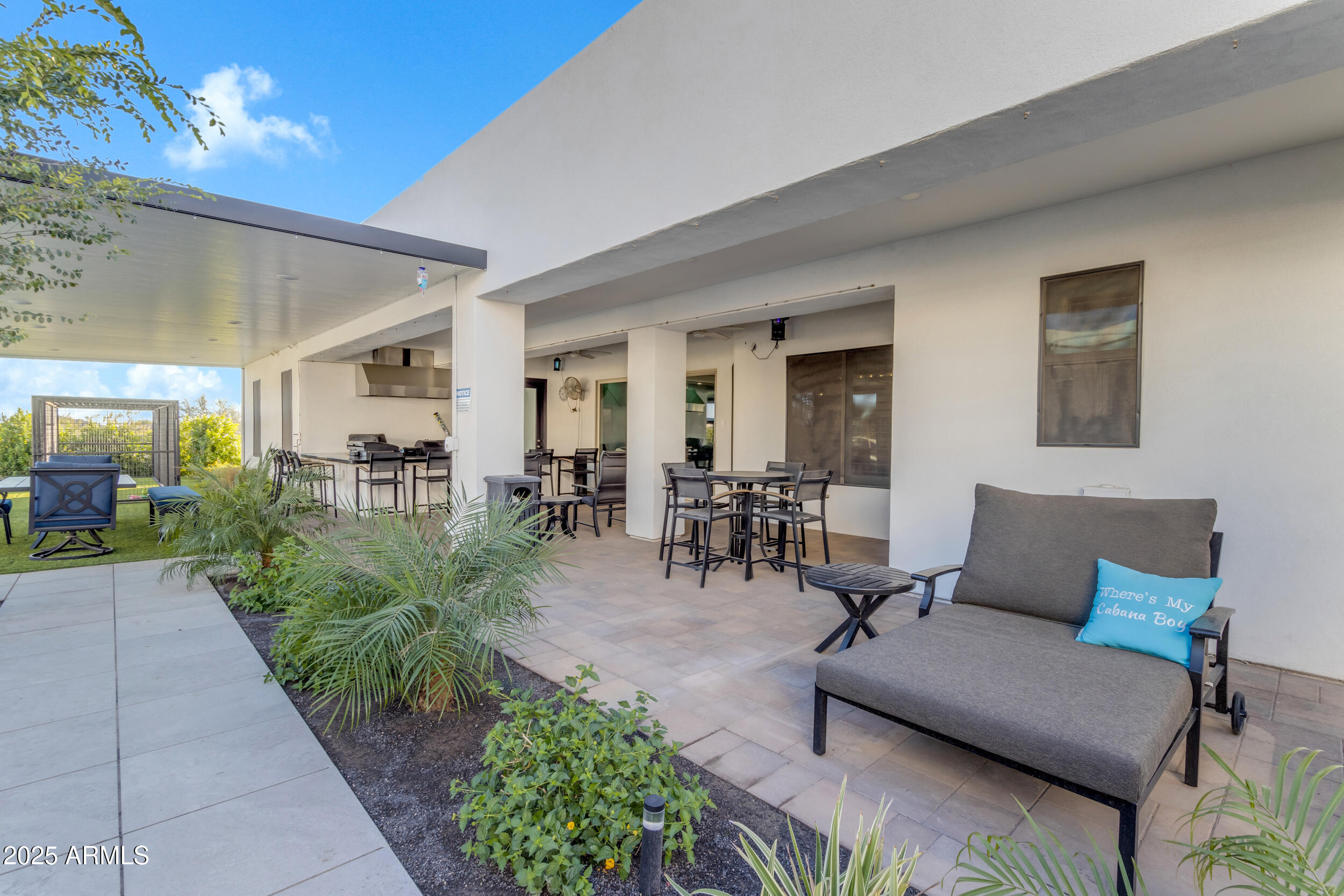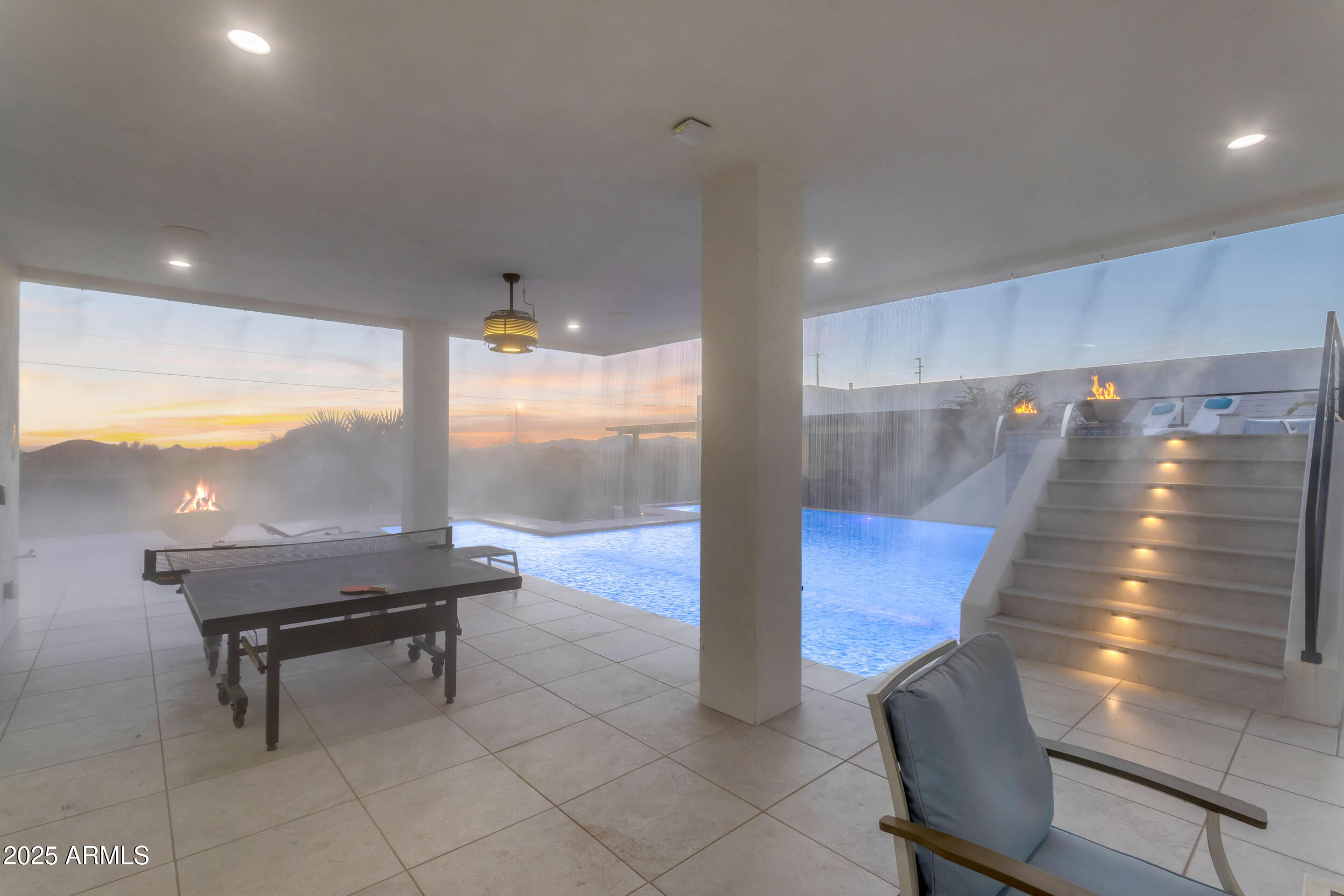 Step outside to your private resort. The expansive covered patio leads to an entertainer's dream backyard. The extra large pool features a sunken swim-up bar with jets, in-pool benches and stools, a slide, a built-in big screen TV, a grotto with jump-off area, waterfalls, and gorgeous tile. Forty pool solar panels help with heating. There is a misting system with mist fans that create a cool oasis under the patio and even at the pool tile line. Lounge in the sun or relax under one of the two extended patios, both offering plenty of shade. For a comprehensive list of backyard and pool upgrades, please refer to the documents section.