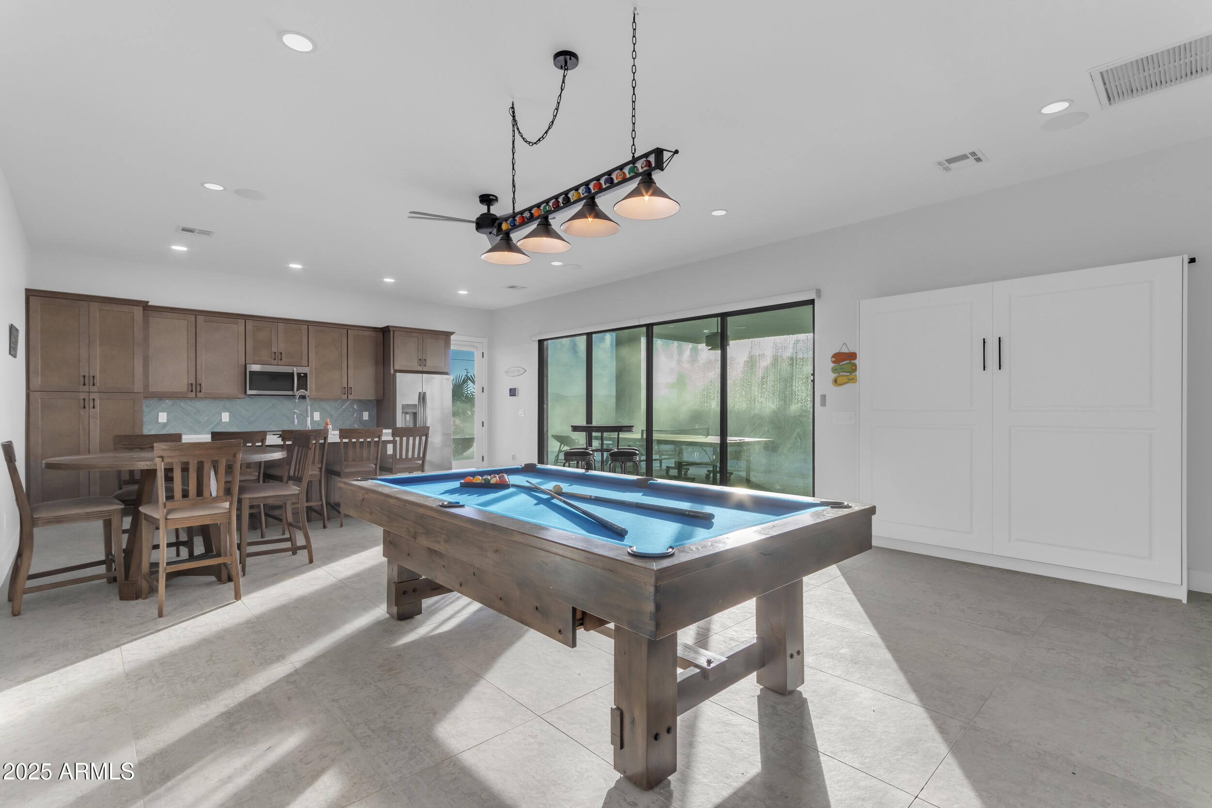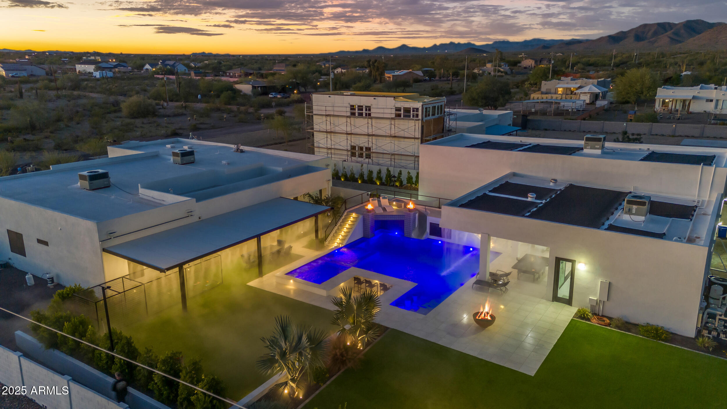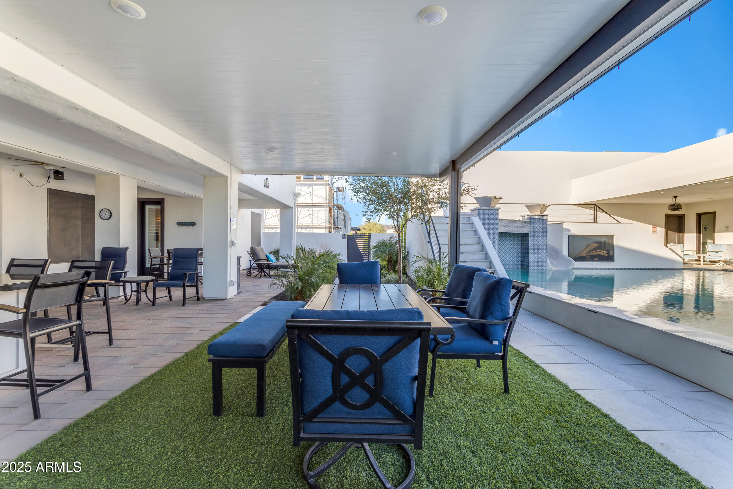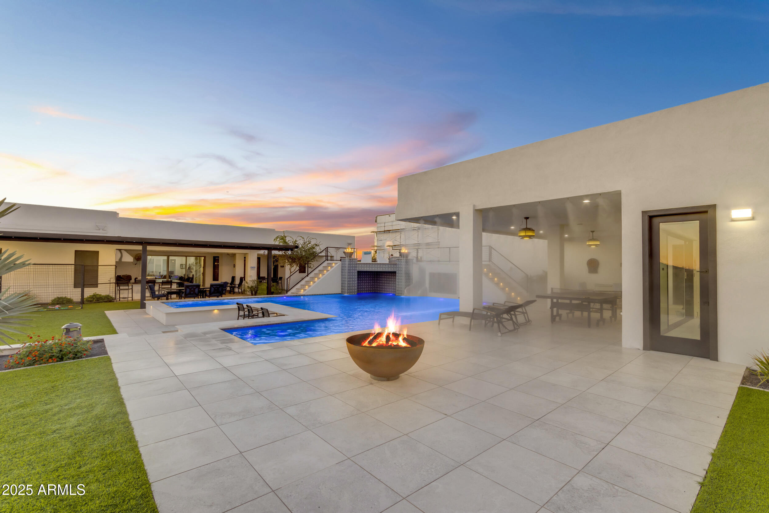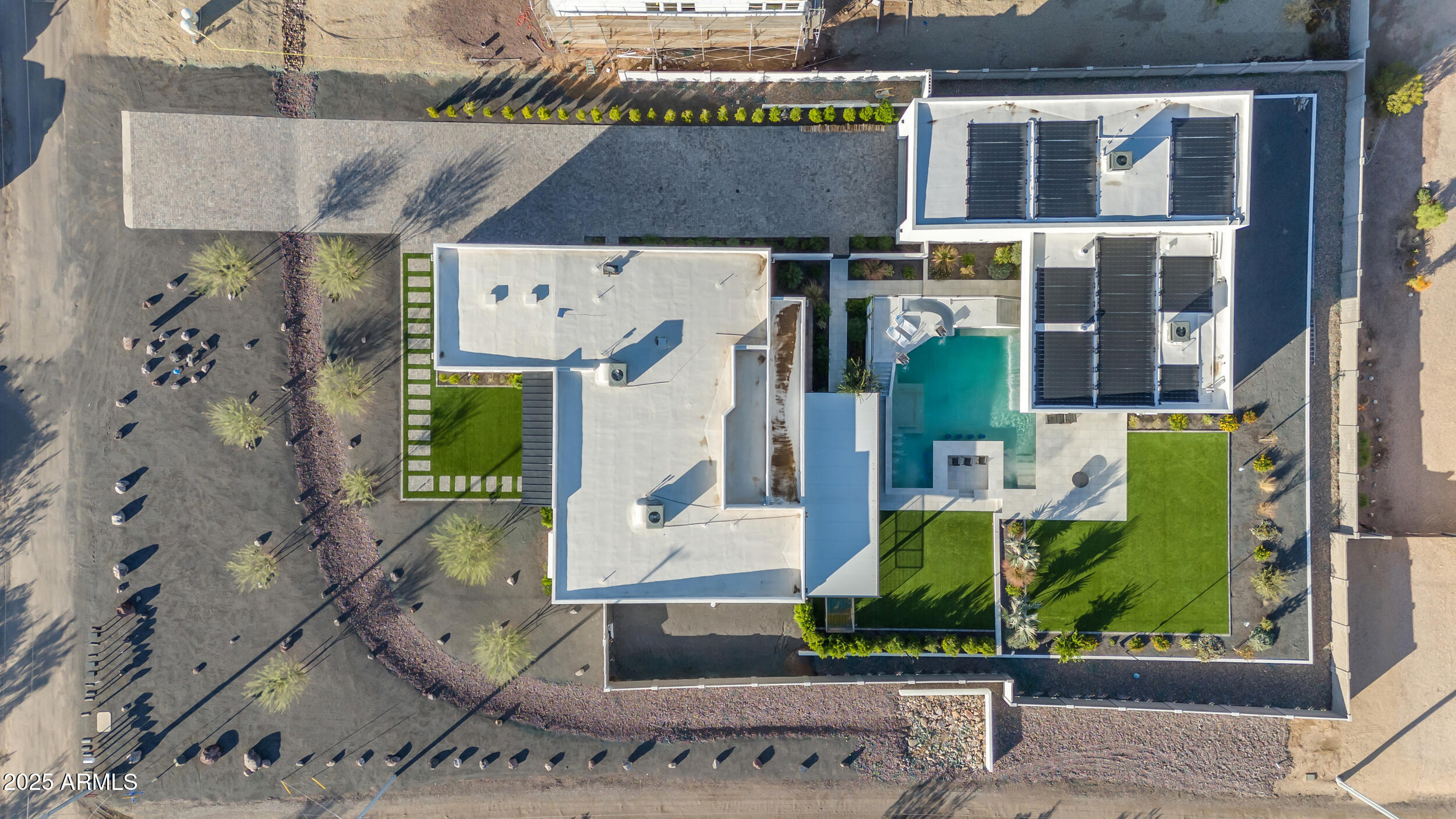 Step outside to your private resort. The expansive covered patio leads to an entertainer's dream backyard. The extra large pool features a sunken swim-up bar with jets, in-pool benches and stools, a slide, a built-in big screen TV, a grotto with jump-off area, waterfalls, and gorgeous tile. Forty pool solar panels help with heating. There is a misting system with mist fans that create a cool oasis under the patio and even at the pool tile line. Lounge in the sun or relax under one of the two extended patios, both offering plenty of shade. For a comprehensive list of backyard and pool upgrades, please refer to the documents section.