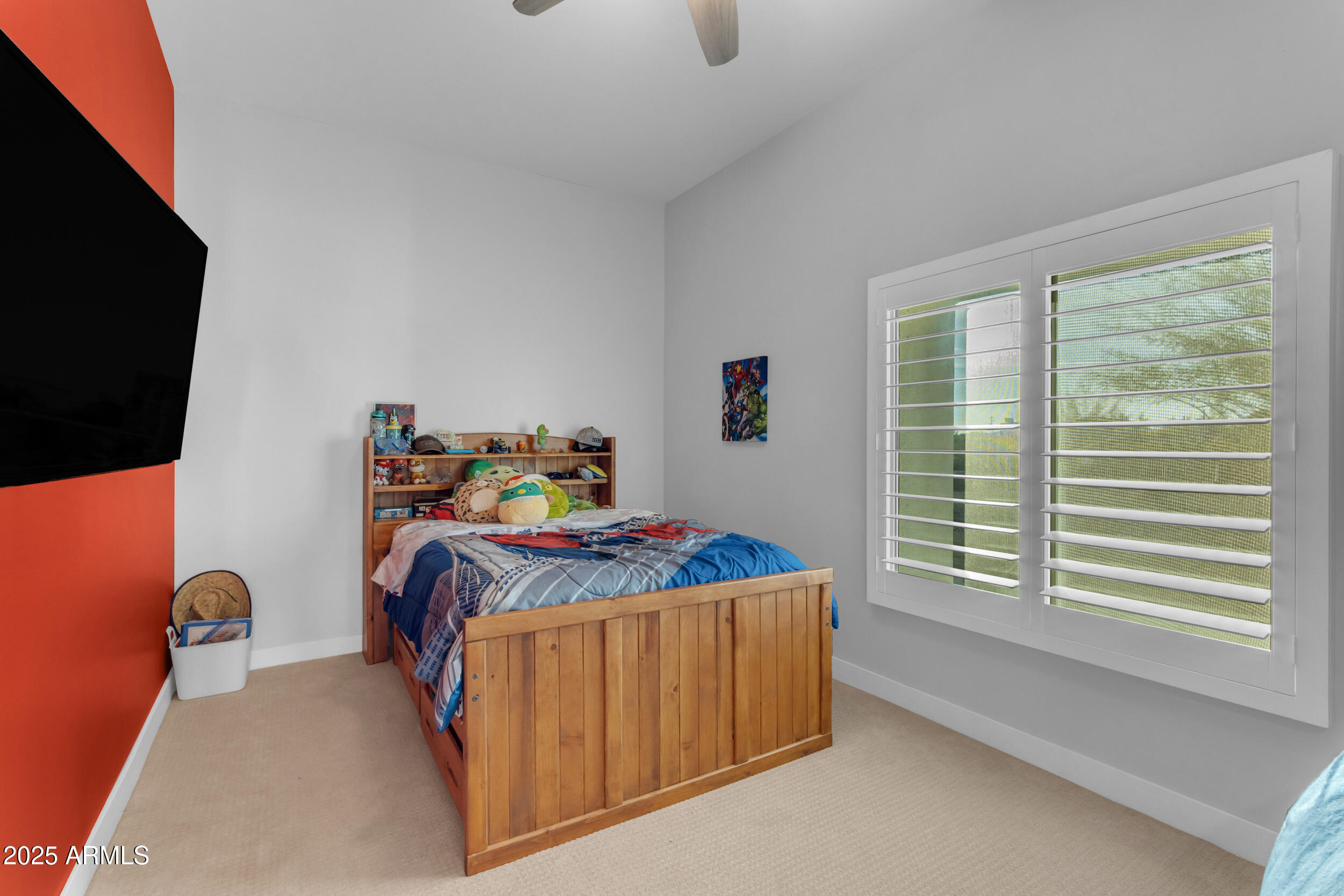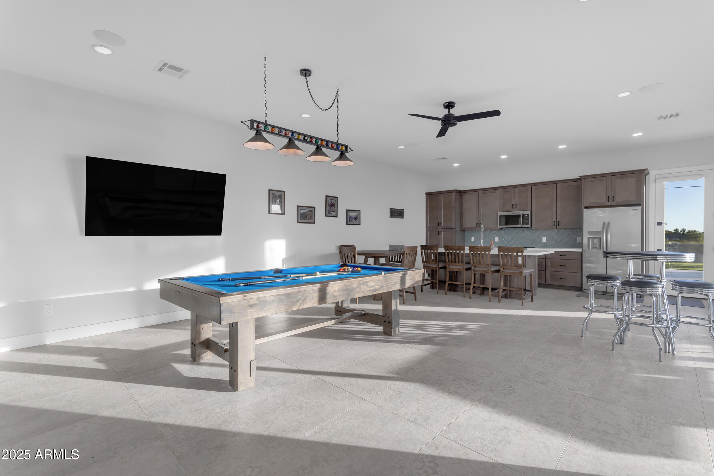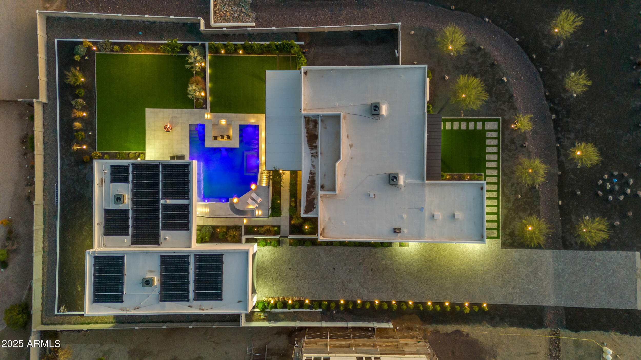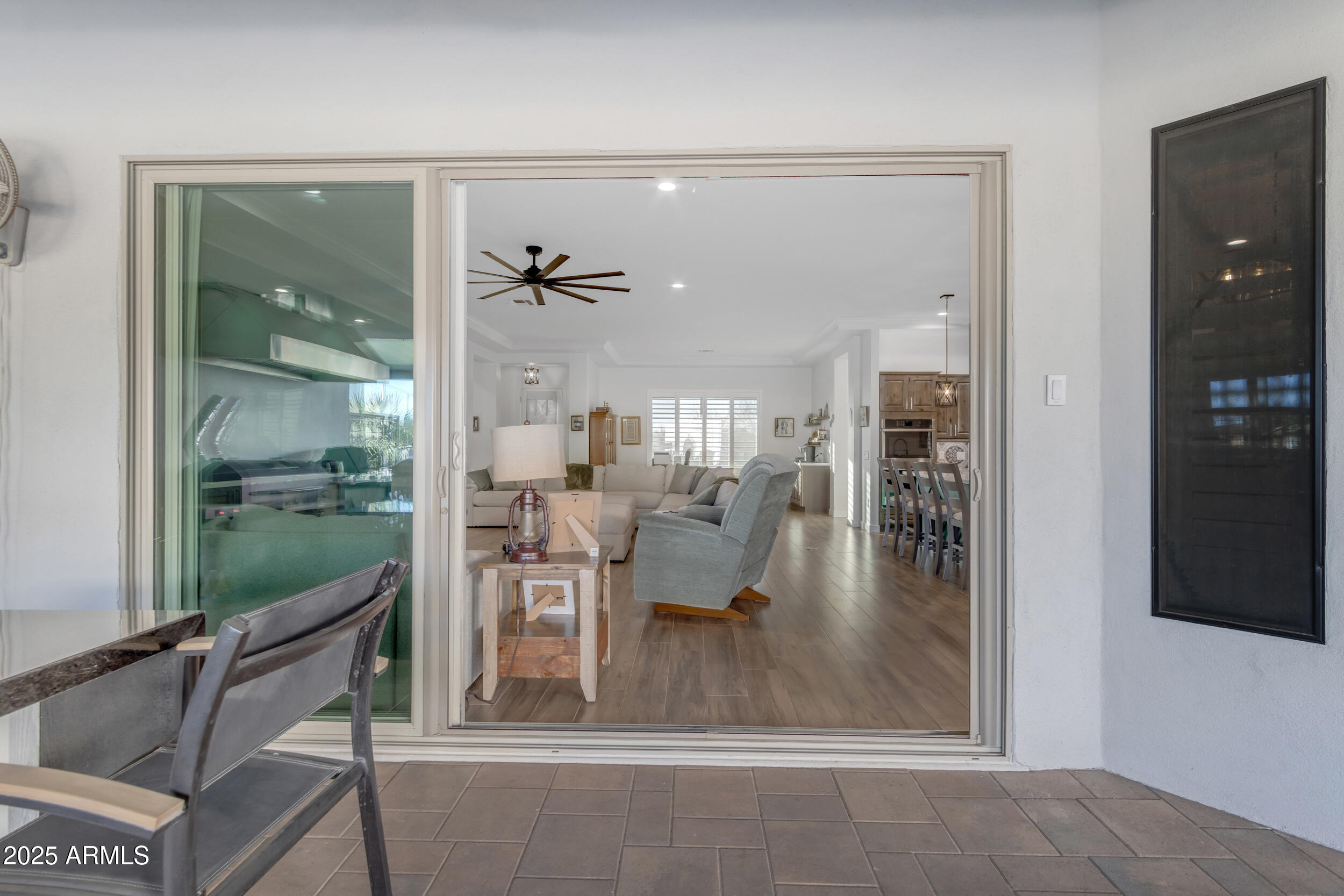 Step outside to your private resort. The expansive covered patio leads to an entertainer's dream backyard. The extra large pool features a sunken swim-up bar with jets, in-pool benches and stools, a slide, a built-in big screen TV, a grotto with jump-off area, waterfalls, and gorgeous tile. Forty pool solar panels help with heating. There is a misting system with mist fans that create a cool oasis under the patio and even at the pool tile line. Lounge in the sun or relax under one of the two extended patios, both offering plenty of shade. For a comprehensive list of backyard and pool upgrades, please refer to the documents section.