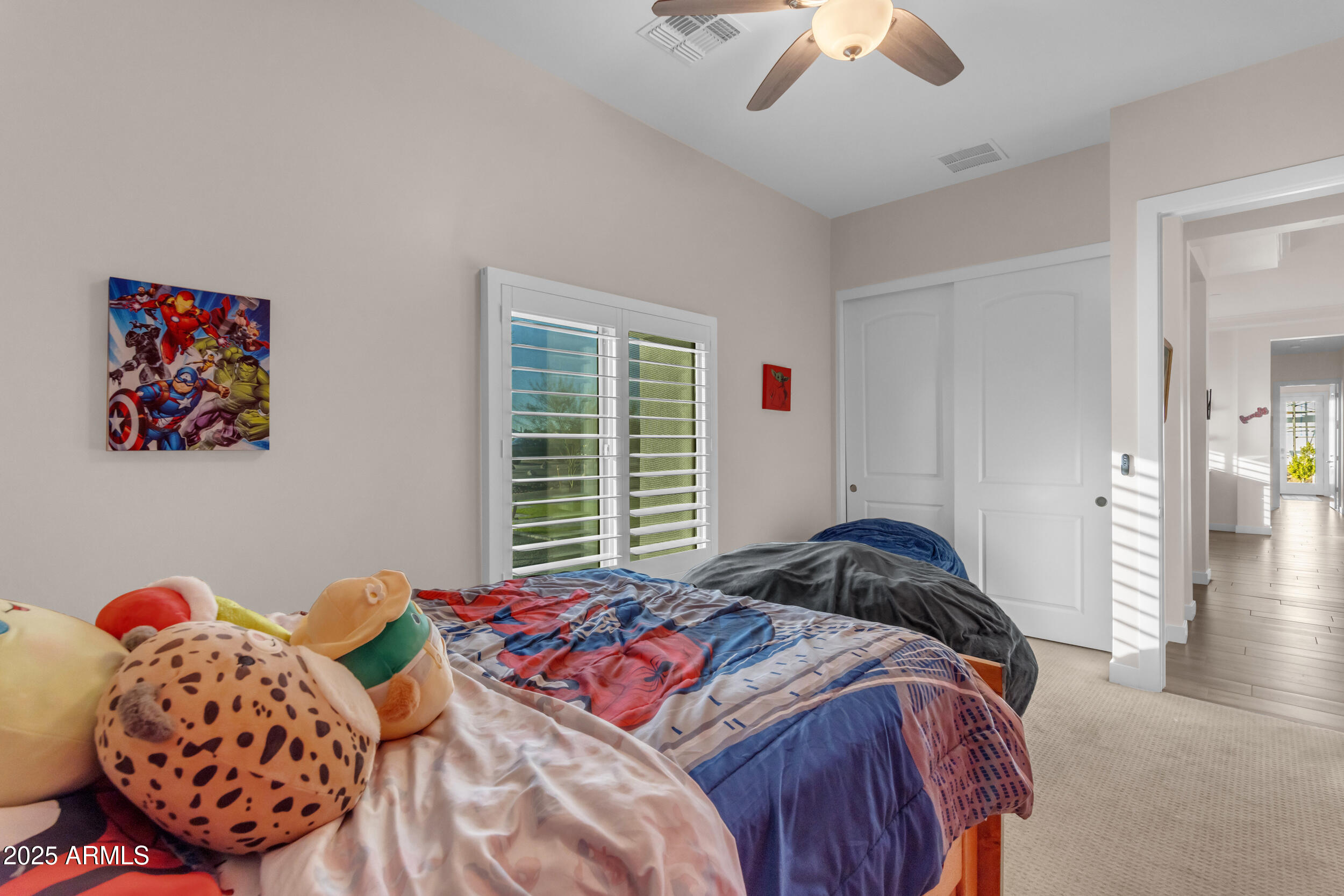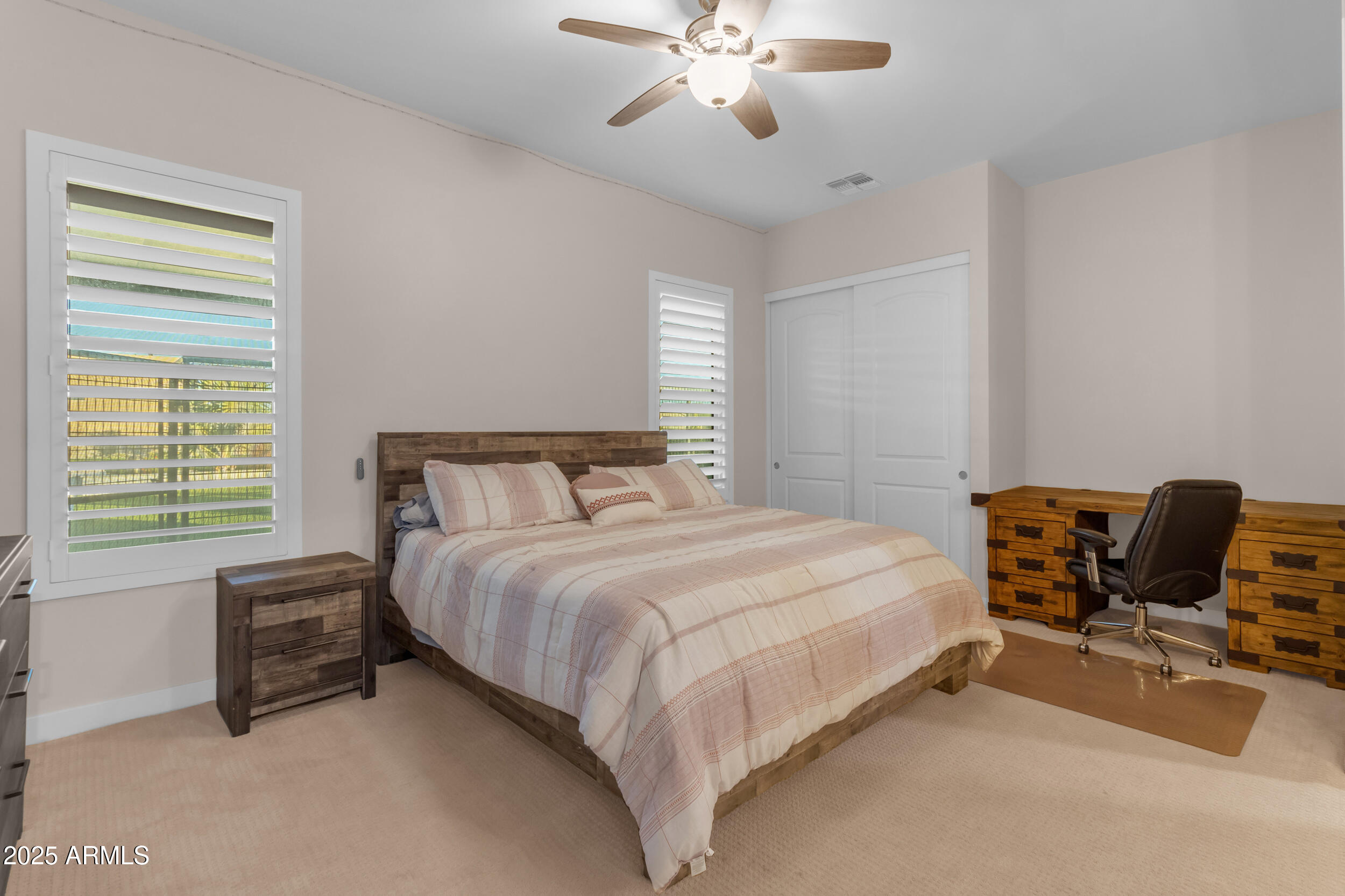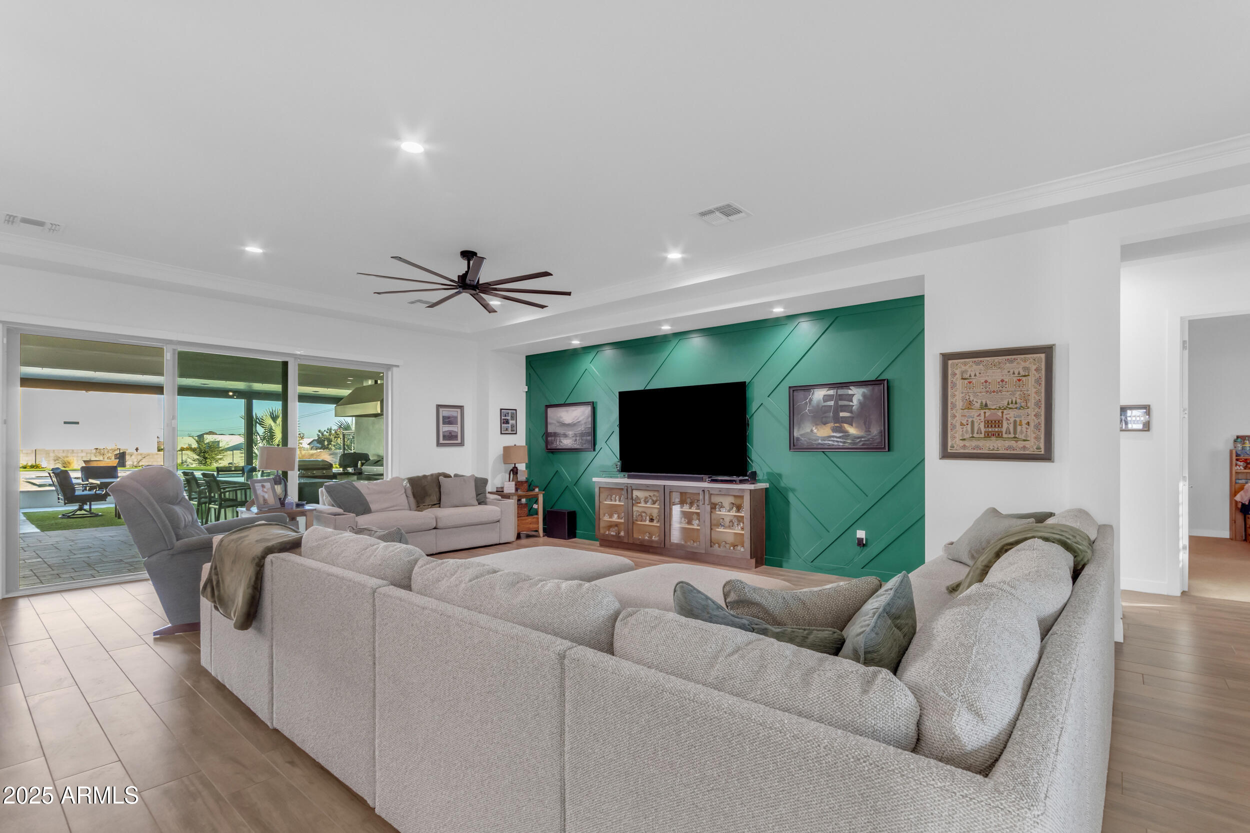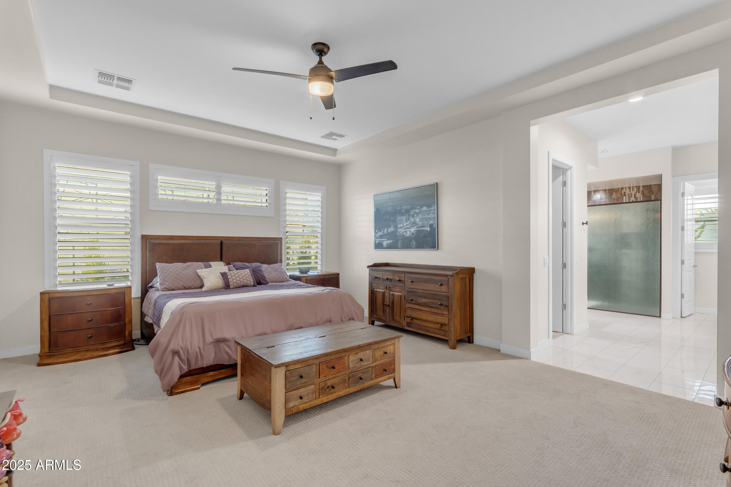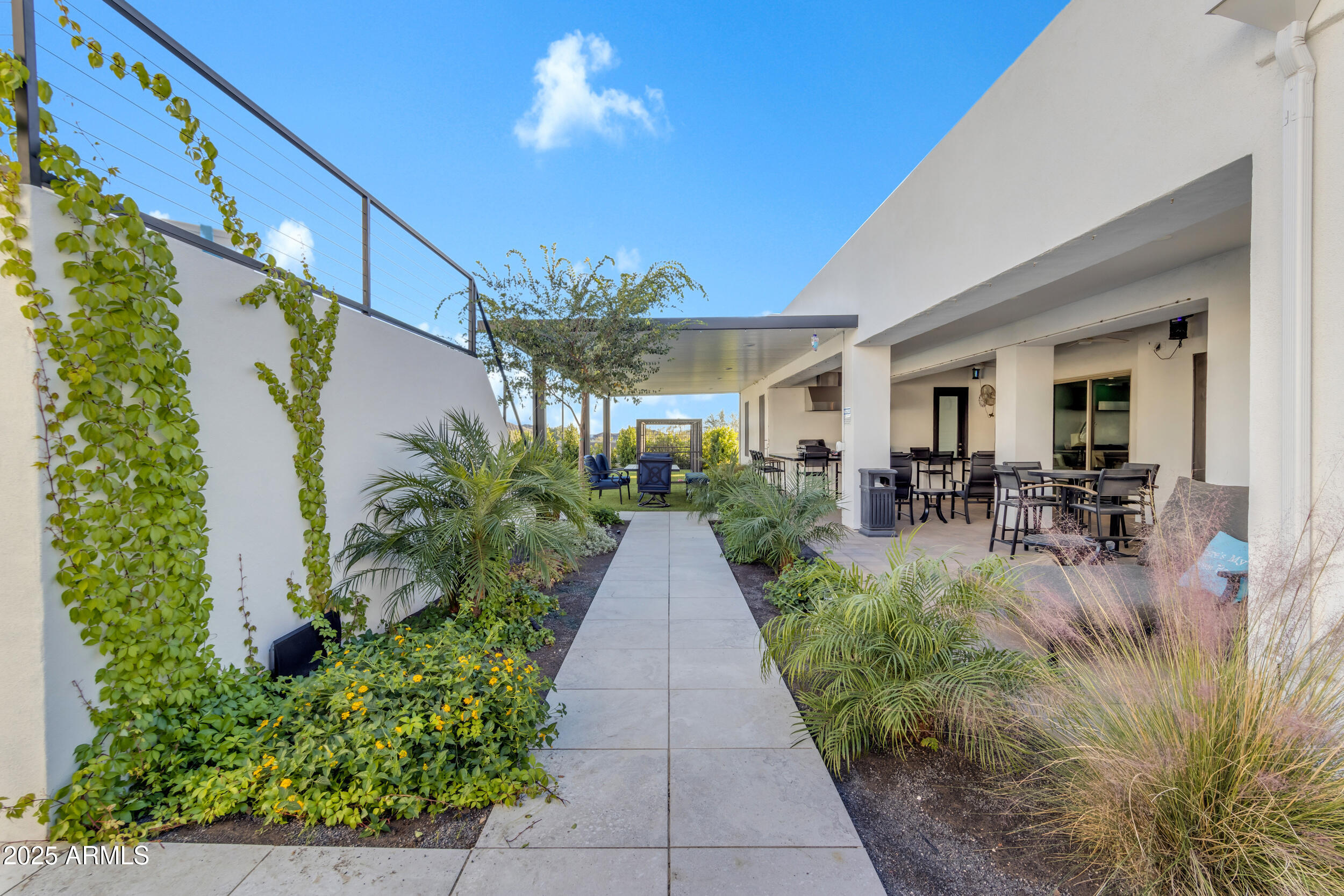 Step outside to your private resort. The expansive covered patio leads to an entertainer's dream backyard. The extra large pool features a sunken swim-up bar with jets, in-pool benches and stools, a slide, a built-in big screen TV, a grotto with jump-off area, waterfalls, and gorgeous tile. Forty pool solar panels help with heating. There is a misting system with mist fans that create a cool oasis under the patio and even at the pool tile line. Lounge in the sun or relax under one of the two extended patios, both offering plenty of shade. For a comprehensive list of backyard and pool upgrades, please refer to the documents section.