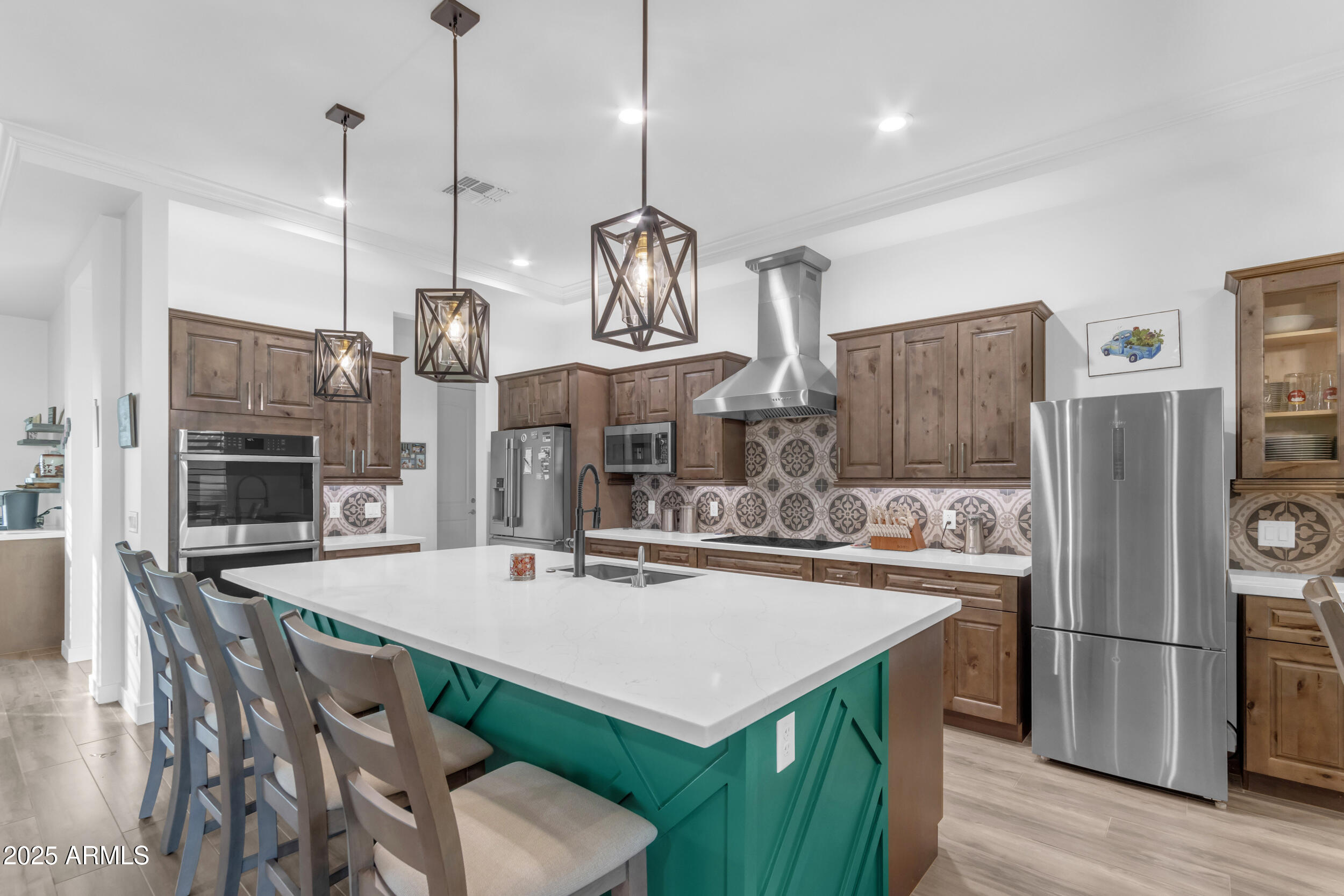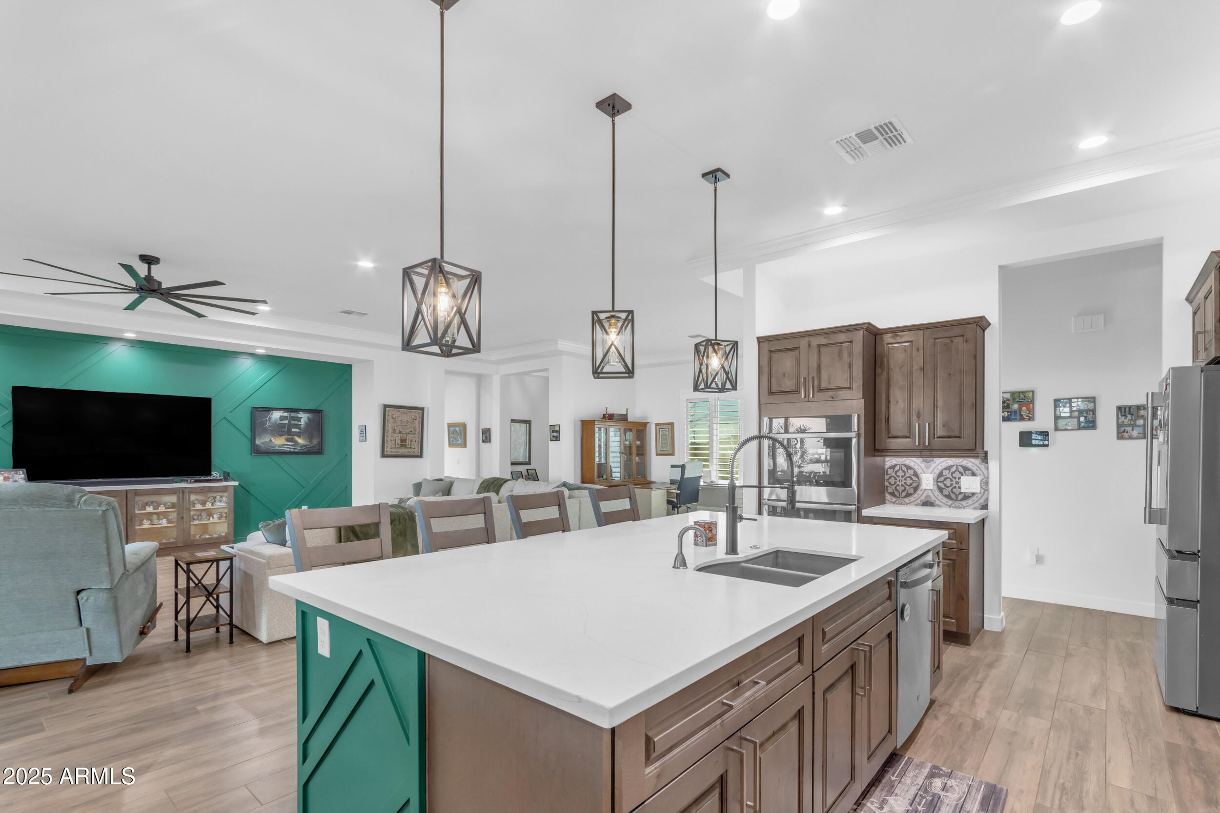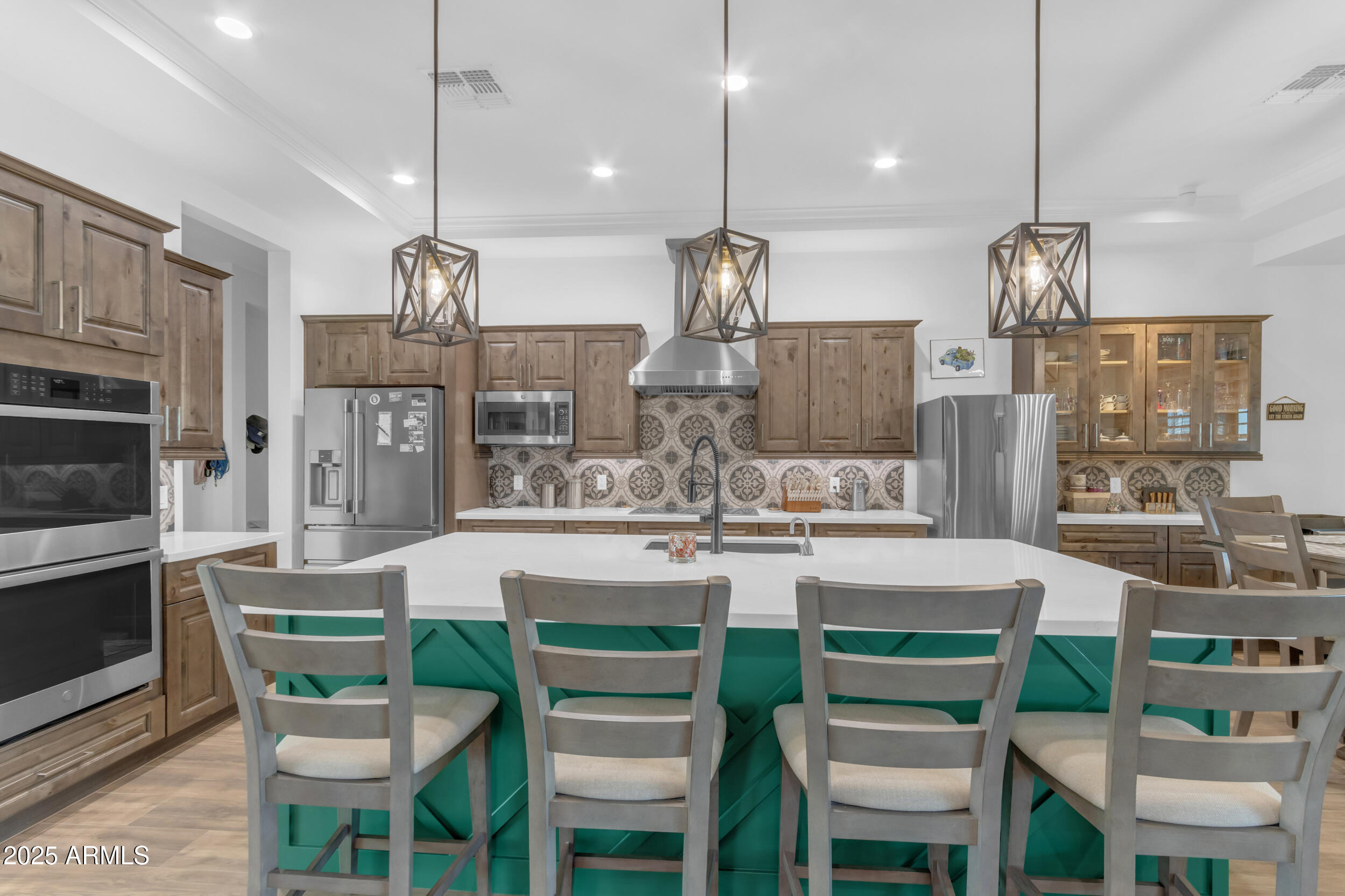 The chef's kitchen is the heart of the home, featuring a massive two-tone island with custom cabinetry and quartz counters, double wall ovens, stainless appliances, a gourmet hood fan, and decorative lighting. An abundance of cabinets, a built-in serving buffet, and a walk-in pantry make this space as practical as it is beautiful. Crown molding on the upgraded cabinets adds a touch of elegance.
