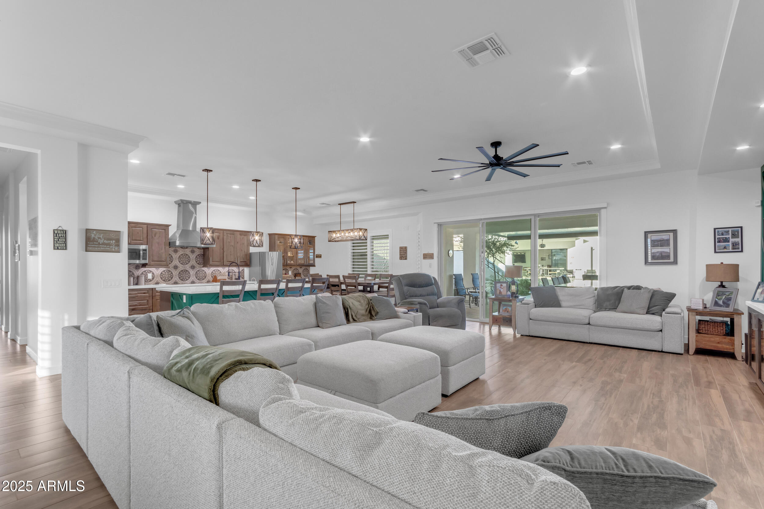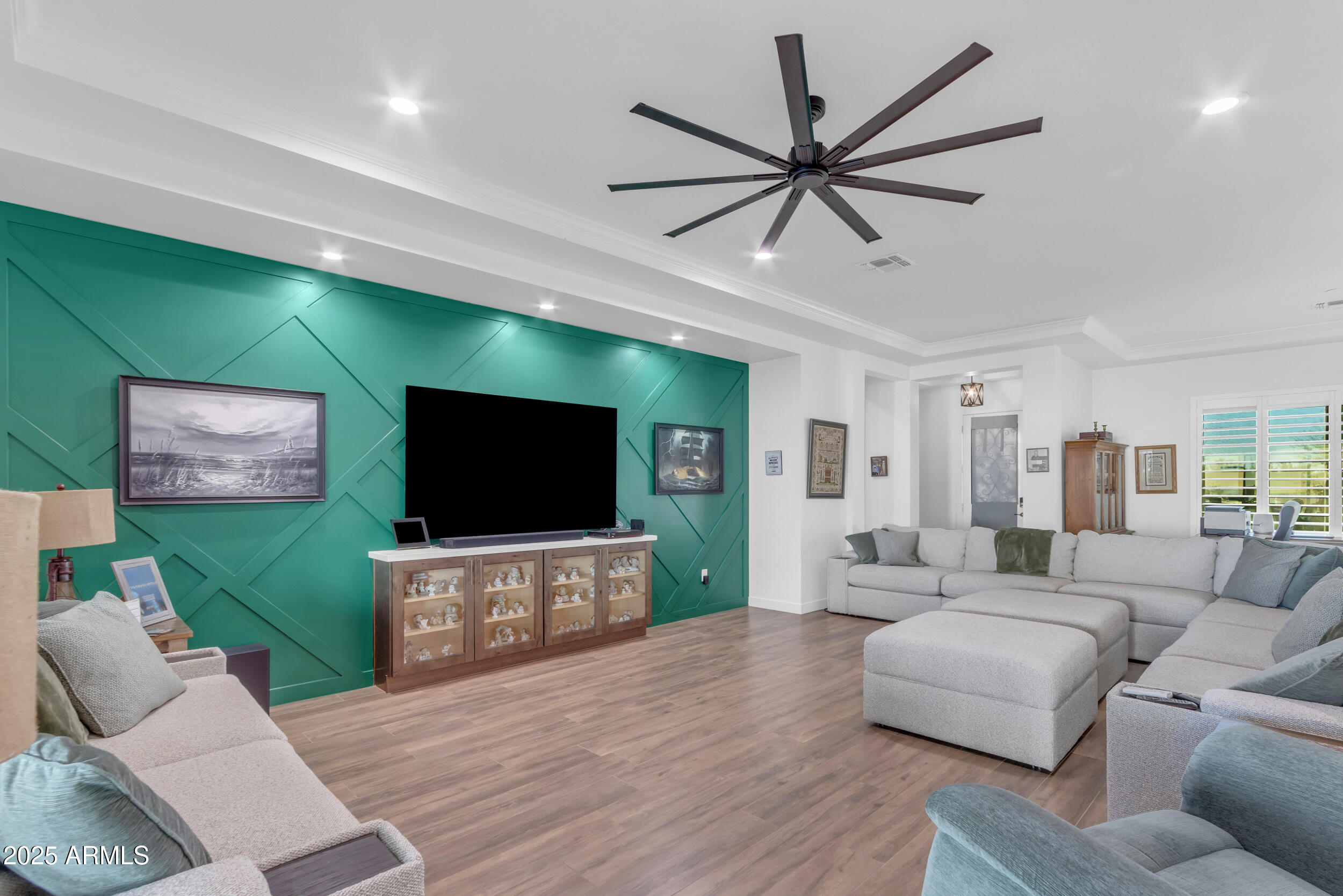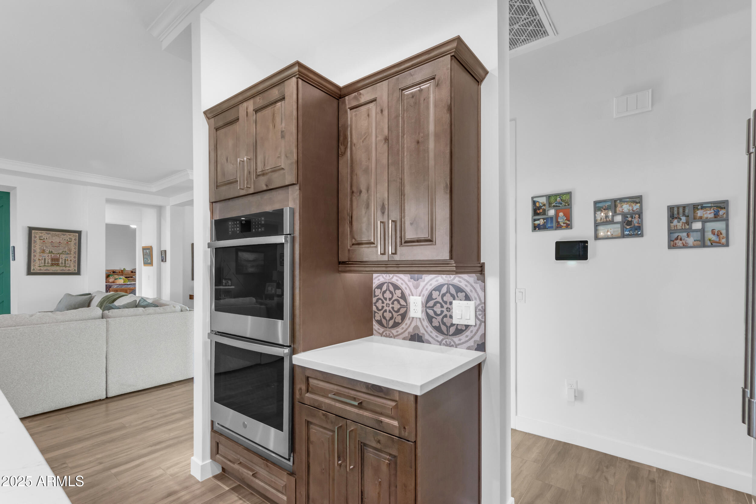 The chef's kitchen is the heart of the home, featuring a massive two-tone island with custom cabinetry and quartz counters, double wall ovens, stainless appliances, a gourmet hood fan, and decorative lighting. An abundance of cabinets, a built-in serving buffet, and a walk-in pantry make this space as practical as it is beautiful. Crown molding on the upgraded cabinets adds a touch of elegance.