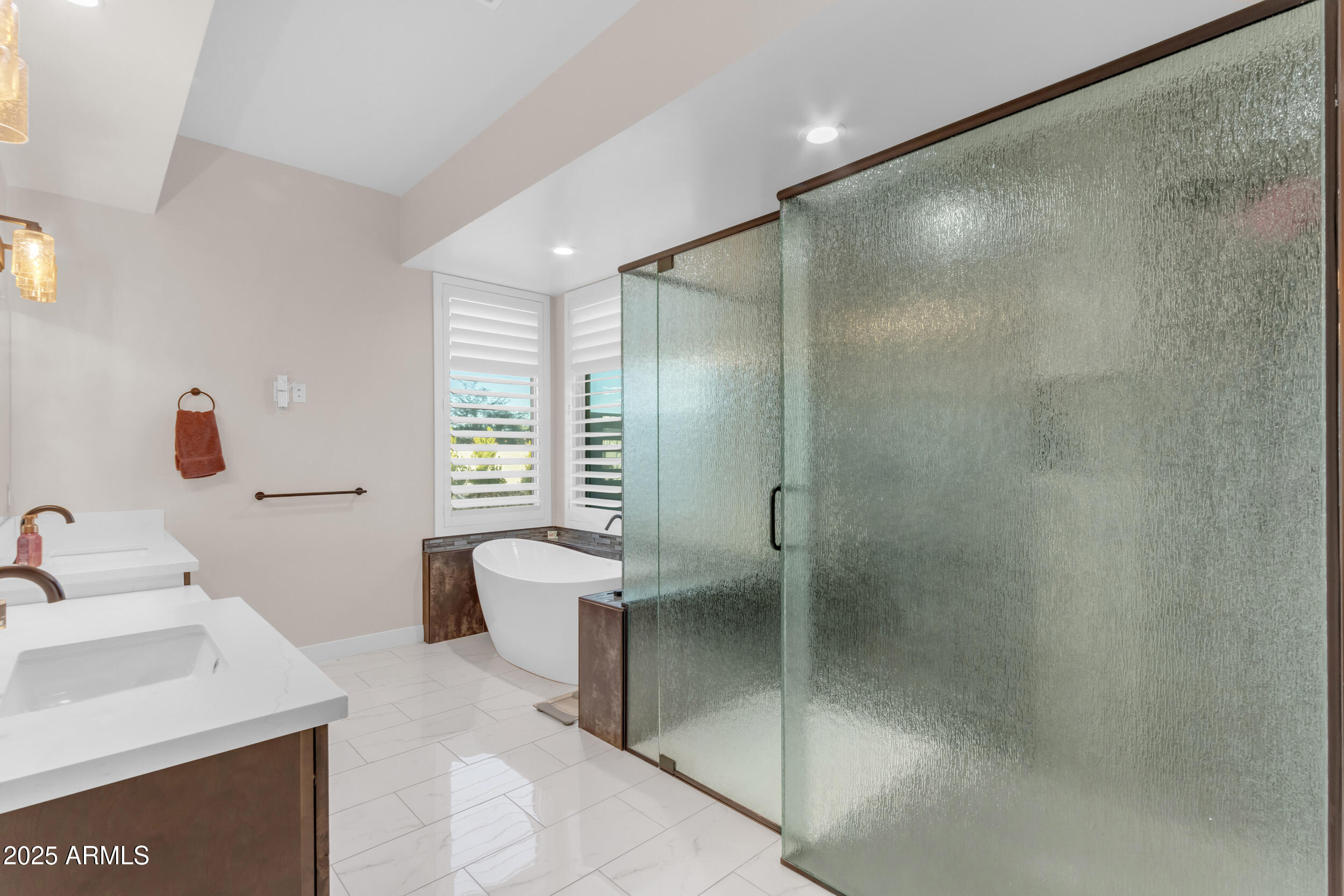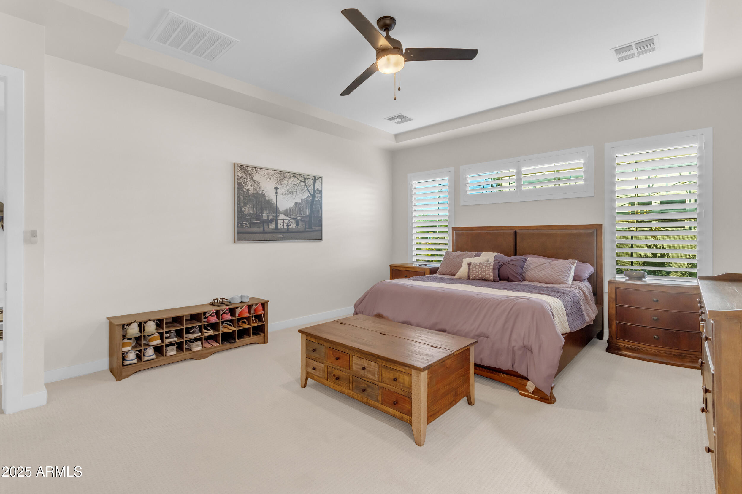Retreat to the oversized owner's suite with tray ceilings and a private exit to the back patio. The en-suite bathroom impresses with an extra wide square doorway, double sinks at gentleman's height, a deep, standalone soaking tub, an extra large walk-in shower with glass surround, and generous closet space including a second double-door closet and linen storage.