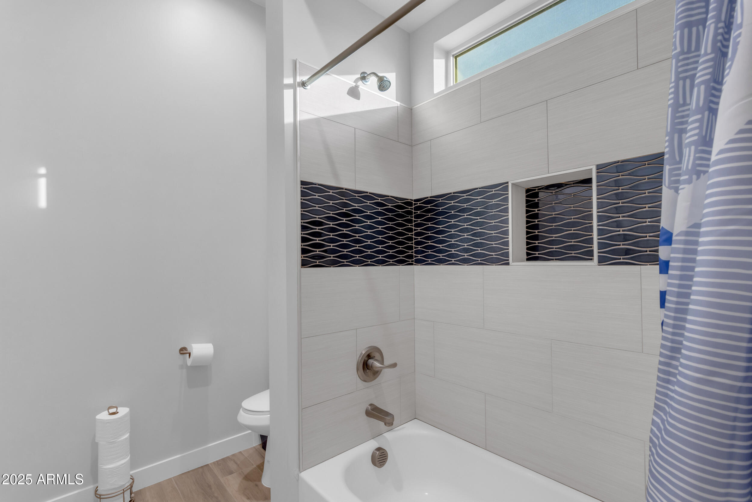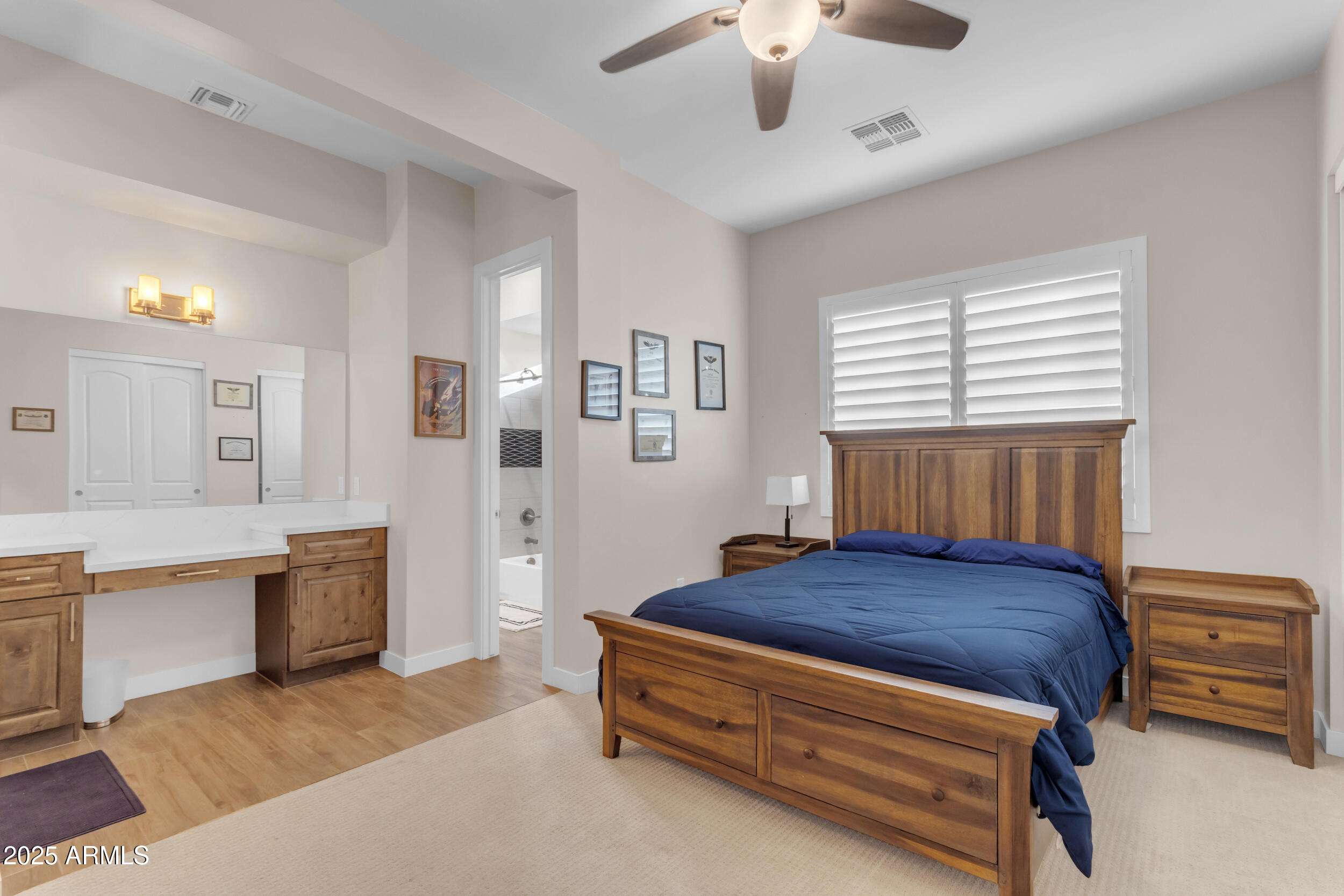 The secondary bedrooms are spacious and well designed. Bedroom four is close to the hall bath with quartz counters and a separate tub area. Bedrooms two and three share a Jack and Jill bath, each with private vanities. All bathrooms feature decorative tile surrounds, classic backsplashes, and large square under-mount sinks.