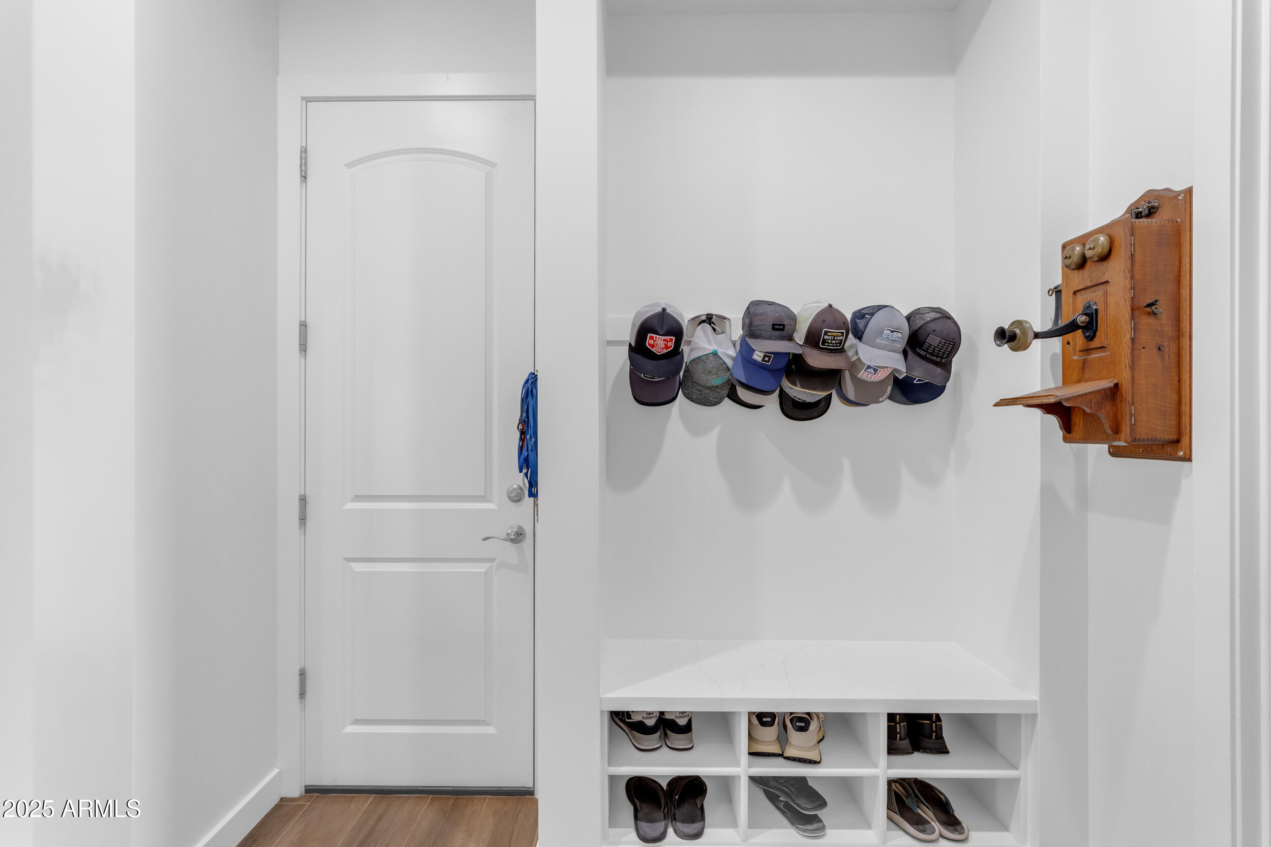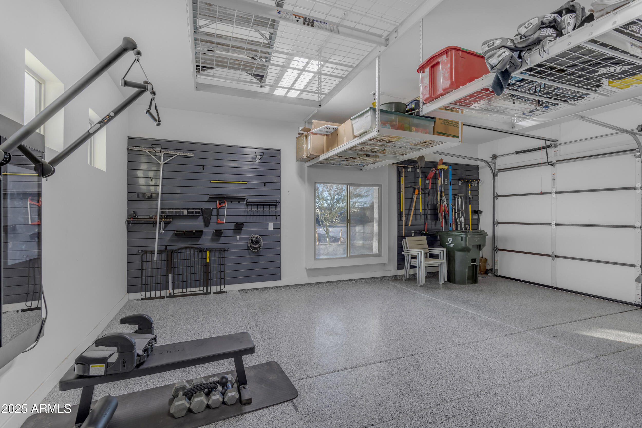 The laundry room is extra large and offers direct outdoor access. Enjoy tons of cabinetry, a folding counter with sink, a hanging bar, and ample storage space. The three-car garage is a showstopper with epoxy floors, built-in cabinets, tool walls and storage racks.