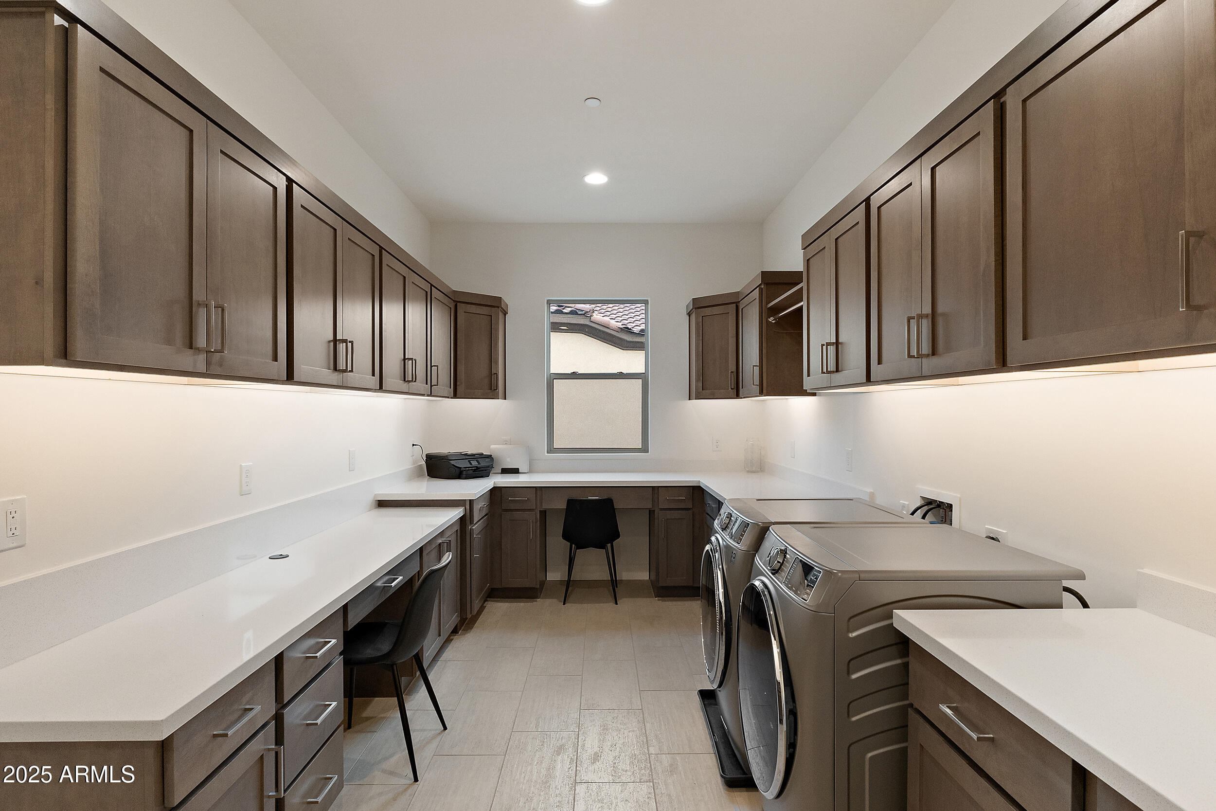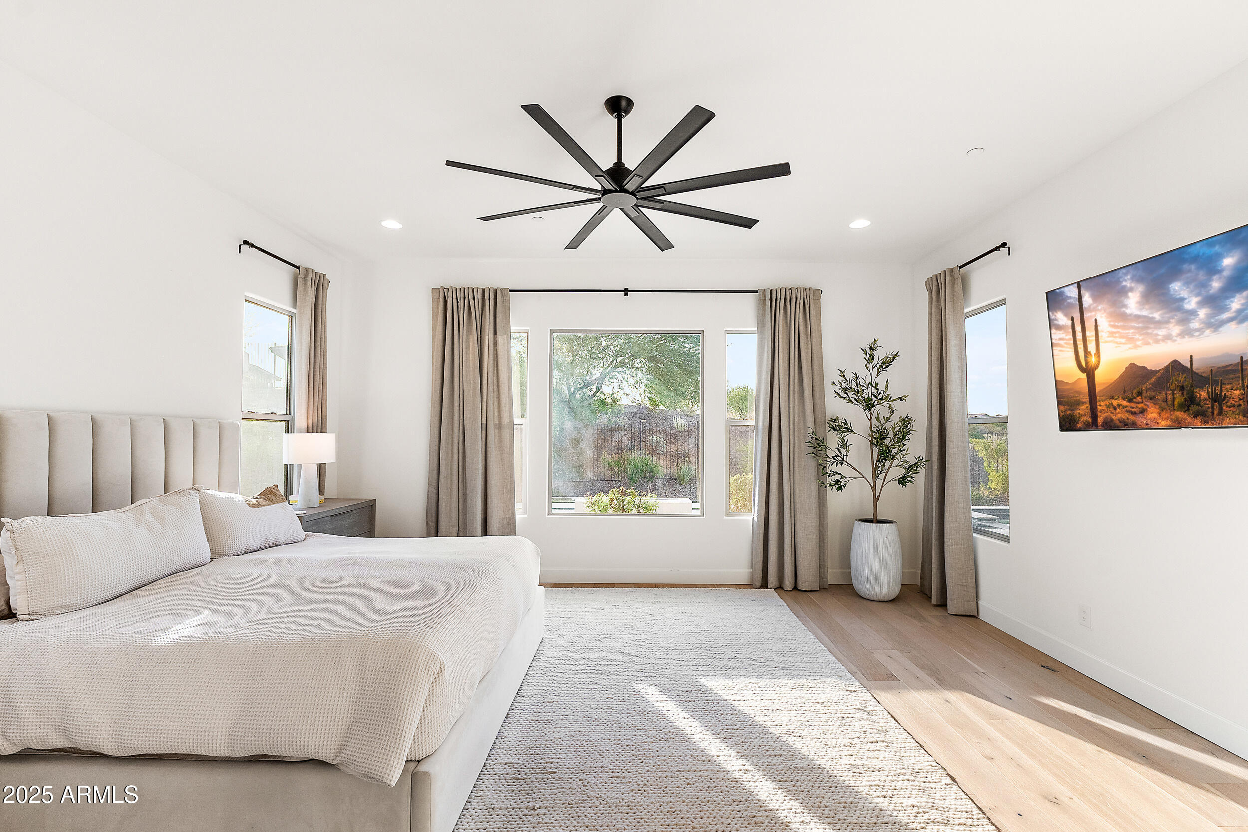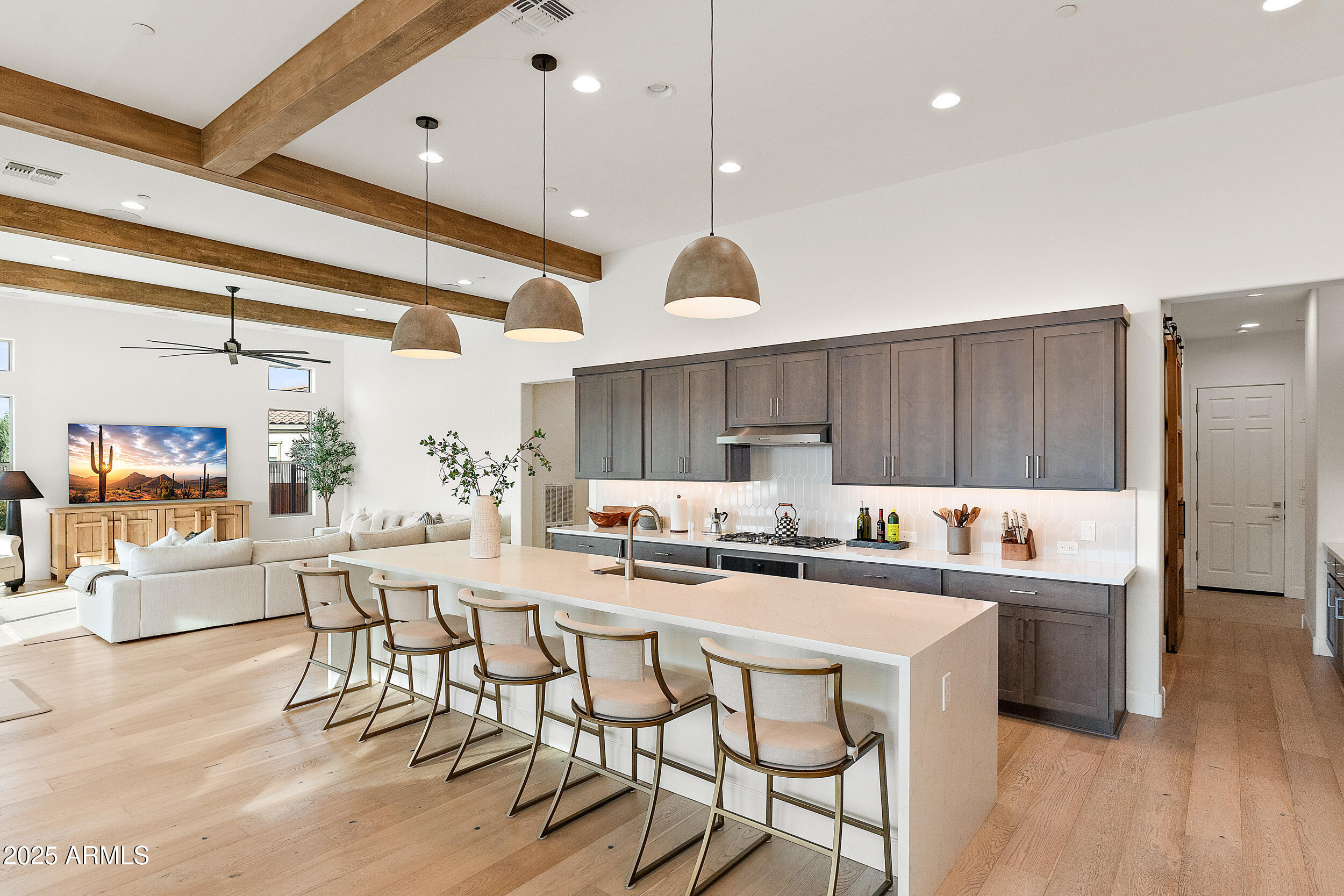 Experience luxury desert living in the exceptional Trilogy at Verde River community! Skip the wait for new construction -- this professionally designed, fully customized home is brimming w/ high-end upgrades & lives like brand new. Perfectly positioned on a premium lot showcasing stunning desert scenery & breathtaking views. Every detail has been thoughtfully curated - warm neutral palette, elegant hardwood flooring, designer lighting fixtures & soaring ceilings enhanced by customized beams. Open-concept kitchen, living & dining boasts expansive layout & 20ft multi-panel sliding door, creating a seamless indoor-outdoor transition to resort-style backyard. Chef's kitchen showcases Modern Mocha lighted cabinetry, stainless-steel GE Profile appliances, XL quartz waterfall island w/ seating, walk-in pantry w/ wood barn door & whole-home water filtration & purification system. Primary w/ 5-pc bath & upgraded walk-in closet w/ built-in storage + 2 additional en-suite bedrooms. Step outside to your personal oasis featuring Pebble Sheen pool & spa, artificial turf w/ putting green, fire pit, built-in BBQ & smoker & custom stone pavers perfect for entertaining or relaxing in style. Extended 3-car garage offers an EV charging outlet, ceiling storage racks & epoxy floors. Enjoy community amenities including the Tom Lehman-designed golf course, tennis & pickleball courts, poolside bar & grill + & stunning resort pool w/ panoramic views of Weaver's Needle. Club offers fine & casual dining, exclusive Afturburn fitness center, Alvea Spa + more. The perfect blend of comfort, style, & functionality inside & out!