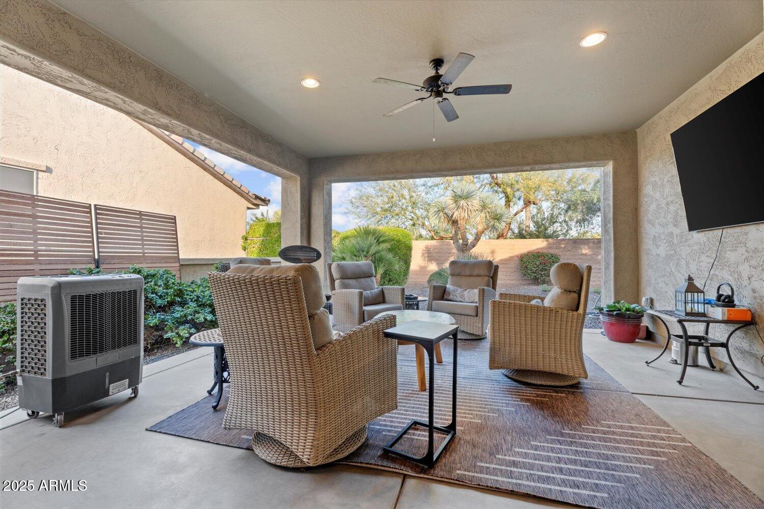 This stunning Sidus model offers 2 bedrooms, den & 2 baths. Step inside to a light & bright great room. Multi-slide glass doors to the patio offer open concept living to enjoy the outdoors. Kitchen is an entertainers delight featuring Quartz countertops, updated sink/faucet, staggered cherry cabinets w/ rollouts, under cabinet lighting, stainless steel appliances & French-door refrigerator. Pantry & additional cabinetry in the vestal laundry room complete with 2 craft/work stations. Notice the 24'' tile flooring throughout the living area, newer carpet in the bedrooms & central vac system. Spacious primary suite overlooks the private backyard w/ no neighbor behind. Garage has 2-ft extension. Updates include HVAC in 2021 & water heater in 2019. Pre-paid solar lease reduces energy costs. You'll love everything Trilogy at Vistancia has to offer! Live the resort lifestyle in this gated active-adult community. Amenities include: 35,000 SF Kiva Club with indoor & outdoor pools, fitness center, day spa, cafe, billiards, meeting rooms, library, tennis courts, pickle ball, bocce ball, events & a plethora of activities to choose from. Outstanding Gary Panks-designed golf course is woven throughout the neighborhood. The Mita Club has additional community amenities. Easy access from Trilogy to the 303, shopping, restaurants, entertainment, Paloma Park & Lake Pleasant.