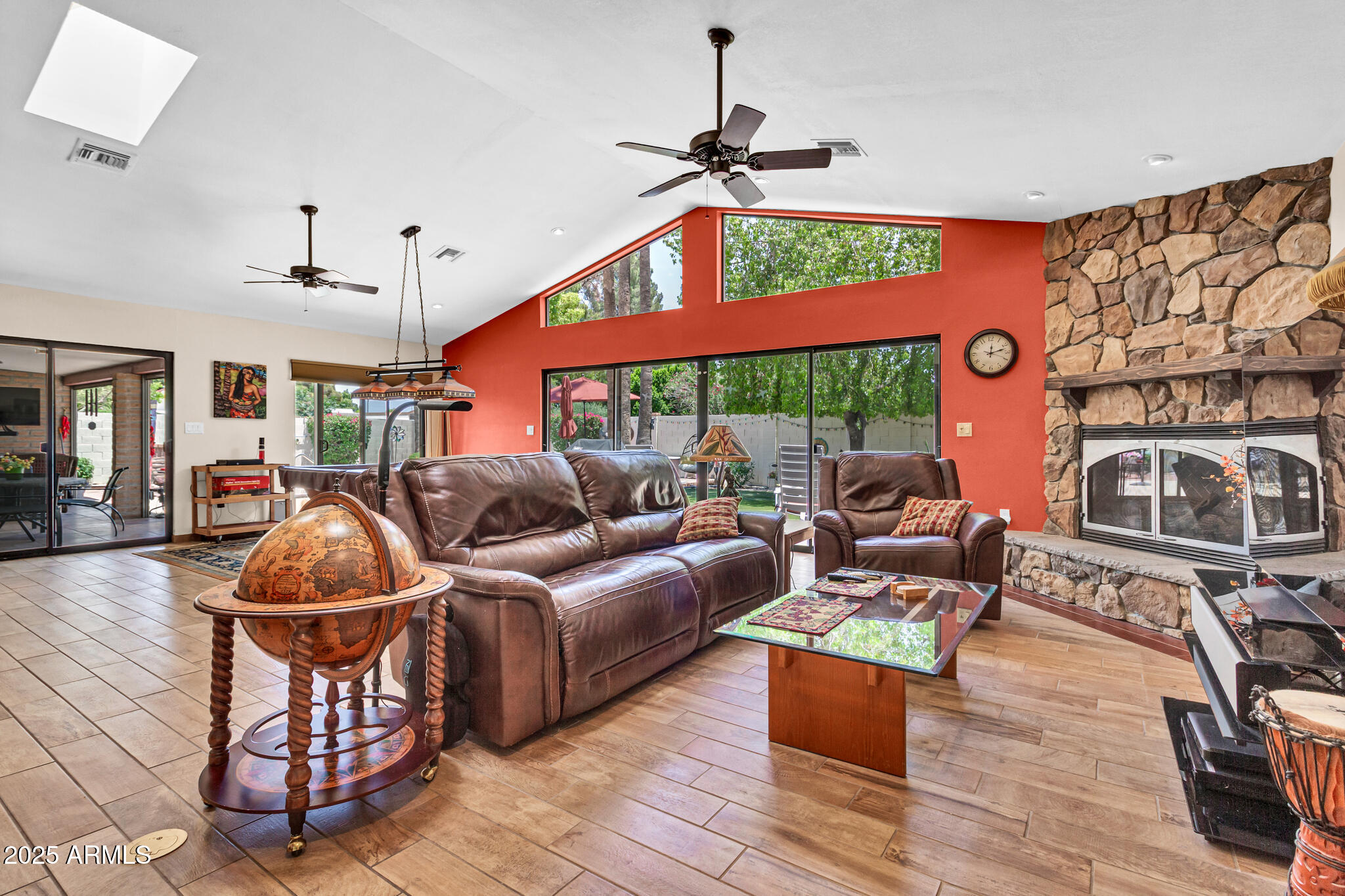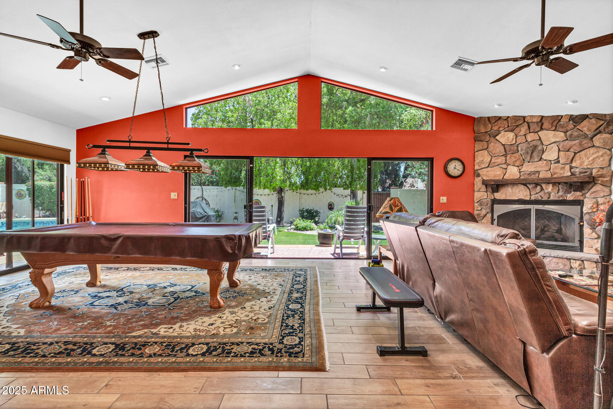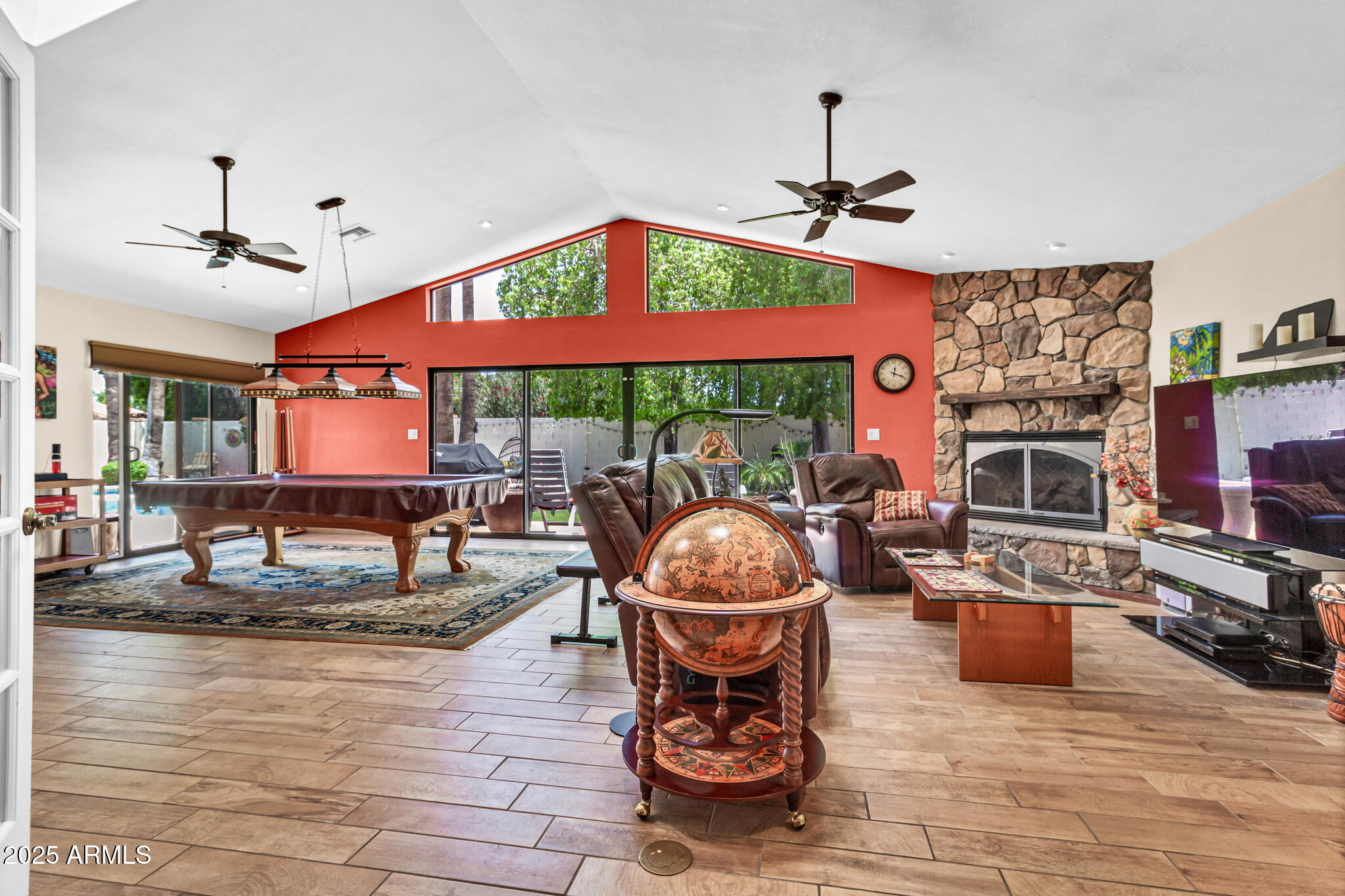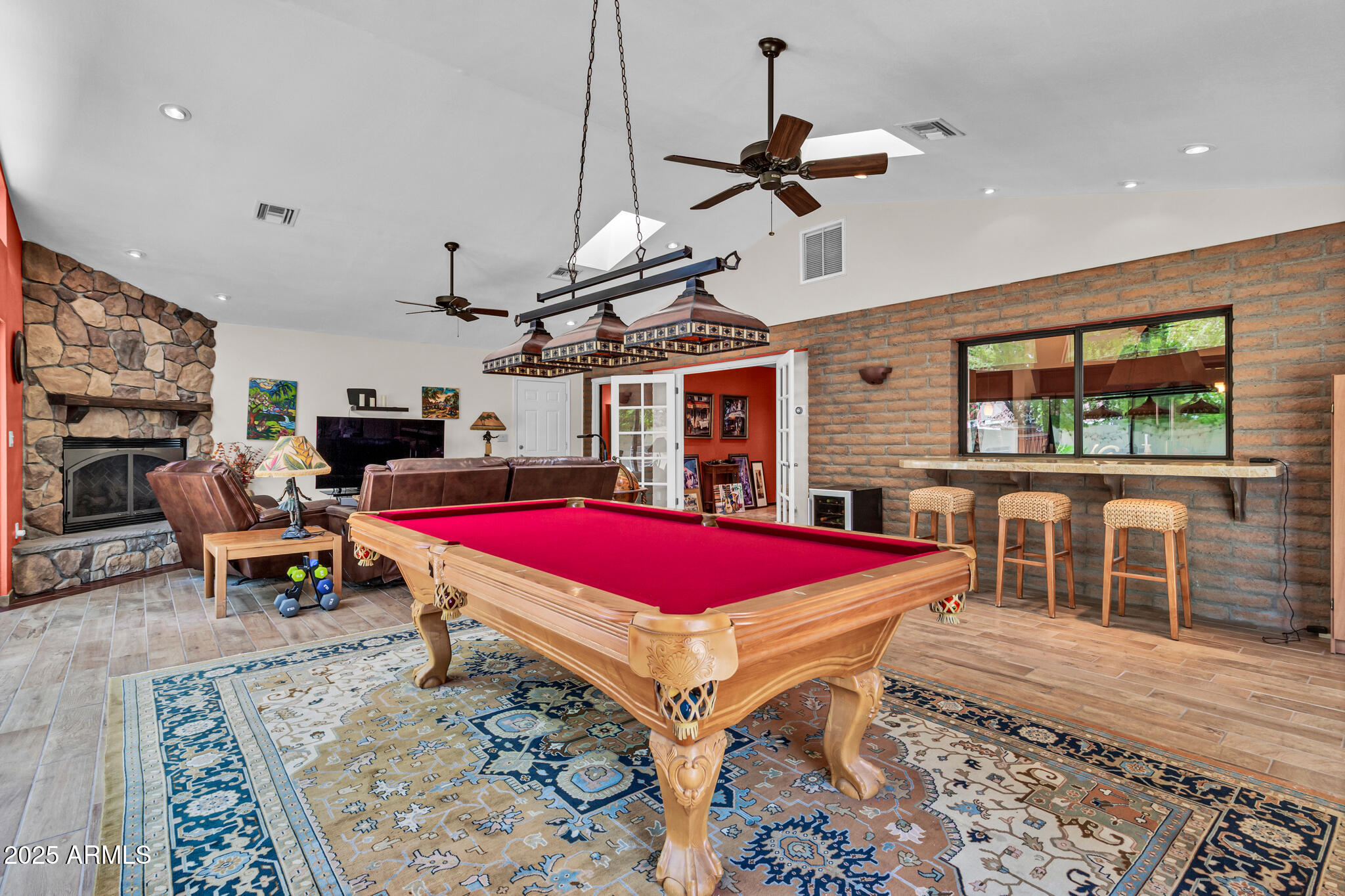Inside, the home offers approximately 3,400 square feet of versatile living space. One of the standout features is the vaulted 20x30 entertainment space, perfect as a recreation or game room. With its east-facing high glass windows, propane fireplace, and peaceful views of the backyard, it's an ideal spot for entertaining or relaxing with a game of pool. Just off this space, French doors lead from the kitchen dining area, blending indoor and outdoor living seamlessly. The main living areas feature vaulted ceilings, warm finishes, and a double-sided fireplace connecting the cozy living room and spacious family room. You'll also find a wet bar with an ice maker, perfect for hosting friends and family. The kitchen boasts granite countertops, refinished cabinetry, a breakfast bar, and open sightlines that invite conversation and comfort.
