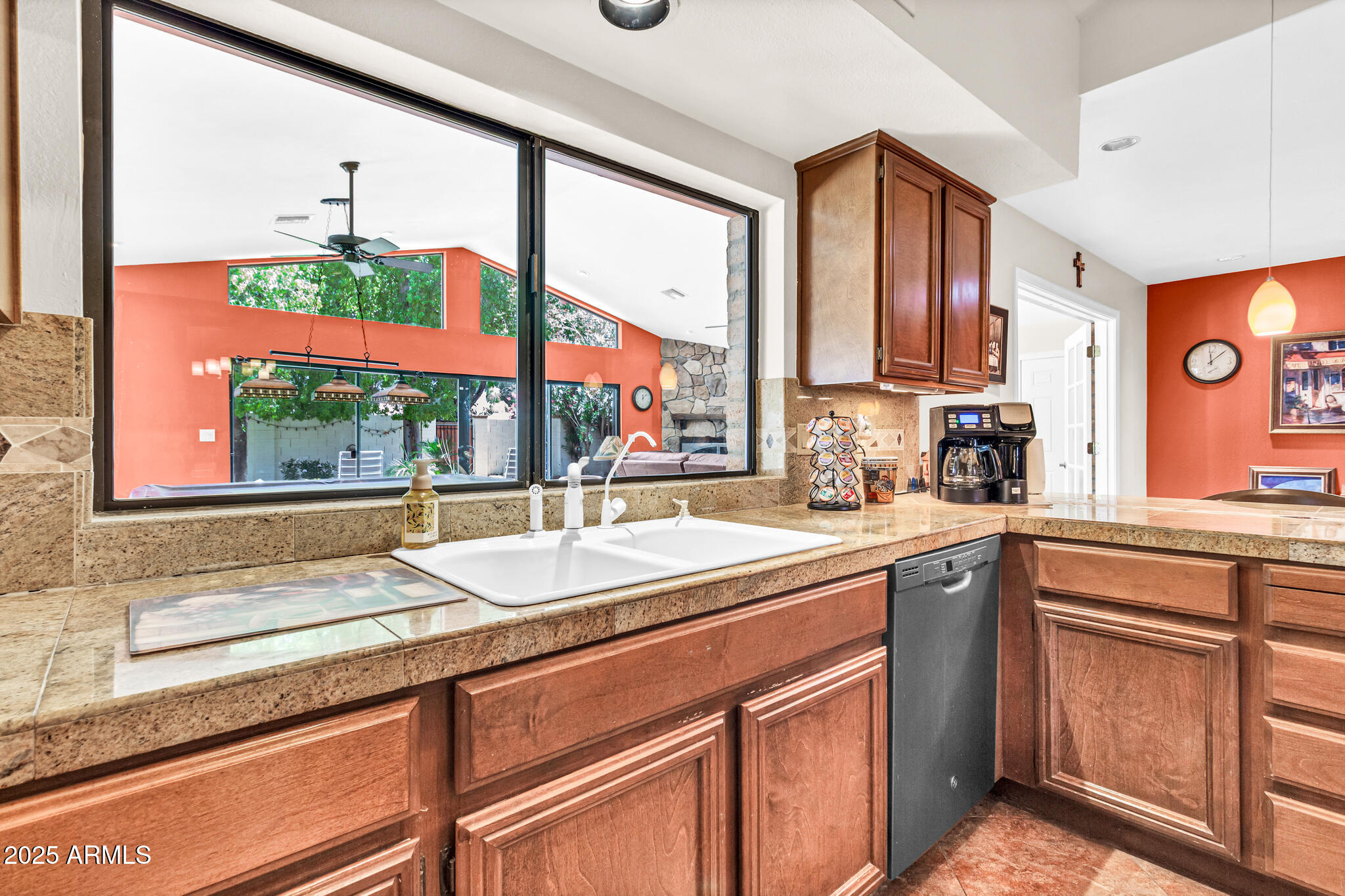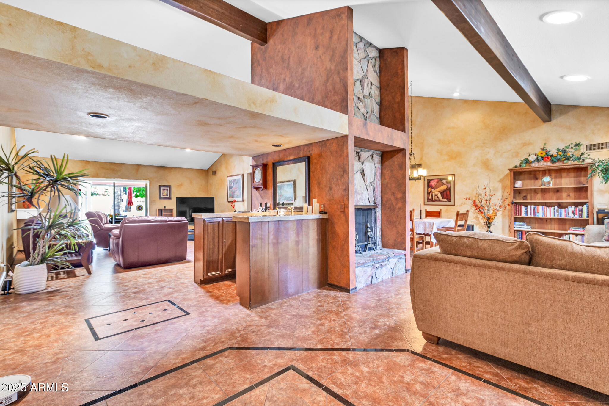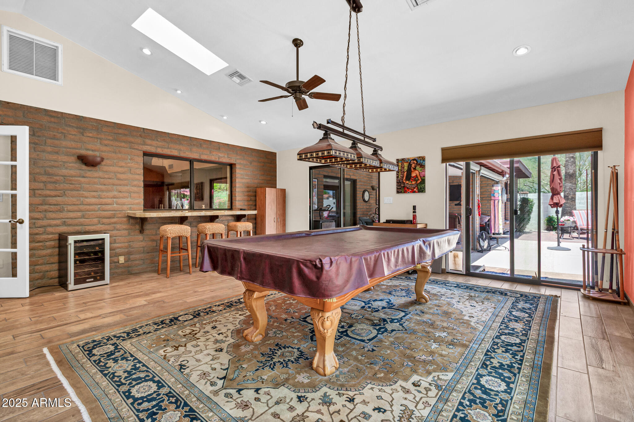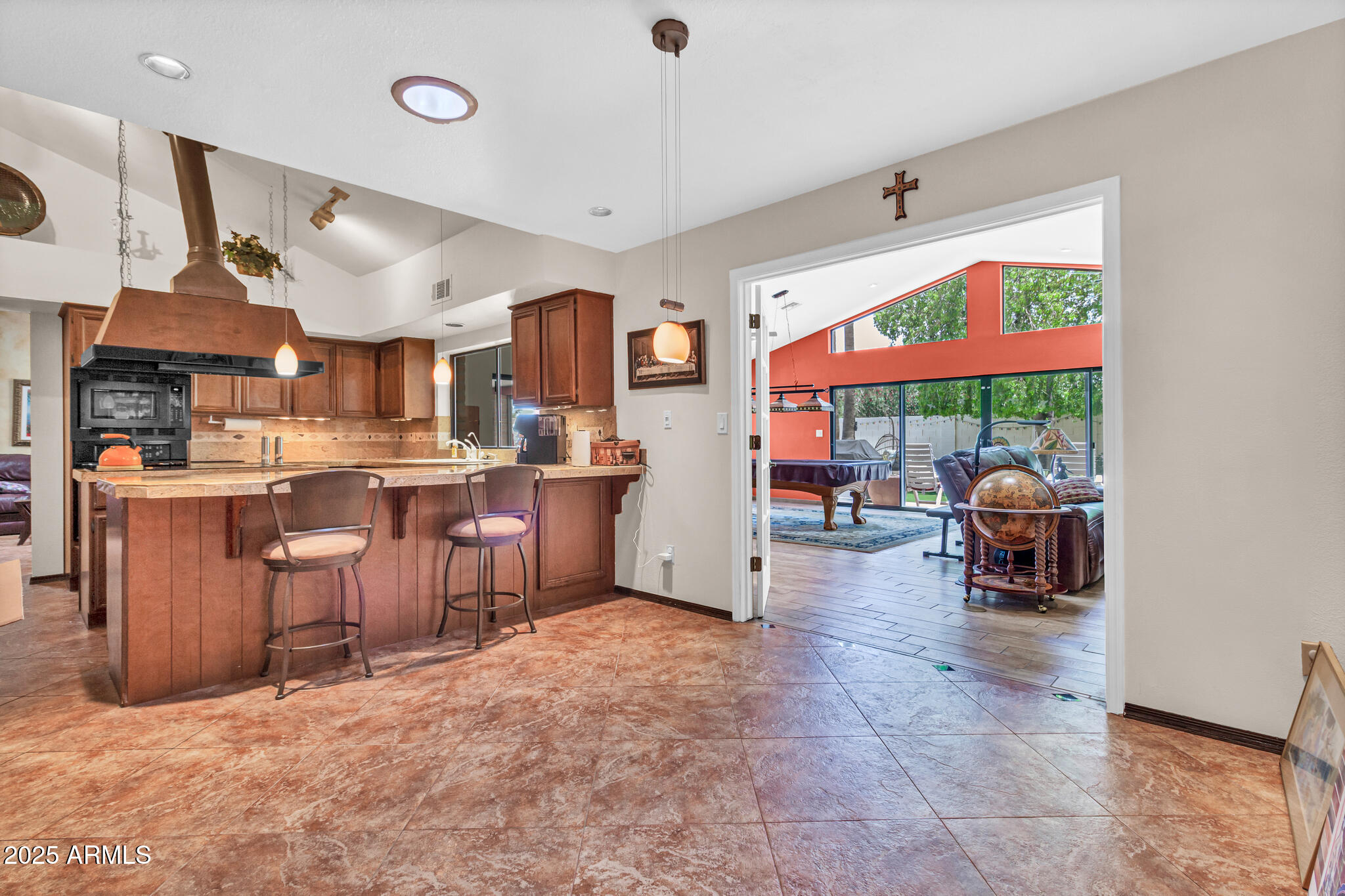 Inside, the home offers approximately 3,400 square feet of versatile living space. One of the standout features is the vaulted 20x30 entertainment space, perfect as a recreation or game room. With its east-facing high glass windows, propane fireplace, and peaceful views of the backyard, it's an ideal spot for entertaining or relaxing with a game of pool. Just off this space, French doors lead from the kitchen dining area, blending indoor and outdoor living seamlessly. The main living areas feature vaulted ceilings, warm finishes, and a double-sided fireplace connecting the cozy living room and spacious family room. You'll also find a wet bar with an ice maker, perfect for hosting friends and family. The kitchen boasts granite countertops, refinished cabinetry, a breakfast bar, and open sightlines that invite conversation and comfort.