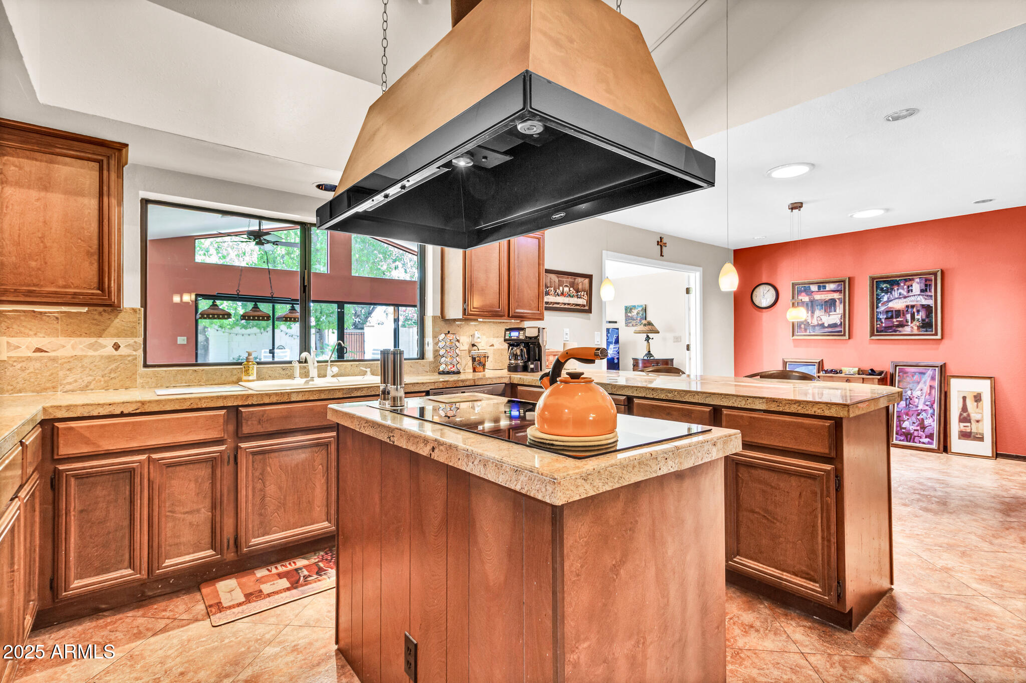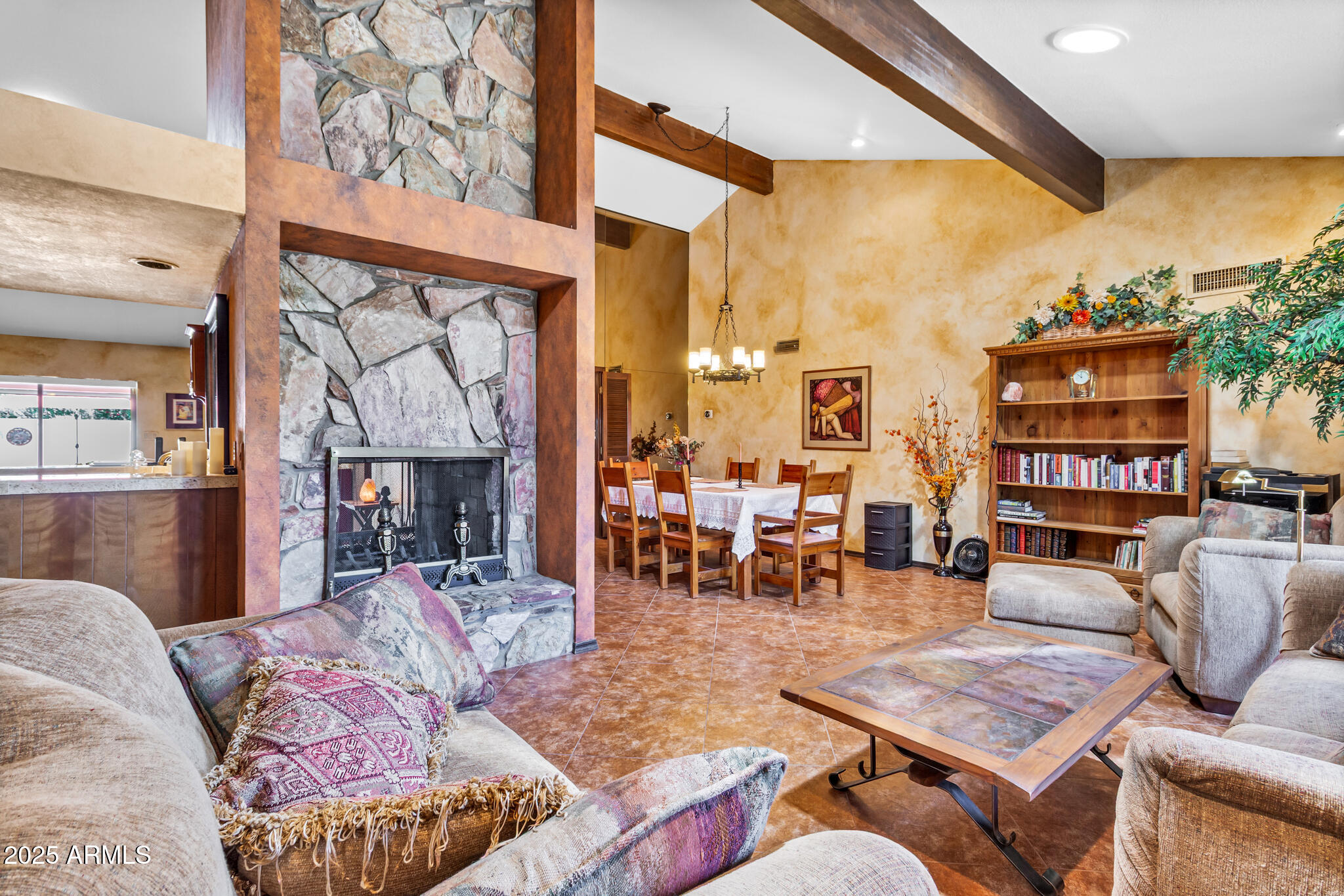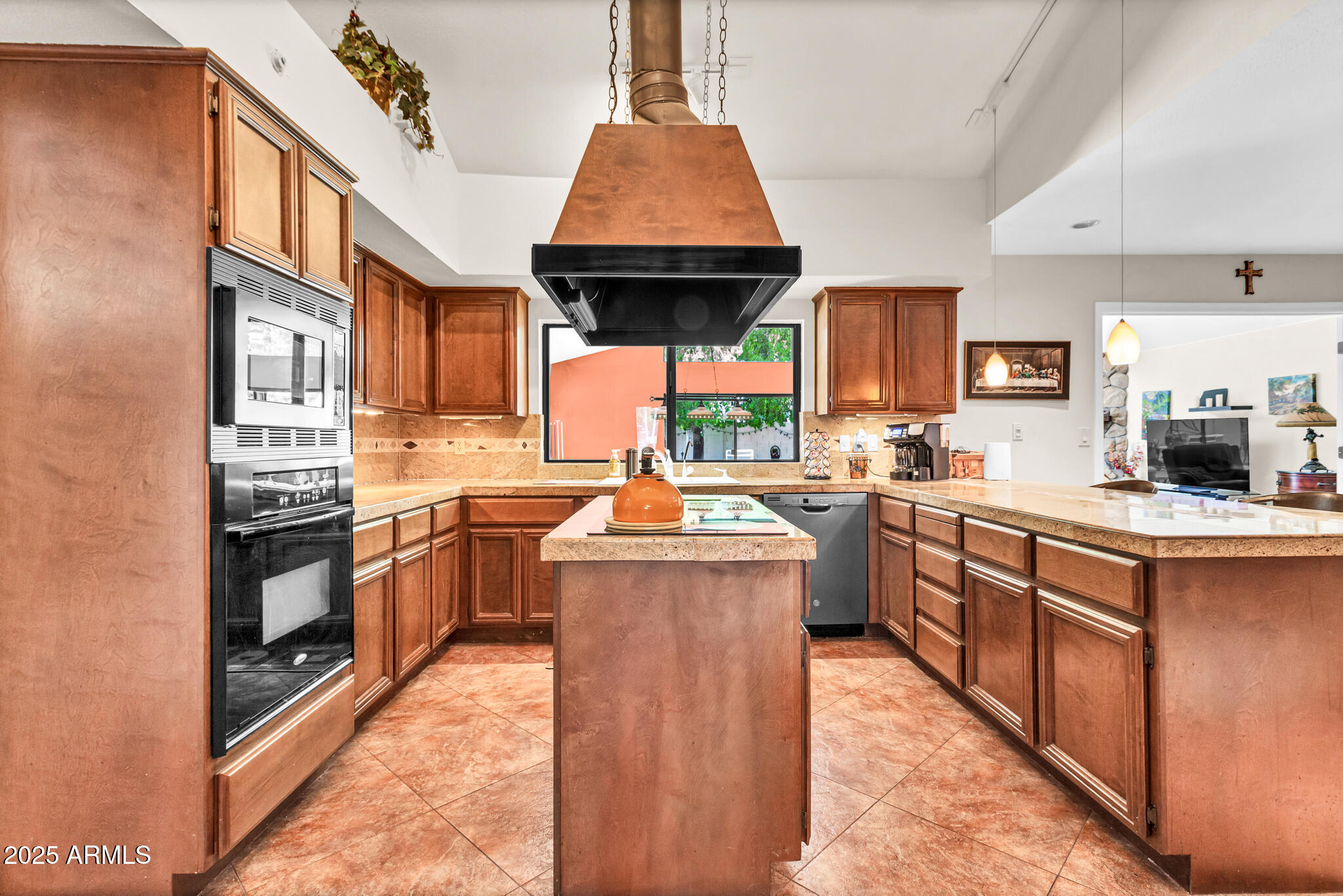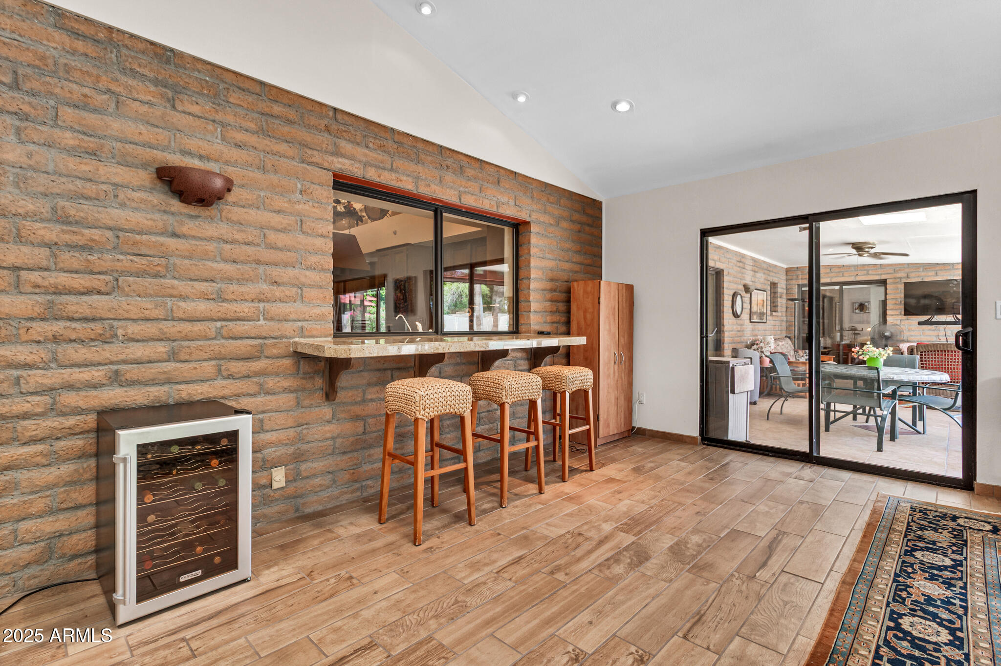 Inside, the home offers approximately 3,400 square feet of versatile living space. One of the standout features is the vaulted 20x30 entertainment space, perfect as a recreation or game room. With its east-facing high glass windows, propane fireplace, and peaceful views of the backyard, it's an ideal spot for entertaining or relaxing with a game of pool. Just off this space, French doors lead from the kitchen dining area, blending indoor and outdoor living seamlessly. The main living areas feature vaulted ceilings, warm finishes, and a double-sided fireplace connecting the cozy living room and spacious family room. You'll also find a wet bar with an ice maker, perfect for hosting friends and family. The kitchen boasts granite countertops, refinished cabinetry, a breakfast bar, and open sightlines that invite conversation and comfort.