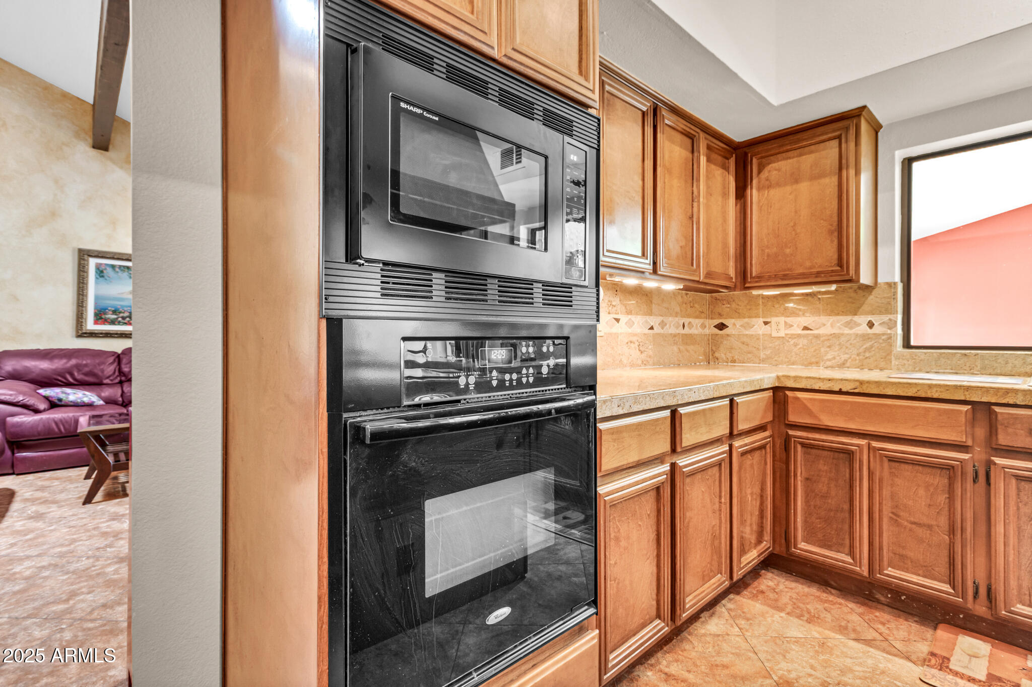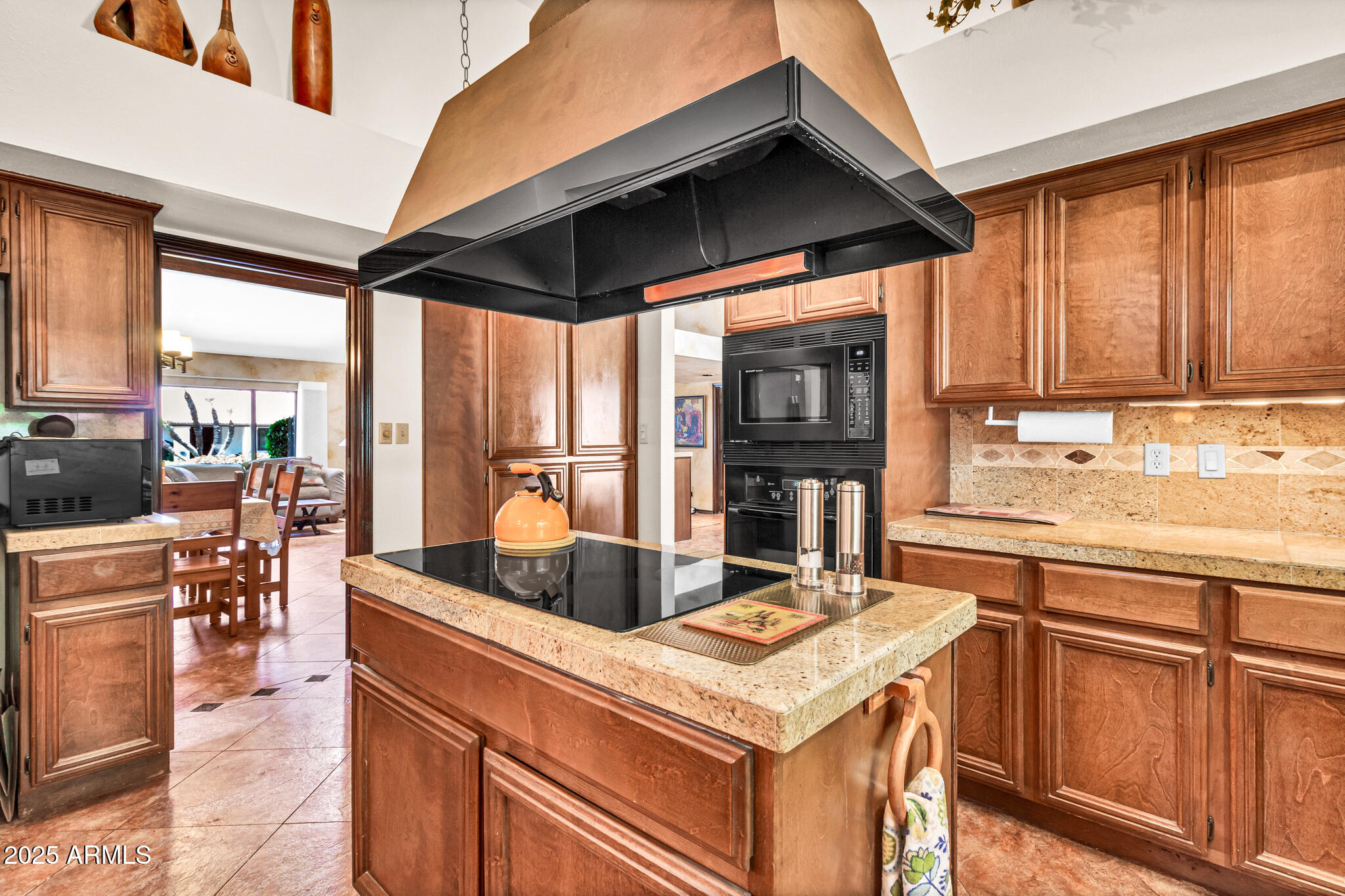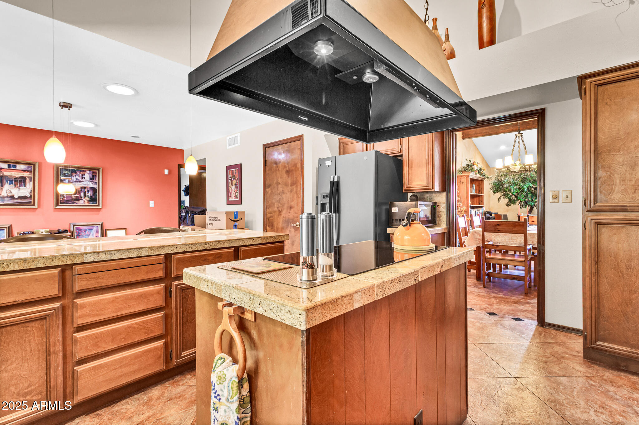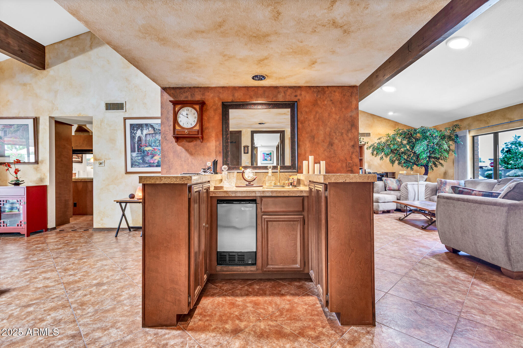 Inside, the home offers approximately 3,400 square feet of versatile living space. One of the standout features is the vaulted 20x30 entertainment space, perfect as a recreation or game room. With its east-facing high glass windows, propane fireplace, and peaceful views of the backyard, it's an ideal spot for entertaining or relaxing with a game of pool. Just off this space, French doors lead from the kitchen dining area, blending indoor and outdoor living seamlessly. The main living areas feature vaulted ceilings, warm finishes, and a double-sided fireplace connecting the cozy living room and spacious family room. You'll also find a wet bar with an ice maker, perfect for hosting friends and family. The kitchen boasts granite countertops, refinished cabinetry, a breakfast bar, and open sightlines that invite conversation and comfort.