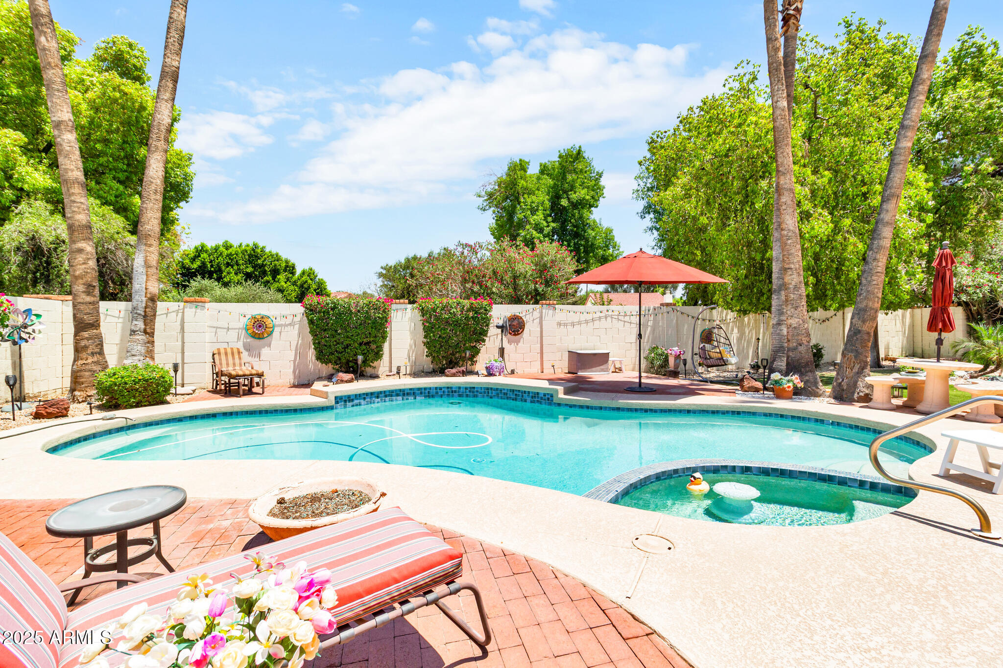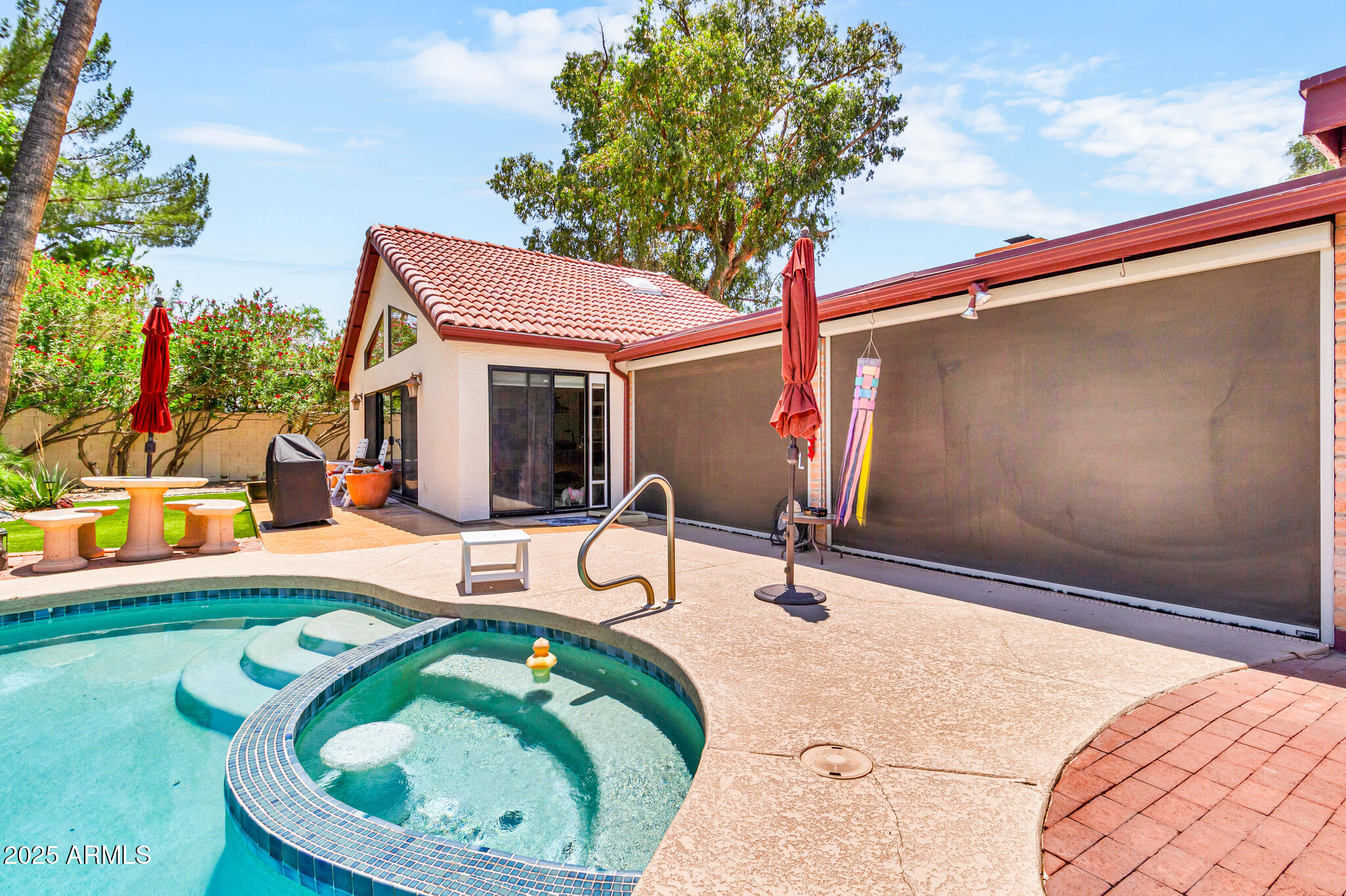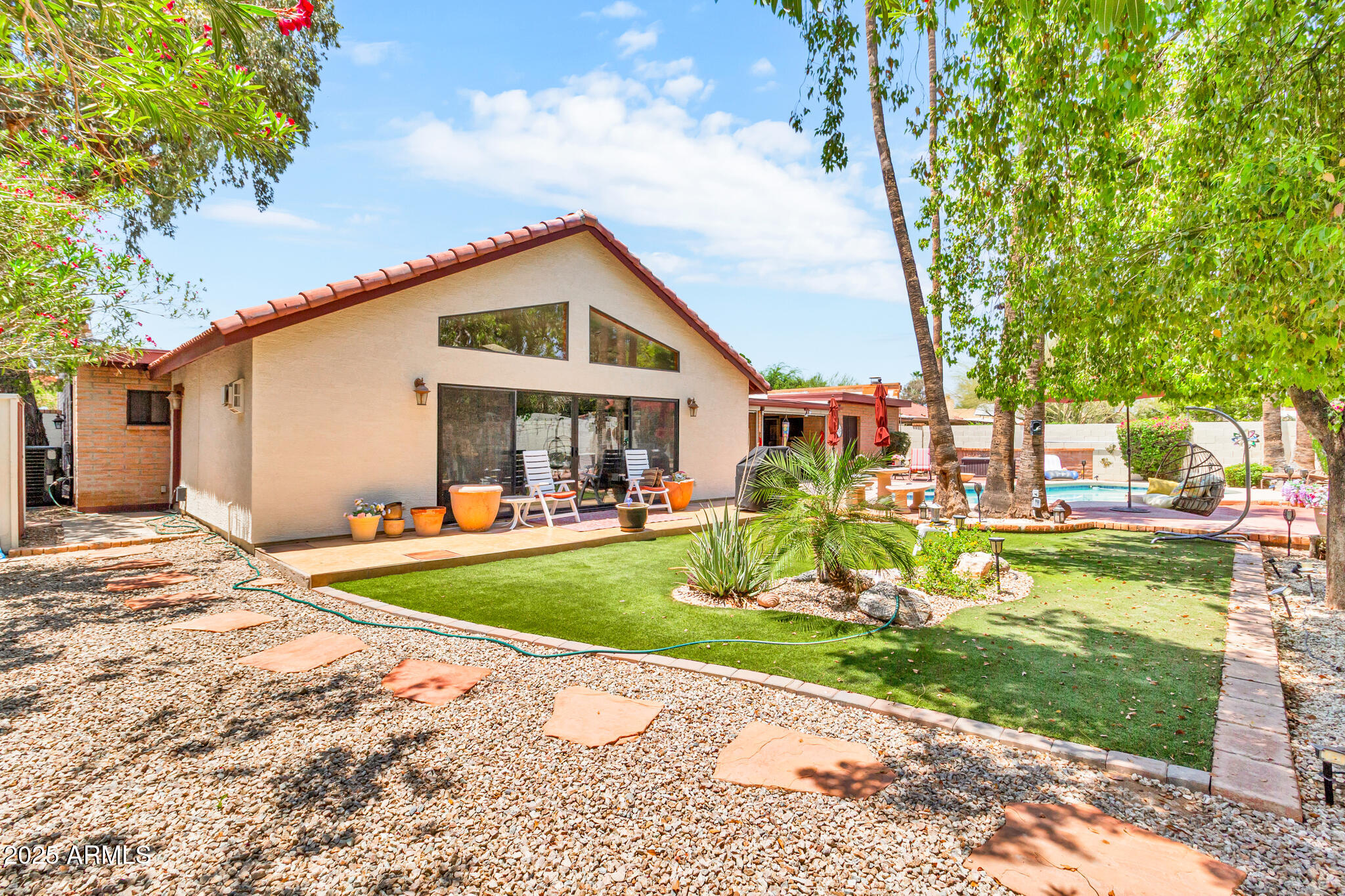 Out back, enjoy a tranquil private retreat with a sparkling pool and spa, surrounded by low-maintenance synthetic turf and mature landscaping. Whether sipping your morning coffee or unwinding at sunset, the backyard is a true extension of the home's charm.