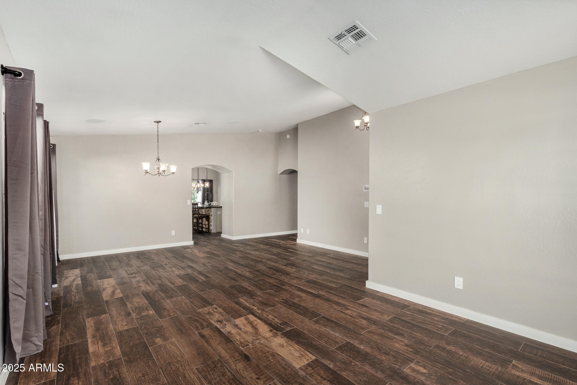 Inside, soaring cathedral ceilings and abundant natural light highlight the home's open-concept design. The stylishly upgraded kitchen boasts granite countertops, stainless steel appliances, and sleek modern finishes. Throughout the home, wood-look ceramic tile flooring adds warmth and sophistication.