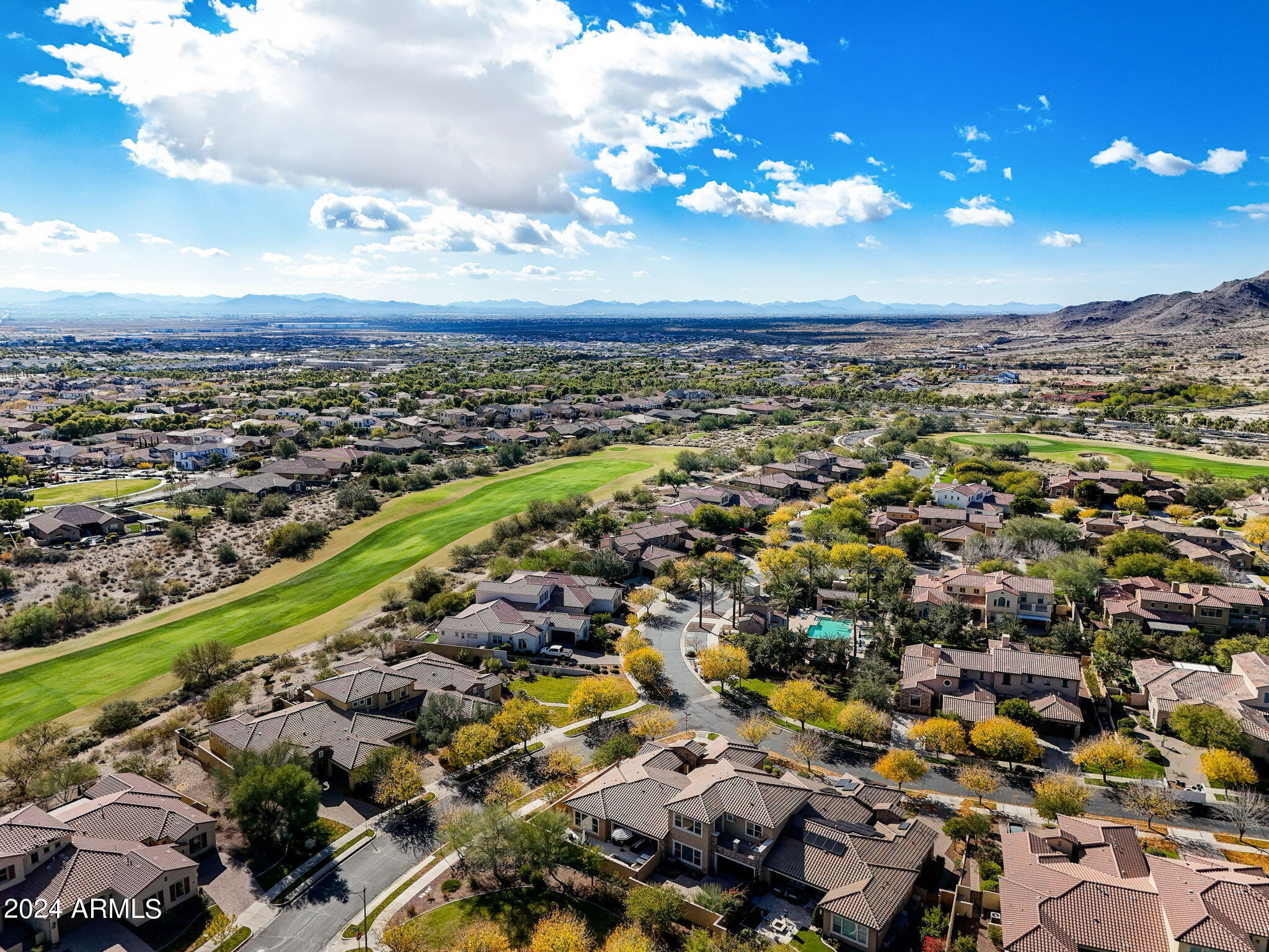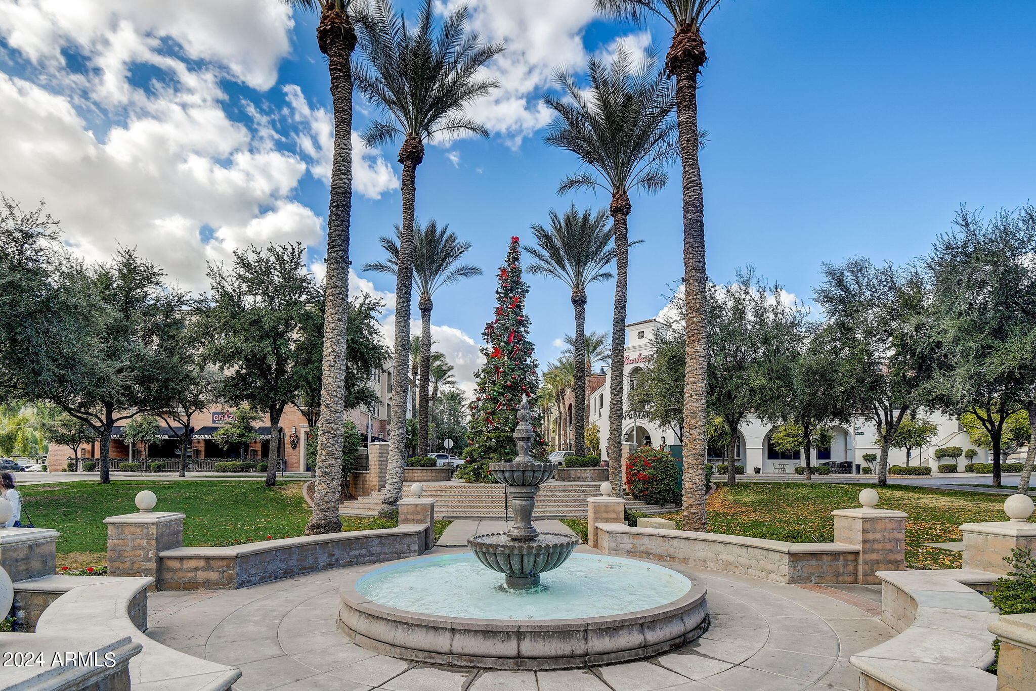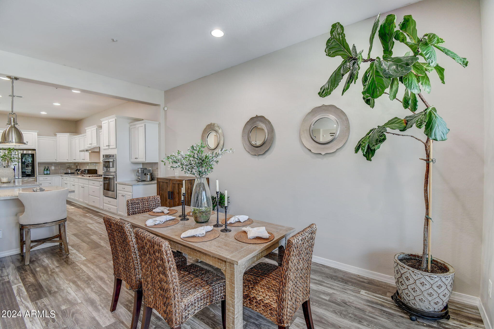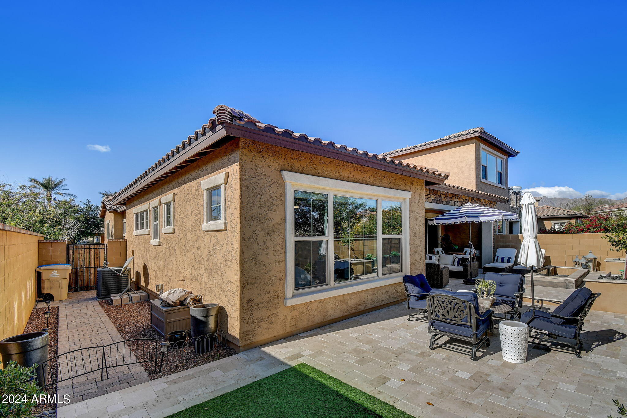 This gorgeous Villa by Shea Homes located in the Vallarta community of Verrado offers a luxurious, high-quality, comfortable and safe living with luxurious amenities. This is a PRIME corner lot situated within walking distance to the gorgeous community pool! The entry courtyard sets a welcoming tone, leading to a custom wrought iron front door. Inside, the contemporary grey plank flooring, open floor plan, and high ceilings contribute to a modern and spacious feel. The gourmet kitchen is a highlight, featuring vast expanses of cool-toned grey granite countertops, an oversized kitchen island, tiled backsplash, upgraded white cabinetry, stainless steel appliances, $4k refrigerator(like brand new), gas cooktop, and a breakfast bar. The dining and great rooms open up to a private, covered patio with travertine tiles, a gas fire pit, and low-maintenance landscaping, making it an ideal space for entertaining. The primary suite is well-appointed, with an abundance of windows for natural light. The spa-inspired en-suite bath includes an oversized shower, dual sink vanity, and a walk-in closet with ample space. The villa includes a light and bright secondary bedroom with an adjacent full bath, an open concept den, and a powder room for convenience. This residence is an entertainer's dream, offering a combination of stylish design, functional spaces, and a comfortable living environment. Verrado in general has been voted as a TOP rated community in the state of Arizona, featuring famous MainStreet which has a curated collection of shops, dining, entertainment, health, wellness and club house nearby. This villa/home is a MUST SEE!!!