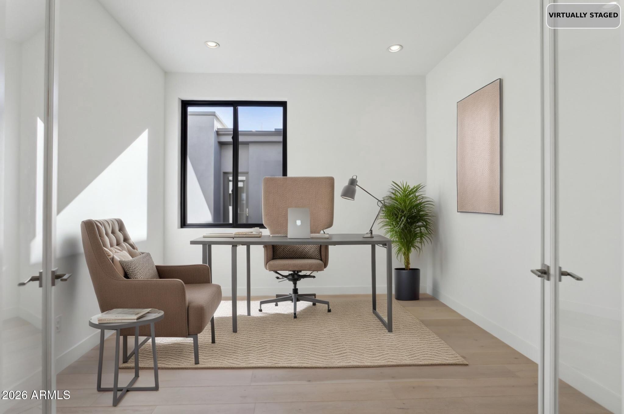 This home also includes a designated office, ideal for remote work or quiet study. Enjoy seamless indoor-outdoor living with a detached casita/pool house and a grand covered patio. A private casita is accessible through the courtyard and includes a bedroom, bathroom, family room with built-in cabinetry and a mini-fridge- ideal for guests, extended family, or a private retreat. An additional bonus room also opens to the courtyard and connects two ensuite bedrooms in the main house, creating the perfect balance of connection and privacy.