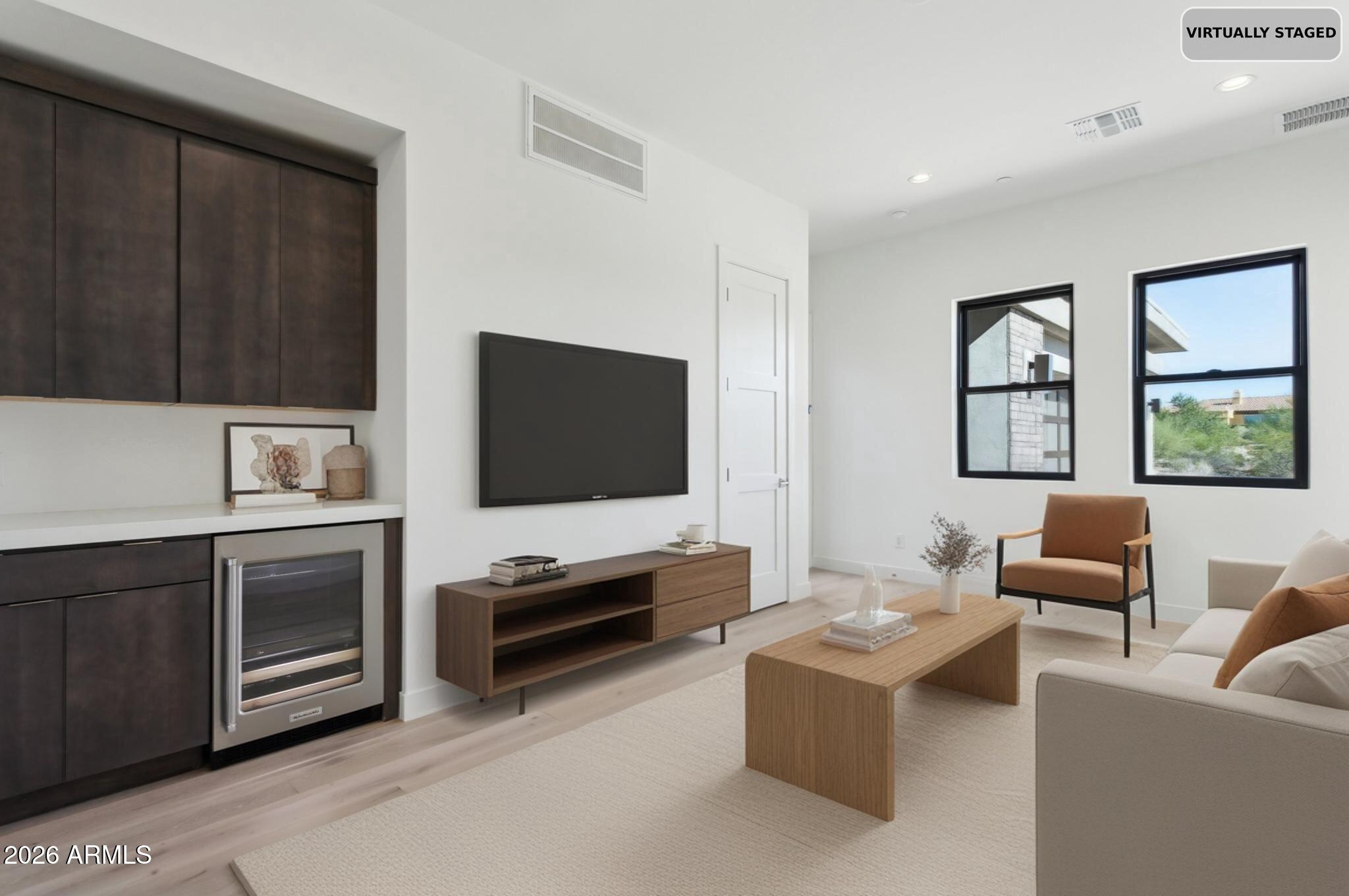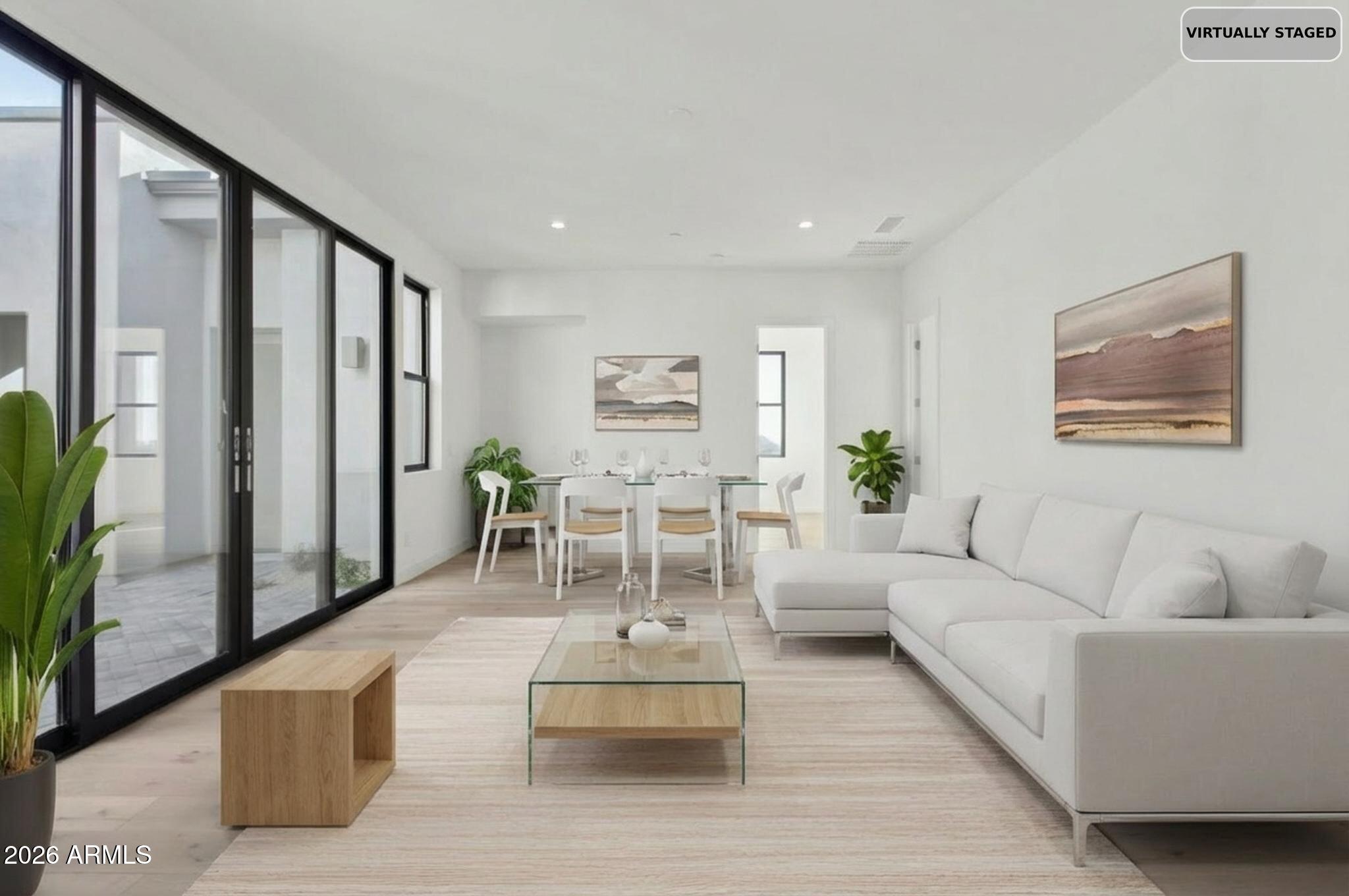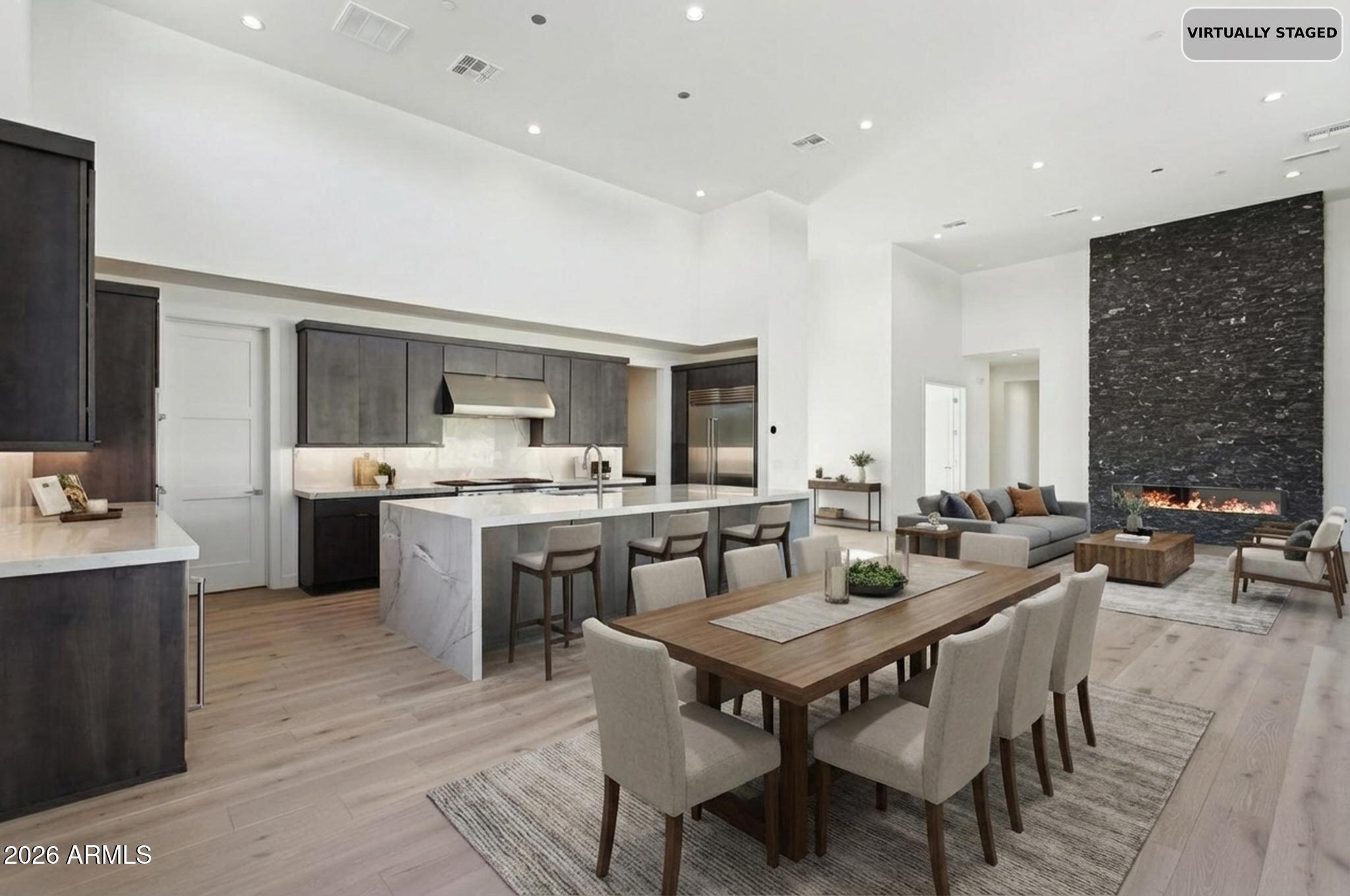 The heart of the home boasts soaring ceilings, a dramatic floor-to-ceiling fireplace, and expansive sliding door and windows that flood the award-winning open floor plan with natural light. The chef's kitchen is a true showpiece, featuring designer Wolf/Sub-Zero appliances, a striking waterfall-edge island with breakfast bar seating, and a spacious walk-in pantry--perfect for both hosting and casual meals.