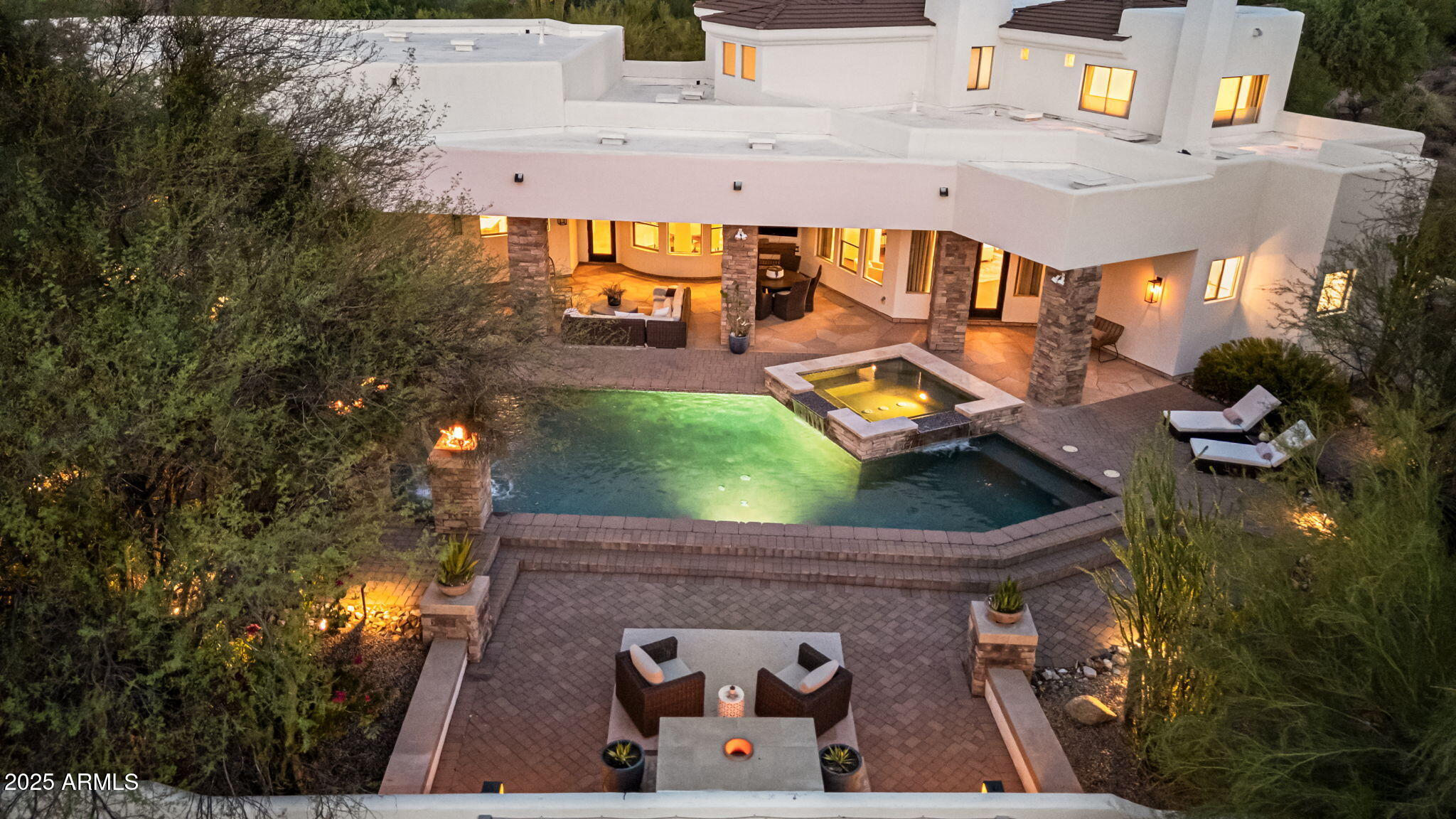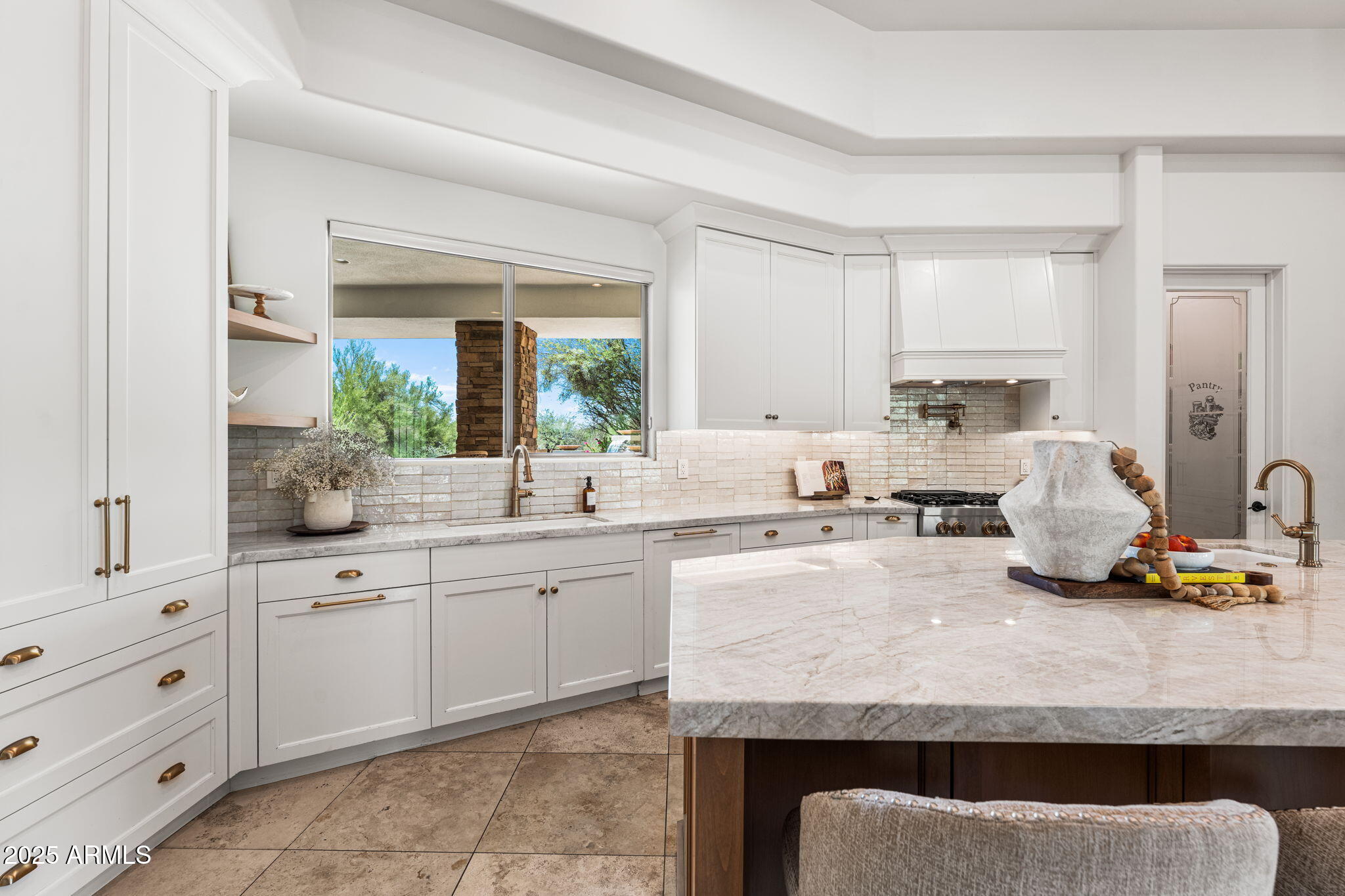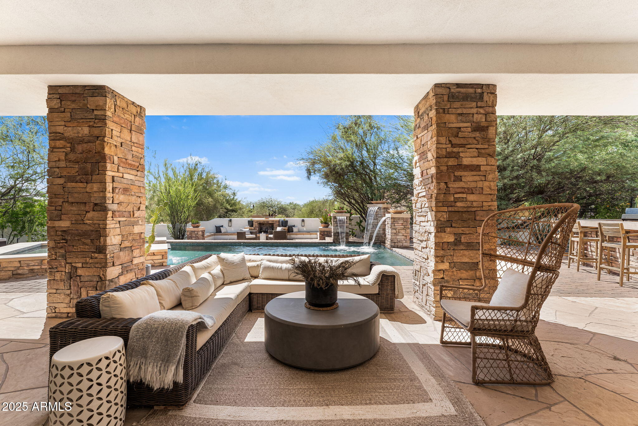 Inside, the open, flexible floor plan allows for seamless living and entertaining, blending warm architectural accents with timeless design. At the heart of the home, a fully renovated 2022 chef's kitchen features an oversized quartzite island, custom cabinetry, and top-of-the-line appliancescomplemented by four newly redone bathrooms and fresh interior/exterior paint. Expansive living and dining spaces transition effortlessly outdoors, where a newly pebble tech pool and spa (2023) with updated equipment set the stage alongside dramatic fire and water features, multiple patios, and a full outdoor kitchen. The primary suite is a serene haven with a spa-inspired bath, frameless glass shower, soaking tub, and an oversized walk-in closet.