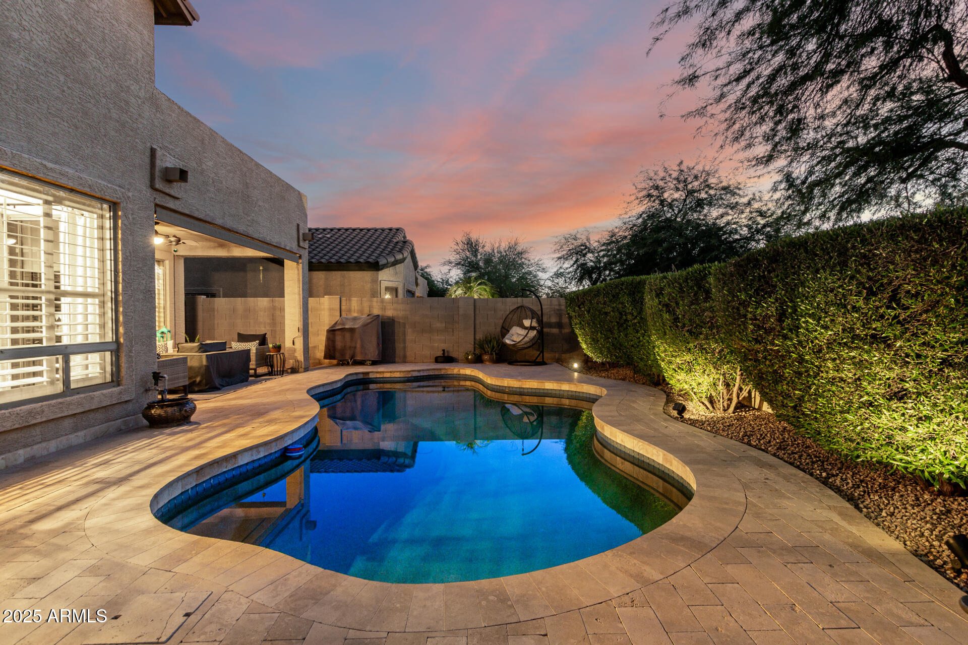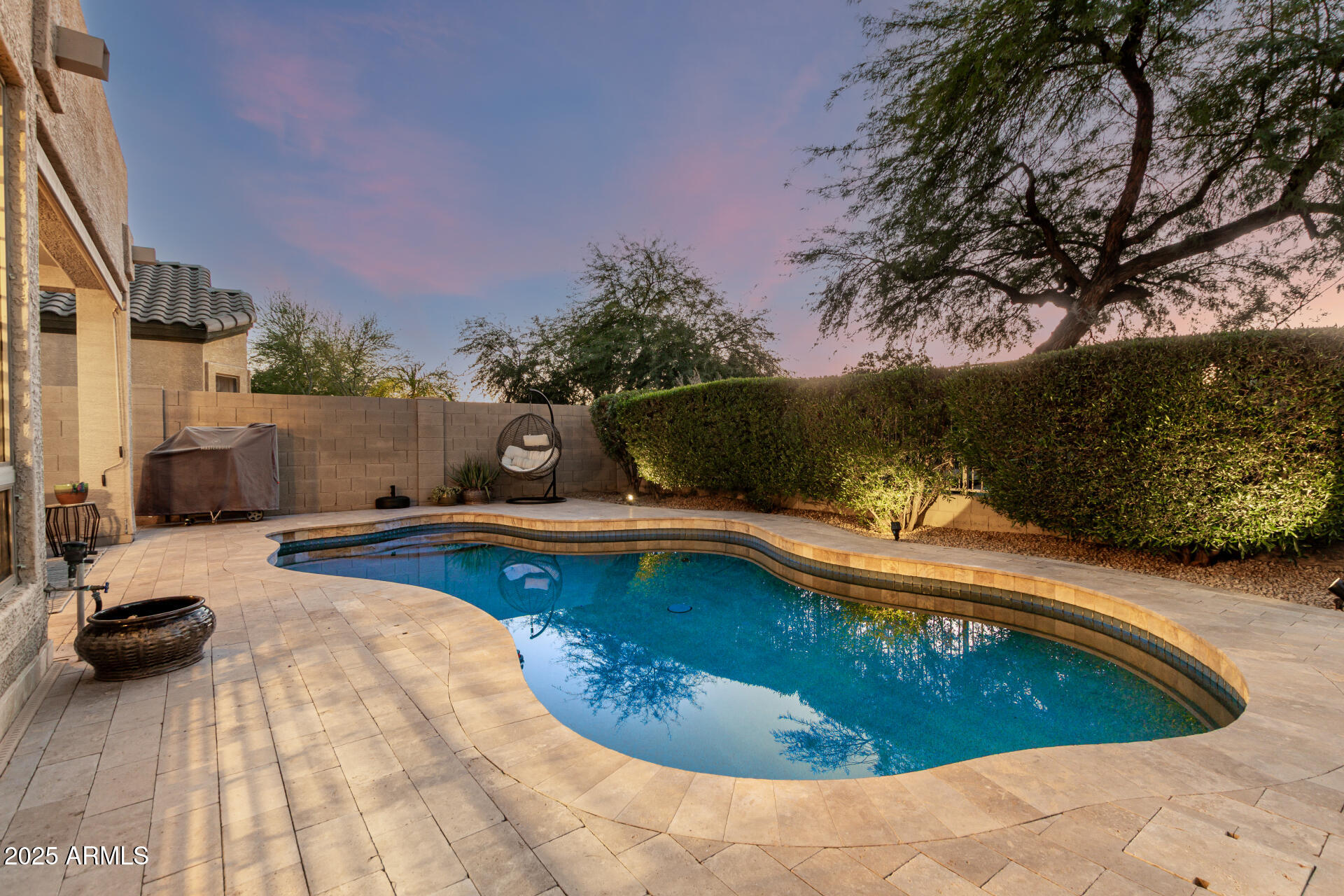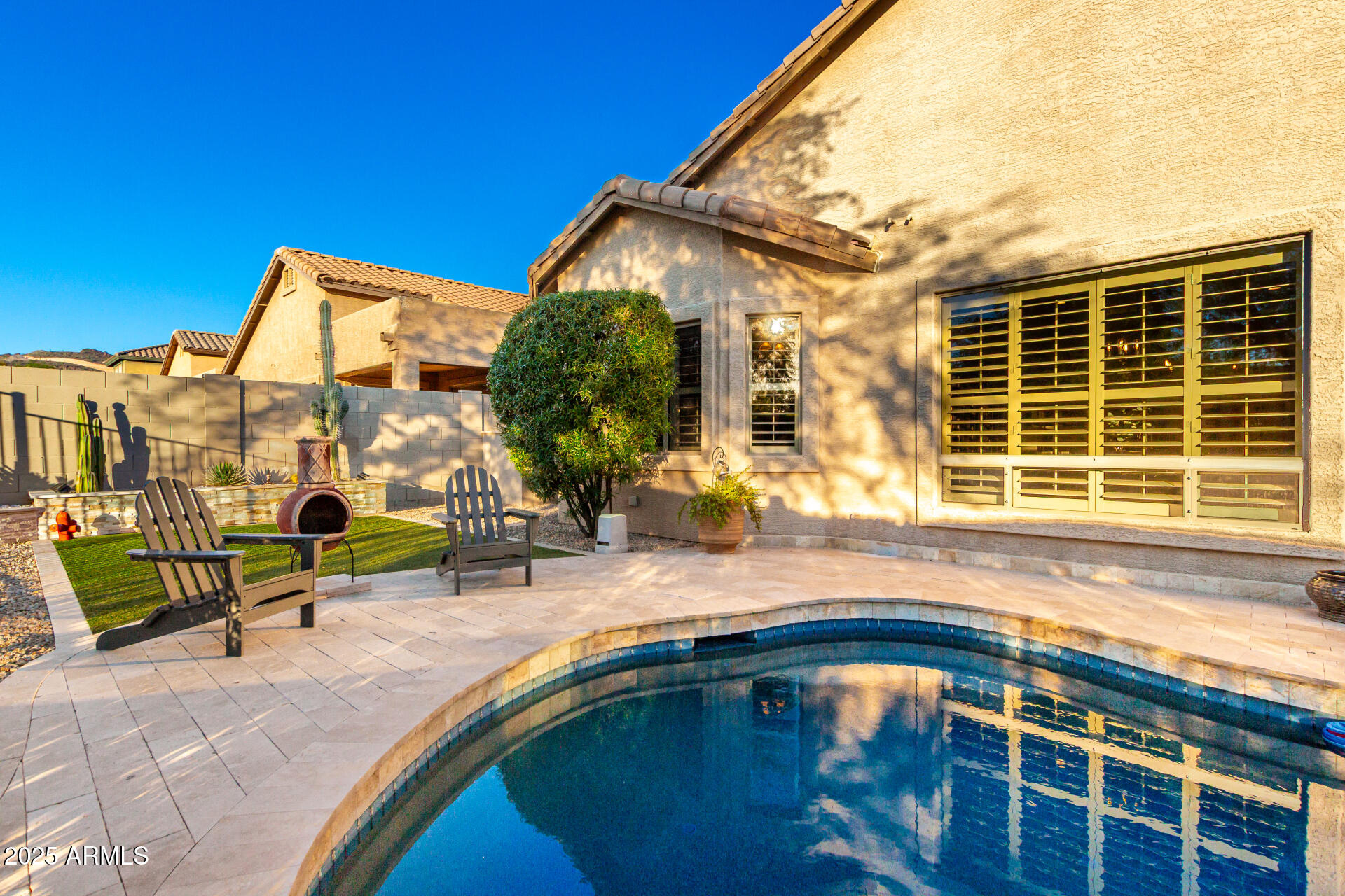 Your dream home with a pool in Tramonto is here. This beautifully upgraded residence sits on a premium lot with no neighbors behind and offers a long list of high-value improvements that provide true peace of mind. Major updates include a brand-new 2024 roof, fully resurfaced pebble tec pool with new tile, a complete backyard renovation with travertine, turf, cactus garden, an upgraded Rainbird system, and enclosed pool equipment. Inside, the home features a custom entertainment center with a TV lift, plantation shutters, custom barn doors, updated light fixtures and ceiling fans, and a whole-home speaker system with in-wall volume control and Control4 integration.